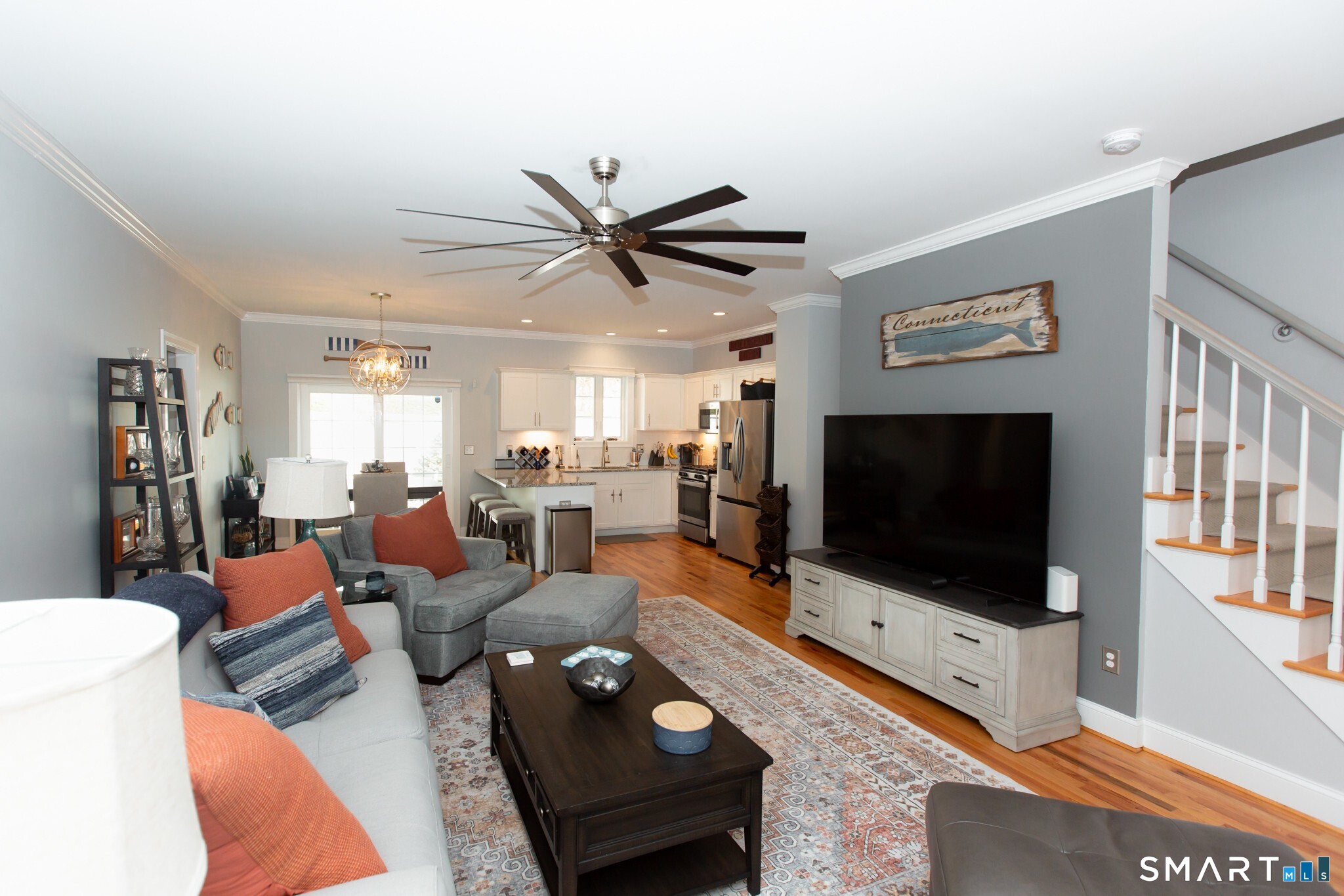 Exquisite showcase residence by an award-winning builder, where superior craftsmanship and refined design shine at every turn. This impeccably maintained home welcomes you with gleaming hardwood floors, soaring 9-foot ceilings, and elegant crown molding throughout the main level, creating an atmosphere of timeless sophistication. Designed for both everyday comfort and elevated entertaining, the open-concept floor plan flows seamlessly into a chef-inspired kitchen featuring granite countertops, stainless steel appliances, a generous breakfast bar, and a sunlit dining area. Glass sliders open to a private outdoor retreat with a stone paver patio-perfect for alfresco dining, entertaining guests, or unwinding in your own fenced-in oasis. Additional green space offers endless possibilities for a fire pit, garden, or play area. The main level is thoughtfully appointed with first-floor laundry and a stylish half bath, blending convenience with function. Upstairs, retreat to the oversized primary suite, complete with a spa-like private bath and ample closet space. A second bedroom and a versatile home office-ideal for remote work, a nursery, or guest bedroom-complete the second floor. The professionally finished lower level provides approximately 800 square feet of additional heated and air-conditioned living space, offering endless options for a media room, fitness studio, playroom, or elegant entertaining area, along with generous storage.