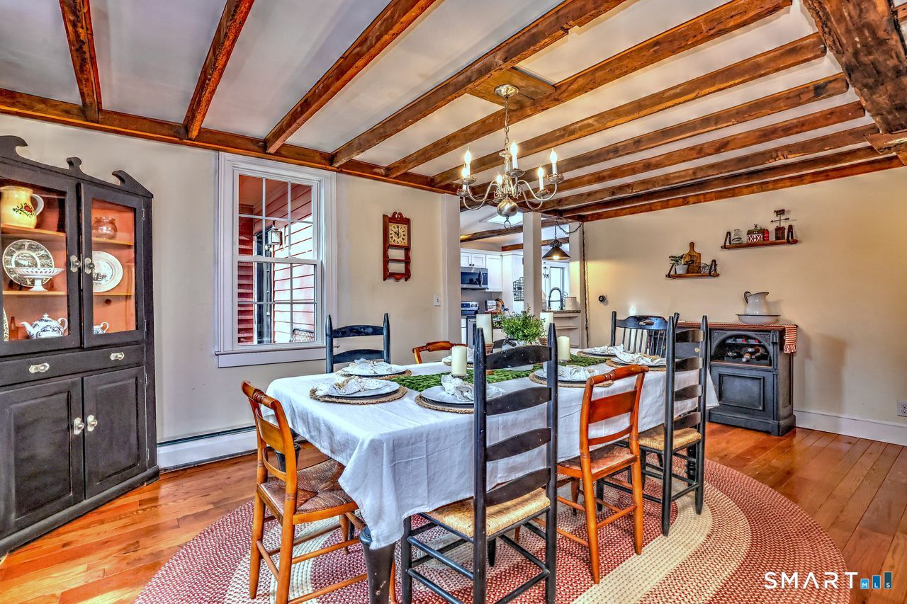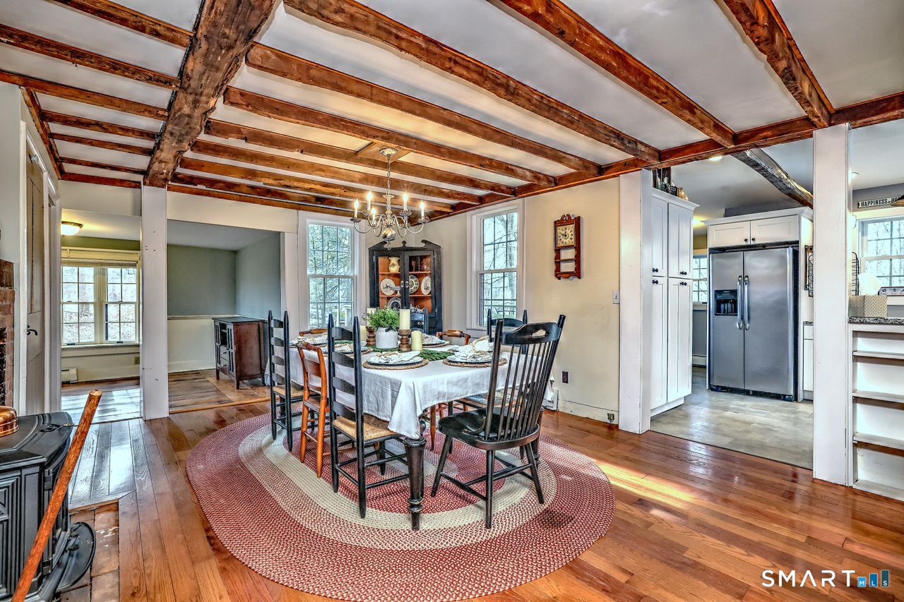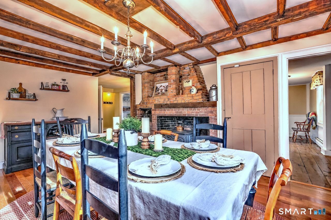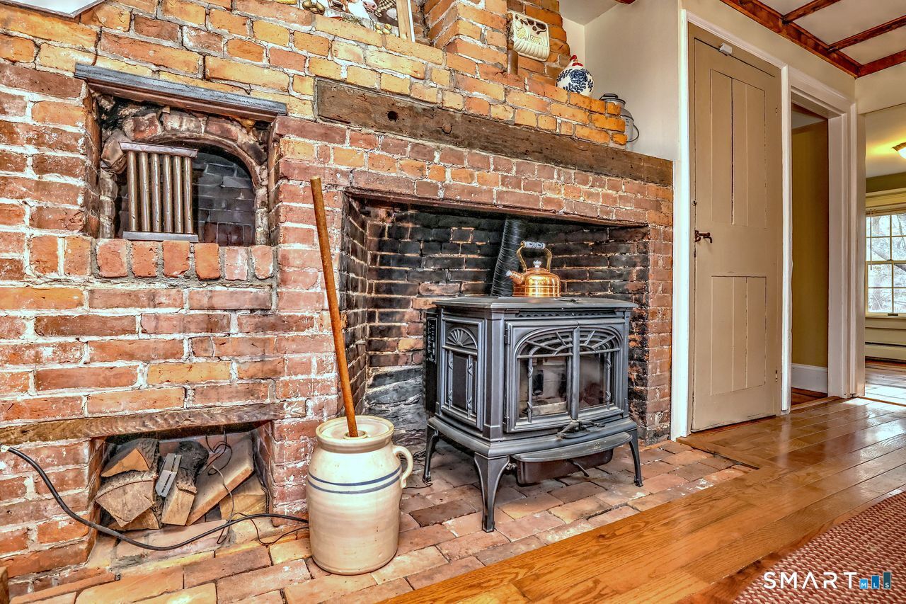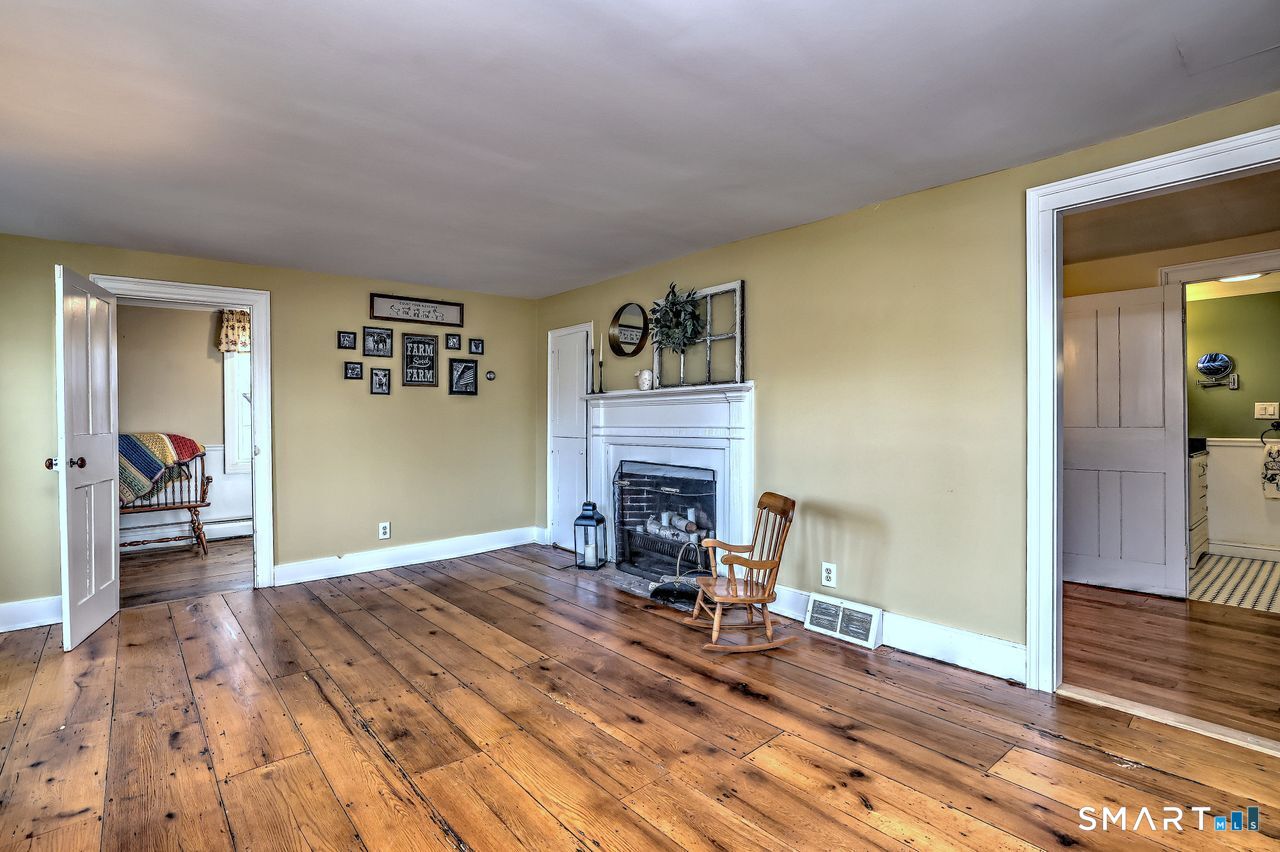 This early-1800s farmhouse is the real deal, with wide plank hardwood floors, exposed beams, and original details that simply can't be replicated. The original front door has been restored and sets the tone the moment you arrive. And wait until you see the fireplaces, while only one is functioning; the additional 3 add character to this truly one-of-a-kind home. The first floor offers generous living space with two entry foyers, a formal living room with an ornamental fireplace, and a dining room that truly serves as the heart of the home, featuring a fireplace with pellet stove. Off the dining room is a charming sitting room, or office or quiet reading space. The kitchen blends old-world charm with modern convenience, with granite counters, SS appliances, a sunny breakfast nook, and a tucked-away laundry room. A rare first-floor primary bedroom with a walk-in closet adds everyday ease to this antique gem. Upstairs, two bedrooms share a beautifully updated full bath. Outside, 1.47 private acres frame a classic New England setting with a stone wall along the front of the property, a covered porch, and a detached two-car garage. Thoughtful exterior improvements include refreshed landscaping, garden spaces, a rear pond feature, and 6 new windows. Cooling is provided by mini-split systems in the bedrooms; the rest of the home stays true to its roots. This isn't a cookie-cutter house. It's a piece of history with quirks, character, and a story you'll be proud to continue