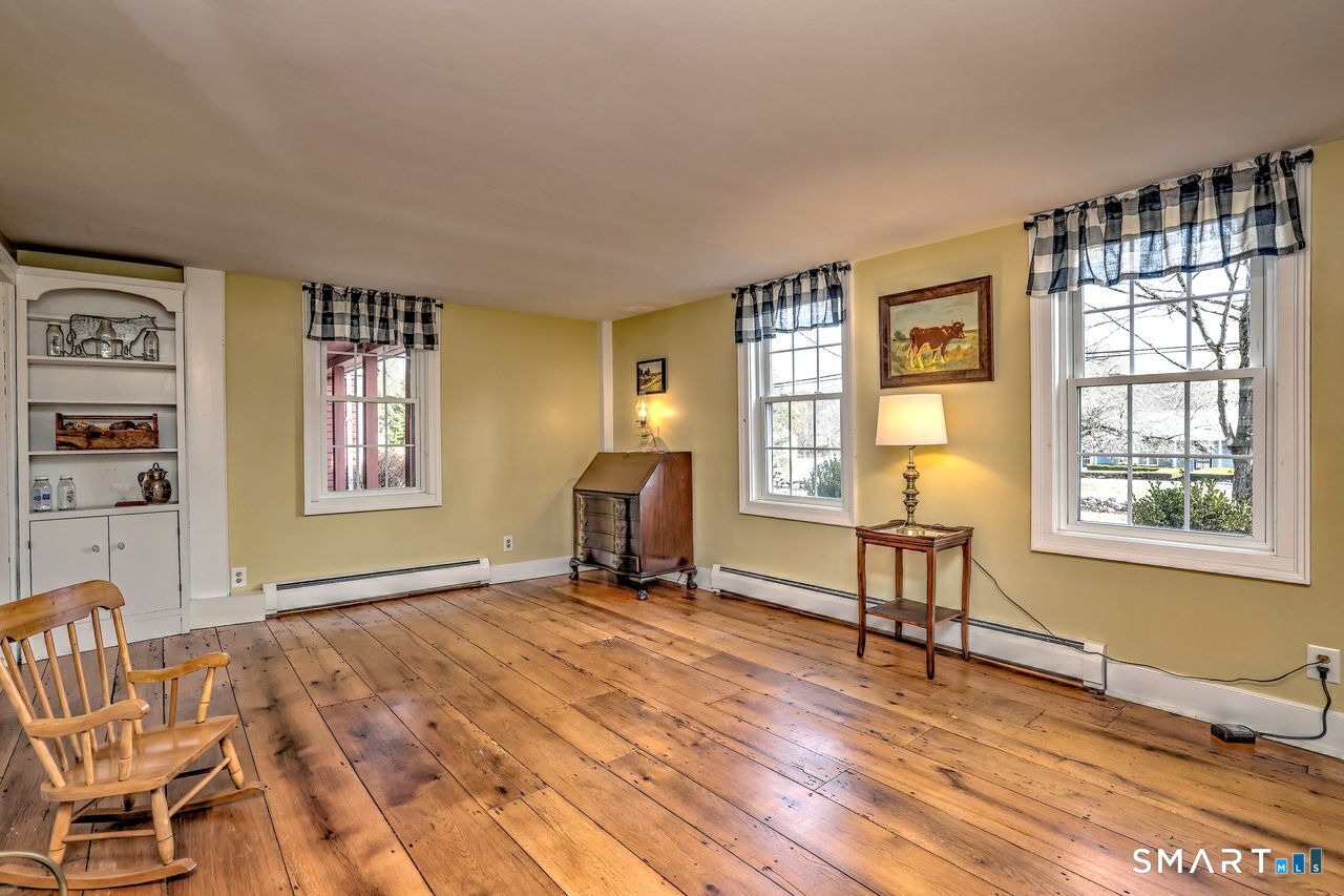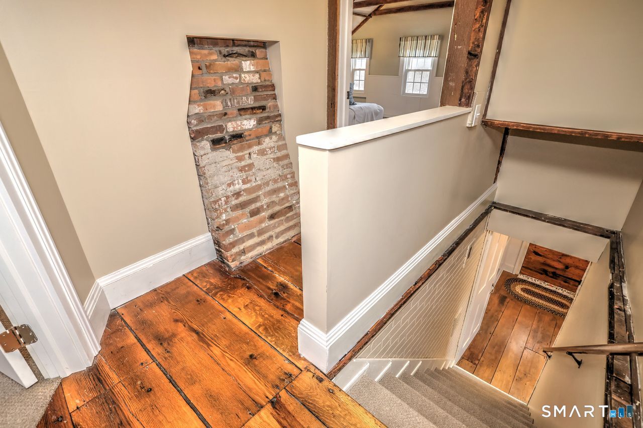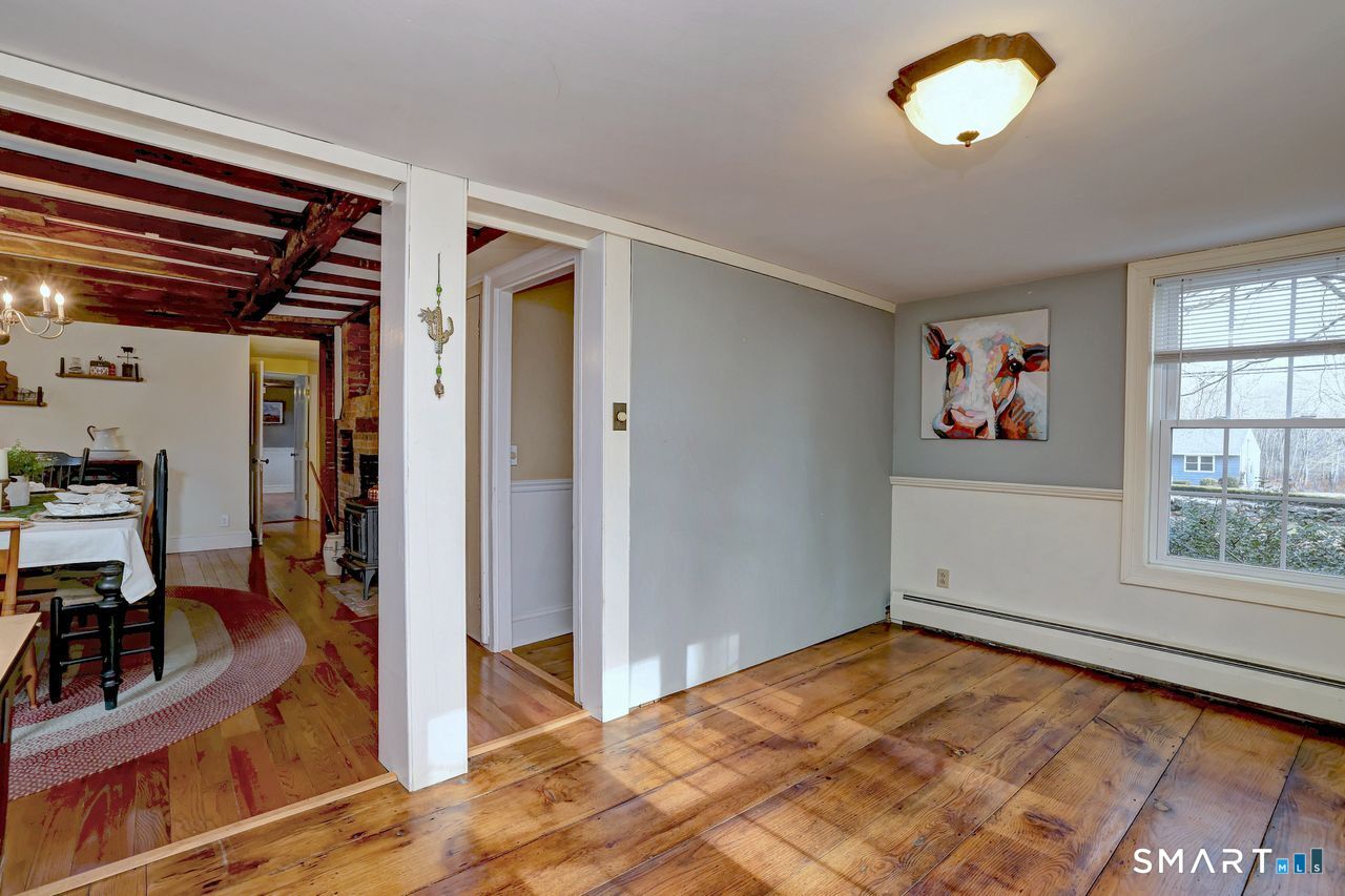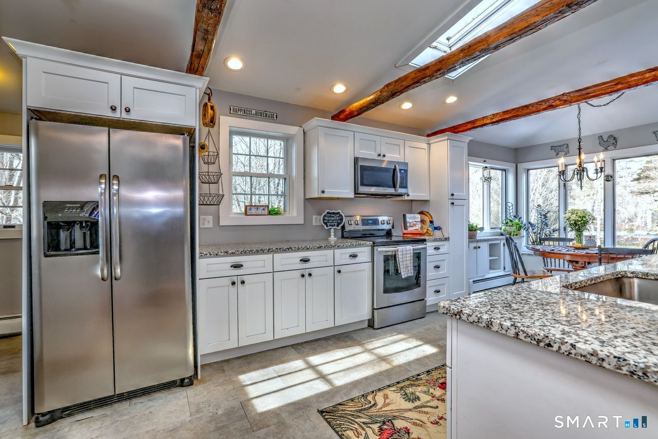 This early-1800s farmhouse is the real deal, with wide plank hardwood floors, exposed beams, and original details that simply can't be replicated. The original front door has been restored and sets the tone the moment you arrive. And wait until you see the fireplaces, while only one is functioning; the additional 3 add character to this truly one-of-a-kind home. The first floor offers generous living space with two entry foyers, a formal living room with an ornamental fireplace, and a dining room that truly serves as the heart of the home, featuring a fireplace with pellet stove. Off the dining room is a charming sitting room, or office or quiet reading space. The kitchen blends old-world charm with modern convenience, with granite counters, SS appliances, a sunny breakfast nook, and a tucked-away laundry room. A rare first-floor primary bedroom with a walk-in closet adds everyday ease to this antique gem. Upstairs, two bedrooms share a beautifully updated full bath. Outside, 1.47 private acres frame a classic New England setting with a stone wall along the front of the property, a covered porch, and a detached two-car garage. Thoughtful exterior improvements include refreshed landscaping, garden spaces, a rear pond feature, and 6 new windows. Cooling is provided by mini-split systems in the bedrooms; the rest of the home stays true to its roots. This isn't a cookie-cutter house. It's a piece of history with quirks, character, and a story you'll be proud to continue