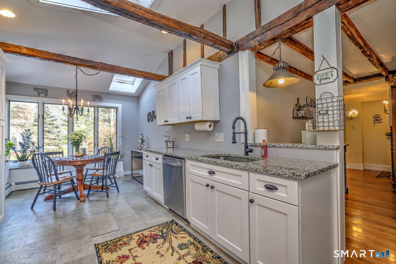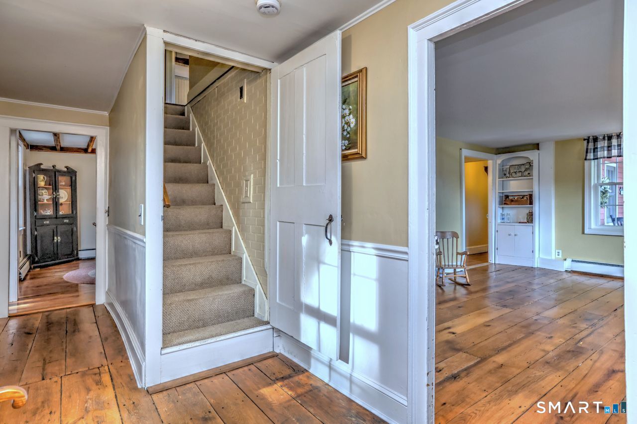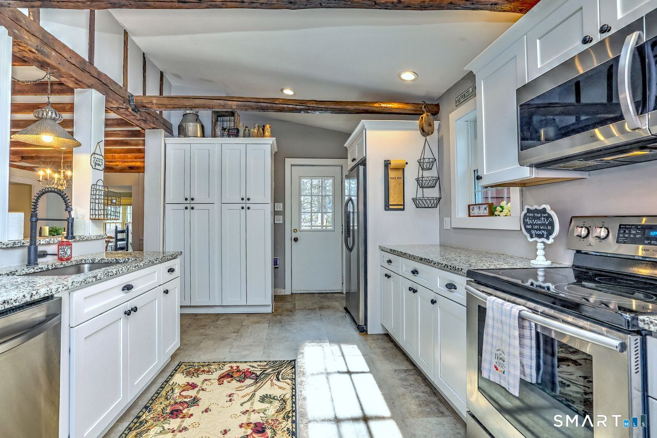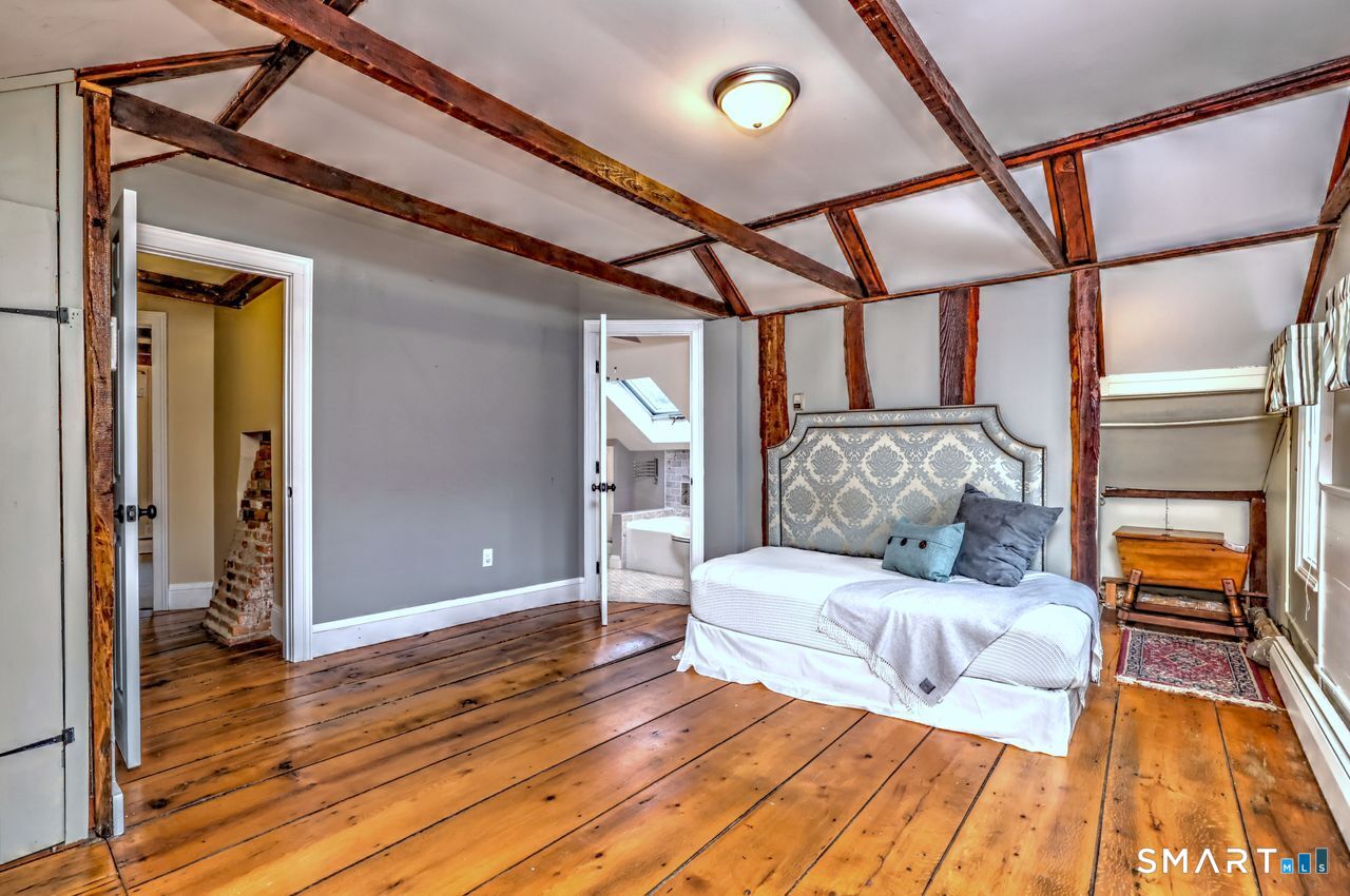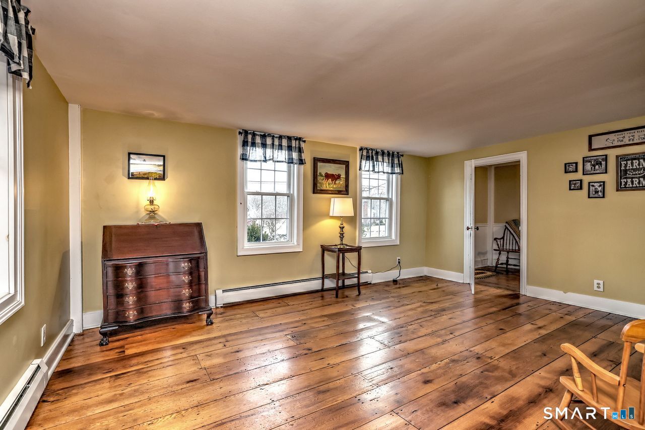 This early-1800s farmhouse is the real deal, with wide plank hardwood floors, exposed beams, and original details that simply can't be replicated. The original front door has been restored and sets the tone the moment you arrive. And wait until you see the fireplaces, while only one is functioning; the additional 3 add character to this truly one-of-a-kind home. The first floor offers generous living space with two entry foyers, a formal living room with an ornamental fireplace, and a dining room that truly serves as the heart of the home, featuring a fireplace with pellet stove. Off the dining room is a charming sitting room, or office or quiet reading space. The kitchen blends old-world charm with modern convenience, with granite counters, SS appliances, a sunny breakfast nook, and a tucked-away laundry room. A rare first-floor primary bedroom with a walk-in closet adds everyday ease to this antique gem. Upstairs, two bedrooms share a beautifully updated full bath. Outside, 1.47 private acres frame a classic New England setting with a stone wall along the front of the property, a covered porch, and a detached two-car garage. Thoughtful exterior improvements include refreshed landscaping, garden spaces, a rear pond feature, and 6 new windows. Cooling is provided by mini-split systems in the bedrooms; the rest of the home stays true to its roots. This isn't a cookie-cutter house. It's a piece of history with quirks, character, and a story you'll be proud to continue
