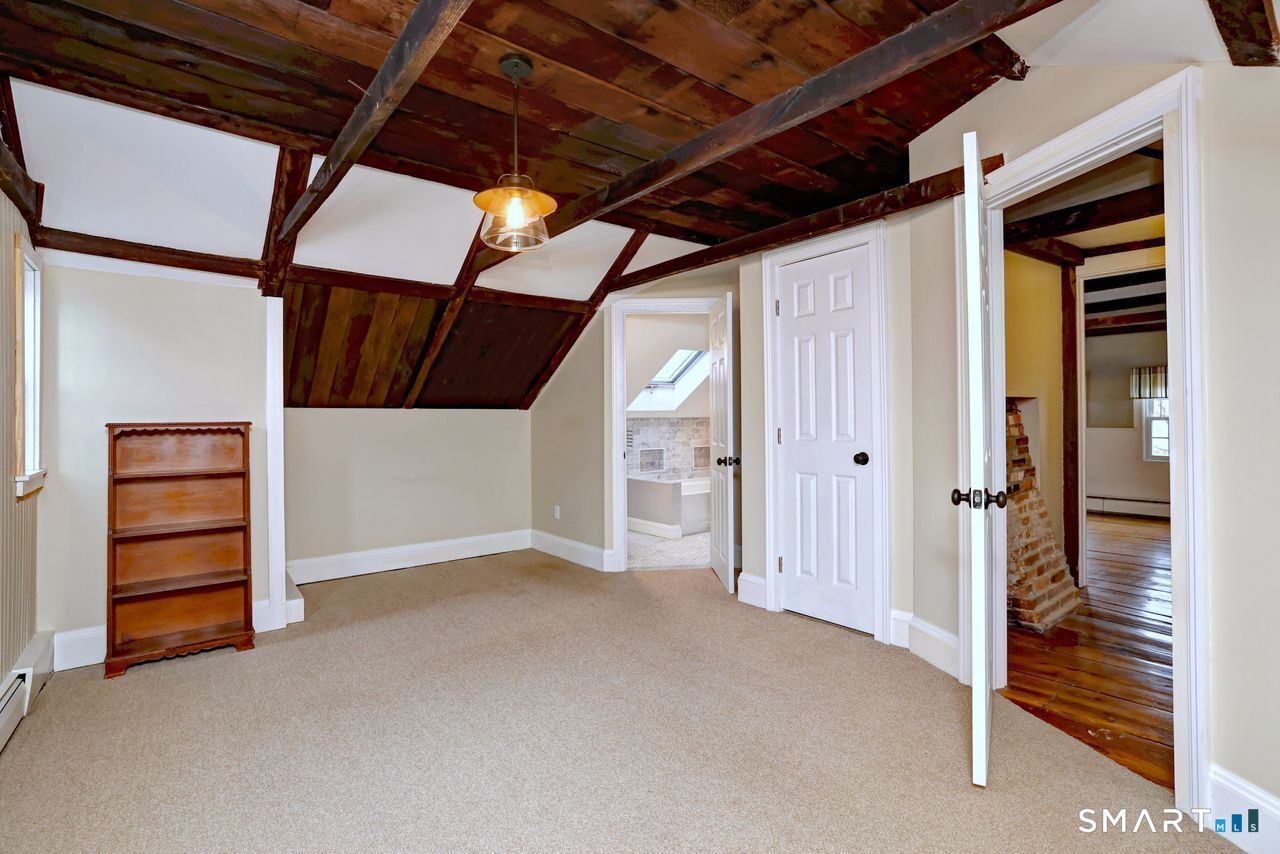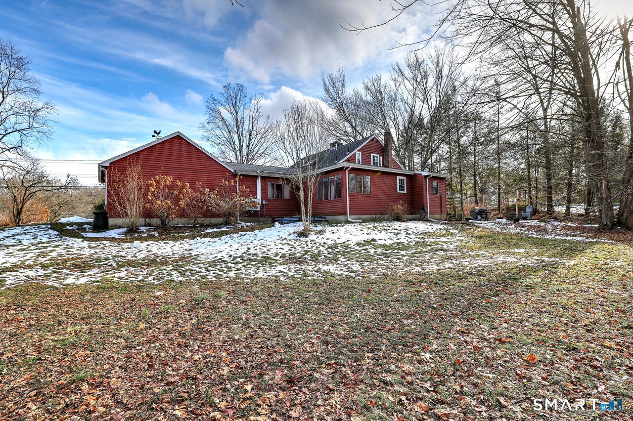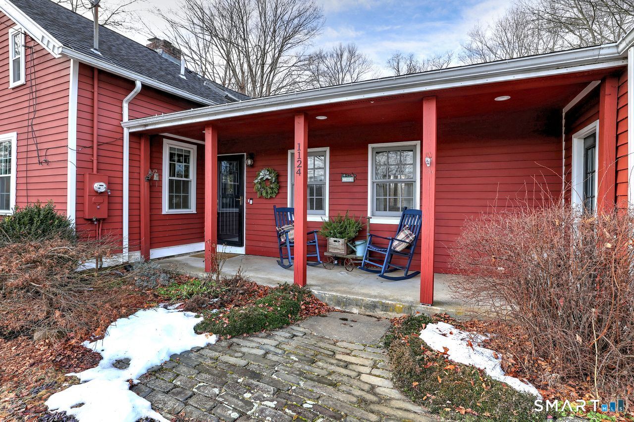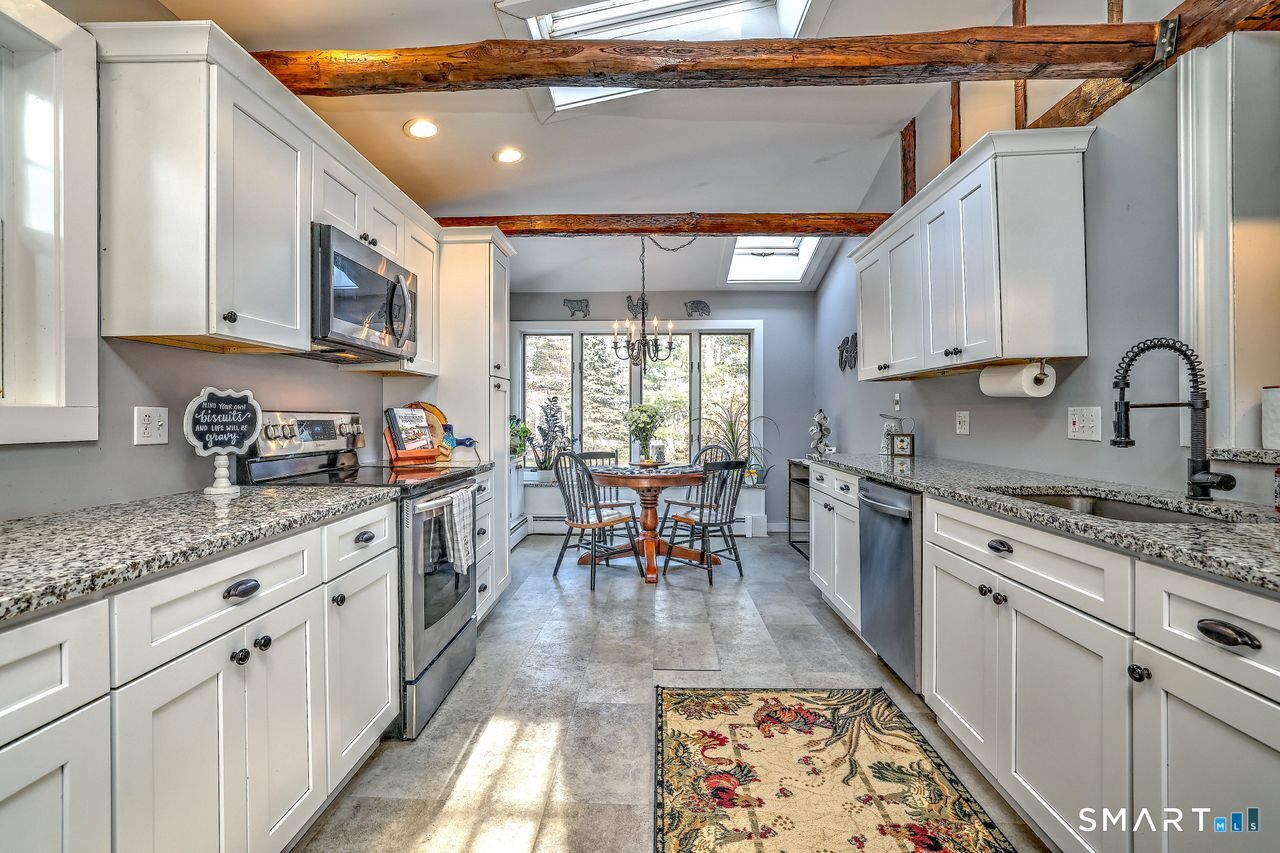 This early-1800s farmhouse is the real deal, with wide plank hardwood floors, exposed beams, and original details that simply can't be replicated. The original front door has been restored and sets the tone the moment you arrive. And wait until you see the fireplaces, while only one is functioning; the additional 3 add character to this truly one-of-a-kind home. The first floor offers generous living space with two entry foyers, a formal living room with an ornamental fireplace, and a dining room that truly serves as the heart of the home, featuring a fireplace with pellet stove. Off the dining room is a charming sitting room, or office or quiet reading space. The kitchen blends old-world charm with modern convenience, with granite counters, SS appliances, a sunny breakfast nook, and a tucked-away laundry room. A rare first-floor primary bedroom with a walk-in closet adds everyday ease to this antique gem. Upstairs, two bedrooms share a beautifully updated full bath. Outside, 1.47 private acres frame a classic New England setting with a stone wall along the front of the property, a covered porch, and a detached two-car garage. Thoughtful exterior improvements include refreshed landscaping, garden spaces, a rear pond feature, and 6 new windows. Cooling is provided by mini-split systems in the bedrooms; the rest of the home stays true to its roots. This isn't a cookie-cutter house. It's a piece of history with quirks, character, and a story you'll be proud to continue