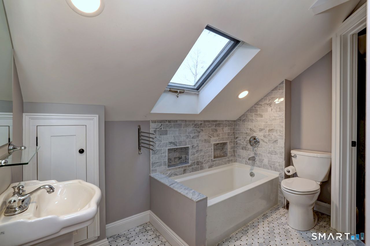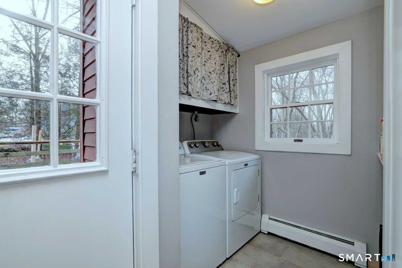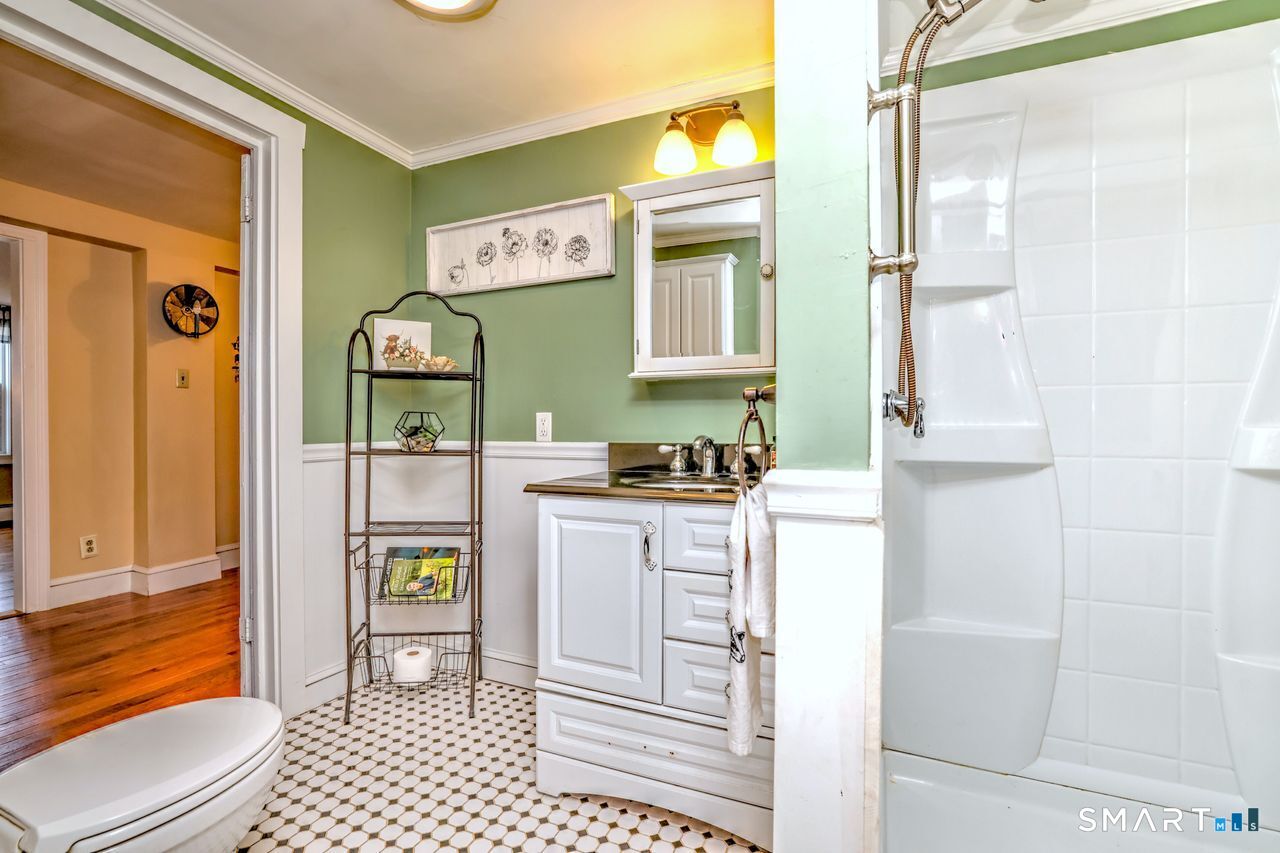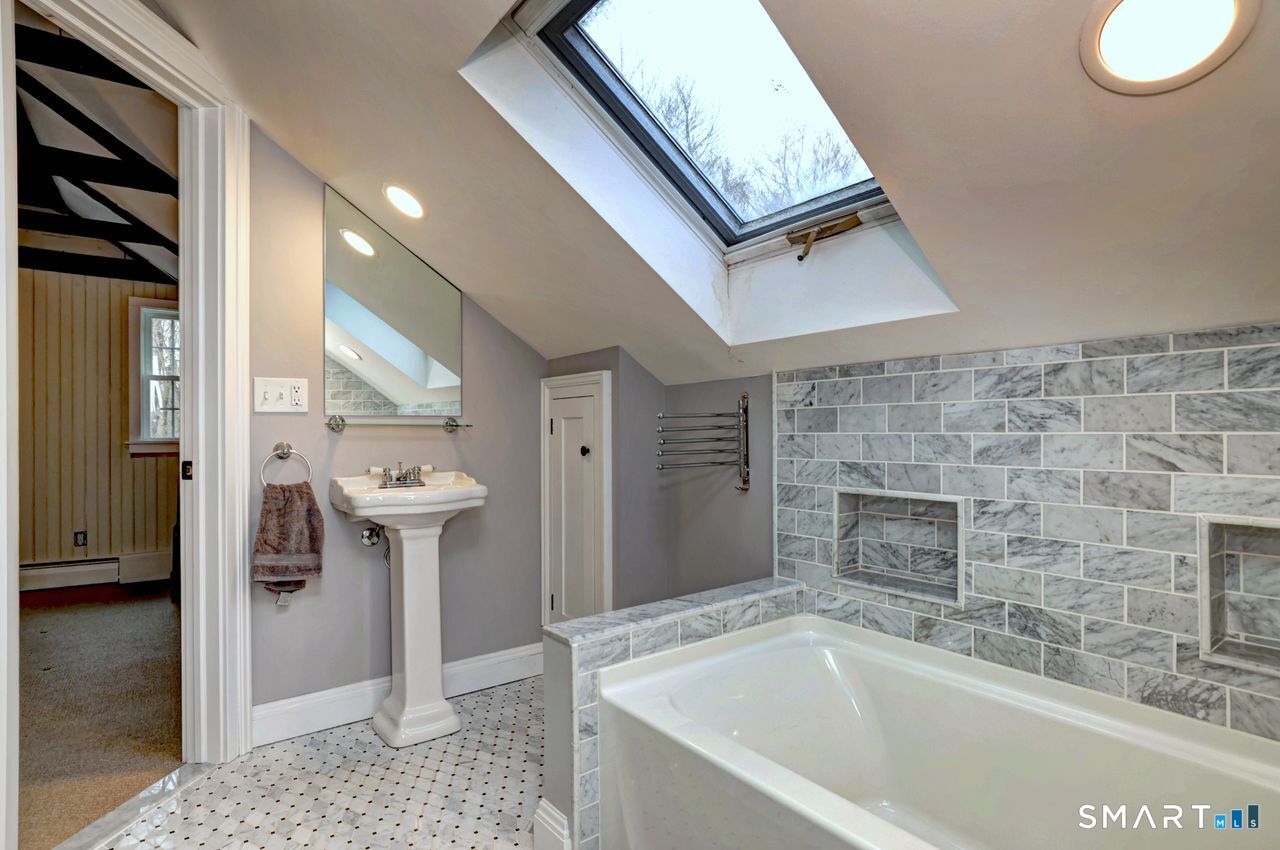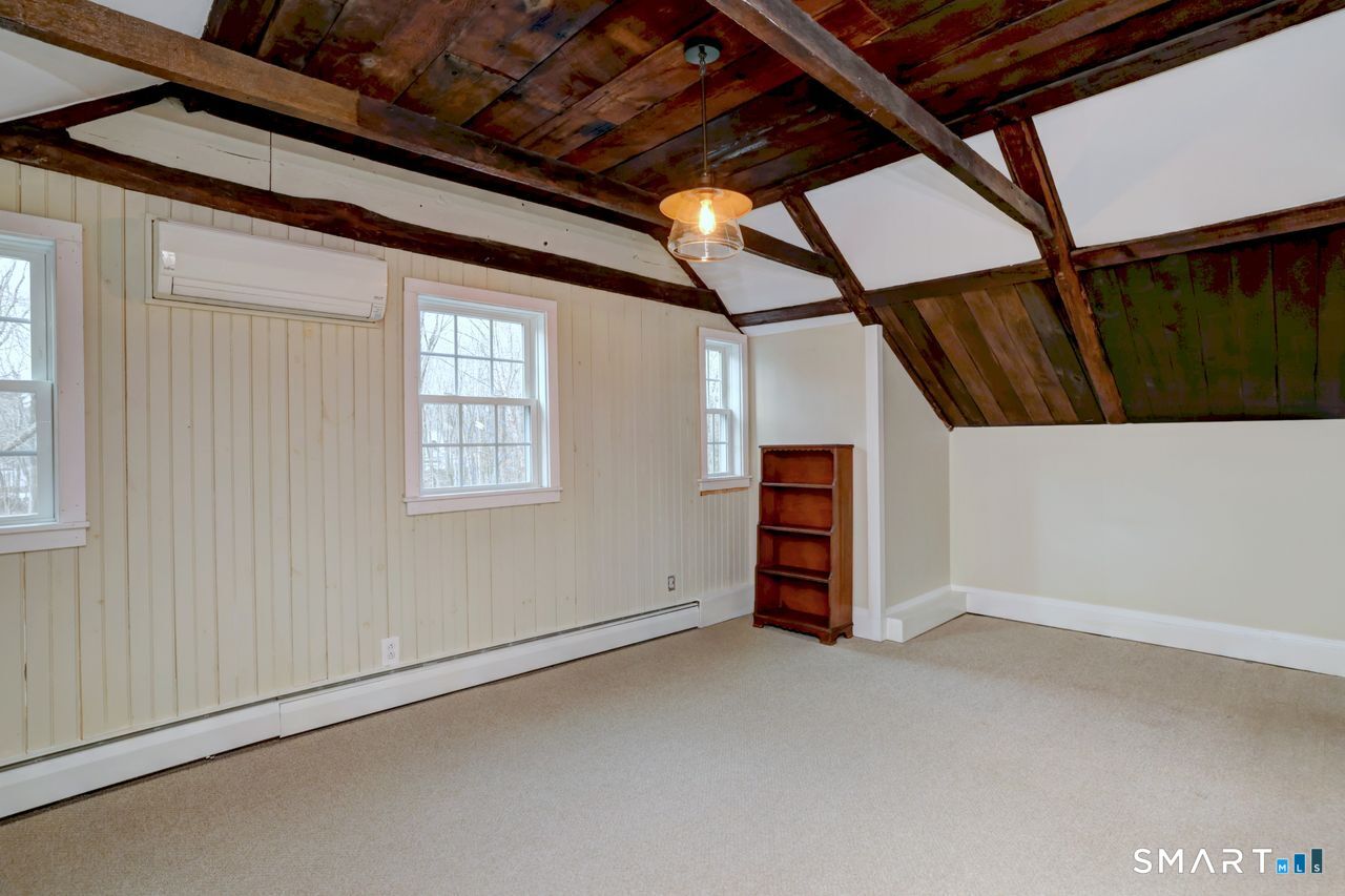 This early-1800s farmhouse is the real deal, with wide plank hardwood floors, exposed beams, and original details that simply can't be replicated. The original front door has been restored and sets the tone the moment you arrive. And wait until you see the fireplaces, while only one is functioning; the additional 3 add character to this truly one-of-a-kind home. The first floor offers generous living space with two entry foyers, a formal living room with an ornamental fireplace, and a dining room that truly serves as the heart of the home, featuring a fireplace with pellet stove. Off the dining room is a charming sitting room, or office or quiet reading space. The kitchen blends old-world charm with modern convenience, with granite counters, SS appliances, a sunny breakfast nook, and a tucked-away laundry room. A rare first-floor primary bedroom with a walk-in closet adds everyday ease to this antique gem. Upstairs, two bedrooms share a beautifully updated full bath. Outside, 1.47 private acres frame a classic New England setting with a stone wall along the front of the property, a covered porch, and a detached two-car garage. Thoughtful exterior improvements include refreshed landscaping, garden spaces, a rear pond feature, and 6 new windows. Cooling is provided by mini-split systems in the bedrooms; the rest of the home stays true to its roots. This isn't a cookie-cutter house. It's a piece of history with quirks, character, and a story you'll be proud to continue
