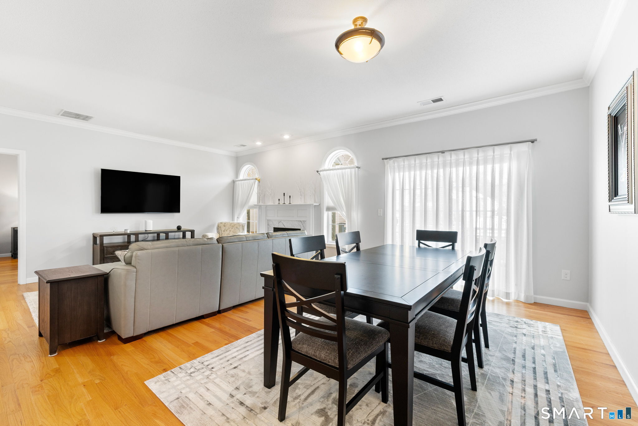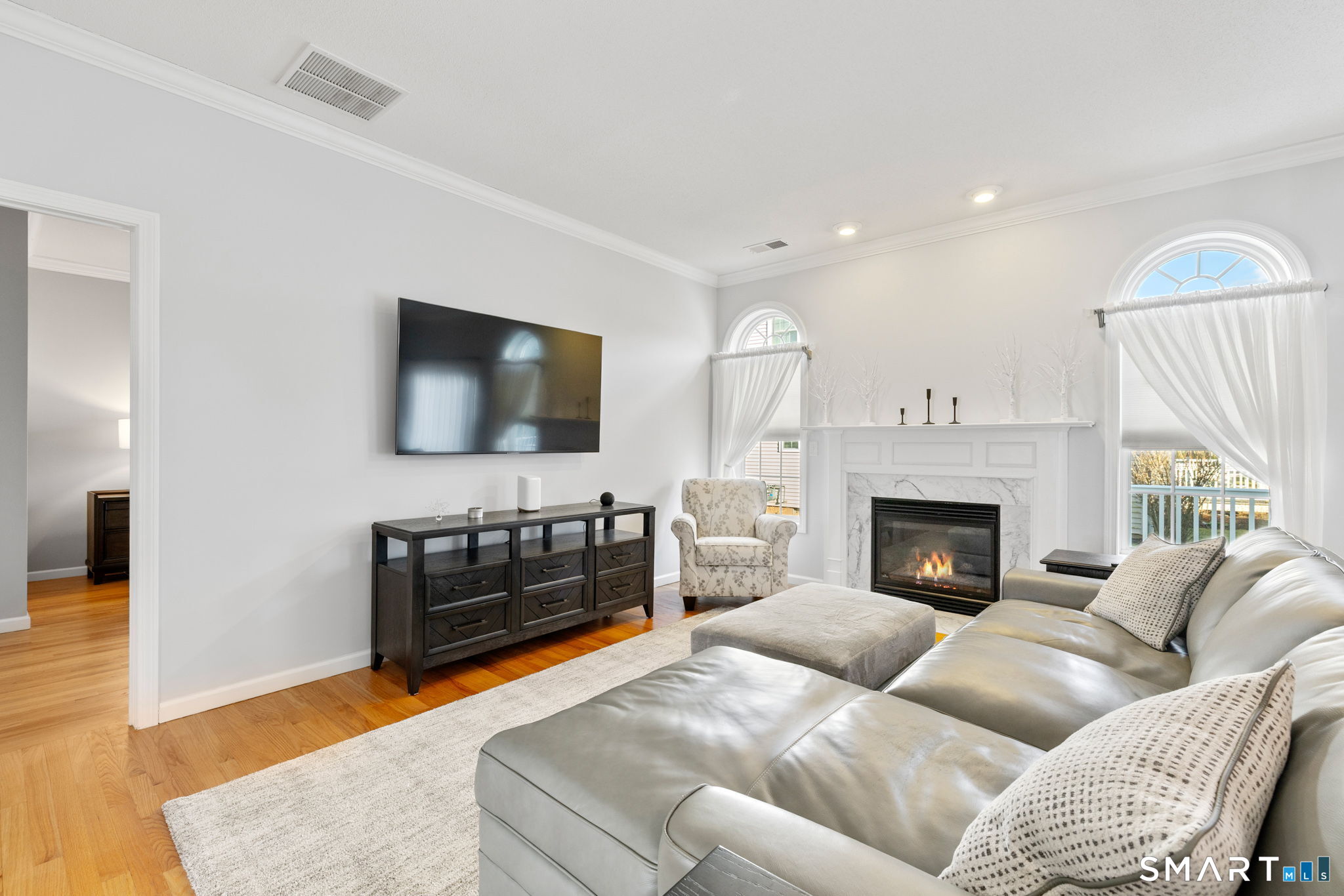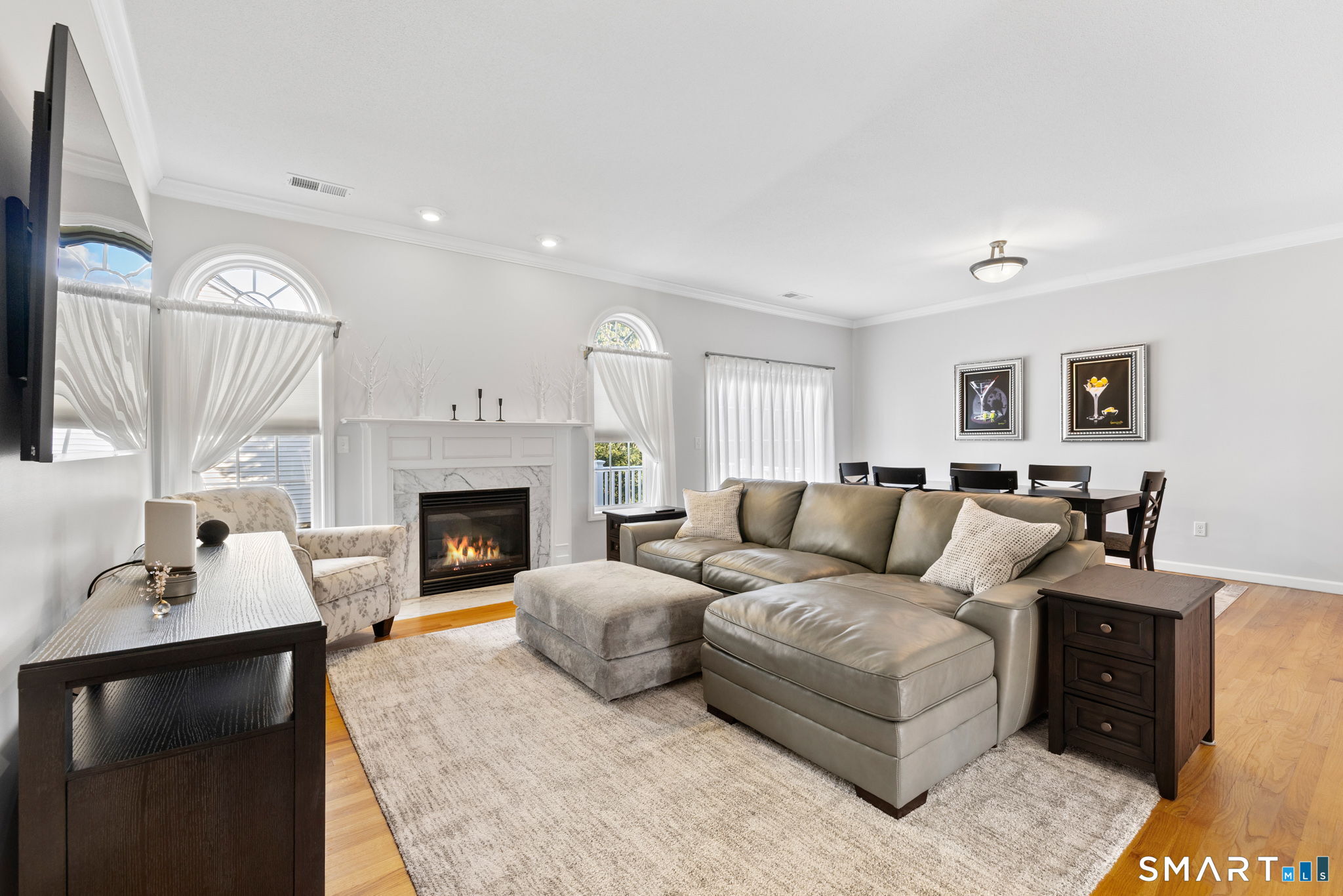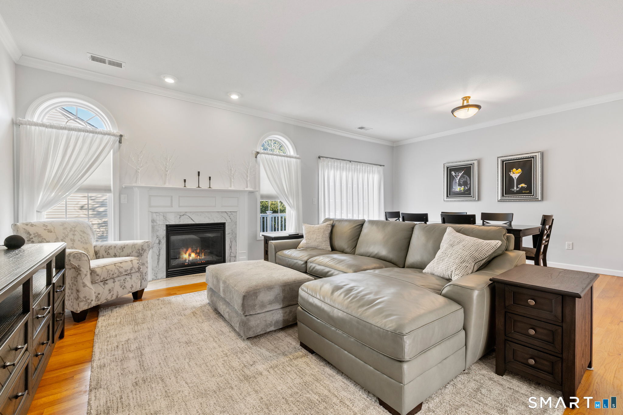 Gorgeous townhouse-style condo located in a desirable 55+ community, offering 3 bedrooms and 3 full baths. This light-filled home features an open-concept living and dining area with a cozy gas fireplace, ideal for everyday living and entertaining. The first-floor primary bedroom includes an en suite bath and walk-in closet, along with the convenience of first-floor laundry for easy one-level living. Enjoy an eat-in kitchen, hardwood floors throughout the first floor, fresh interior paint, and brand-new carpeting upstairs. The second level offers two additional bedrooms, a full bath, and a spacious loft perfect for a home office, workout area, or sitting space. Sliding doors off the living area lead to a low-maintenance Trex deck. Additional highlights include an attached two-car garage, central air conditioning, and efficient gas heat.