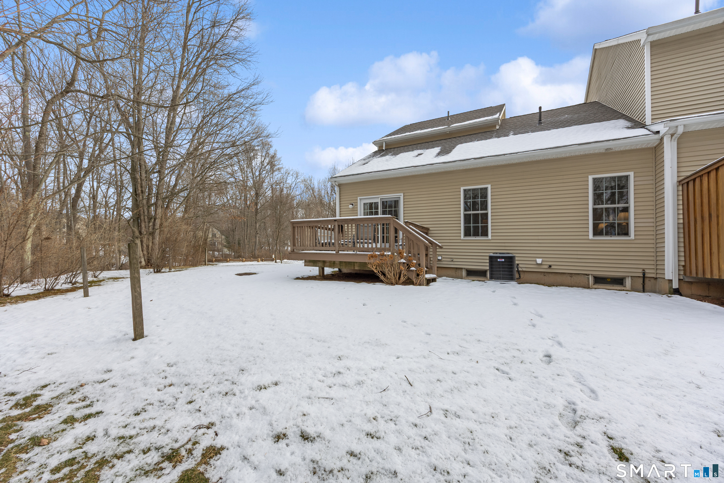 Beautiful 55+ End Unit in a SoughtAfter Community. This lightfilled, endunit condo offers the perfect blend of comfort, privacy, and lowmaintenance living. Tucked beside a private side yard with a secluded deck backing to peaceful woods, the home provides a serene setting rarely found in community living. A firstfloor primary suite adds exceptional convenience, featuring an ensuite bath with a new walkin shower and his and her closets. The open dining area is enhanced by a charming bay window, while hardwood floors and crown moldings flow through the main living spaces. A first-floor laundry nook and additional half bath make for easy first floor living. An airy open staircase adds architectural interest and leads to the upper level with 2 beds and 1 full bath. Practical perks include a private driveway with additional railings along the sidewalk, a one car garage with a workbench, and a huge unfinished basement offering endless storage or future expansion possibilities. Low monthly maintenance fees and a welcoming 55+ community with a lovely two-story club house complete with full kitchen, game room/pool table make holiday and community gatherings a reality and complete the package.