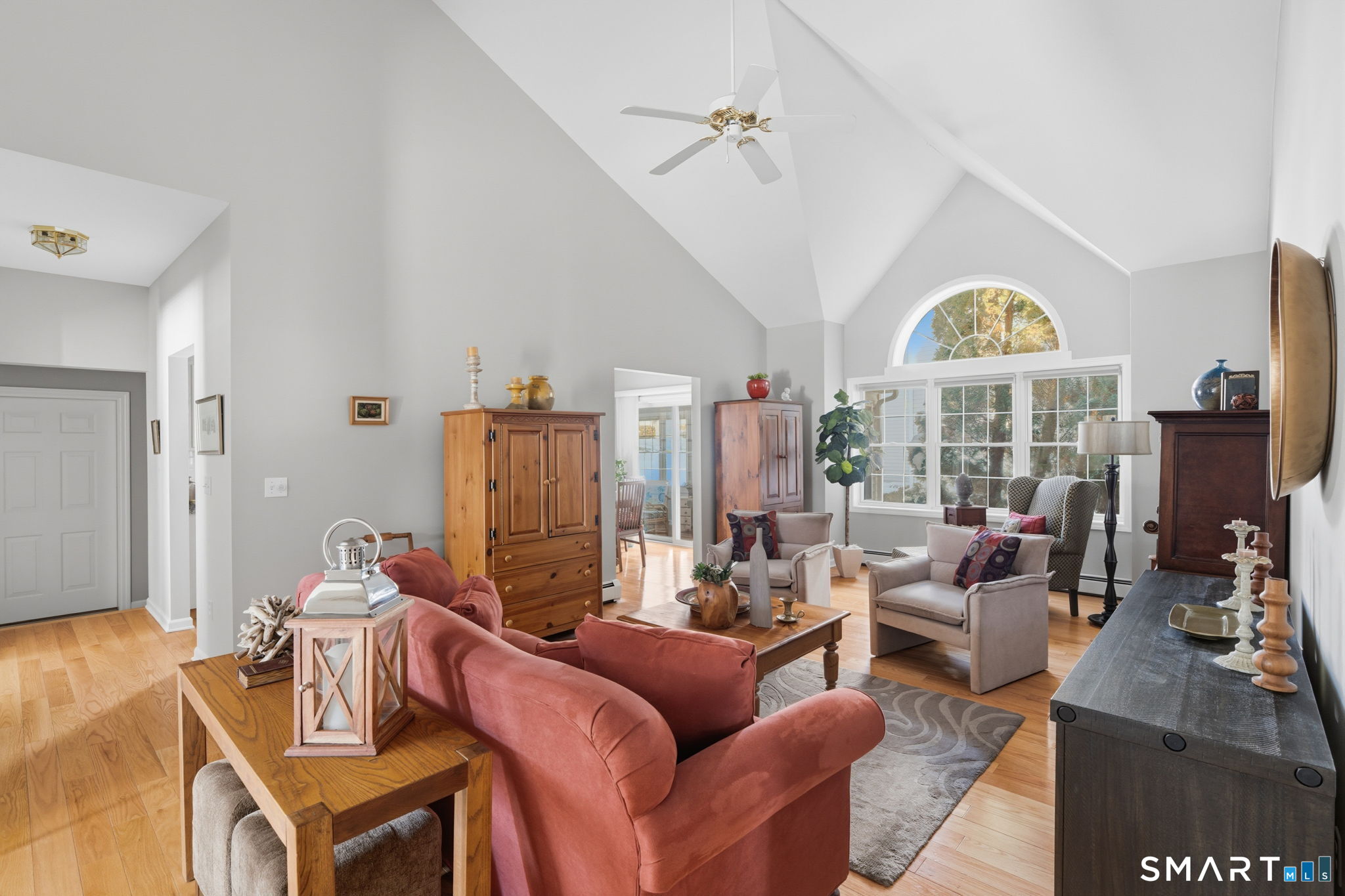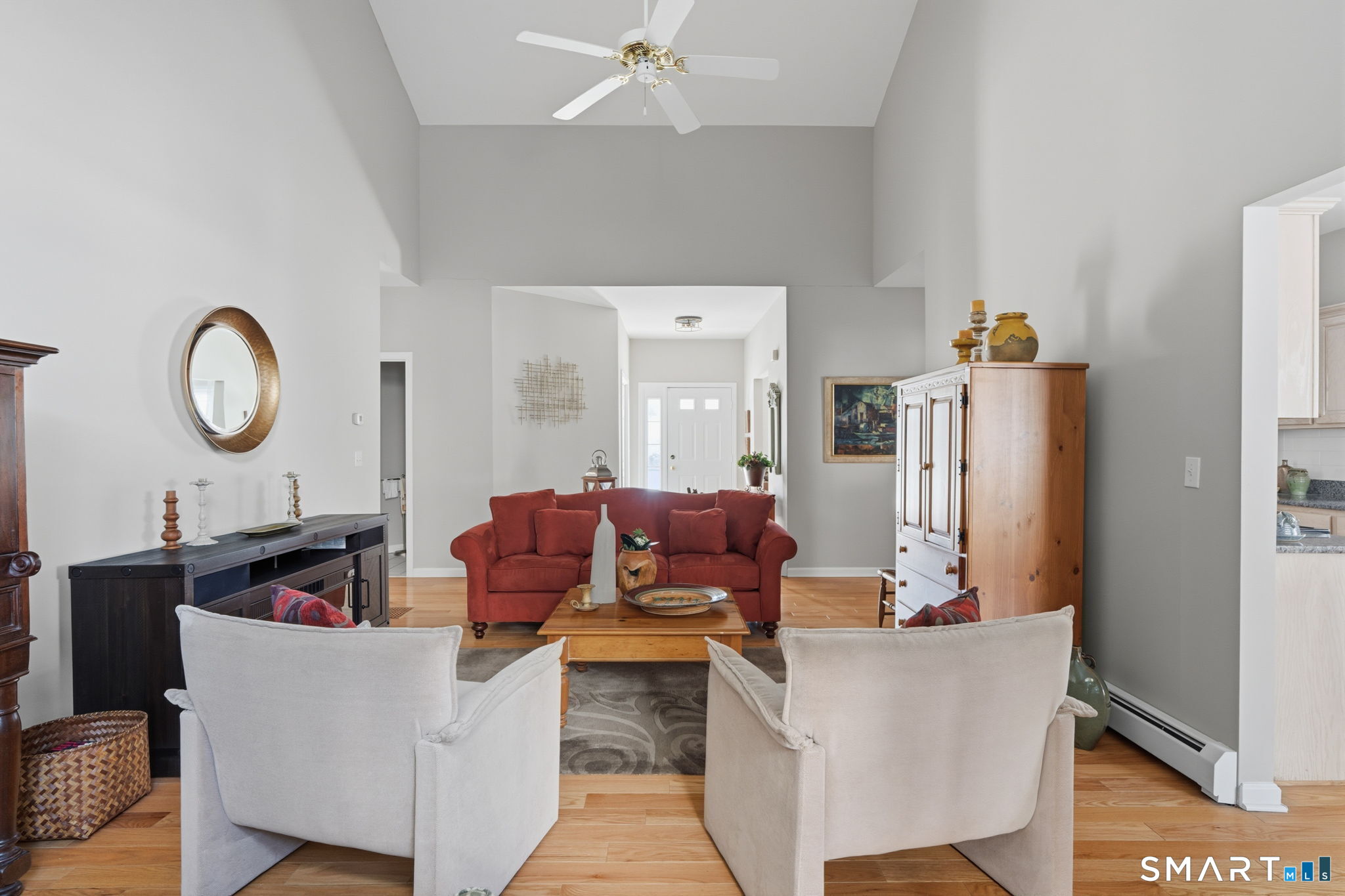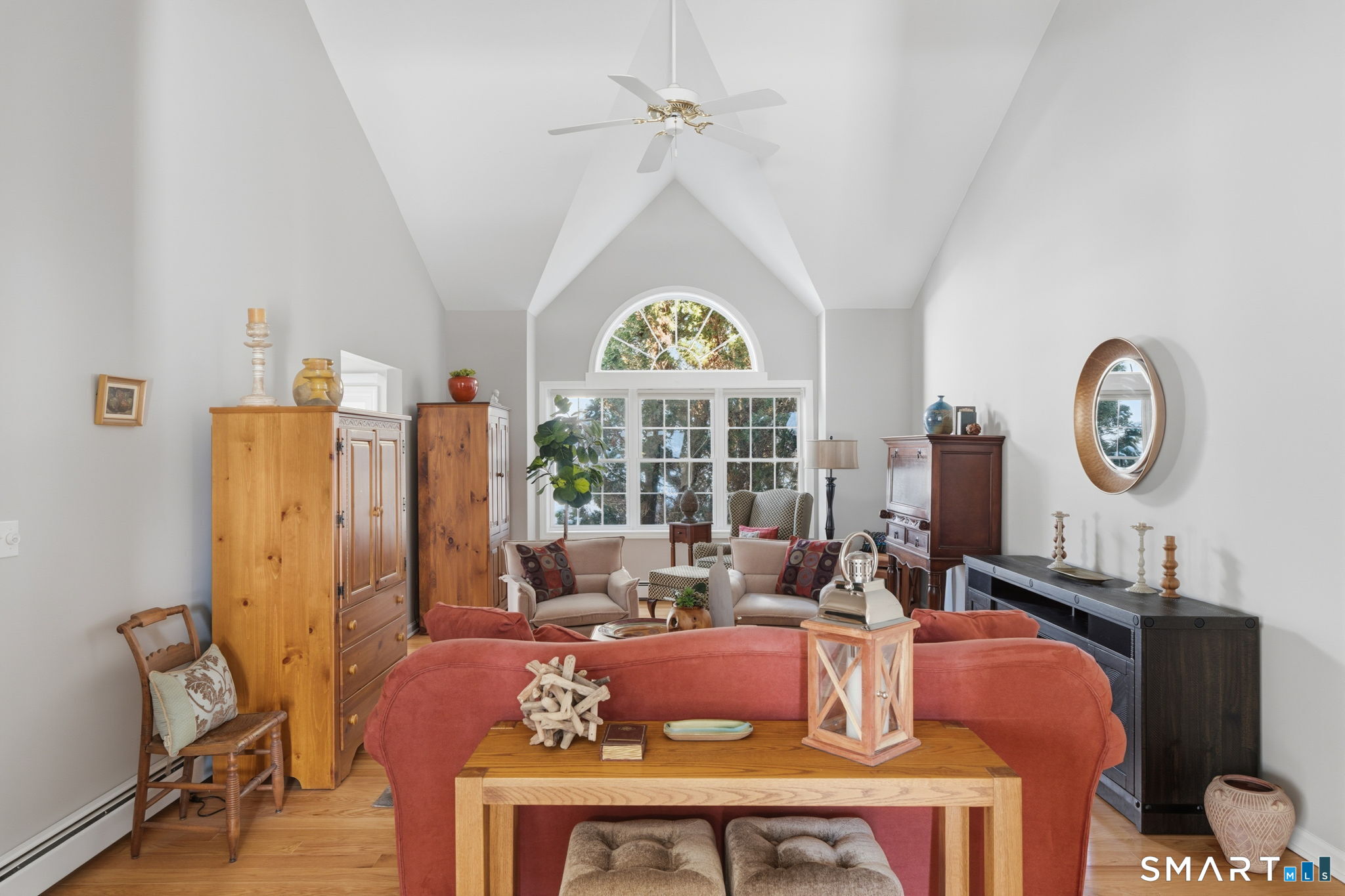Turn-key, contemporary ranch-style condo located in desirable South Pond Village, a well-maintained 55+ community. Set on a corner location, this move-in-ready home features hardwood floors throughout, fresh interior paint, and a bright, open layout. The spacious living room offers a cathedral ceiling and flows seamlessly into the formal dining room-ideal for entertaining. The remodeled eat-in kitchen features granite countertops, stainless steel appliances, and ample cabinetry. Enjoy year-round relaxation in the four-season sunroom, which opens to a private, covered deck. The home offers two generously sized bedrooms and two full bathrooms, including a primary bedroom with an en-suite bath. Additional highlights include convenient first-floor laundry, a full basement for storage, and a one-car attached garage. A rare opportunity for easy, low-maintenance living in a peaceful community close to shopping, dining, and major routes.
