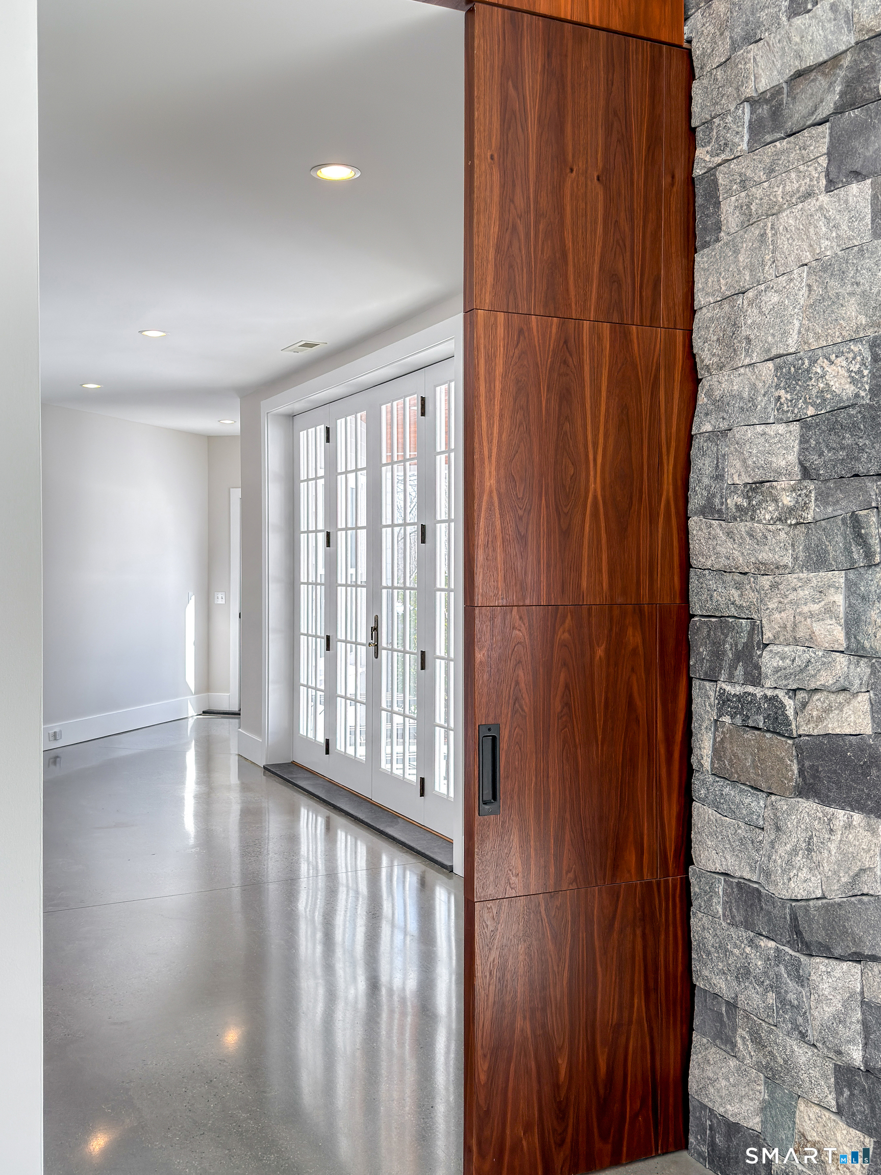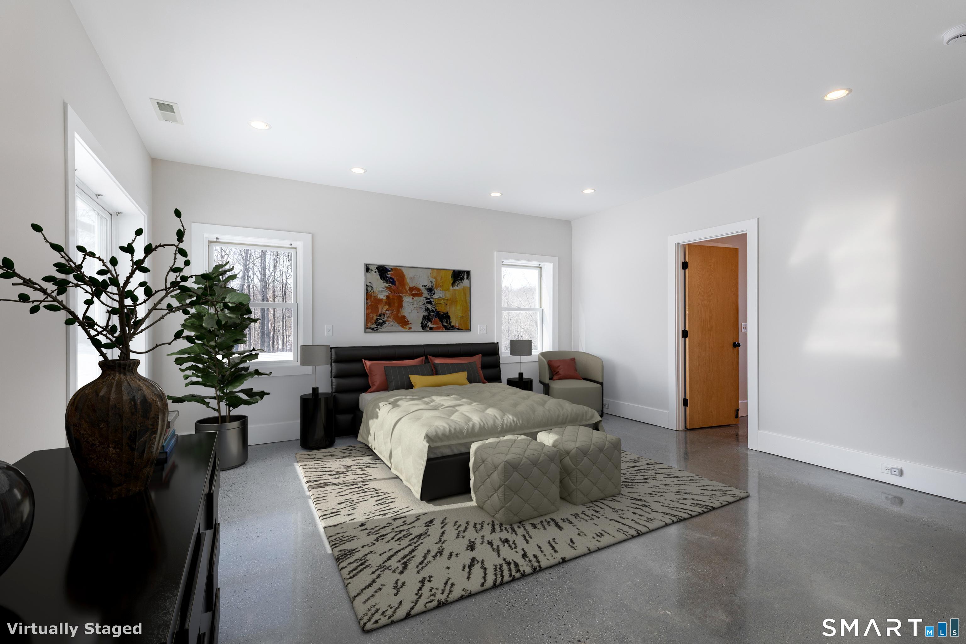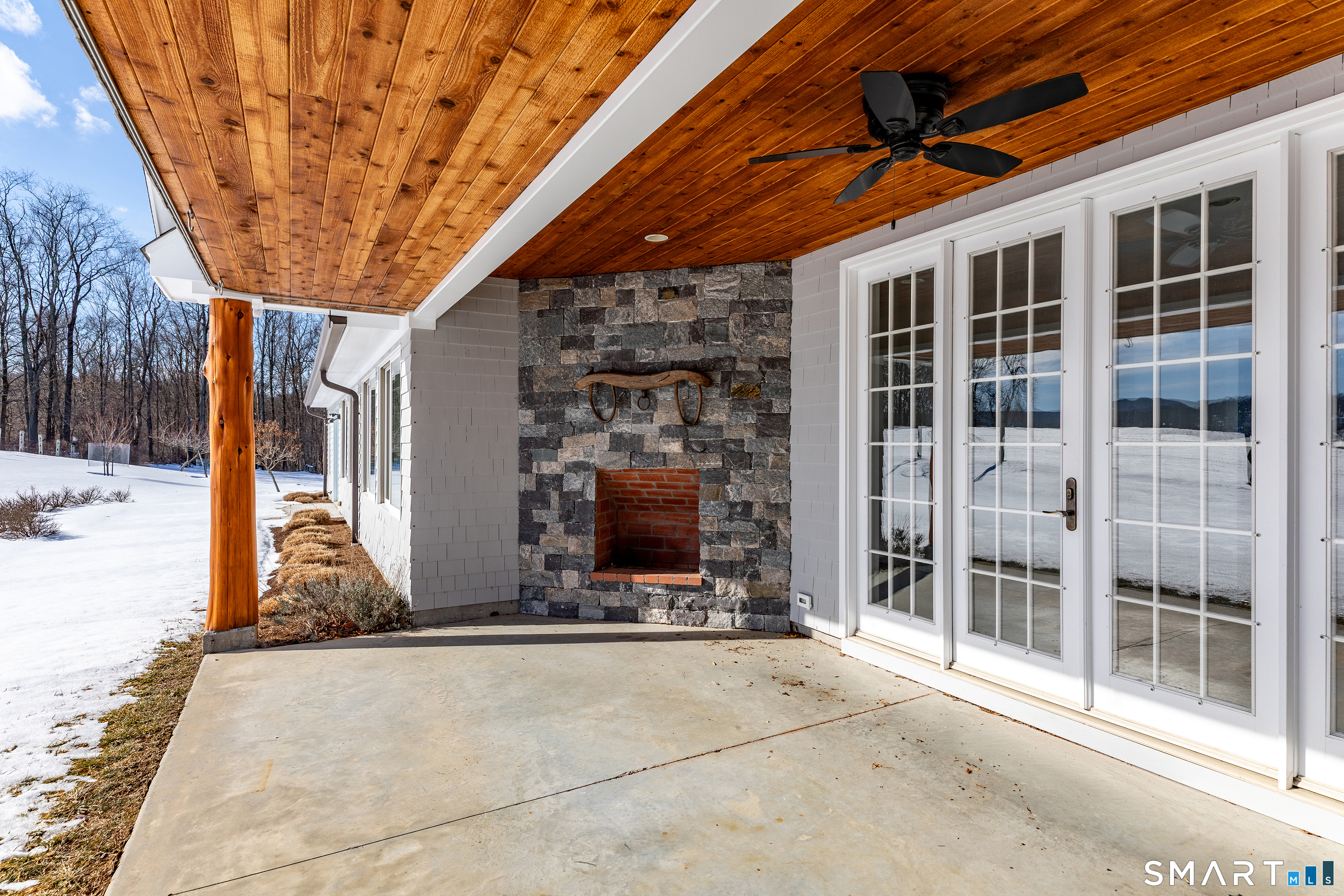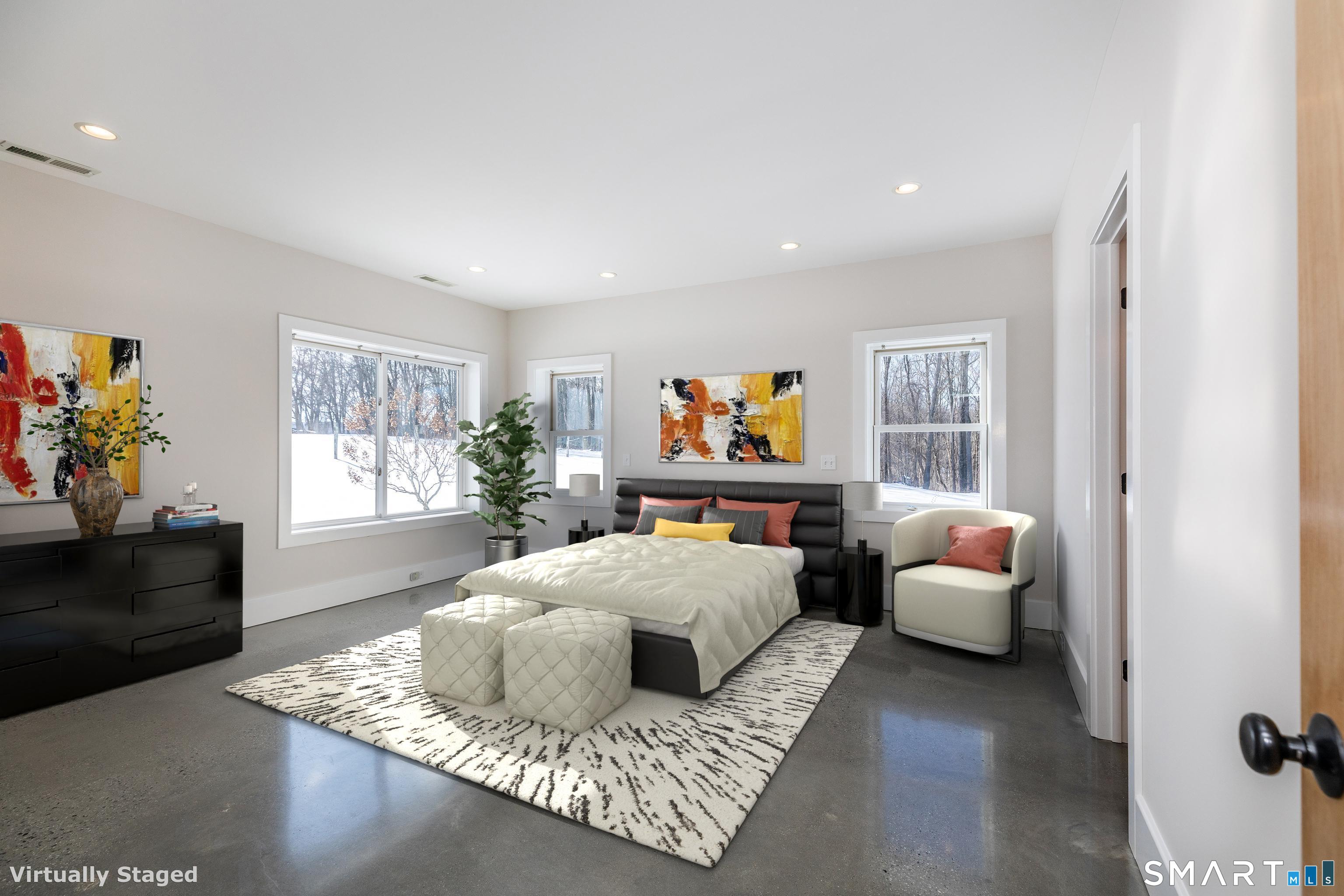 Beautifully sited on a gentle rise, this striking Contemporary commands sweeping panoramic views of the surrounding landscape. The home overlooks the iconic Happy Acres Farm, permanently preserved by the Town of Sherman, ensuring timeless pastoral vistas. The open floor plan features three bedrooms, including a main-level primary suite, three full and two half baths, a main-level study, and a dramatic living/dining space with vaulted ceilings and a stone-faced, double-sided bio-ethanol fireplace. The sleek kitchen includes quartz countertops, bar seating, a walk-in pantry, and top-tier SS appliances. The main level's polished concrete floors and walls of oversized windows frame stunning front and rear views, filling the home with natural light. Upstairs are two en suite bedrooms with a large, shared sitting/playroom. Additional features include a walk-up attic with excellent expansion potential, radiant heat throughout the home and three-car garage, plus a separate laundry room. Outdoor living is equally inviting with an eight-person hot tub overlooking the rolling countryside and French doors opening to a covered patio with an outdoor fireplace. There is also your own golf tee! Freshly stained exteriors and newly painted interiors create an elegant, turnkey, move-in-ready residence. Ideally located just 90 minutes from Manhattan and minutes to NYC trains.