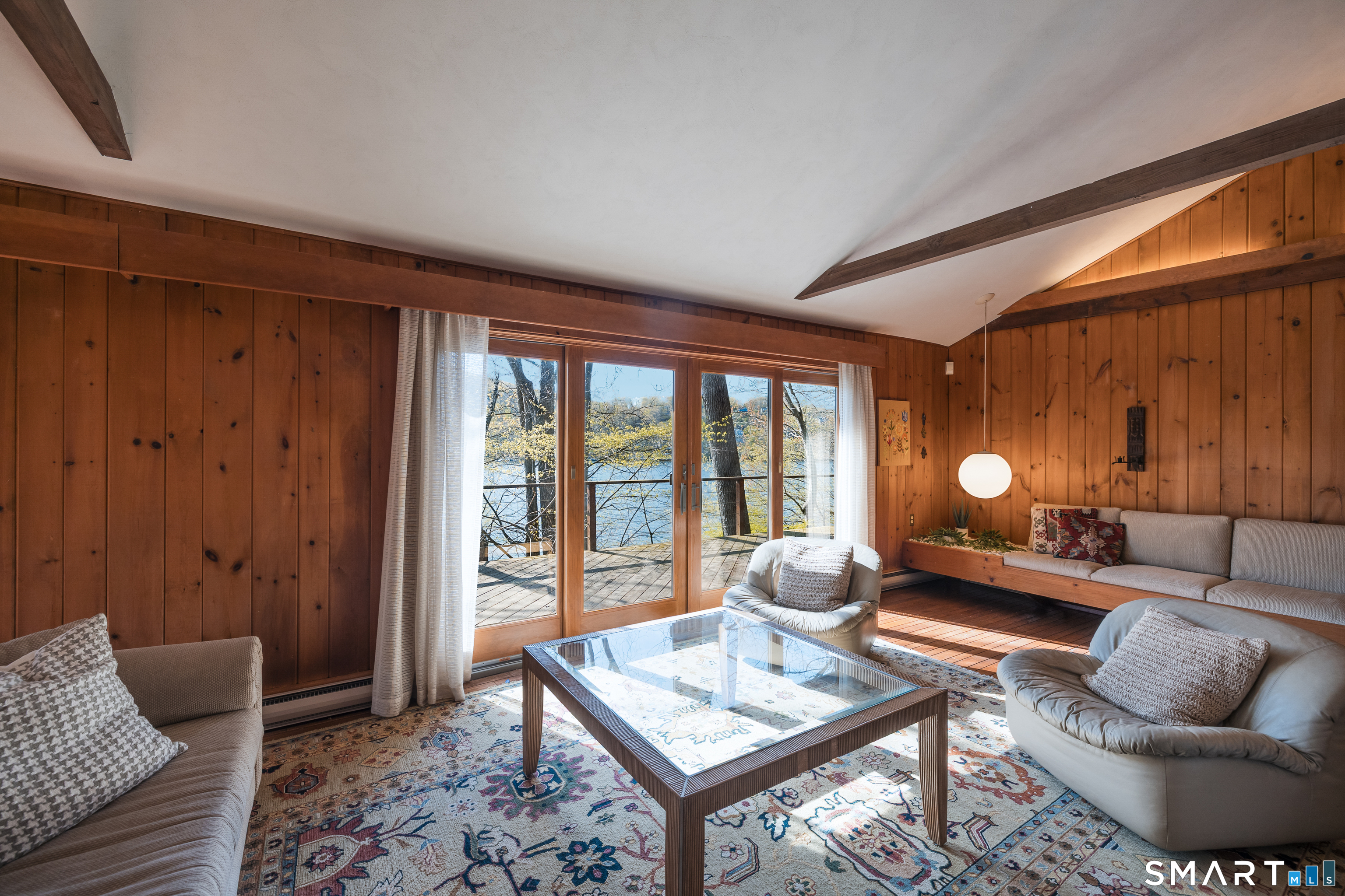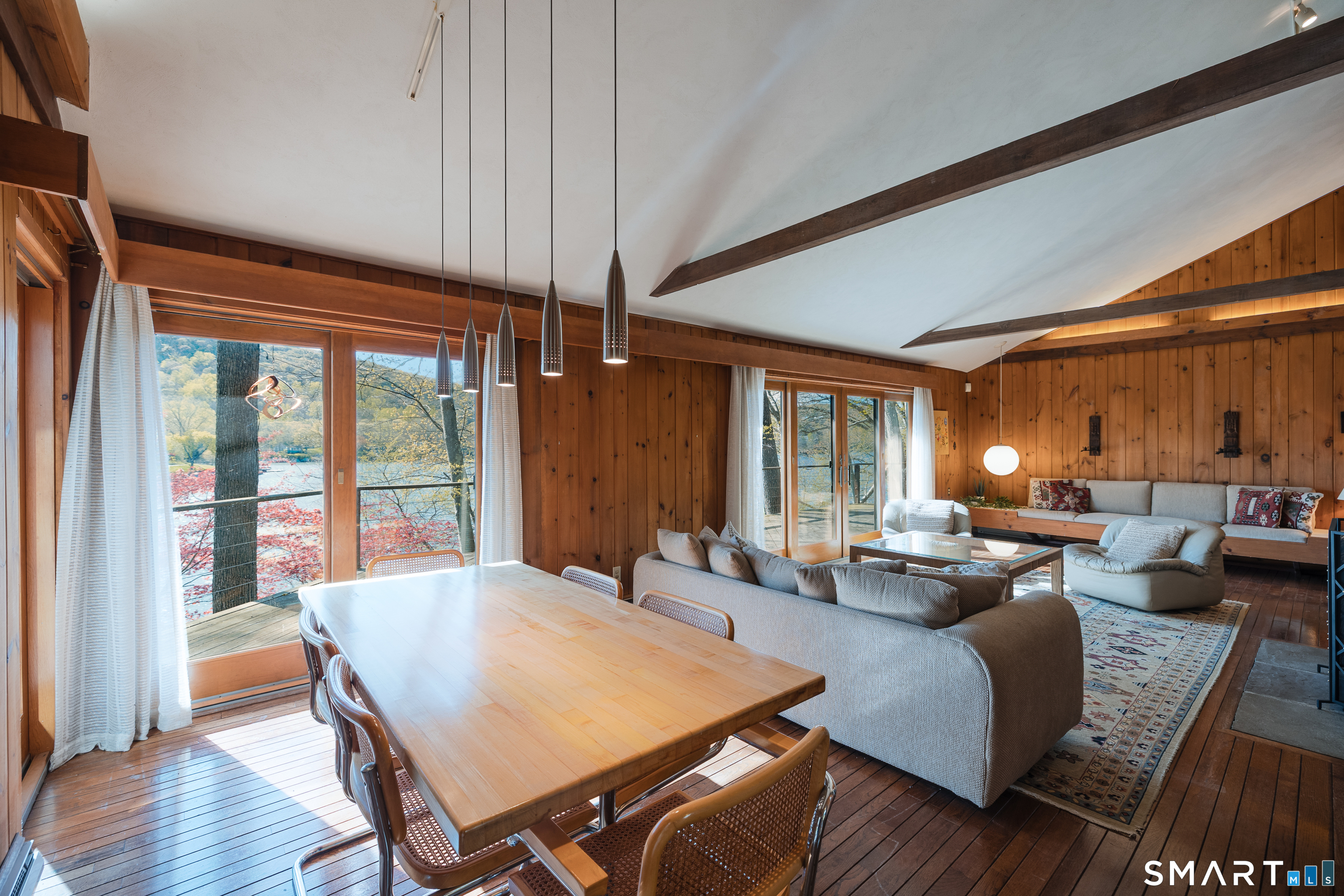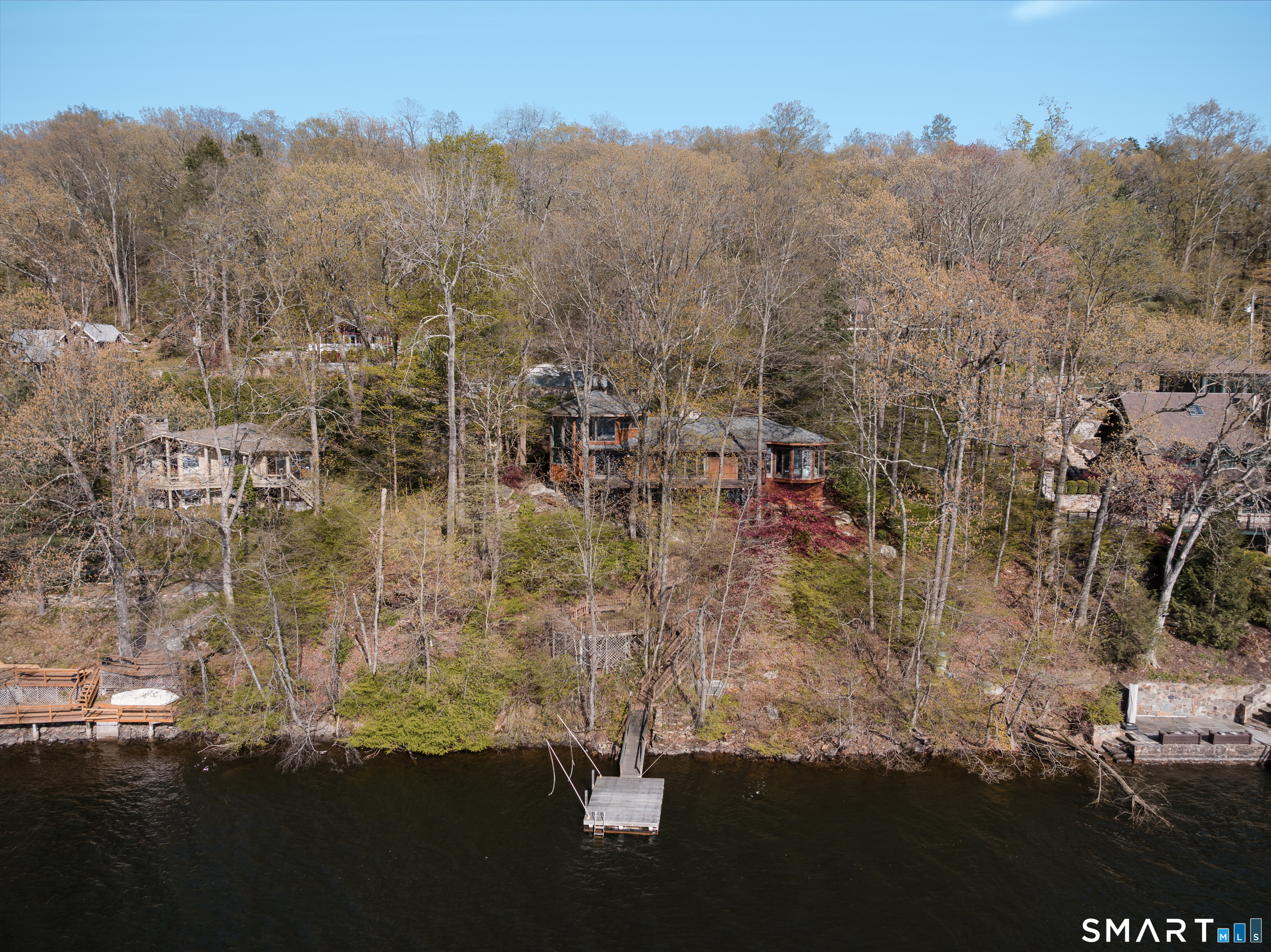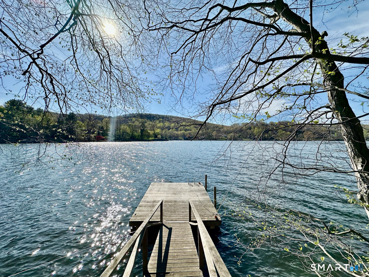 Nestled along the shores of Candlewood Lake, this masterpiece of mid-century modern design, blends timeless elegance with waterfront living. The home is a sanctuary of light and space, featuring clean lines, expansive windows, and an open floor plan that invites the outdoors in. Step inside to discover a sunlit open floor plan with warm wood finishes, and panoramic western views of the lake. Beyond, the expansive three season great room blends the inside with the outside, and has direct access to a private front deck. The kitchen is tucked back and, flows seamlessly into the dining area, making it perfect for everything from quiet breakfasts to lively dinner parties. The primary suite, encompassing the second, floor offers a tranquil retreat with the feel of a private tower overlooking the water. The lower level boast a third bedroom, full bath and lakeside access. Outside, your private oasis awaits. Lounge on the spacious deck, or take the steps down to your own dock and enjoy boating, kayaking, or simply soaking in the lake's beauty. The naturally landscaped grounds enhance the home's architectural charm, creating an idyllic setting for relaxation or entertaining. Located in the coveted Ferris Estates community, this property combines privacy with convenience, offering easy access to New Milford's charming downtown, and easy commute to NYC. Whether you're seeking a weekend getaway or a year-round residence, this home captures the essence of lake living.