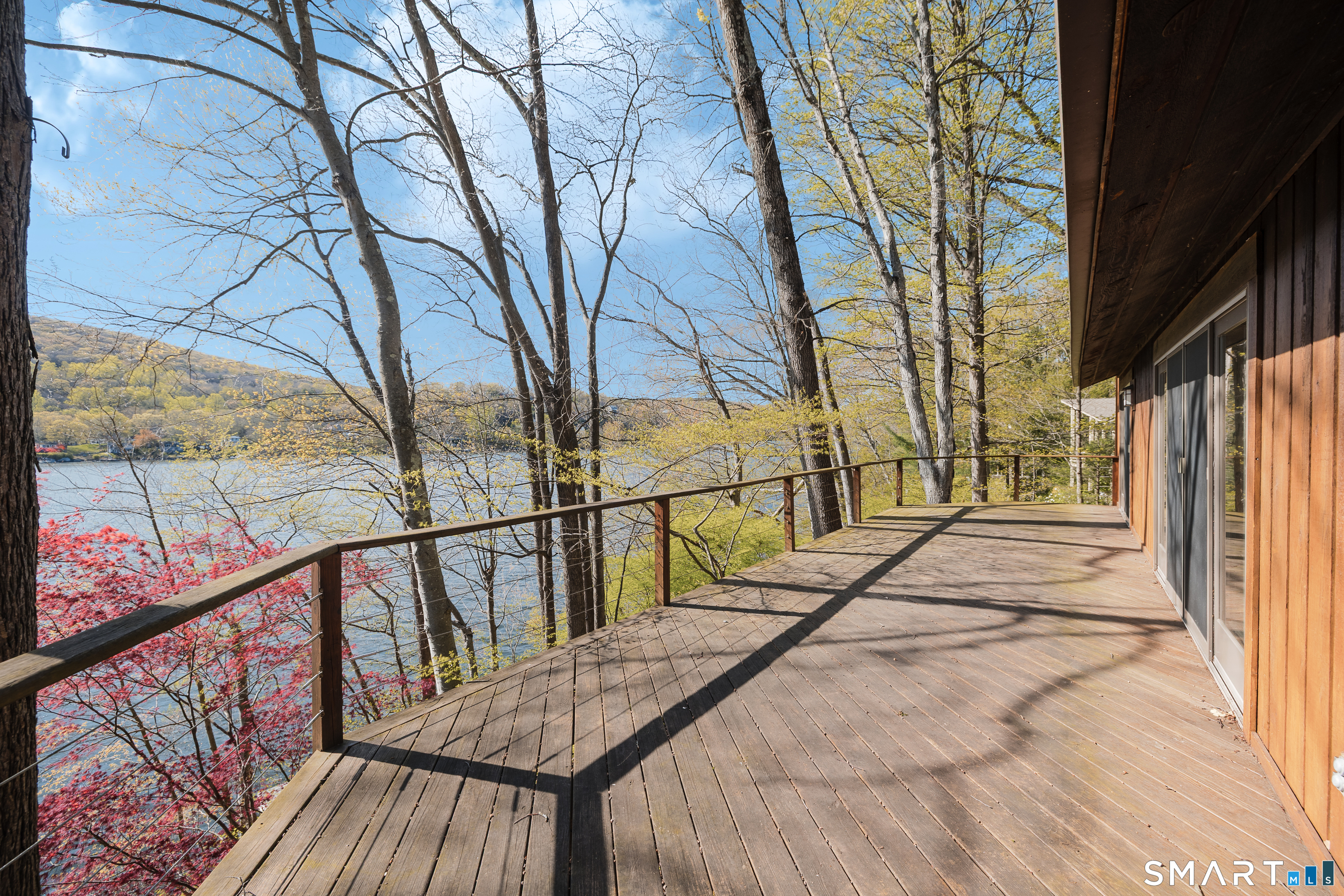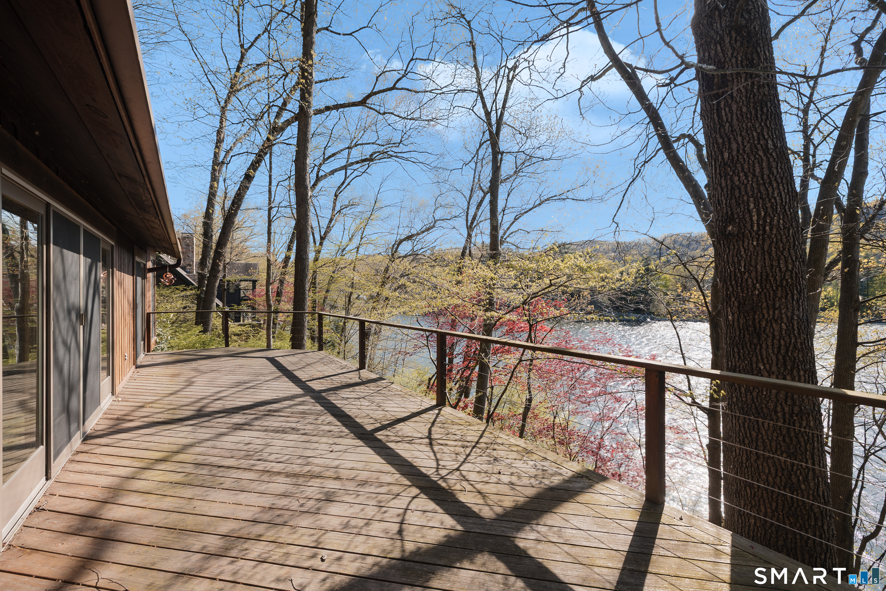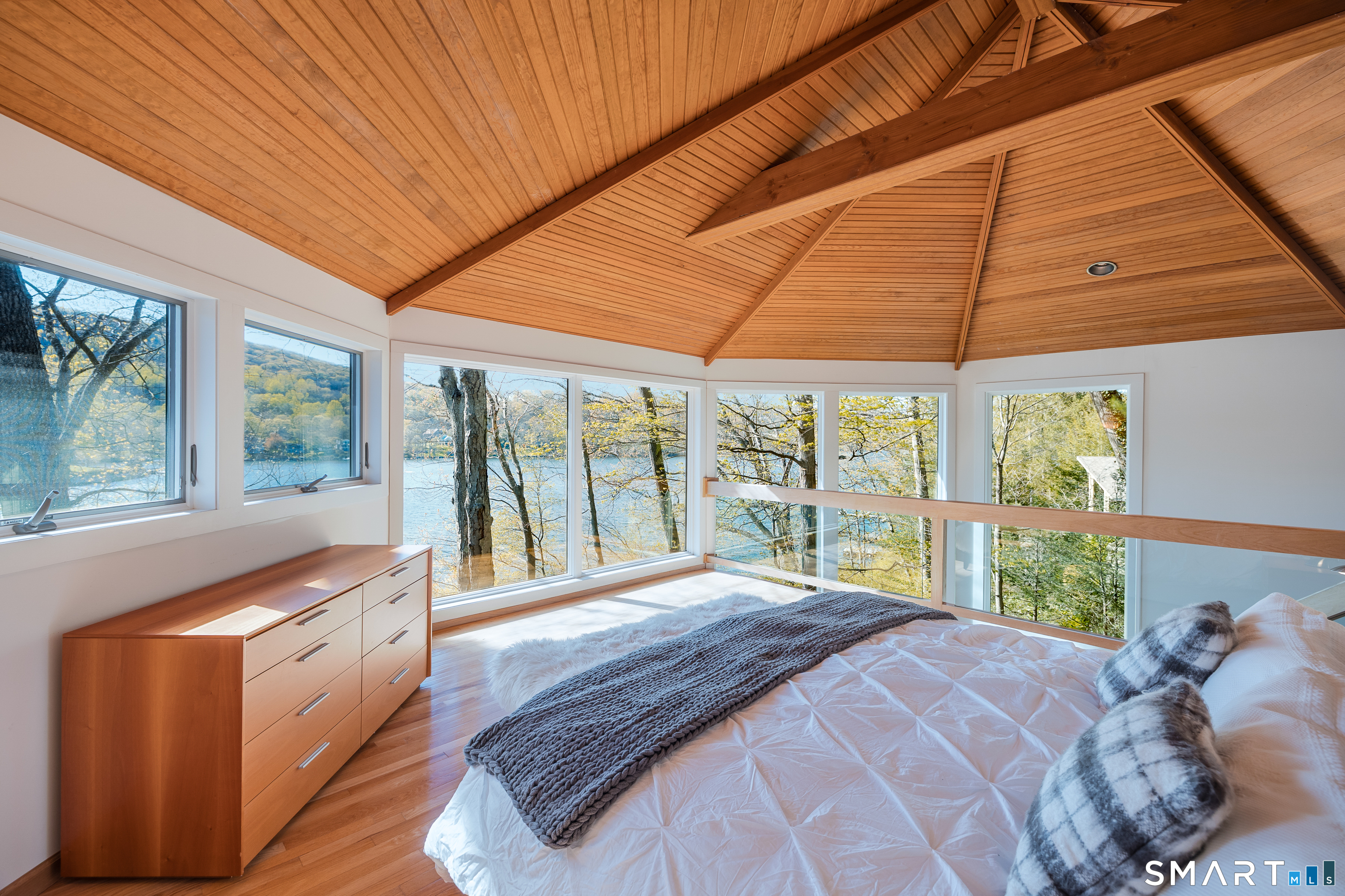 Nestled along the shores of Candlewood Lake, this masterpiece of mid-century modern design, blends timeless elegance with waterfront living. The home is a sanctuary of light and space, featuring clean lines, expansive windows, and an open floor plan that invites the outdoors in. Step inside to discover a sunlit open floor plan with warm wood finishes, and panoramic western views of the lake. Beyond, the expansive three season great room blends the inside with the outside, and has direct access to a private front deck. The kitchen is tucked back and, flows seamlessly into the dining area, making it perfect for everything from quiet breakfasts to lively dinner parties. The primary suite, encompassing the second, floor offers a tranquil retreat with the feel of a private tower overlooking the water. The lower level boast a third bedroom, full bath and lakeside access. Outside, your private oasis awaits. Lounge on the spacious deck, or take the steps down to your own dock and enjoy boating, kayaking, or simply soaking in the lake's beauty. The naturally landscaped grounds enhance the home's architectural charm, creating an idyllic setting for relaxation or entertaining. Located in the coveted Ferris Estates community, this property combines privacy with convenience, offering easy access to New Milford's charming downtown, and easy commute to NYC. Whether you're seeking a weekend getaway or a year-round residence, this home captures the essence of lake living.