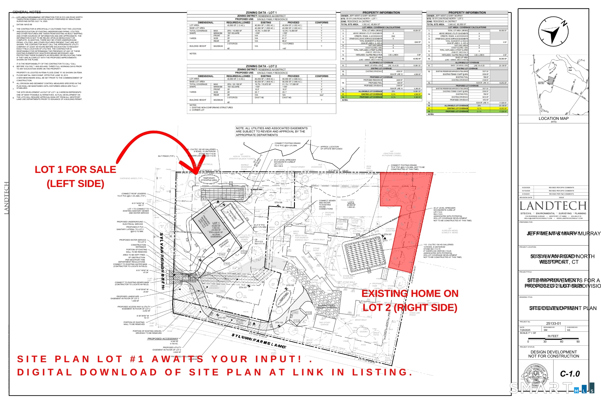 DREAM YOUR TOMORROW This 1.05 acre of dry, level land that is available for sale, is beautifully sited in the middle of Westport's Old Hill and awaits your imagination. Enter through the original gates of the 1928 Arthur Whiteside Estate at 50 Sylvan North --- the park-like entry to the 25-acre estate built for Whiteside, who founded and headed the commercial credit rating firm of Dun & Bradstreet. There in the 1930's, he perfected a system whereby a client could receive an accurate credit rating on a business within 2 minutes of a request. Whiteside's original Tudor home is visible in the distance where the Sellers of Lot #1 will remain in residence on Lot #2. LOT 1 FOR SALE is flat, pristine and park-like, and enclosed by 1920's fieldstone drywalls which run a full 450' along Sylvan Road North frontage. The Town-Approved Site Plan (FOR DESIGN DEVELOPMENT NOT CONSTRUCTION) is open for refinement by the Buyer and has Sewer and City Water available at street for connection. Note that Seller has requested feedback from Southern CT Gas about possible hookup to an existing natural gas line across Sylvan North, but awaiting response by the SCG field manager. Buyer has creative flexibility with siting of their Lot 1 home, utility lines, and other construction-related details. Land Use Attorney Joel Z Green has drafted Deed Restrictions that are attached to this listing. The restrictions detail a square footage guideline of 4500sf and 30ft height on the building, with
