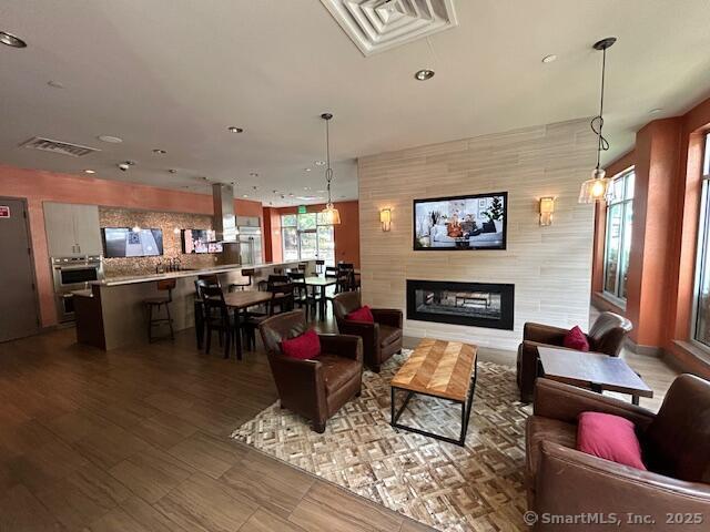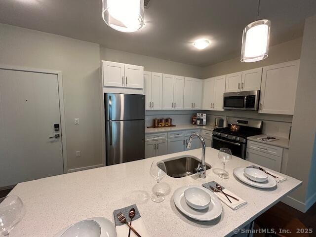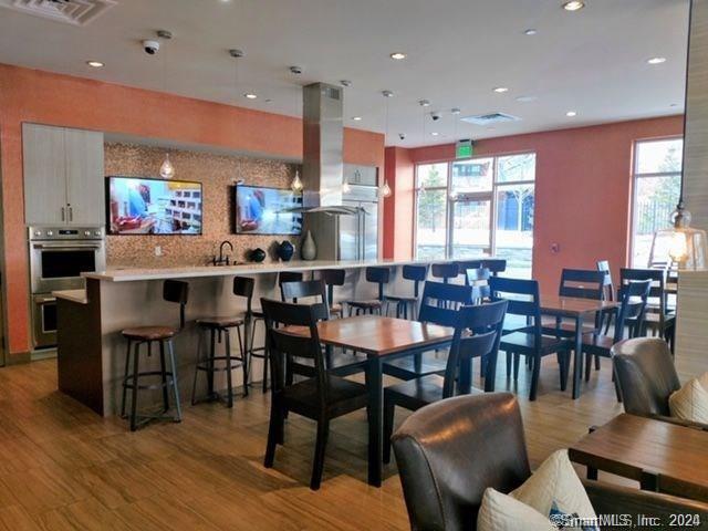 Complex is Element One - Short/Long term-Like New 1 br 1 bth apartment home in luxury midrise bldg. w/ modern design and upscale features in the heart of vibrant downtown Stamford! This unit has a gourmet eat in kitchen w/ high end cabinetry, tile backsplash, quartz countertops, stainless steel appliances- gas stove, dishwasher, microwave, breakfast bar that opens into sunfilled living/dining area w/ walls of glass & plenty of sunlight, master br suite w/ walk in closet and private full sized luxury bathroom, gleaming hardwood floors, fresh paint, 9ft ceilings, central air, laundry inside the apt, professional gym w/ cardio/weight equipment, fitness on demand, roof top deck w/ grills/patio furniture, clubroom, 2 chefs kitchens perfect for demonstrations or entertaining, conference room w/ boardroom seating/tv/presentation equipment, Wifi coffee bar, multiple lounges w/ fireplaces, couches and table seating, pet friendly, garage spaces are available, shuttle/walk to train, minutes to highways, beaches, shops, nightlife, low security deposit, package reception, 24 hour emergency maintenance.