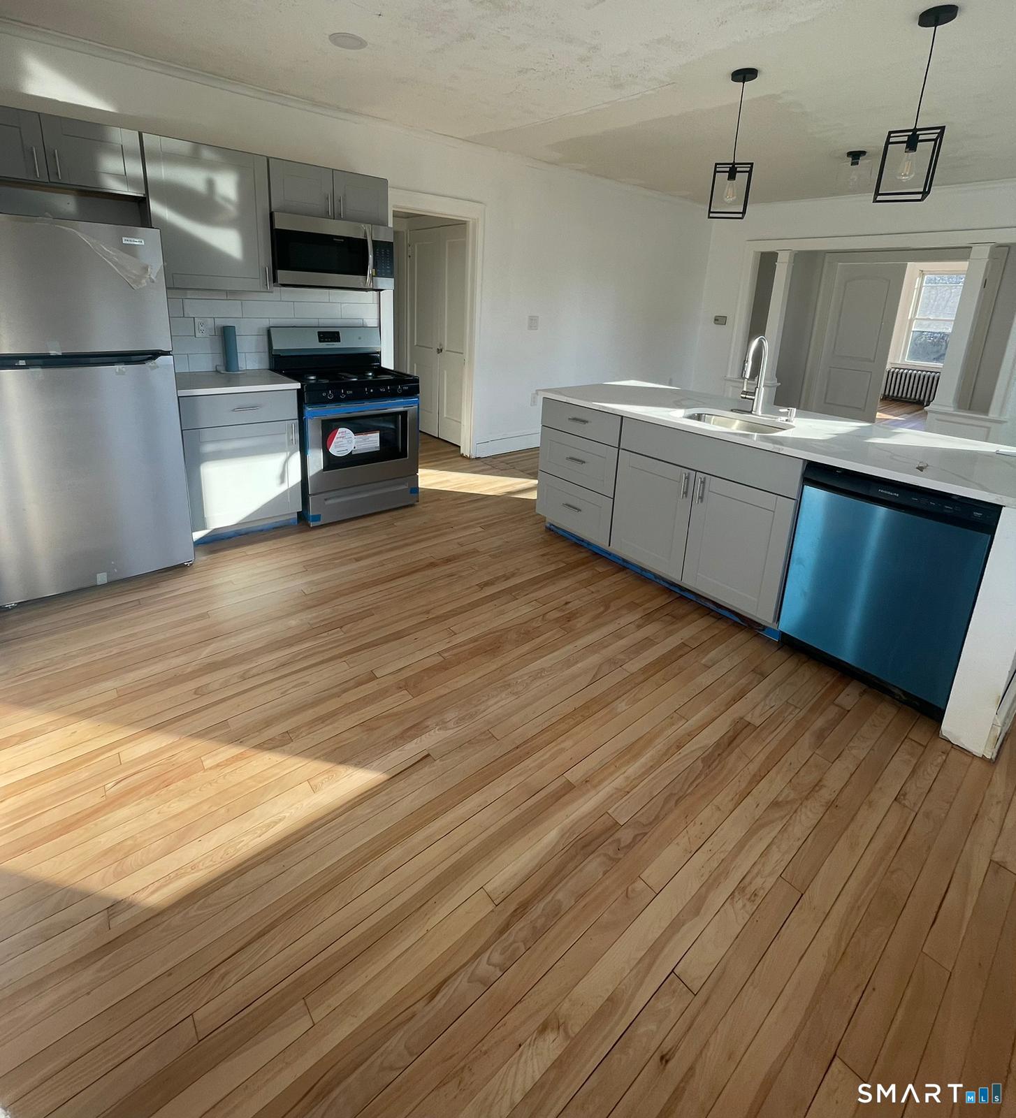 Welcome home to this beautifully renovated 3-bedroom, 1-bath second-floor unit offering modern style and thoughtful design throughout. This apartment has been fully gutted and remodeled, delivering a fresh, move-in-ready living experience. The brand-new kitchen features shaker cabinets, quartz countertops, and a bar-stool overhang, perfect for casual dining or entertaining. A walk-in pantry adds exceptional storage and conveniently houses a brand-new washer and dryer. The bathroom has been completely remodeled with clean, contemporary finishes, and all three bedrooms offer generously sized closets rarely found in apartment living. Located in a quiet residential neighborhood of New Britain, this home offers easy access to local parks, shopping, dining, CCSU, and major highways, making commuting and daily errands a breeze. A rare opportunity to enjoy modern living in a well-established community, don't miss it!