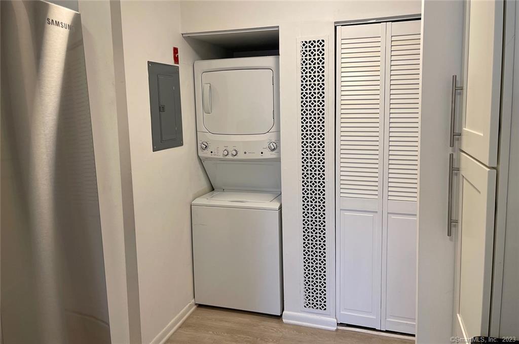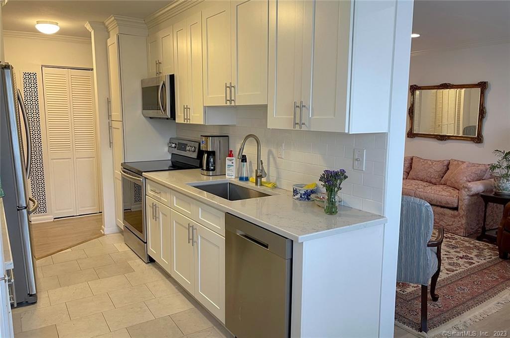 This sun-filled and spacious first-floor residence offers two bedrooms and two full bathrooms. The updated kitchen opens to a private, inviting patio with tranquil views of mature trees and landscaped gardens. The primary suite features an en-suite bath and a walk-in closet. Additional highlights include an in-unit washer and dryer and a one-car garage. Set within the desirable Southport Woods community, residents enjoy exceptional amenities such as a heated in-ground pool, clubhouse, paddle tennis courts, and on-site property management. Ideally located near trains, major highways, beaches, and shopping, with a short stroll to the charming historic Southport Harbor and Village.