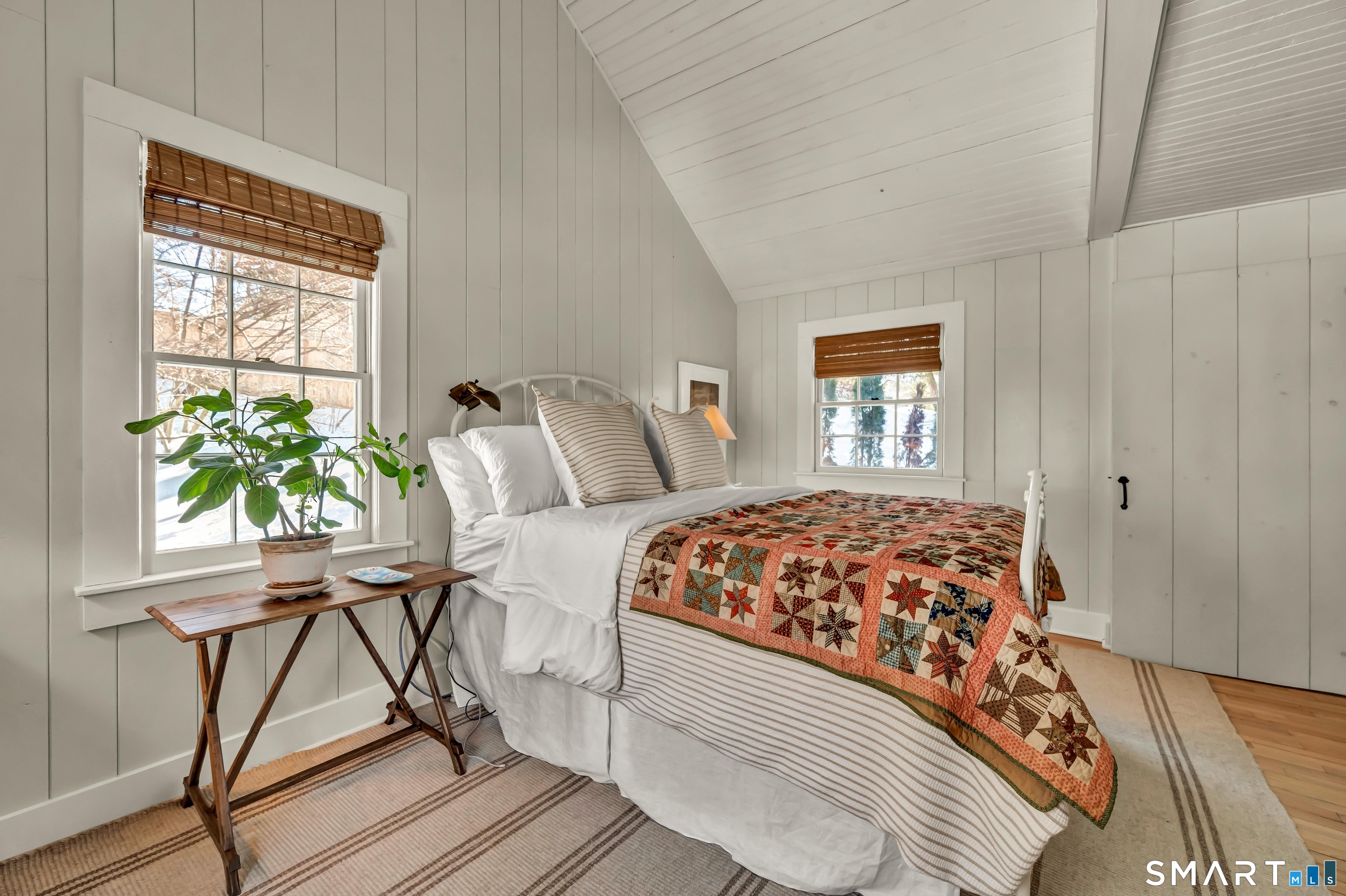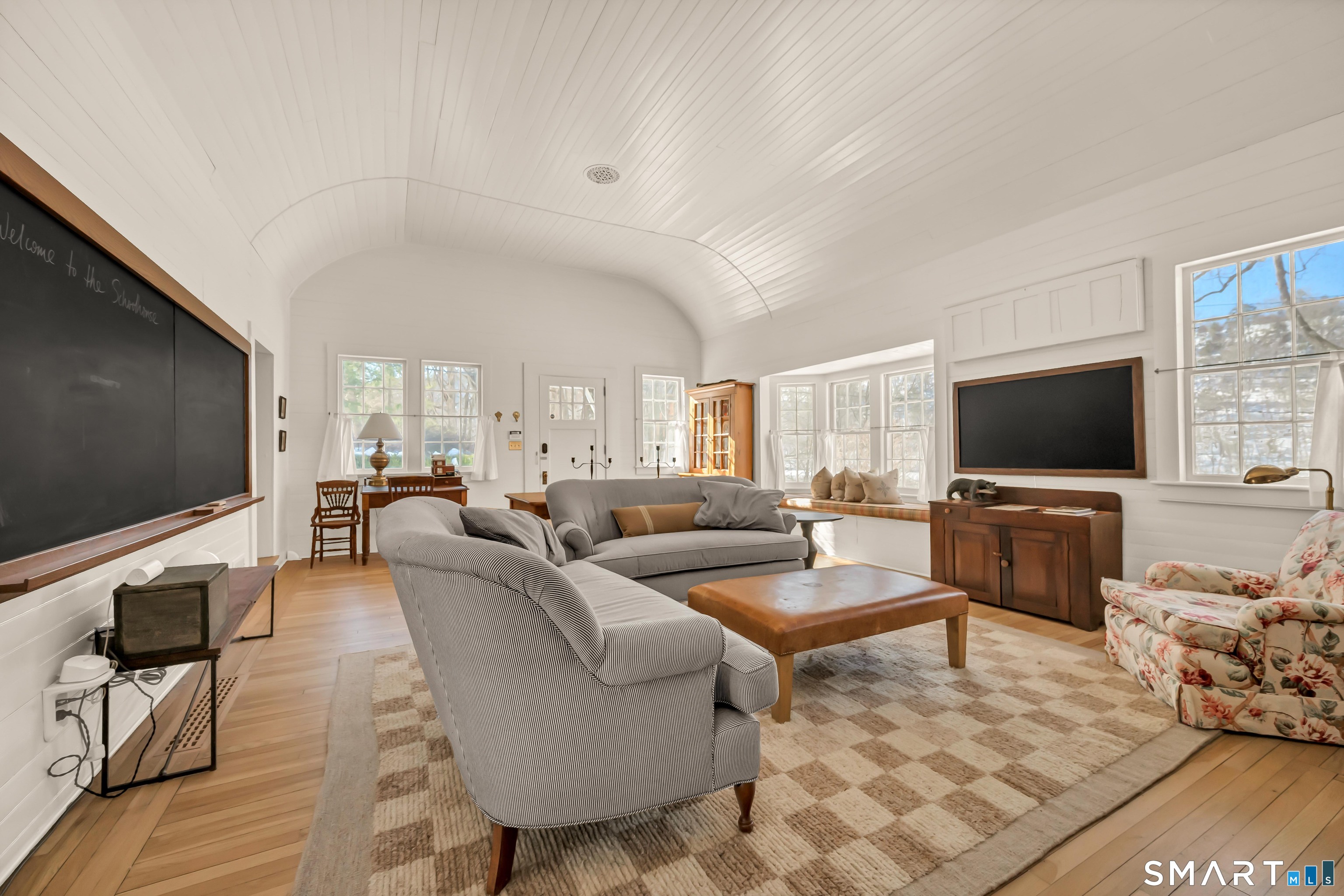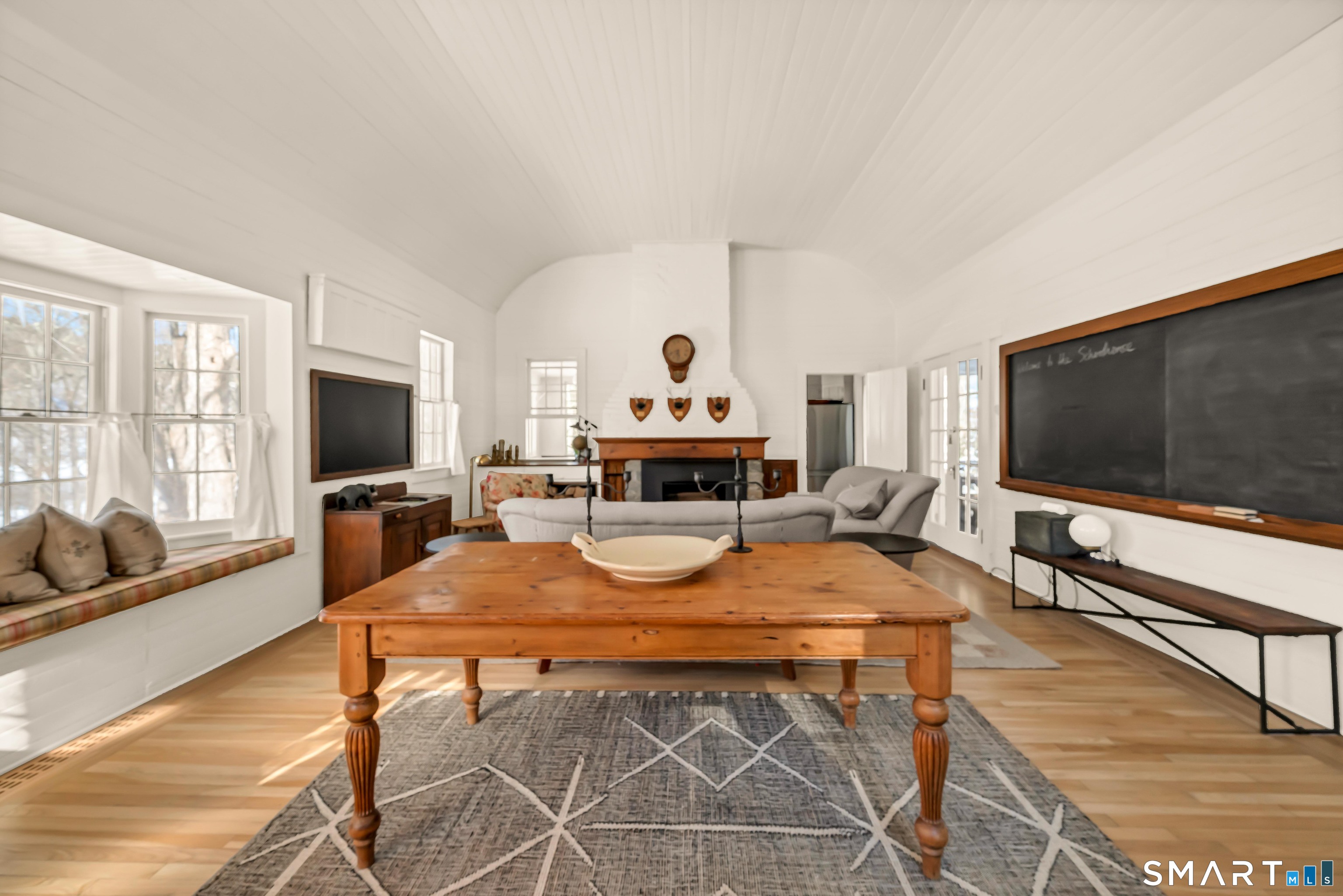A rare summer retreat: a thoughtfully updated former schoolhouse, rich in history and beautifully positioned in one of Litchfield County's most desirable and quiet river corridors, with direct Lake Lillinonah frontage and a privately set gunite pool-just 90 minutes from Manhattan. This idyllic location in a charming village with a great market/cafe, parks, and walking trails offers easy access to the theater, restaurants, and conveniences of the historic Green in New Milford. It is also a short drive to Washington Depot for taverns, conveniences, art events, and restaurants. Inside, the heart of the home is the original schoolroom, now a main-level living space with a barrel ceiling and central fireplace. This extraordinary room functions comfortably as a place to gather, relax, or dine. Wood floors and cedar closets run throughout the three-bedroom, two-bath residence, adding warmth. The retro-style kitchen features a cozy corner banquette with open views to the outdoors. A screened dining porch invites long, lingering summer meals overlooking a babbling stream and lush greenery. A footbridge leads to the privately nestled gunite pool, completing an exquisite and rare setting, and an unforgettable place to spend the summer. Availability can be flexible. Inquire