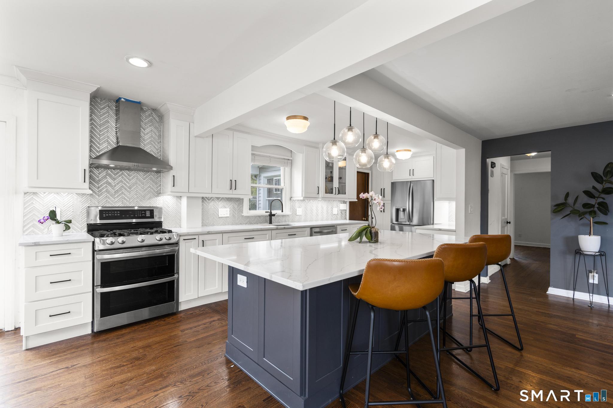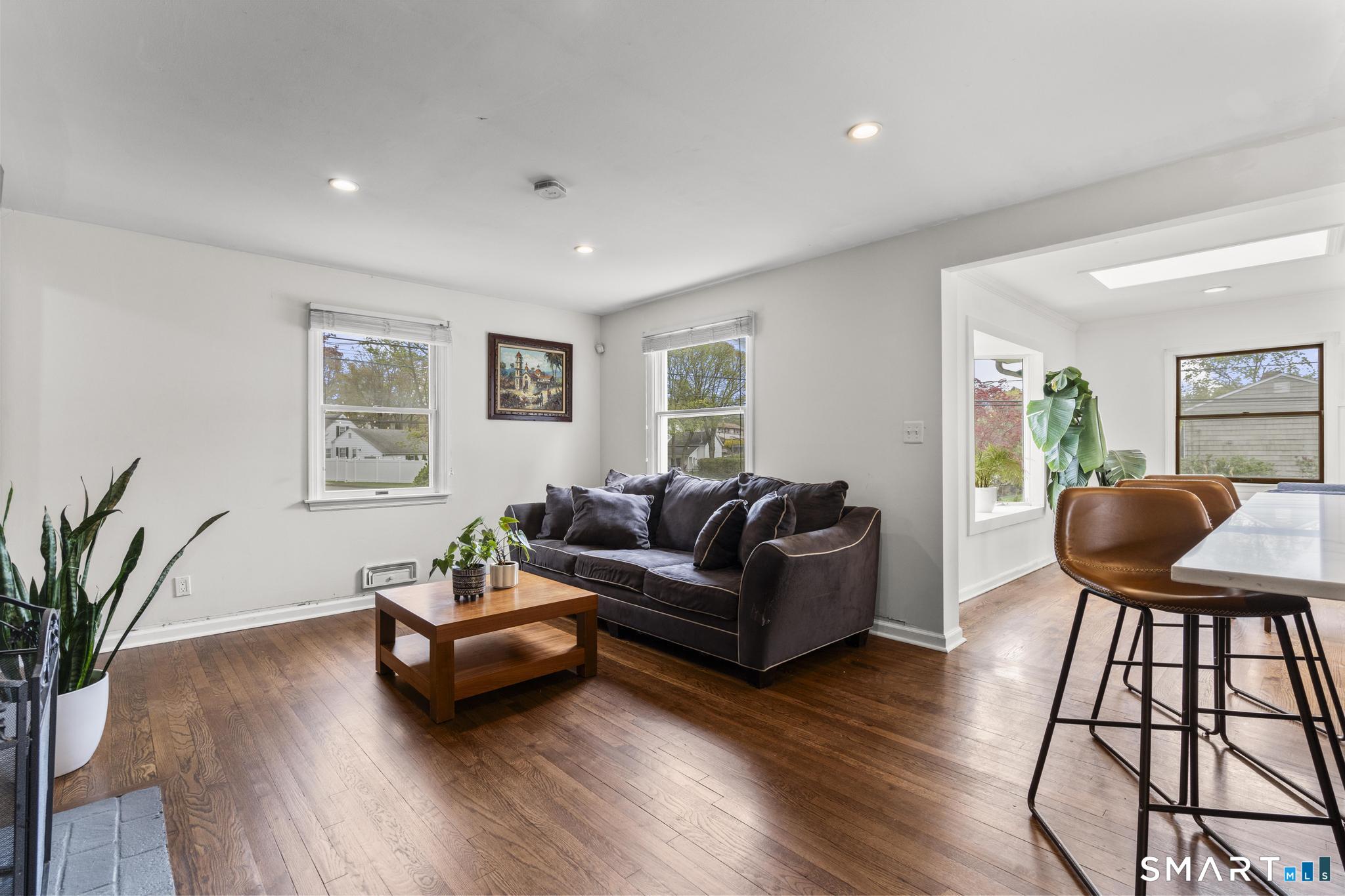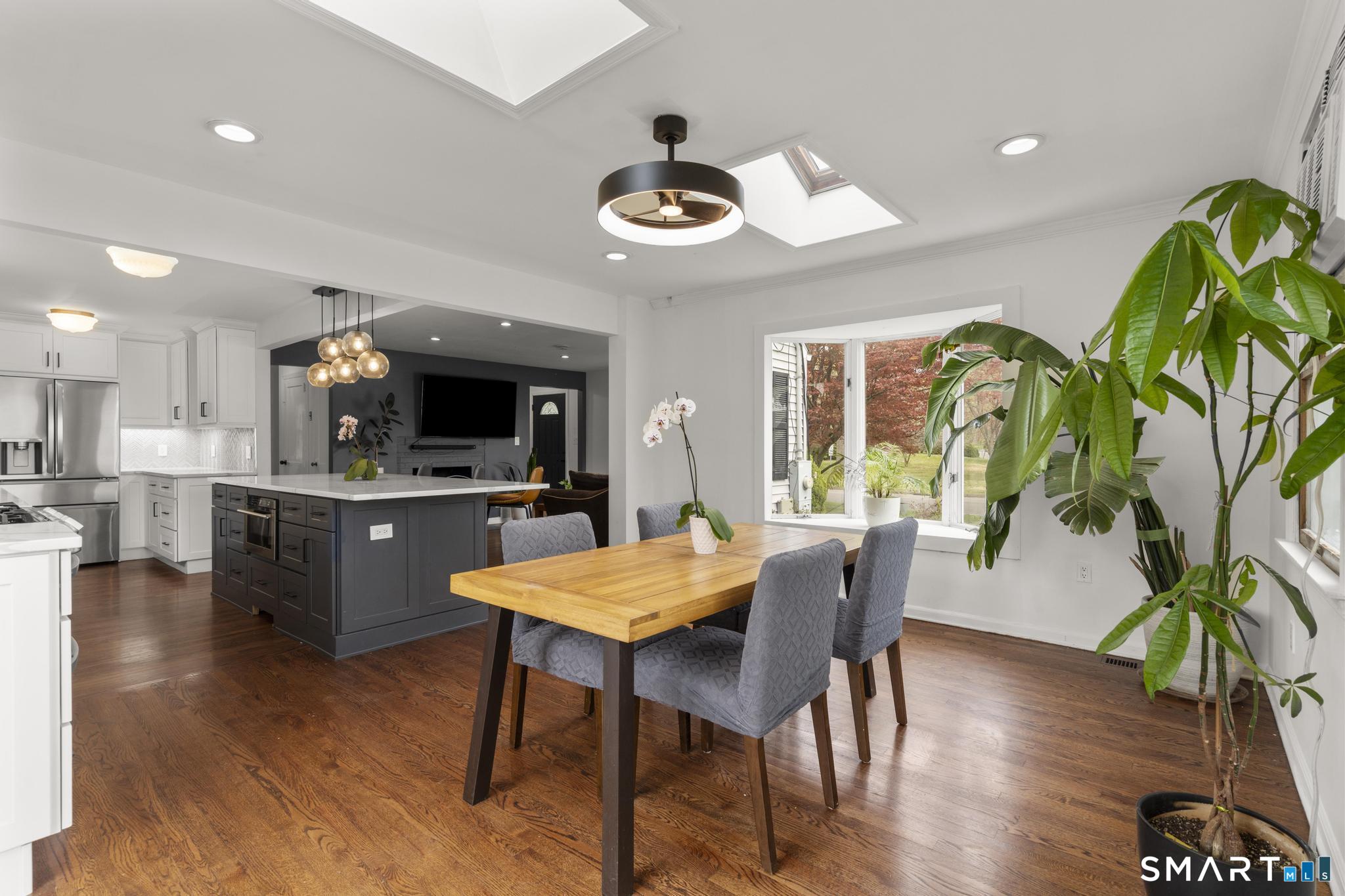 Location, Location, Location! Set on a level .22-acre corner lot in coveted Upper Springdale, this beautifully renovated 4 bedroom, 3 bath Cape offers a blend of charm & modern updates. Featuring a stunning open-concept living, dining, and kitchen area anchored by a dream kitchen with oversized island, quartz counters, white shaker cabinets, stainless steel appliances, and hardwood floors throughout. The sun-filled dining area w/ skylights & a slider that flows to a spacious deck overlooking the private, fully fenced yard-ideal for entertaining. A heated sunroom with vaulted ceilings offers flexible space for a den or home office, complete with a second deck and patio overlooking a private side yard. The main level includes two bedrooms and a full bath. Upstairs features two large bedrooms and a beautifully updated full bath. The expansive unfinished basement offers incredible potential for a future gym, office, or in-law setup, with a full bath (sold as is), cedar closet, & ample storage. Additional highlights include a new natural gas furnace with whole-home humidification system, new roof, irrigation system, city water/sewer, and a large shed w/electricity. Convenient to schools, shopping, Merritt Parkway, and Metro-North.