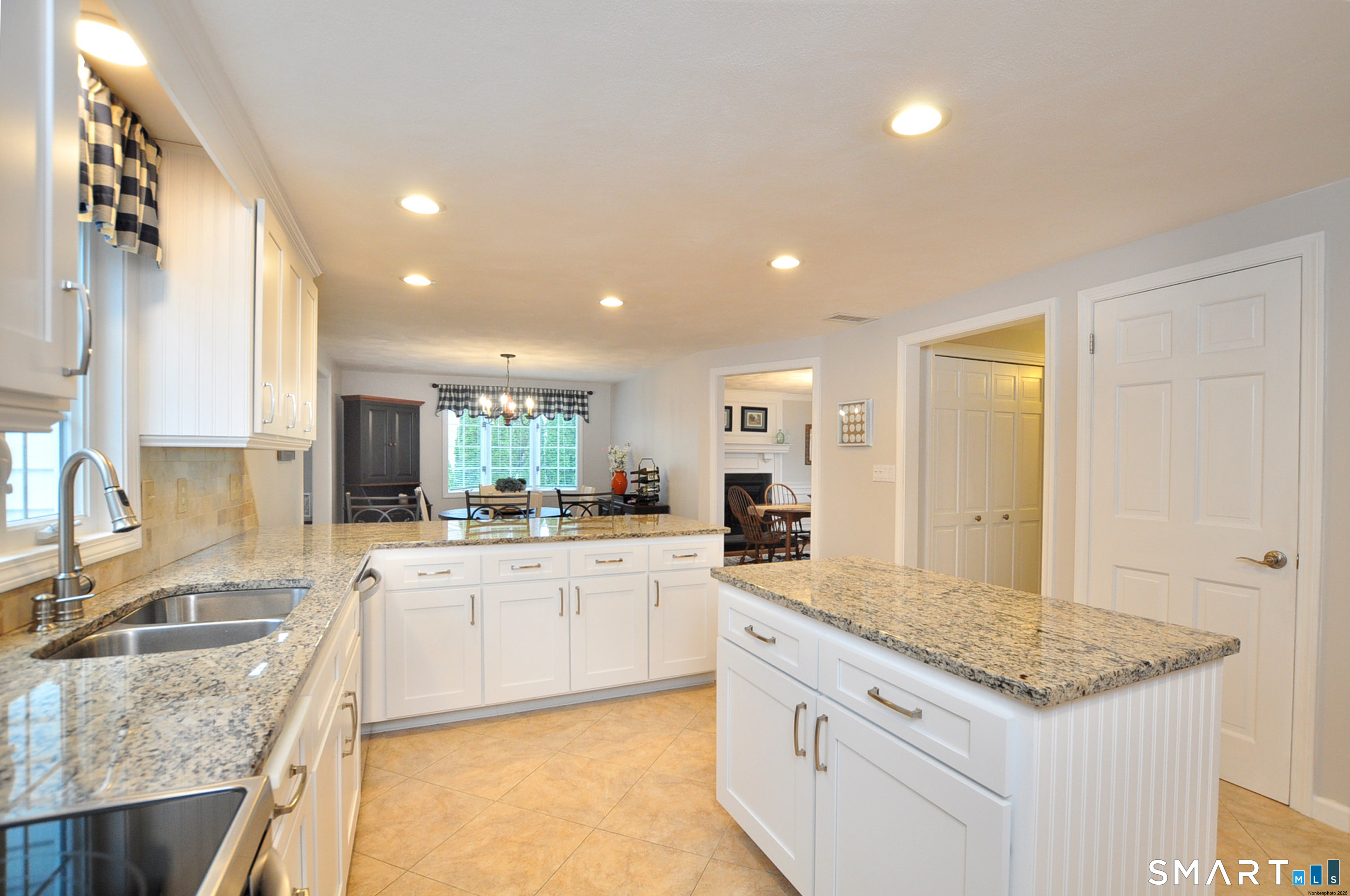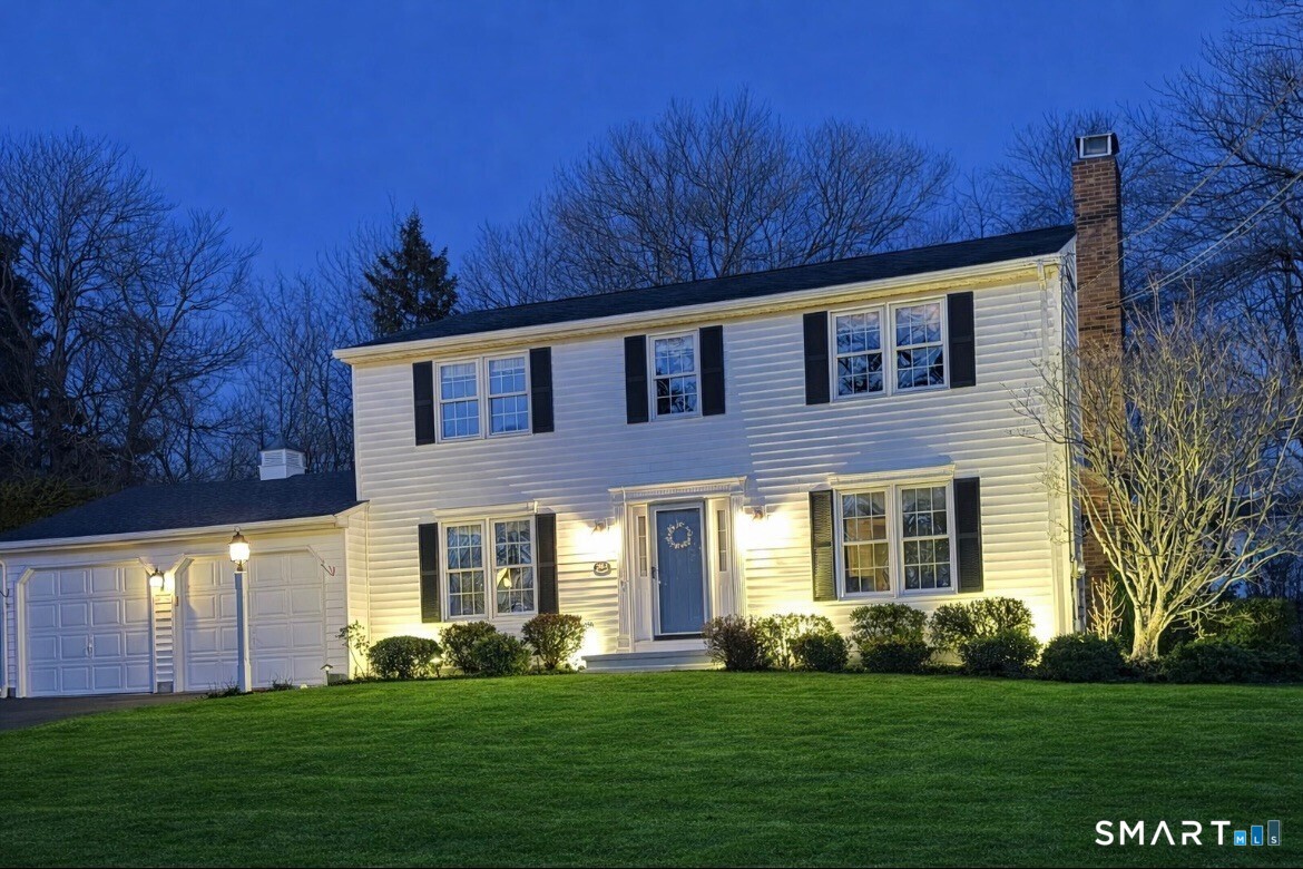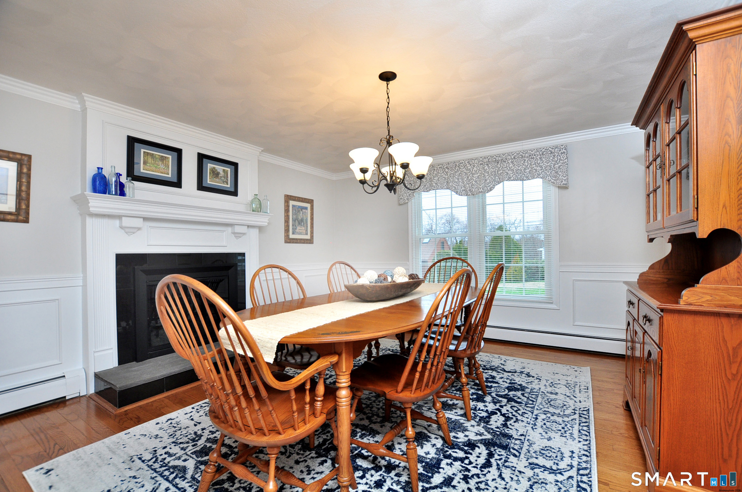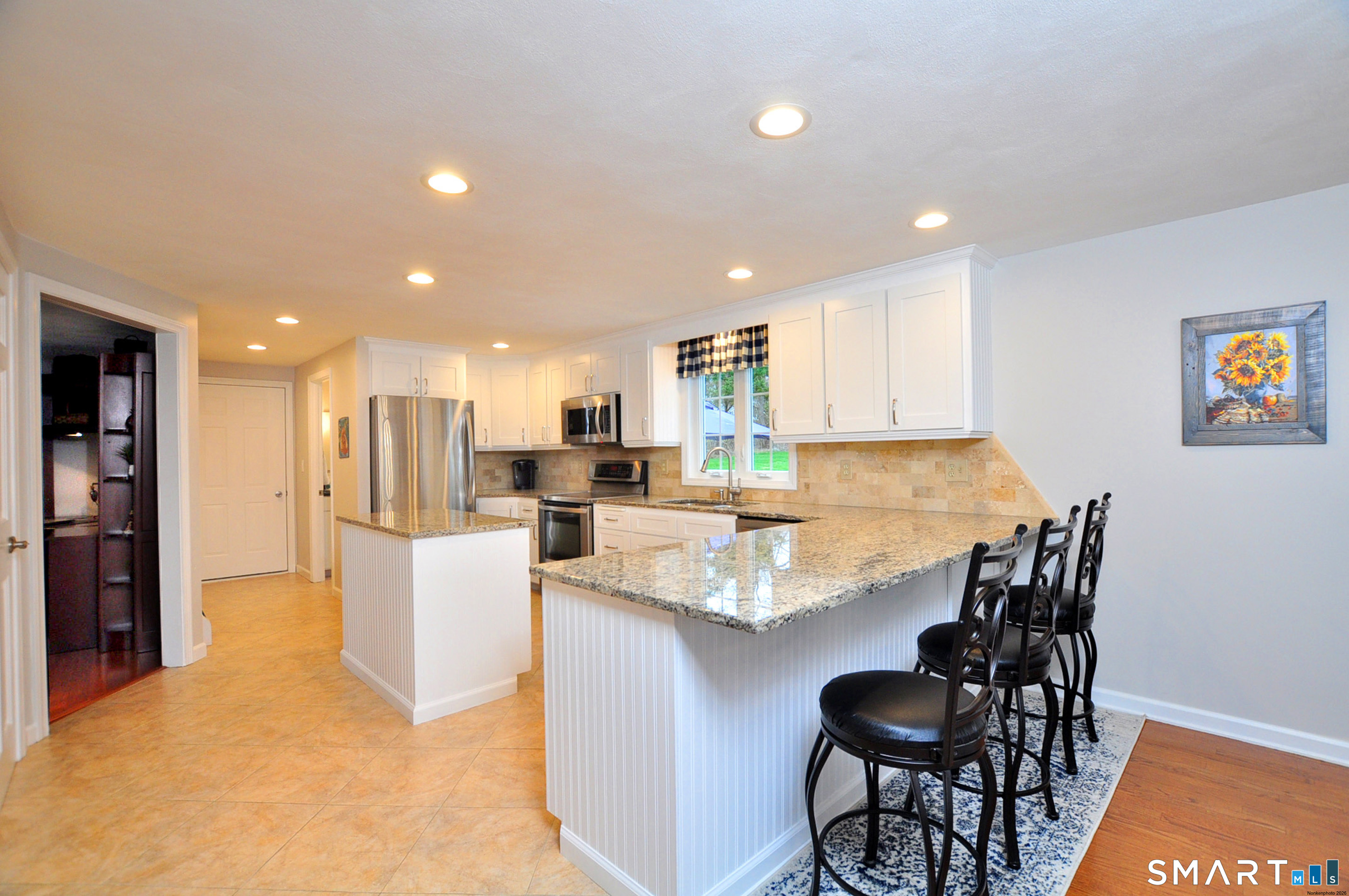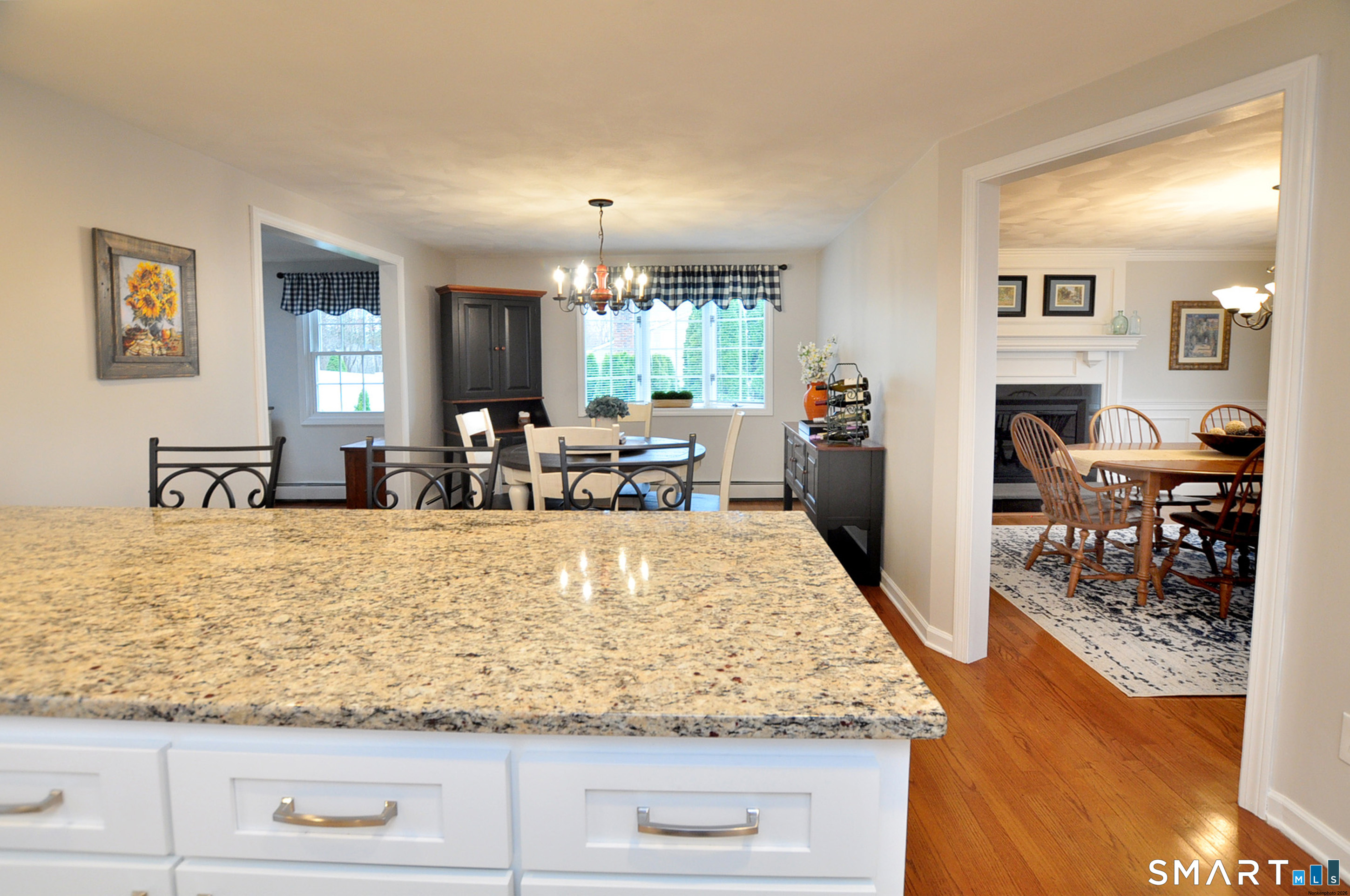 Pride of ownership shines throughout this sun-filled, one-owner Colonial, ideally set in Torrington's desirable east side on a loop street. From the moment you arrive, the meticulous grounds, classic stone walls, & inviting curb appeal set the tone for what's inside. This exceptionally well-maintained home feels bright, fresh, & truly move-in ready. Step into a welcoming tiled foyer that opens to a spacious dining room featuring a fireplace with custom mantel, picture molding, crown molding, & gleaming hardwood floors-perfect for everyday living or hosting. Just off the foyer, a private home office with built-ins &hardwood flooring offers the ideal work-from-home setup. The updated kitchen is a standout, complete with granite countertops, LG stainless steel appliances, tiled backsplash, & a sunny bay window dining area. It flows seamlessly into the impressive family room, where cathedral ceilings, exposed wood beam, skylights, & hardwood floors create a warm & inviting space to gather, highlighted by a fully functional gas log fireplace. An updated half bath with granite finishes completes the main level. Upstairs, you'll find 3 comfortable bedrooms, including a primary suite with walk-in closet. The second bedroom features custom built-in shelving, & the remodeled full bath showcases granite countertops & updated tile above & around the tub. The finished lower level adds valuable living space, ideal for a rec room, game room, or home gym, along with