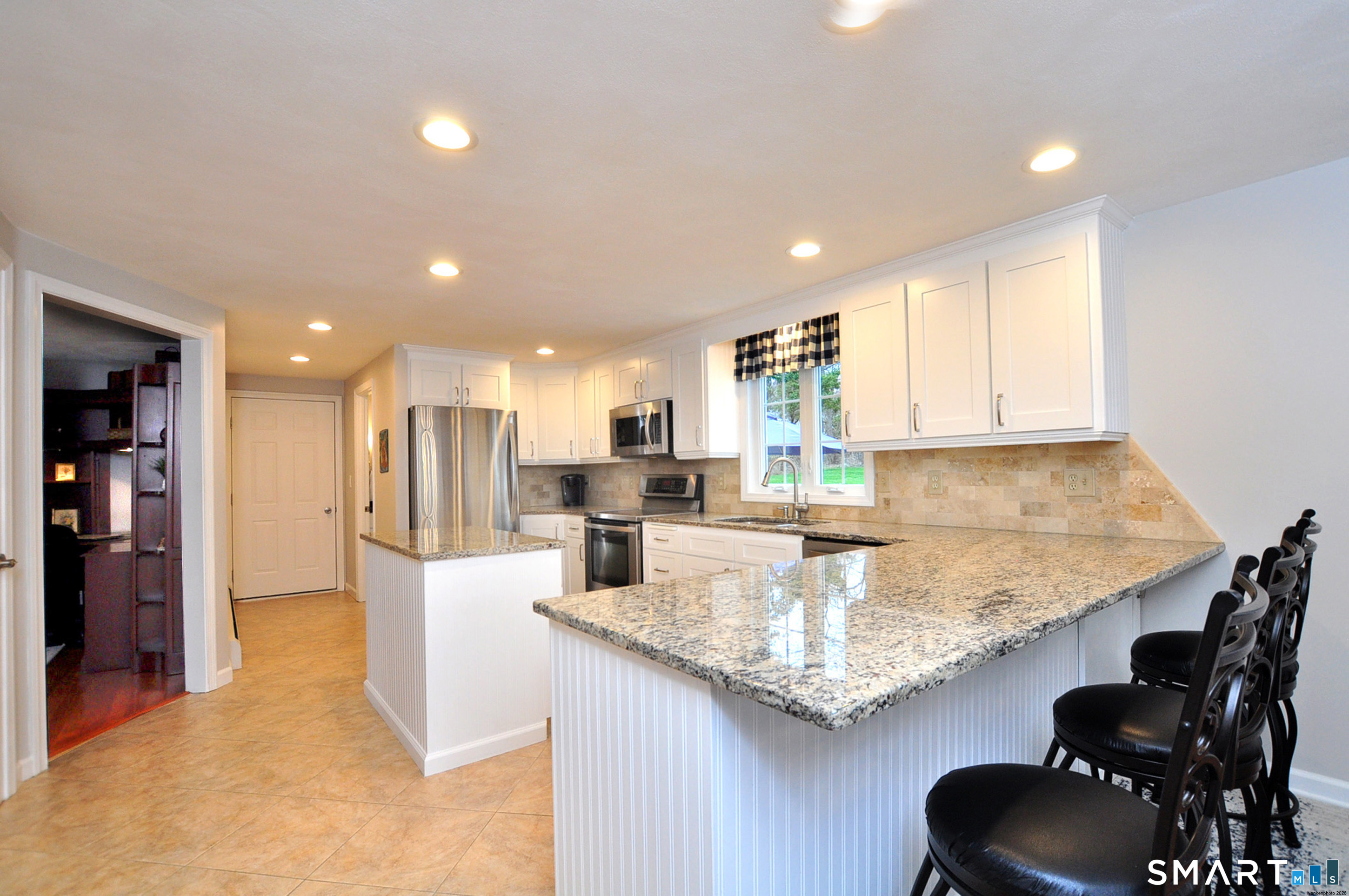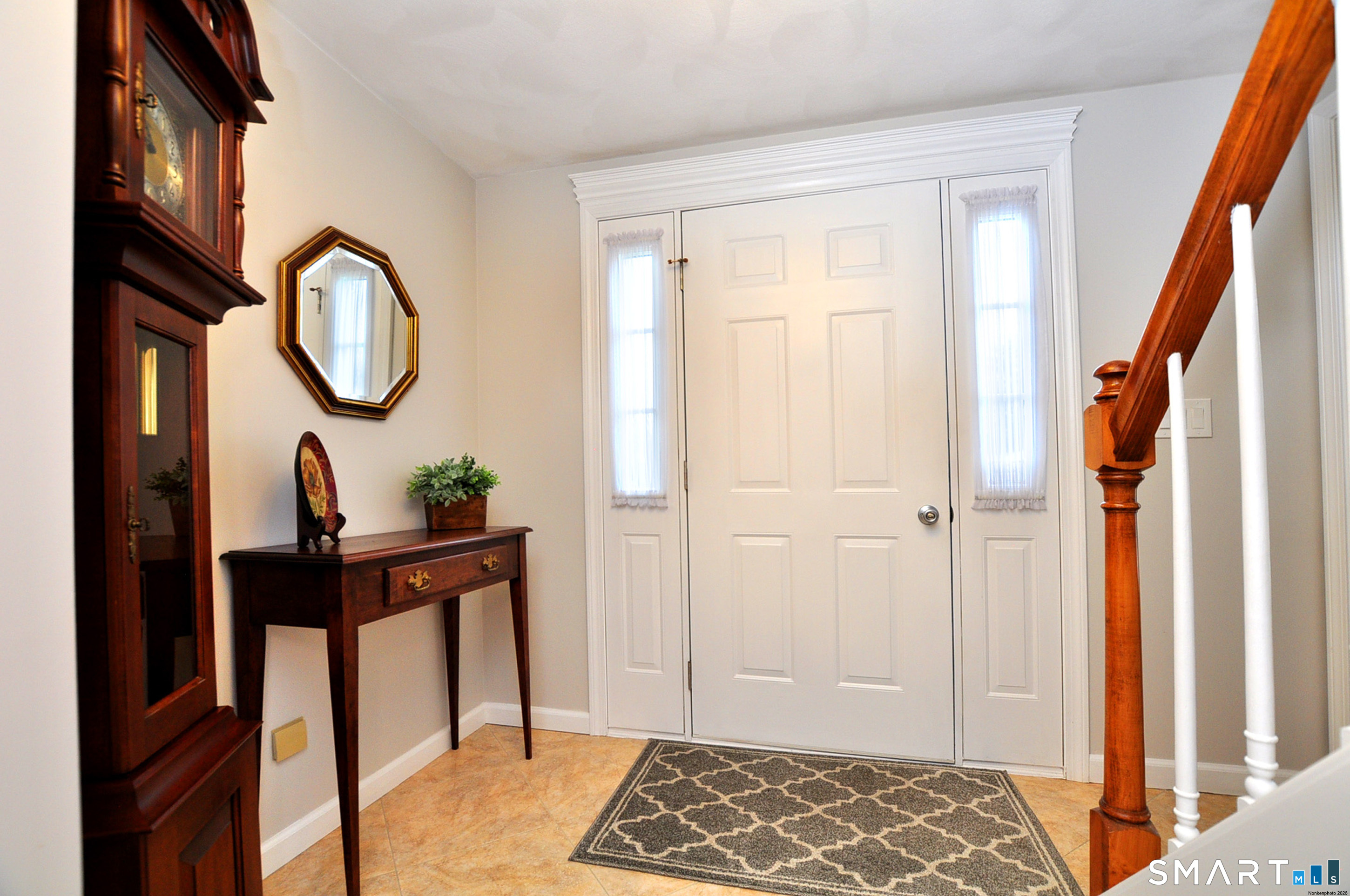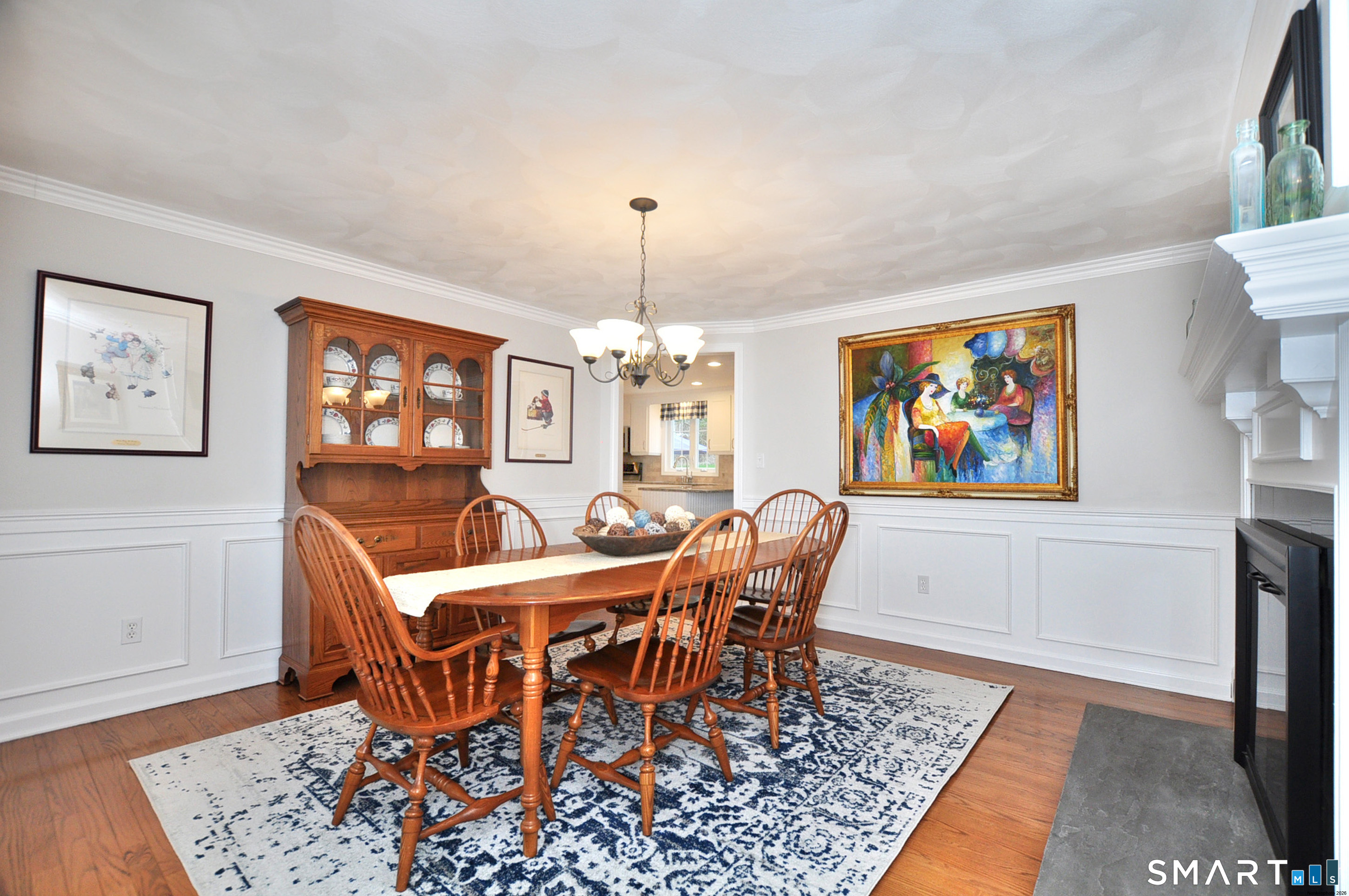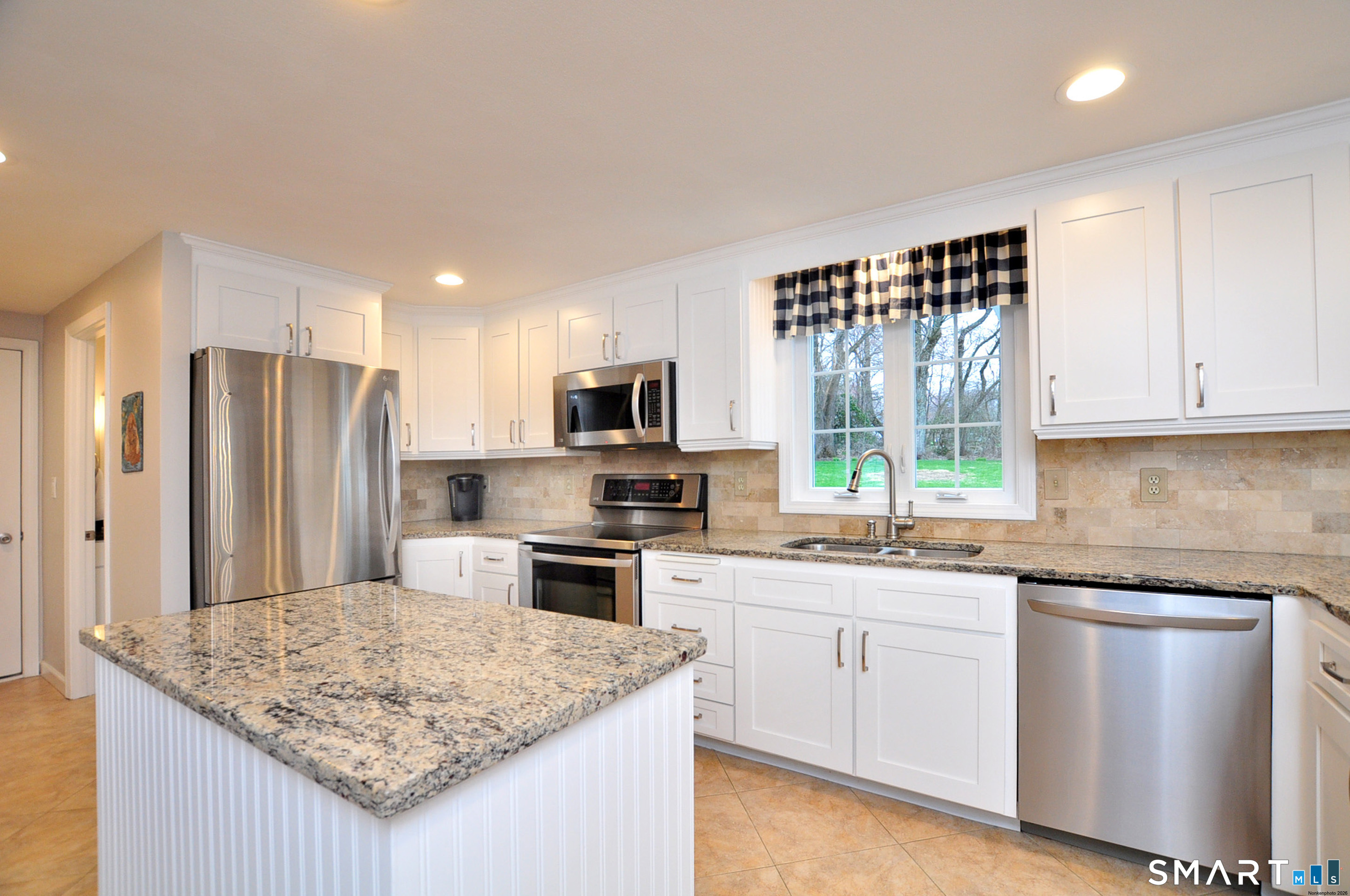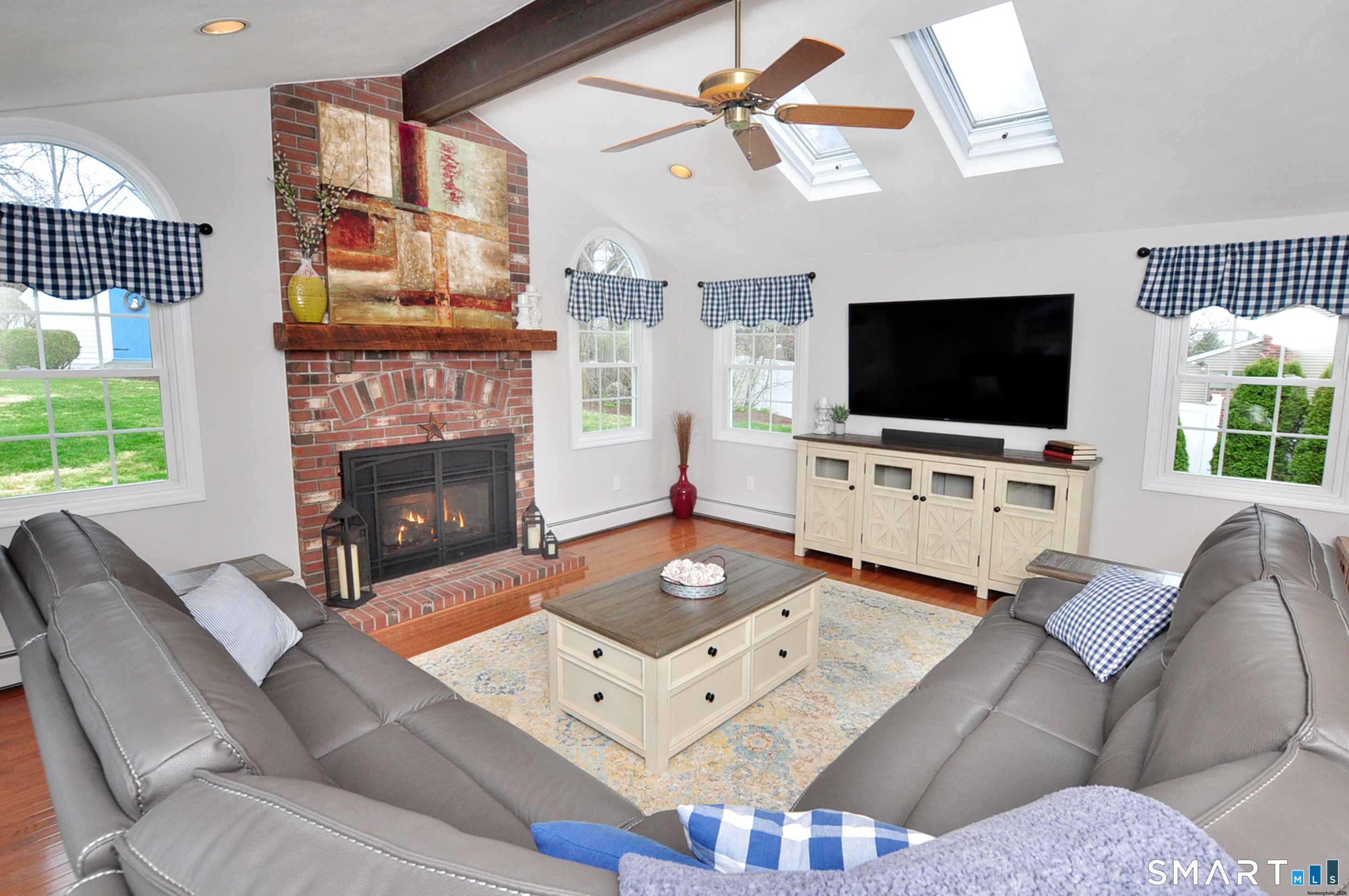 Pride of ownership shines throughout this sun-filled, one-owner Colonial, ideally set in Torrington's desirable east side on a loop street. From the moment you arrive, the meticulous grounds, classic stone walls, & inviting curb appeal set the tone for what's inside. This exceptionally well-maintained home feels bright, fresh, & truly move-in ready. Step into a welcoming tiled foyer that opens to a spacious dining room featuring a fireplace with custom mantel, picture molding, crown molding, & gleaming hardwood floors-perfect for everyday living or hosting. Just off the foyer, a private home office with built-ins &hardwood flooring offers the ideal work-from-home setup. The updated kitchen is a standout, complete with granite countertops, LG stainless steel appliances, tiled backsplash, & a sunny bay window dining area. It flows seamlessly into the impressive family room, where cathedral ceilings, exposed wood beam, skylights, & hardwood floors create a warm & inviting space to gather, highlighted by a fully functional gas log fireplace. An updated half bath with granite finishes completes the main level. Upstairs, you'll find 3 comfortable bedrooms, including a primary suite with walk-in closet. The second bedroom features custom built-in shelving, & the remodeled full bath showcases granite countertops & updated tile above & around the tub. The finished lower level adds valuable living space, ideal for a rec room, game room, or home gym, along with