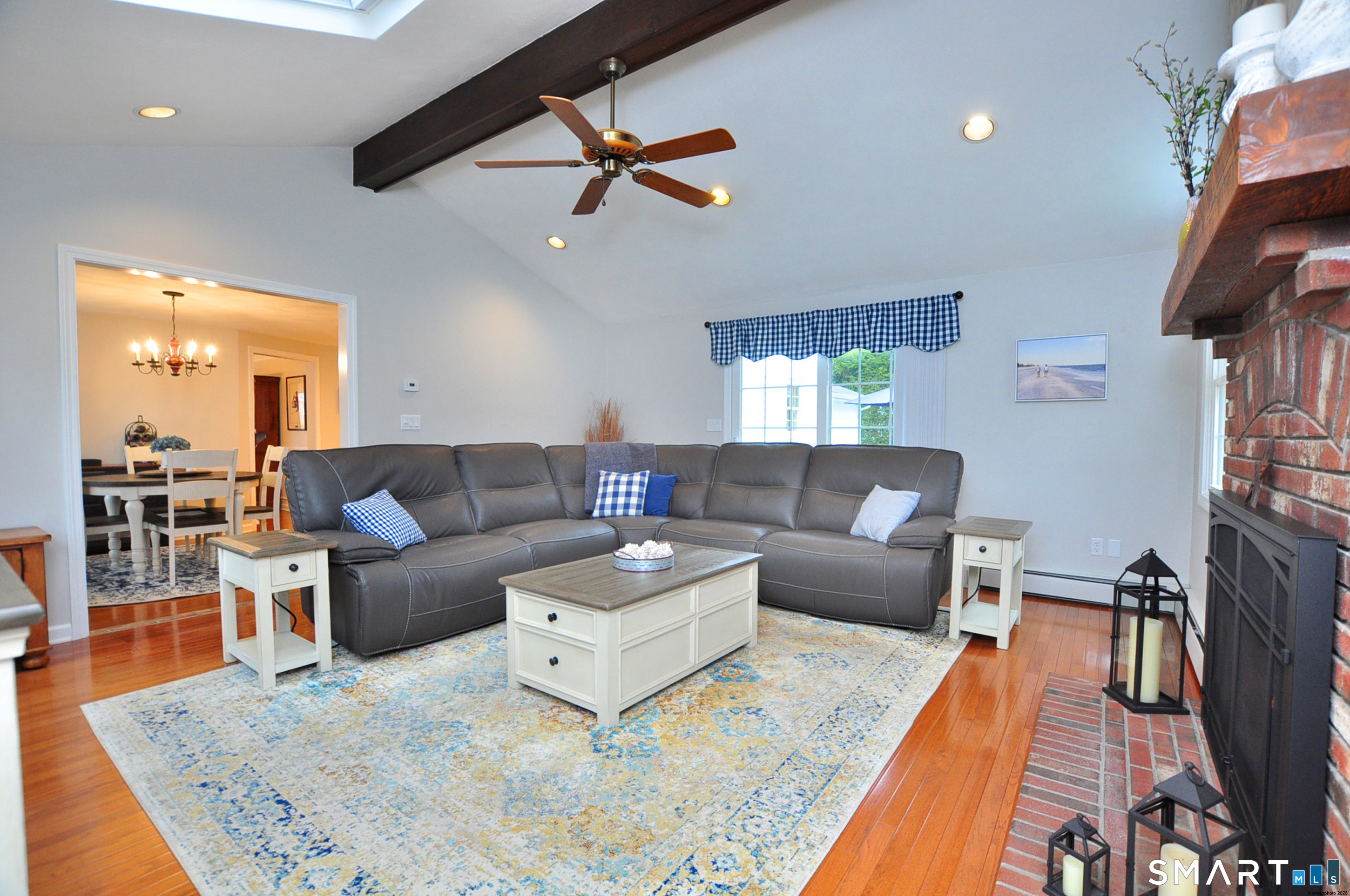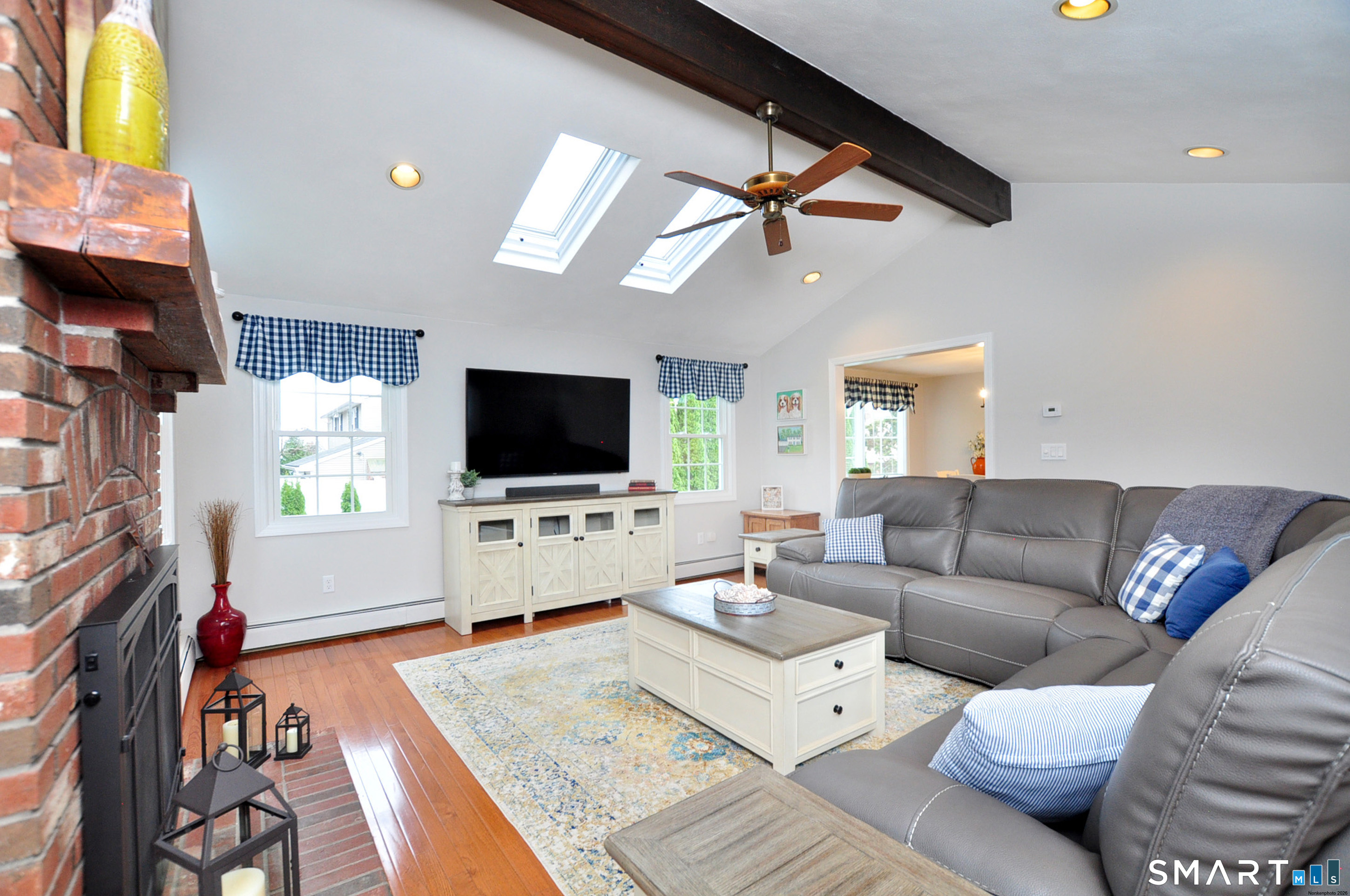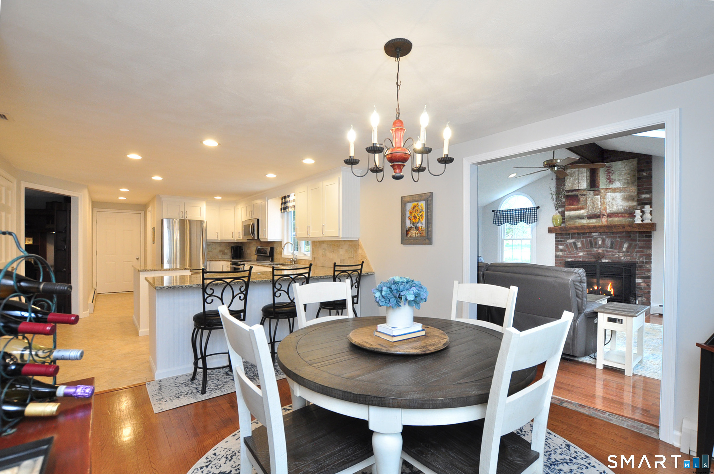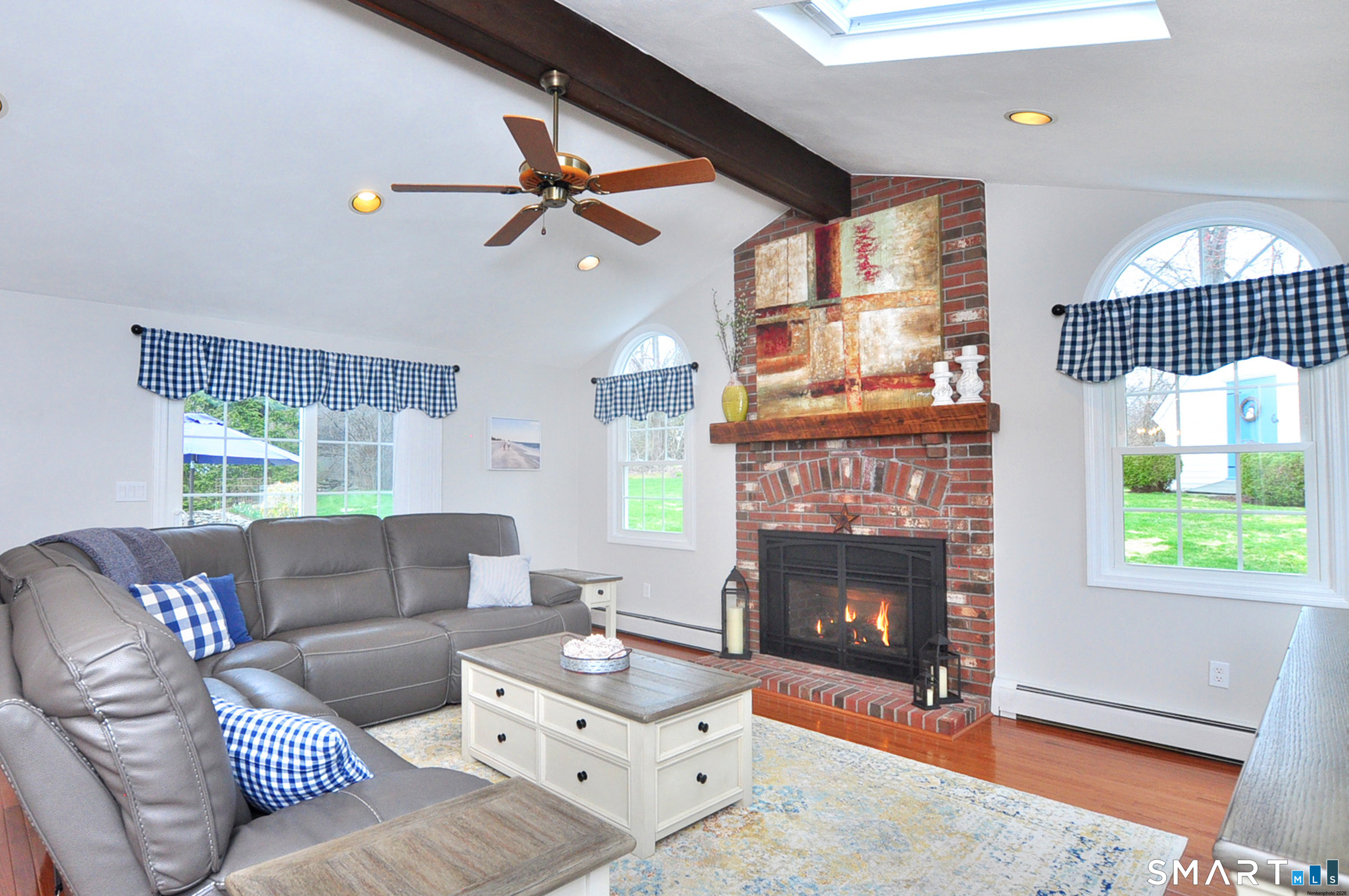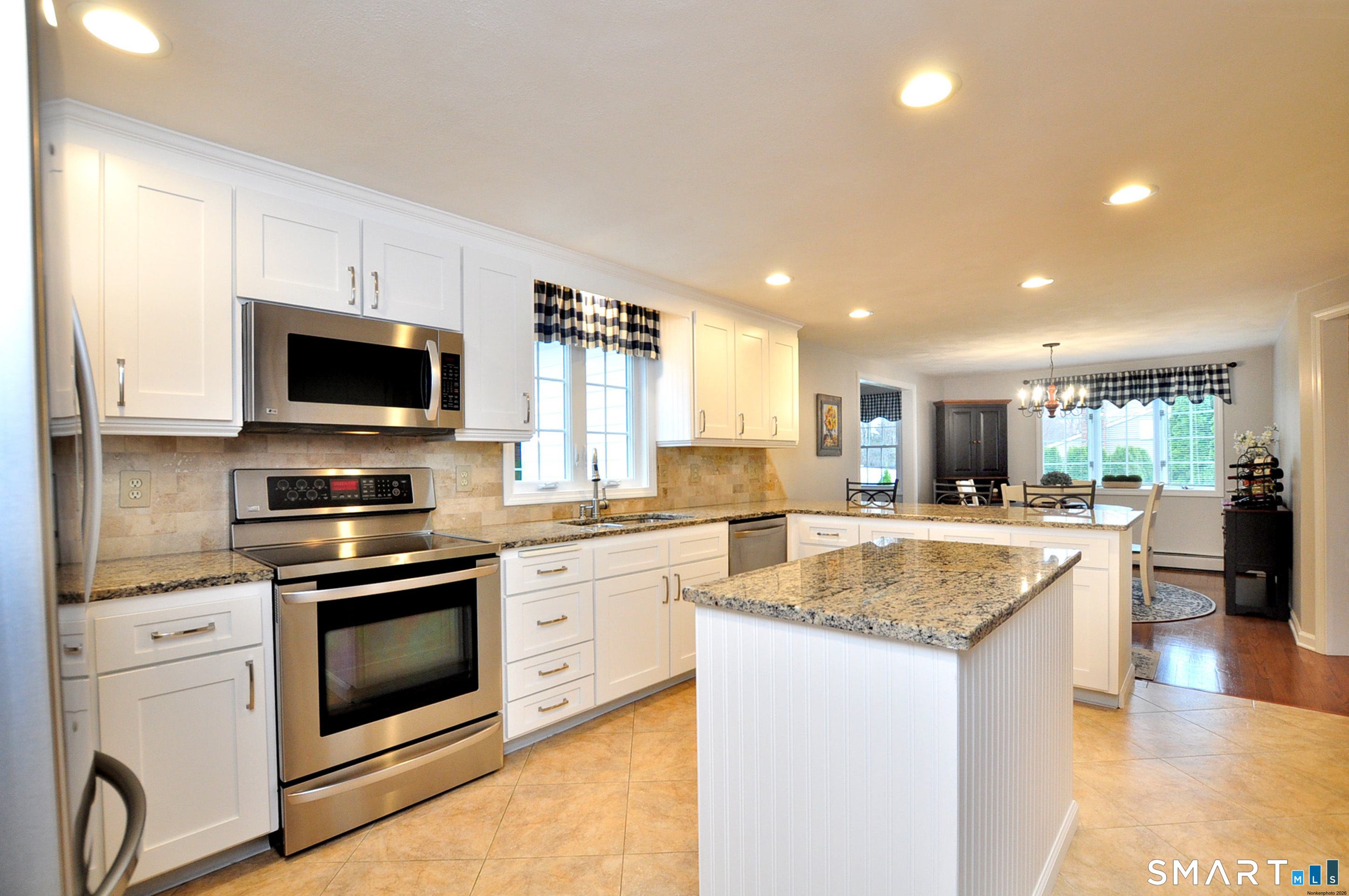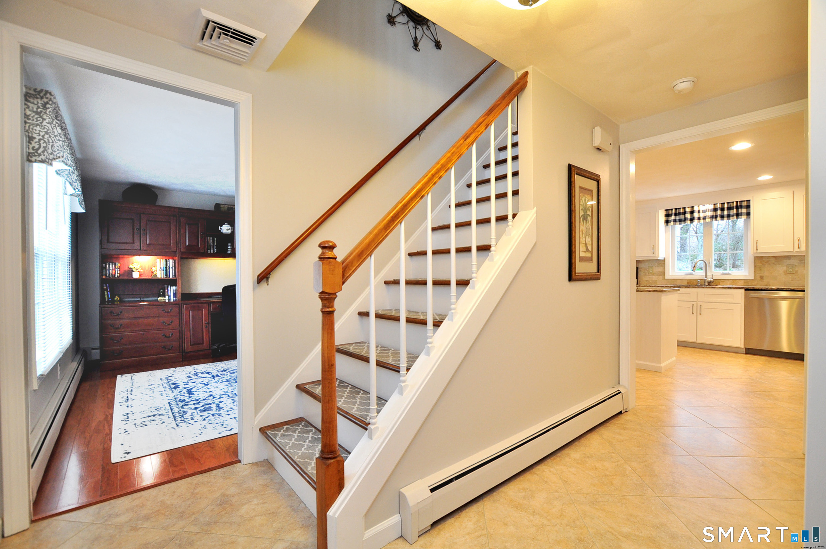 Pride of ownership shines throughout this sun-filled, one-owner Colonial, ideally set in Torrington's desirable east side on a loop street. From the moment you arrive, the meticulous grounds, classic stone walls, & inviting curb appeal set the tone for what's inside. This exceptionally well-maintained home feels bright, fresh, & truly move-in ready. Step into a welcoming tiled foyer that opens to a spacious dining room featuring a fireplace with custom mantel, picture molding, crown molding, & gleaming hardwood floors-perfect for everyday living or hosting. Just off the foyer, a private home office with built-ins &hardwood flooring offers the ideal work-from-home setup. The updated kitchen is a standout, complete with granite countertops, LG stainless steel appliances, tiled backsplash, & a sunny bay window dining area. It flows seamlessly into the impressive family room, where cathedral ceilings, exposed wood beam, skylights, & hardwood floors create a warm & inviting space to gather, highlighted by a fully functional gas log fireplace. An updated half bath with granite finishes completes the main level. Upstairs, you'll find 3 comfortable bedrooms, including a primary suite with walk-in closet. The second bedroom features custom built-in shelving, & the remodeled full bath showcases granite countertops & updated tile above & around the tub. The finished lower level adds valuable living space, ideal for a rec room, game room, or home gym, along with