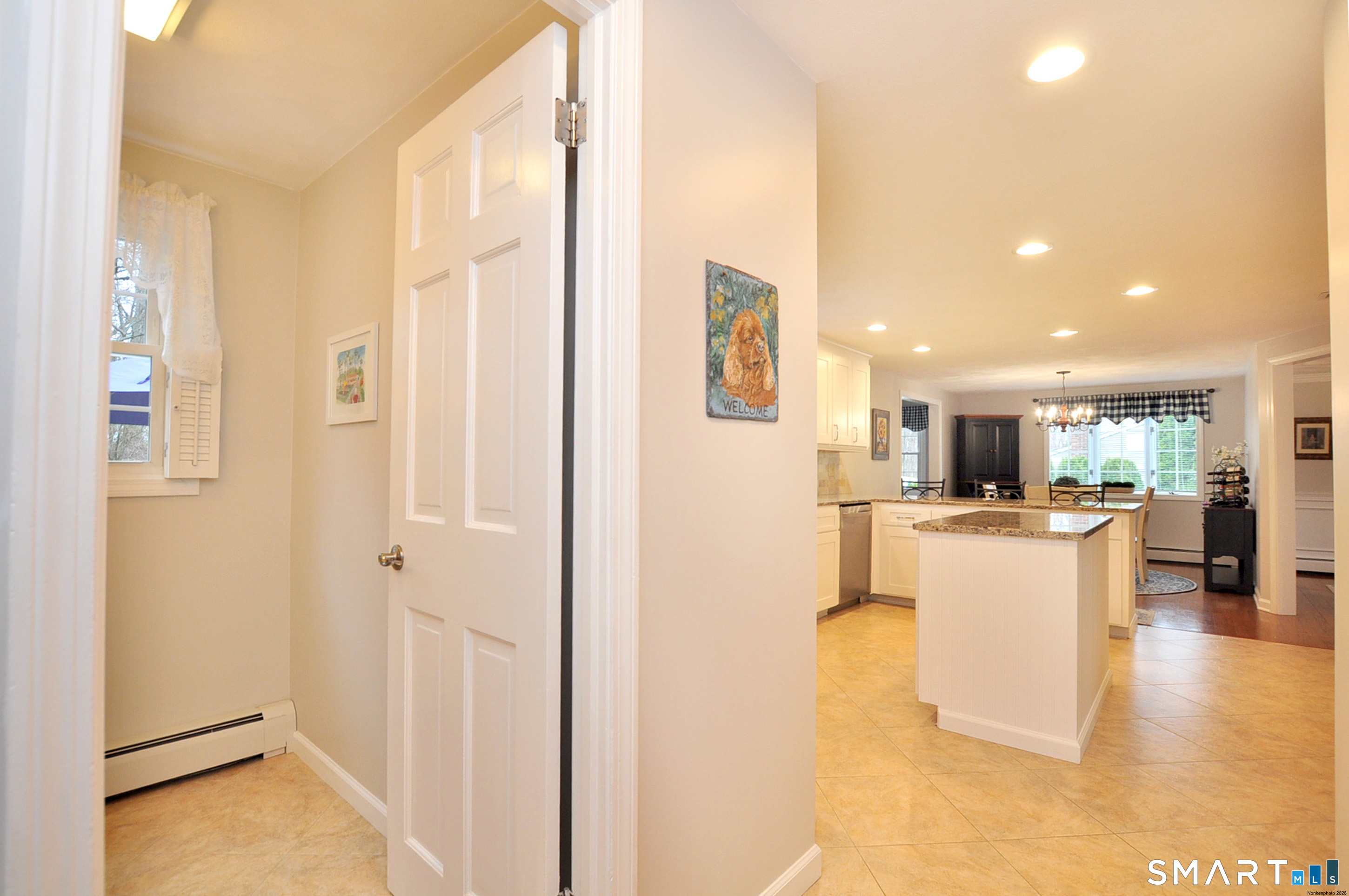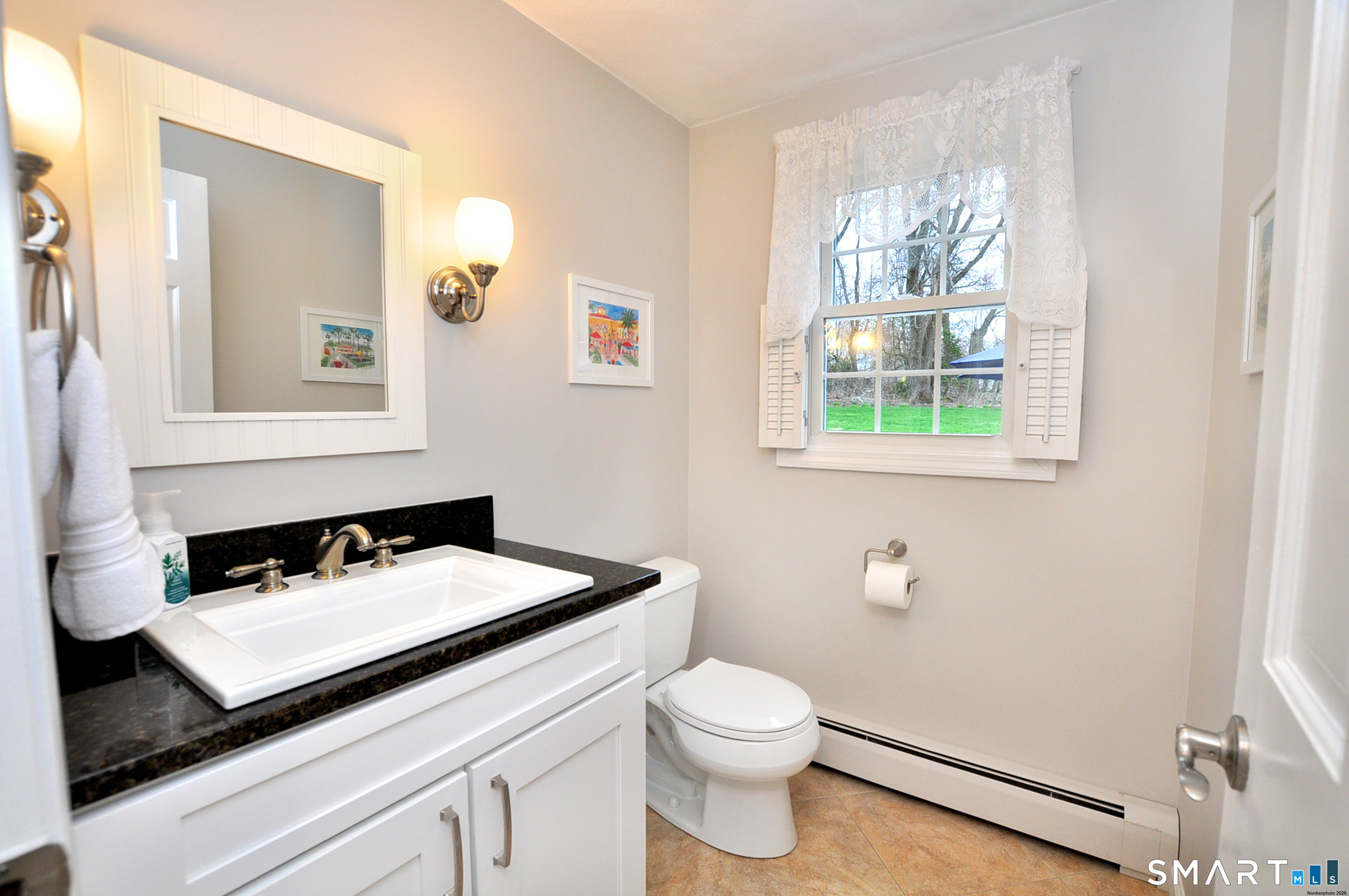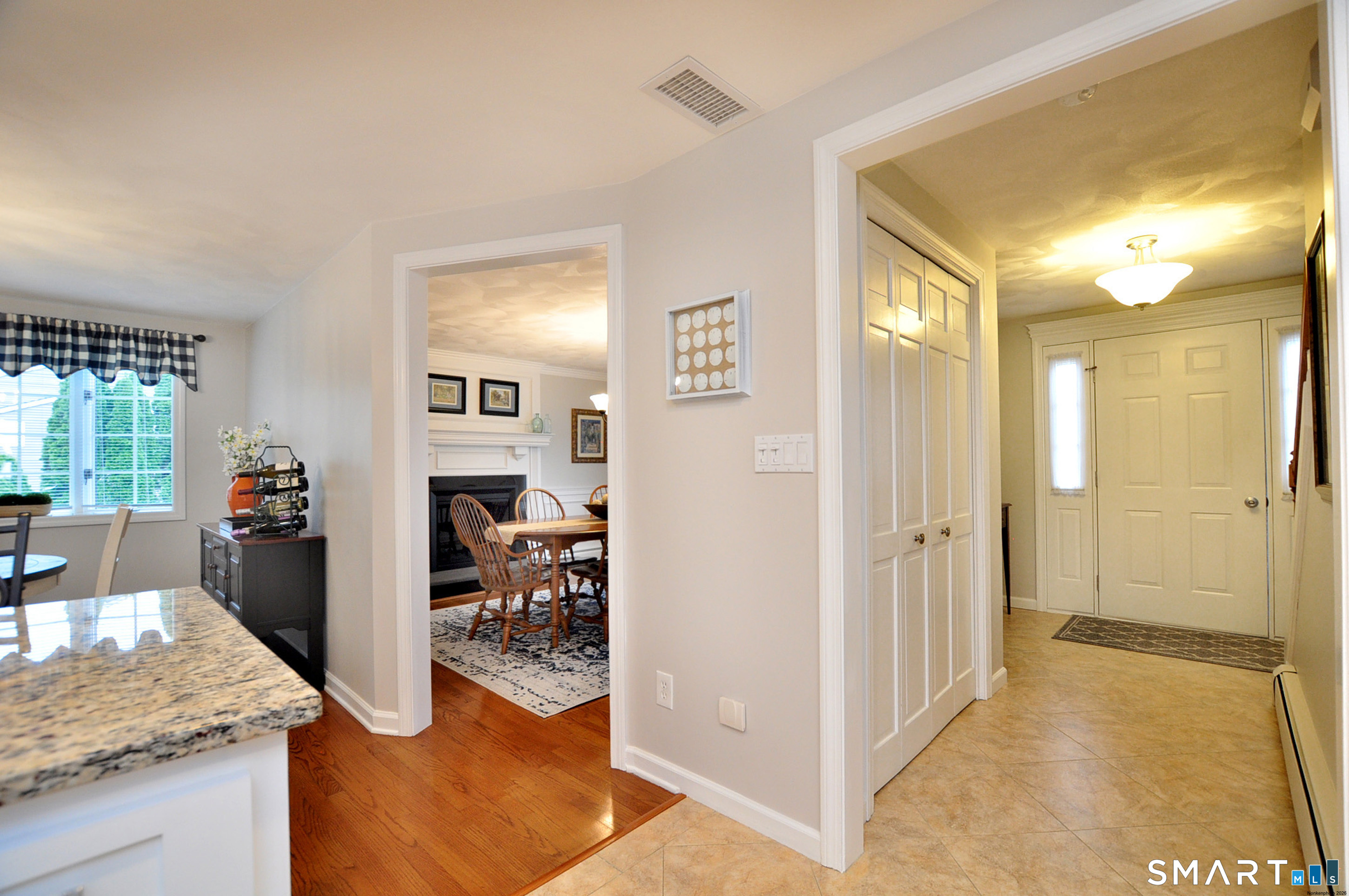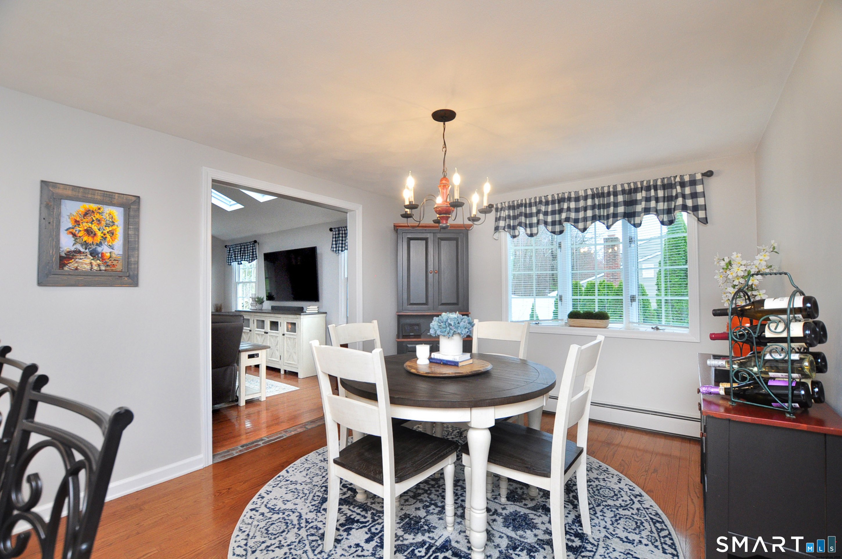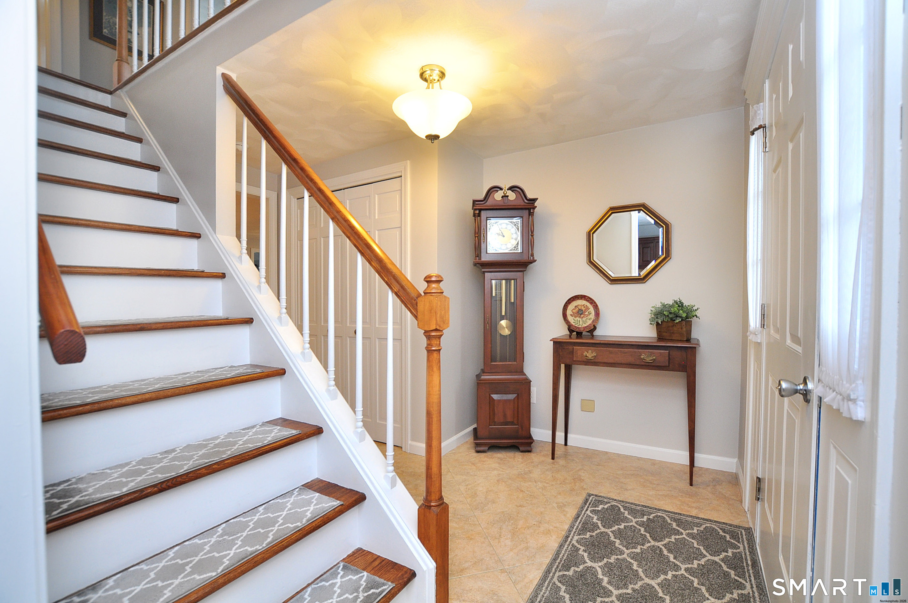 Pride of ownership shines throughout this sun-filled, one-owner Colonial, ideally set in Torrington's desirable east side on a loop street. From the moment you arrive, the meticulous grounds, classic stone walls, & inviting curb appeal set the tone for what's inside. This exceptionally well-maintained home feels bright, fresh, & truly move-in ready. Step into a welcoming tiled foyer that opens to a spacious dining room featuring a fireplace with custom mantel, picture molding, crown molding, & gleaming hardwood floors-perfect for everyday living or hosting. Just off the foyer, a private home office with built-ins &hardwood flooring offers the ideal work-from-home setup. The updated kitchen is a standout, complete with granite countertops, LG stainless steel appliances, tiled backsplash, & a sunny bay window dining area. It flows seamlessly into the impressive family room, where cathedral ceilings, exposed wood beam, skylights, & hardwood floors create a warm & inviting space to gather, highlighted by a fully functional gas log fireplace. An updated half bath with granite finishes completes the main level. Upstairs, you'll find 3 comfortable bedrooms, including a primary suite with walk-in closet. The second bedroom features custom built-in shelving, & the remodeled full bath showcases granite countertops & updated tile above & around the tub. The finished lower level adds valuable living space, ideal for a rec room, game room, or home gym, along with