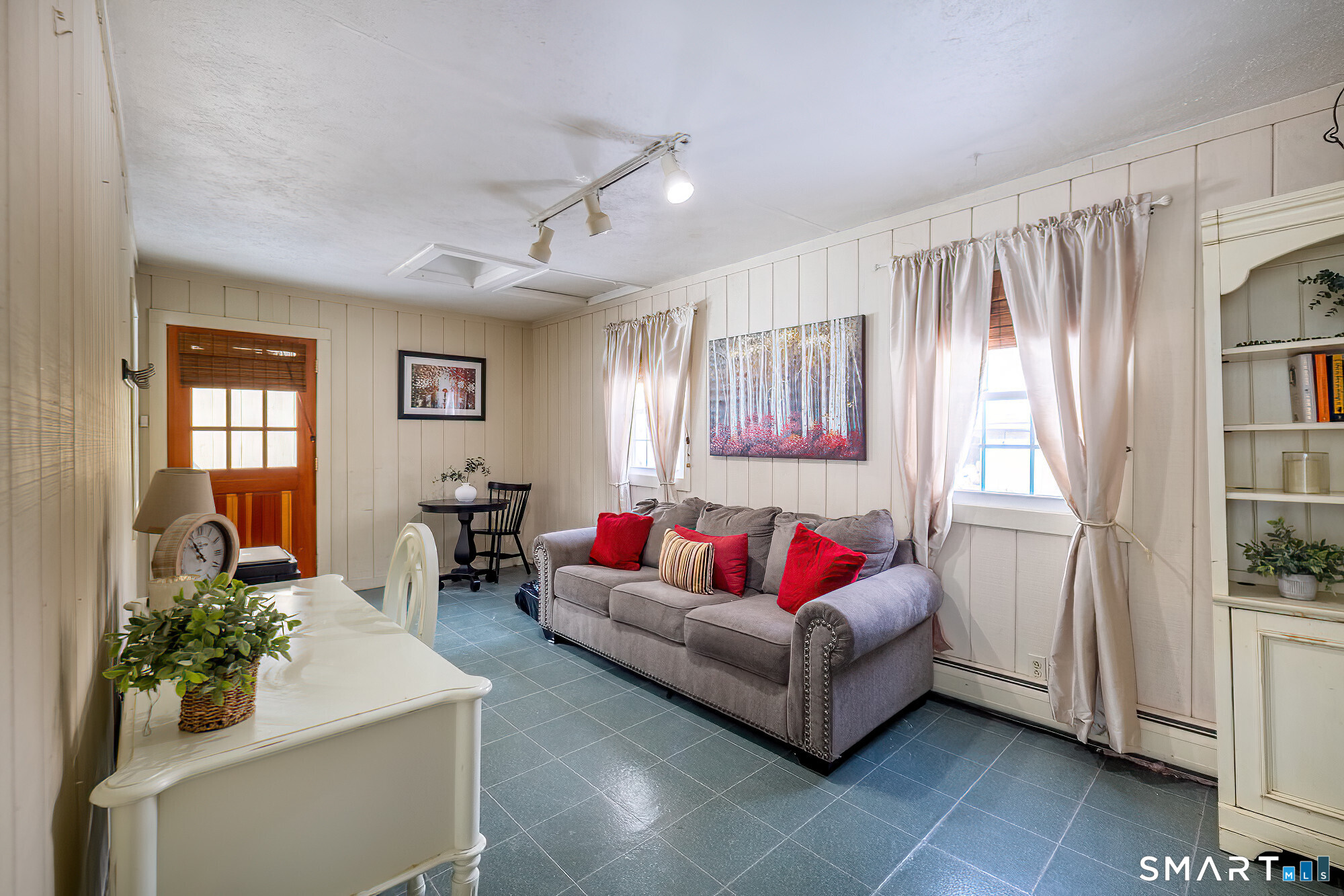 Set on a level, usable one-acre lot, this classic center hall Colonial offers timeless appeal, comfortable living spaces, and an unbeatable location just minutes from the North Salem, NY border ideal for commuters. A circular driveway welcomes you home, while inside, warmth and character shine throughout. The kitchen flows seamlessly into the dining room and features exposed beams that add charm and architectural interest. The sun-filled living room stretches from front to back, anchored by a cozy wood-burning fireplace. A comfortable den with a wood stove and sliding doors opens to a stone patio and flat backyard, creating an easy indoor-outdoor lifestyle. There is also direct patio access from the kitchen ideal for entertaining, grilling, or simply enjoying the peaceful setting. The main level includes a private home office and a convenient half bath. Upstairs, you'll find four bedrooms and a full bath. A partially finished lower level provides flexible space for a playroom, gym, media room, or casual hangout area. Located close to Ridgefield's middle and high schools and just minutes to the vibrant town center, this home combines everyday convenience with a serene setting. As an added bonus, enjoy lake rights to Mamanasco Lake - swim, canoe, kayak, fish, and in winter (weather permitting), ice skate. With manageable square footage and a versatile layout, this home appeals to buyers seeking comfort, character, and lifestyle in one of Ridgefield's most desirable areas.