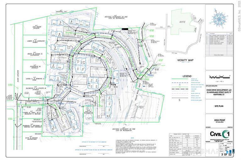 Zoning: The property is situated in an RM Zone [Residential Moderate Density] District. Among other uses, the Zone permits multifamily residential development at a density of 24.0 Units / Acre. Building in the RM district cannot exceed 12 Units per building and each unit requires 1.5 parking spaces. Prior site approval allows for 106 Apartments in 13 Building. 8-30g is not applicable to development in Waterbury. Utilities: Public Water, Public Sewer and Public Storm water are Available on Vivian Drive, Thornhill Circle & Village Wood Drive. The area has access to High-Speed Internet Service. Ct Transit has bus service on Scott Road. The site is readily accessible to I-84Ct Rte. 8; Ct Rte. 69. Waterbury Metro North Train Service is a 10 Minute Drive Market: Waterbury Vacancy Rate is 3.6% . CoStar reports a market vacancy rate of 3.6 % with no new deliveries in the last 12 Month. There has been limited Multifamily development activity in Waterbury over the last 5 Years. Housing Demographics: Population as of 2023 DECD profile was 114,356. The Waterbury Plan of Conservation and Development states that population grew to 115,908 at the end of 2024. There are 50,577 Housing Units in Waterbury a 1/3 of which were built prior to 1940.