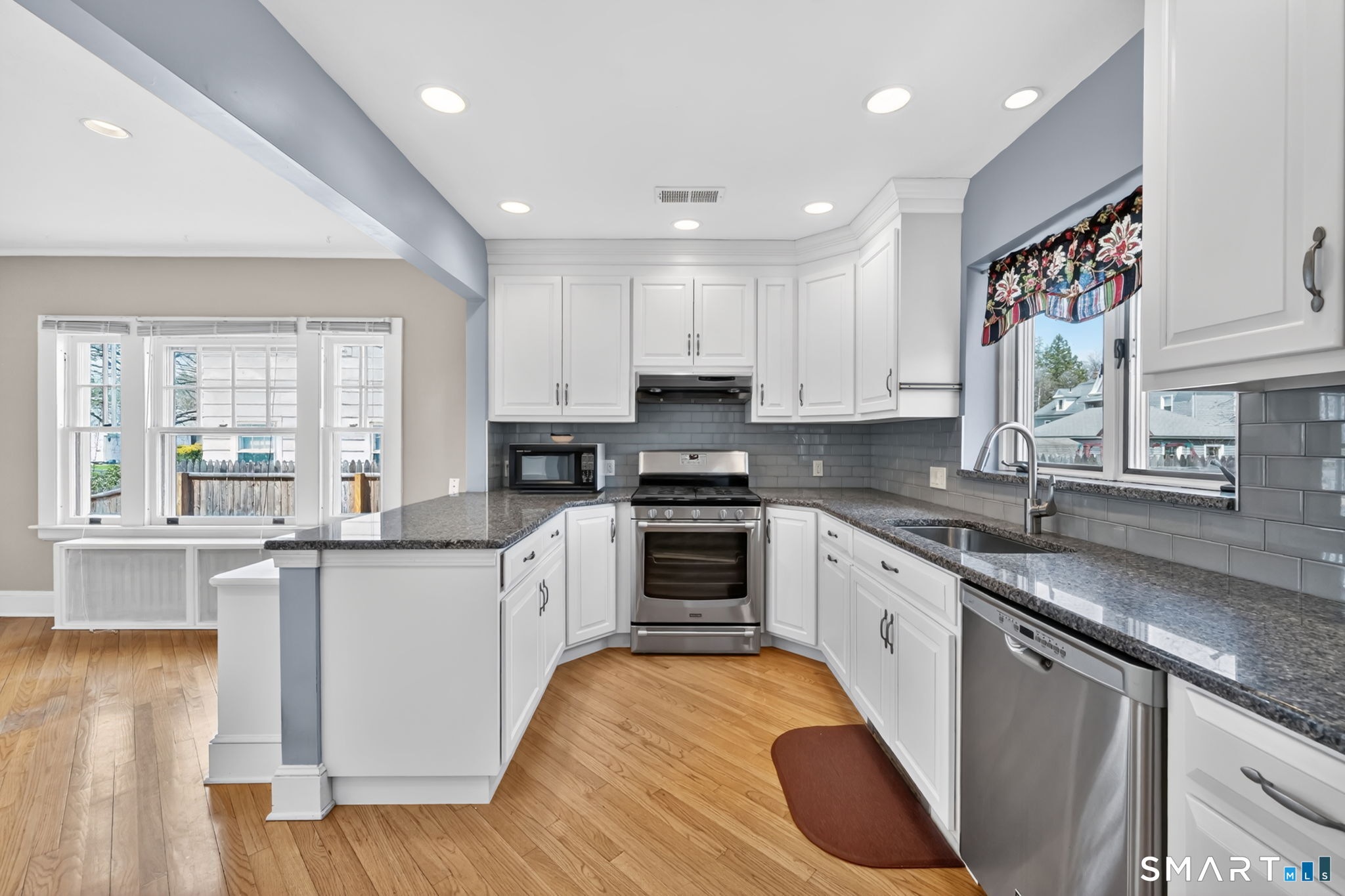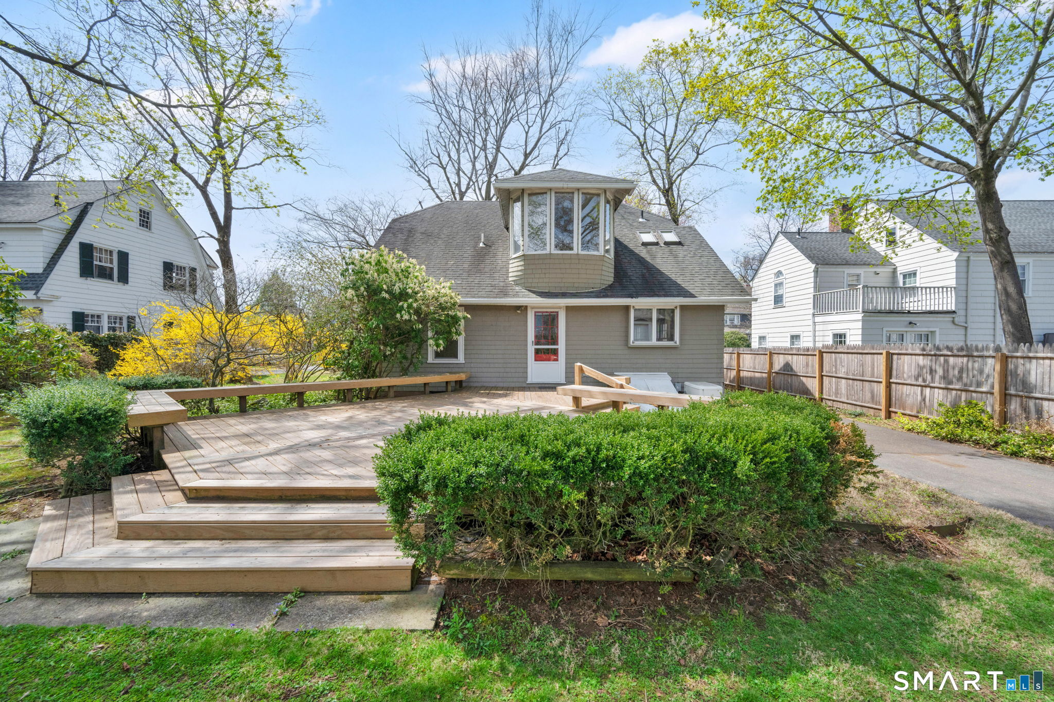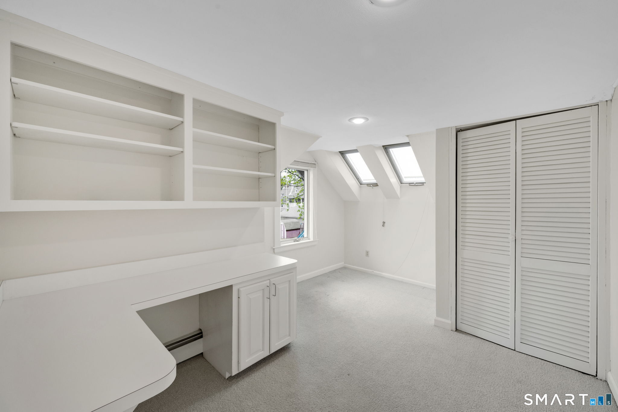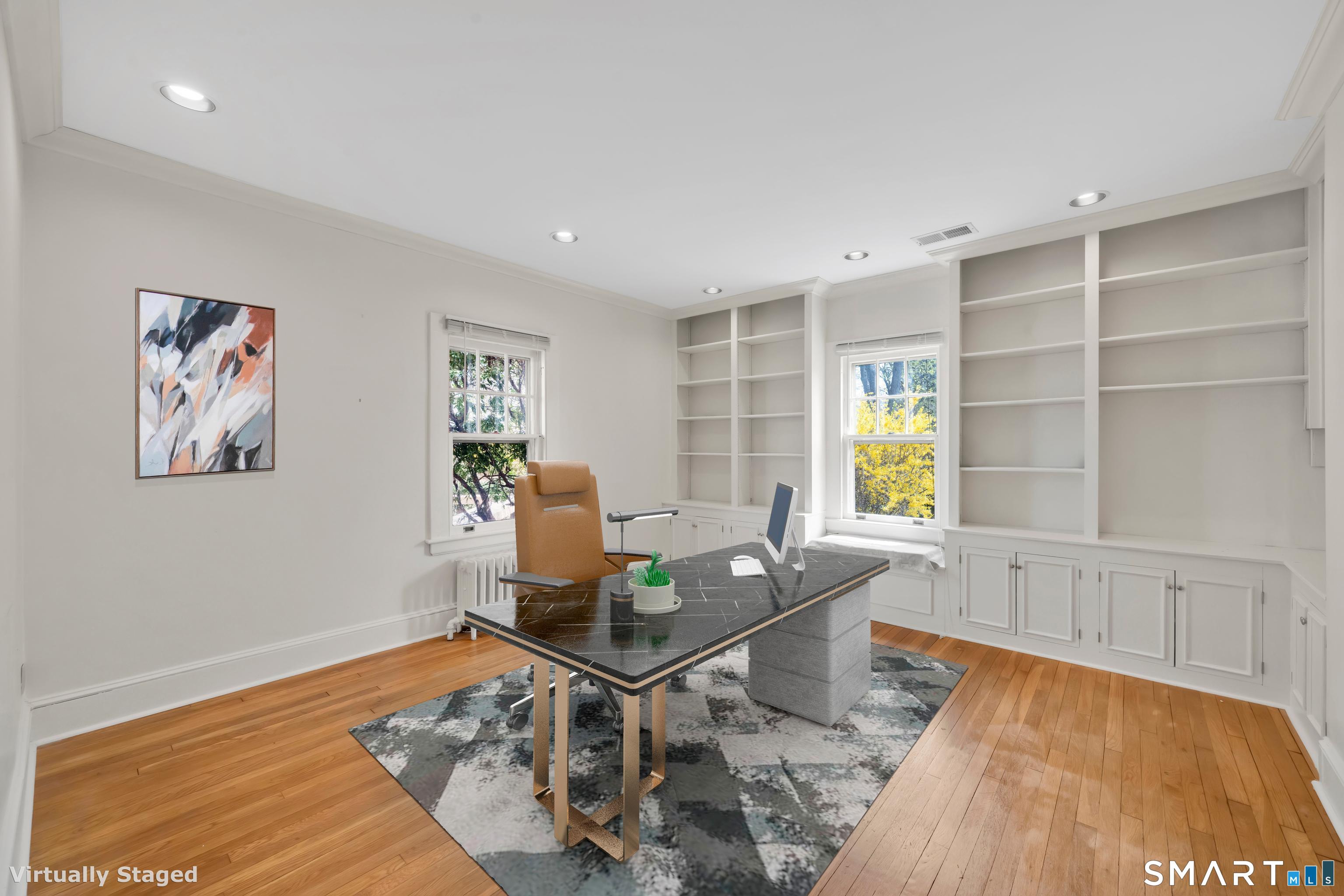 The one you've been waiting for! This unique home blends bungalow & Cape Cod architectural styles & is located on a coveted street in walking distance to West Hartford Center and Blue Back Square. The front entrance is through a bright enclosed sun porch with new windows and flooring. A vast living room greets you with hardwood floors, fireplace & built-in cabinetry & bookcases. French doors open to the dining room featuring recessed lighting and custom built-ins & flows into the remodeled kitchen. The kitchen has white soft-close cabinets, granite counters, hardwood floor, stainless appliances, recessed lighting & a pantry closet. The back door leads to a spacious new deck & the level and sunny backyard and detached garage. A first floor bedroom with bookcases & a walk-in closet adjacent to a full bathroom allows for one level living or a great den or TV room. Upstairs the master bedroom is highlighted by a vaulted ceiling, Palladian window, recessed lighting & a walk-in closet. Another bedroom has built-in bookcases & the fourth is customized as a home office with built-in desks & bookcases & brightened by skylights and recessed lighting. A loft area with window seat & vaulted ceiling makes a sunny reading nook or exercise area. The heated lower level has two bonus rooms to use as you desire - extra bedrooms, hobby space, or work area. There's plenty of storage & workshop space in the unfinished basement area. Stay comfortable year round with economical gas