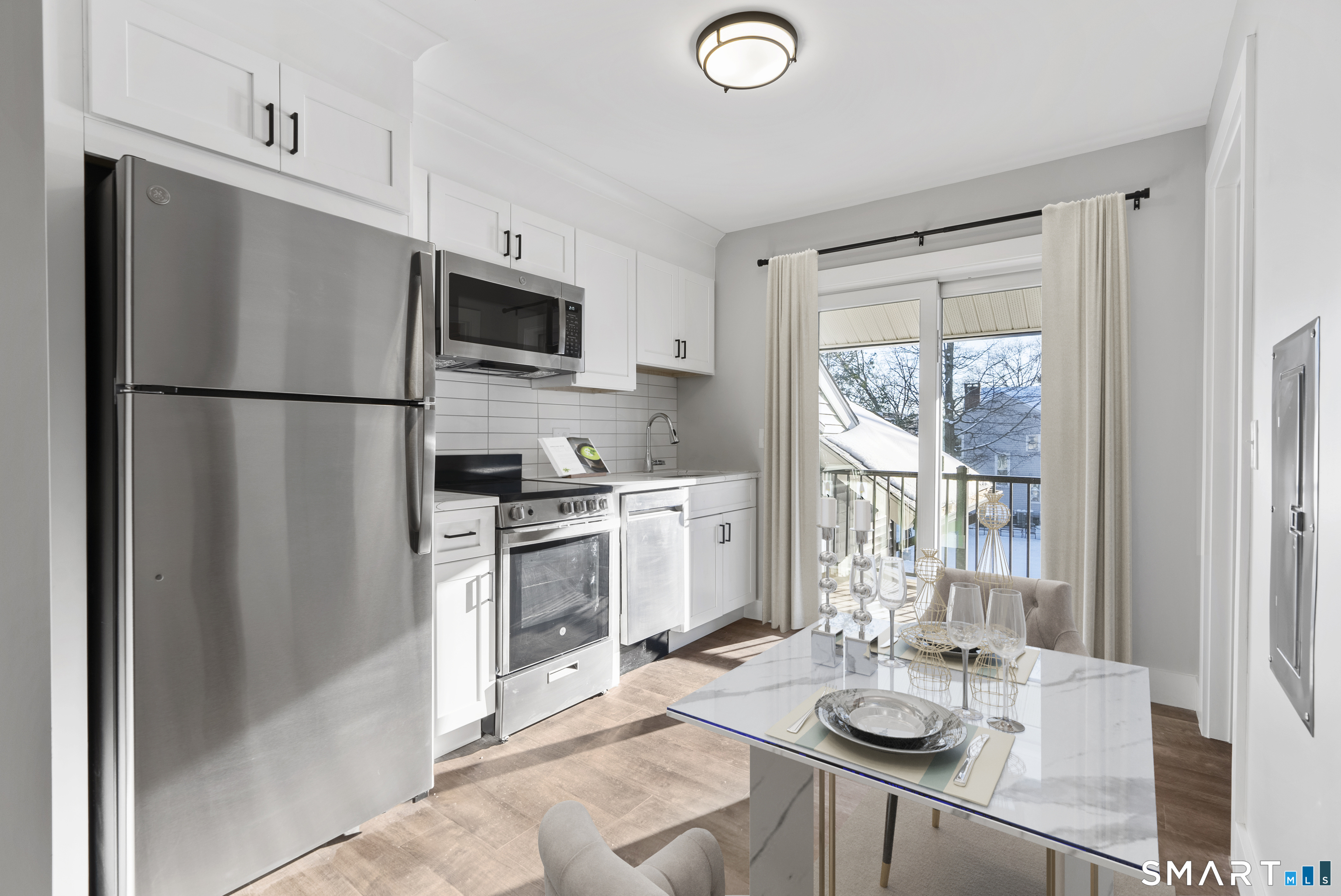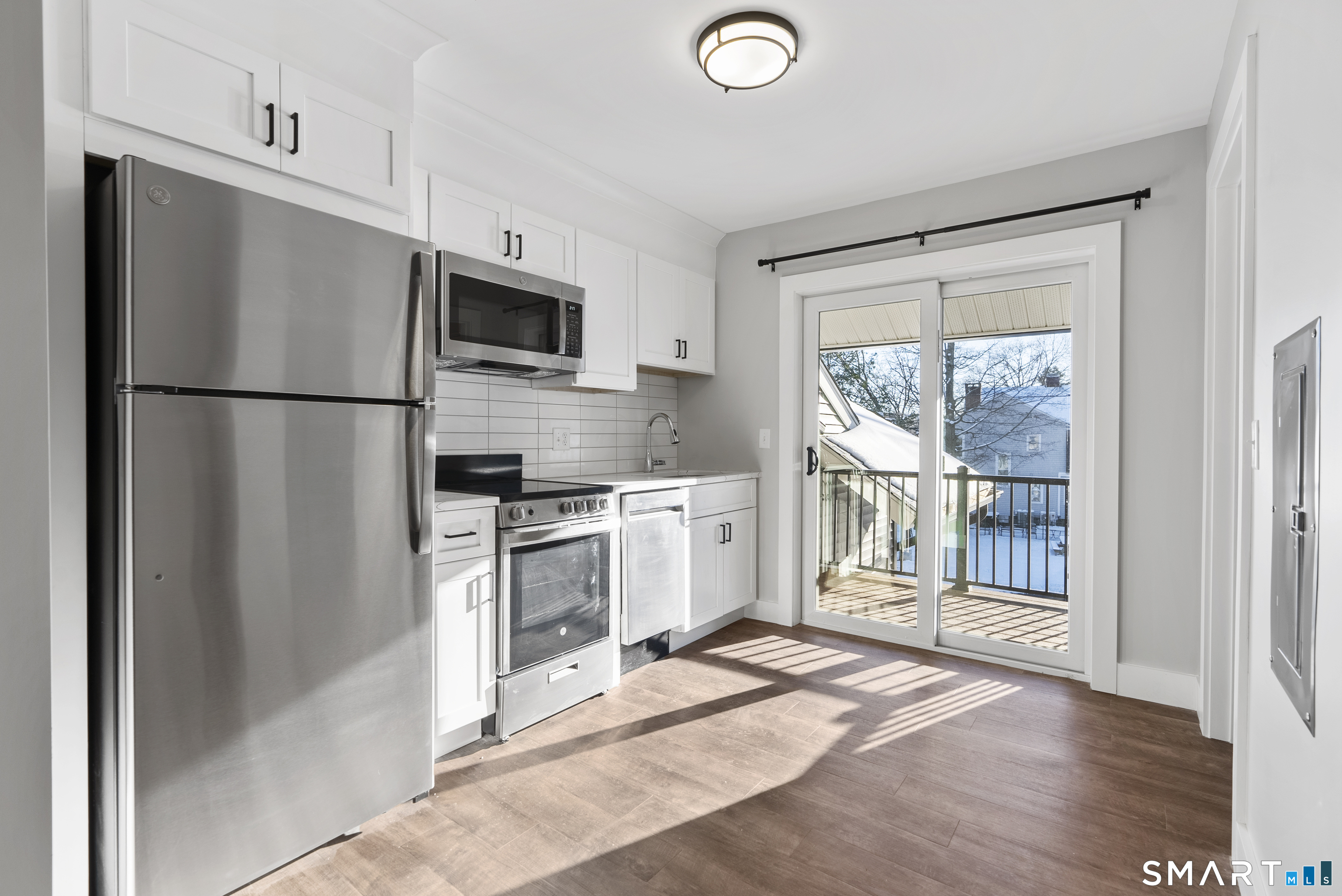 Welcome home to Simsbury Center Apartments, offering seamless live-work-play convenience just steps from downtown Simsbury's vibrant amenities. This fully renovated building boasts a chic modern farmhouse design, starting with a welcoming lobby featuring a cozy fireplace and seating area-ideal for gathering before a night out on the town. Premium finishes throughout ensure an elevated living experience that exceeds expectations. This well-laid-out studio in Unit 205 is perfect for simplified luxury living, whether you're downsizing, launching a career, or seeking an effortless lifestyle. Enjoy complimentary high-speed Wi-Fi and hot water included in your rent, along with the convenience and security of key fob access to the building and your unit. Inside, discover high-efficiency central heating and air conditioning, stainless steel appliances (refrigerator, microwave, oven, dishwasher, and in-unit washer/dryer), and a spa-inspired bathroom with a deep tub, custom tile surround, and premium fixtures. The gourmet kitchen is a chef's delight, featuring sleek quartz countertops, custom shaker soft-close cabinets, and a stylish tile backsplash. Step out onto your private balcony for fresh air and serene views, or take advantage of community perks like the expansive outdoor resident patio with grilling stations, four EV charging spots, a dedicated pet walking area, 24-hour surveillance, and professionally designed landscaping. Experience boutique luxury at its finest!