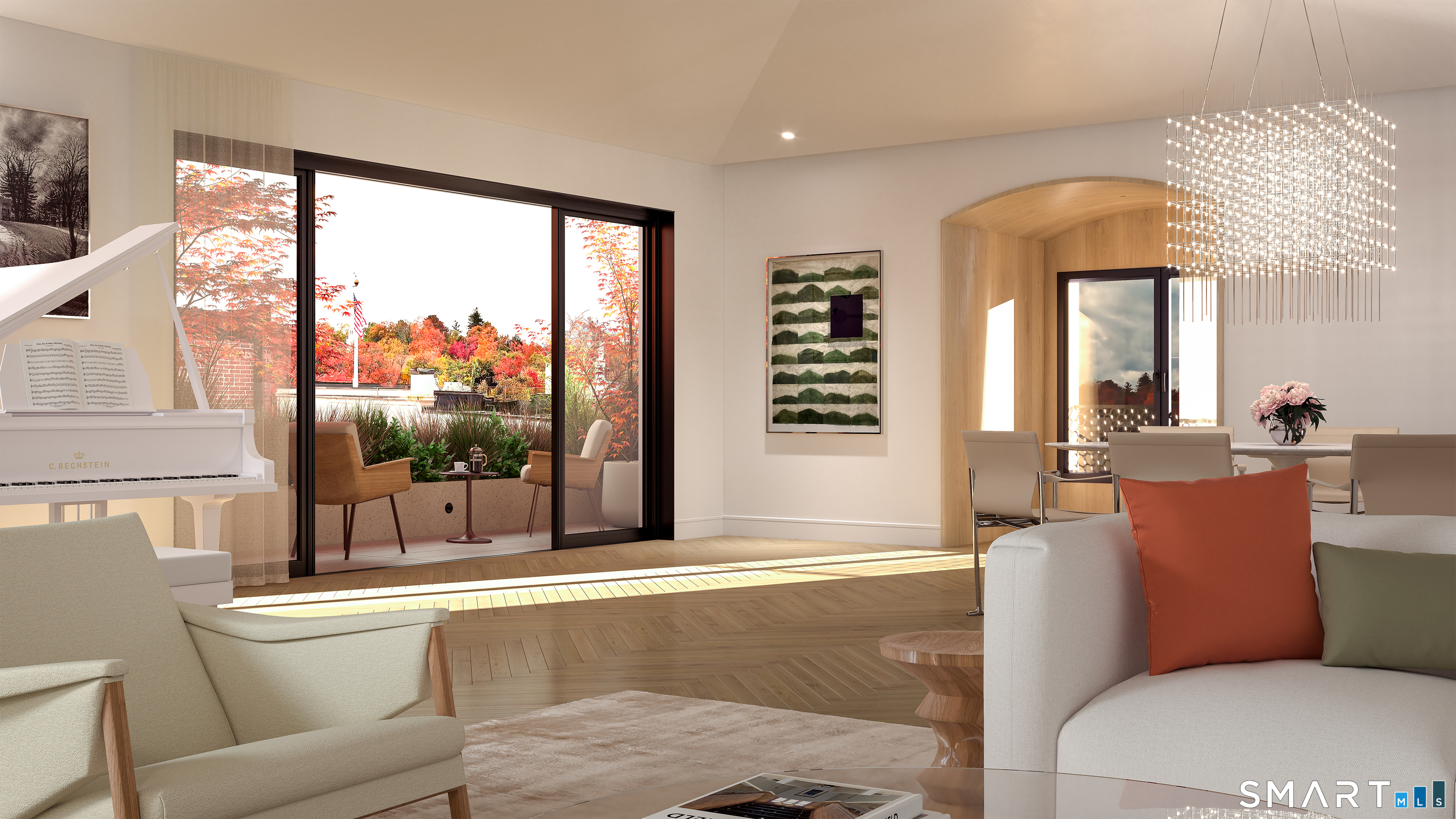 Effortless Luxury: The Modern Flat at The Quartier Redefine your standard of living in this nearly 1,300 sq. ft. bespoke flat, where high-end design meets the ease of single-level luxury. Located in the heart of New Canaan, this 2-bedroom, 2.5-bath residence features a private entrance terrace, 7" white oak flooring, and oversized windows that bathe the open-concept great room in natural light. The chef-caliber kitchen-outfitted with Leicht cabinetry, quartzite counters, and state-of-the-art appliances-flows effortlessly into the living and dining spaces, while the primary suite offers a secluded sanctuary with a spa-inspired bath and spacious walk-in closet. As part of a sustainable, boutique community featuring solar energy and rainwater harvesting, you'll enjoy "white-glove" perks including a full-time concierge, professional fitness studio, sports simulator, and an outdoor firepit lounge. Perfectly positioned just steps from the NYC train and the village's premier boutiques, this flat offers a rare combination of eco-conscious innovation and sophisticated downtown convenience.