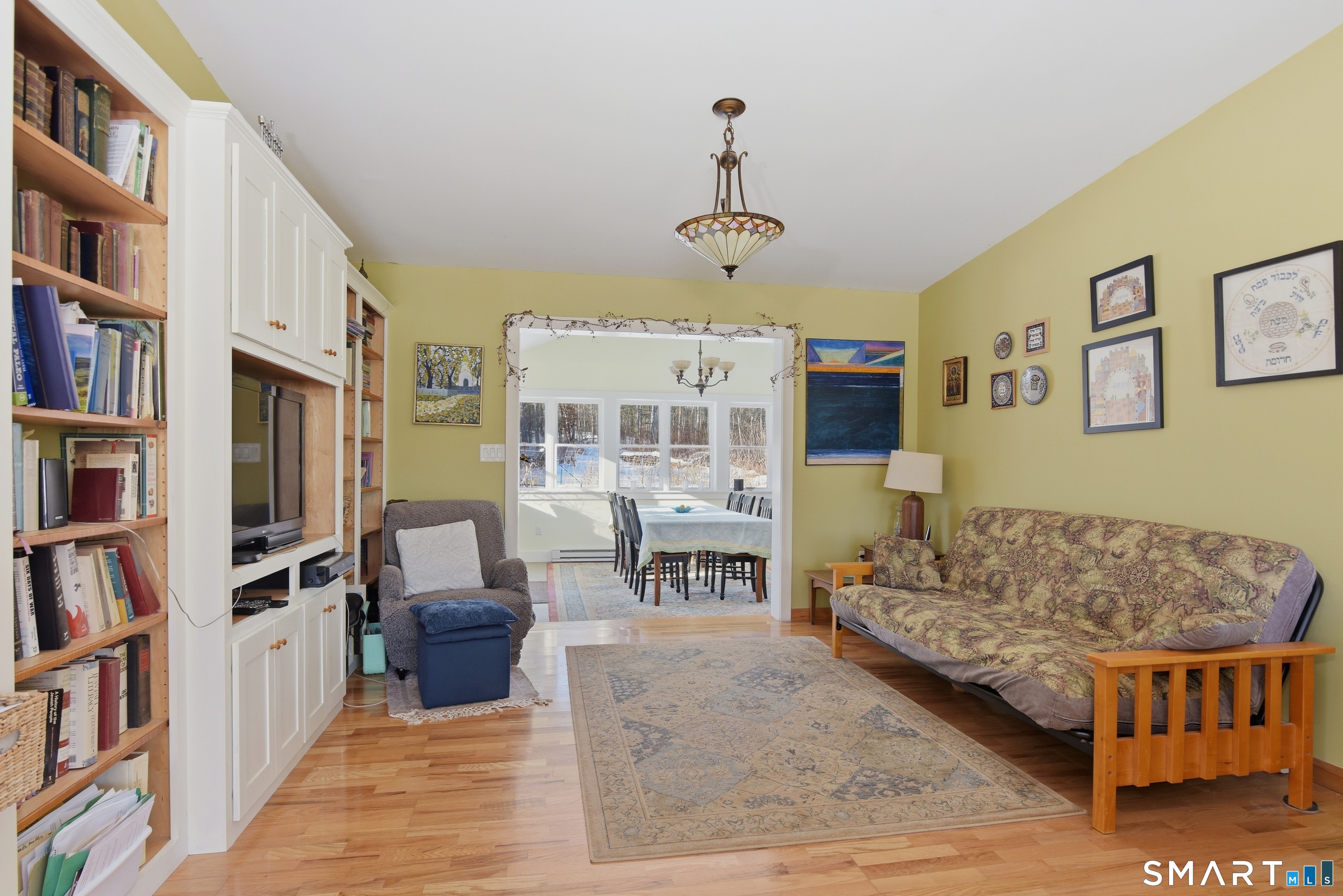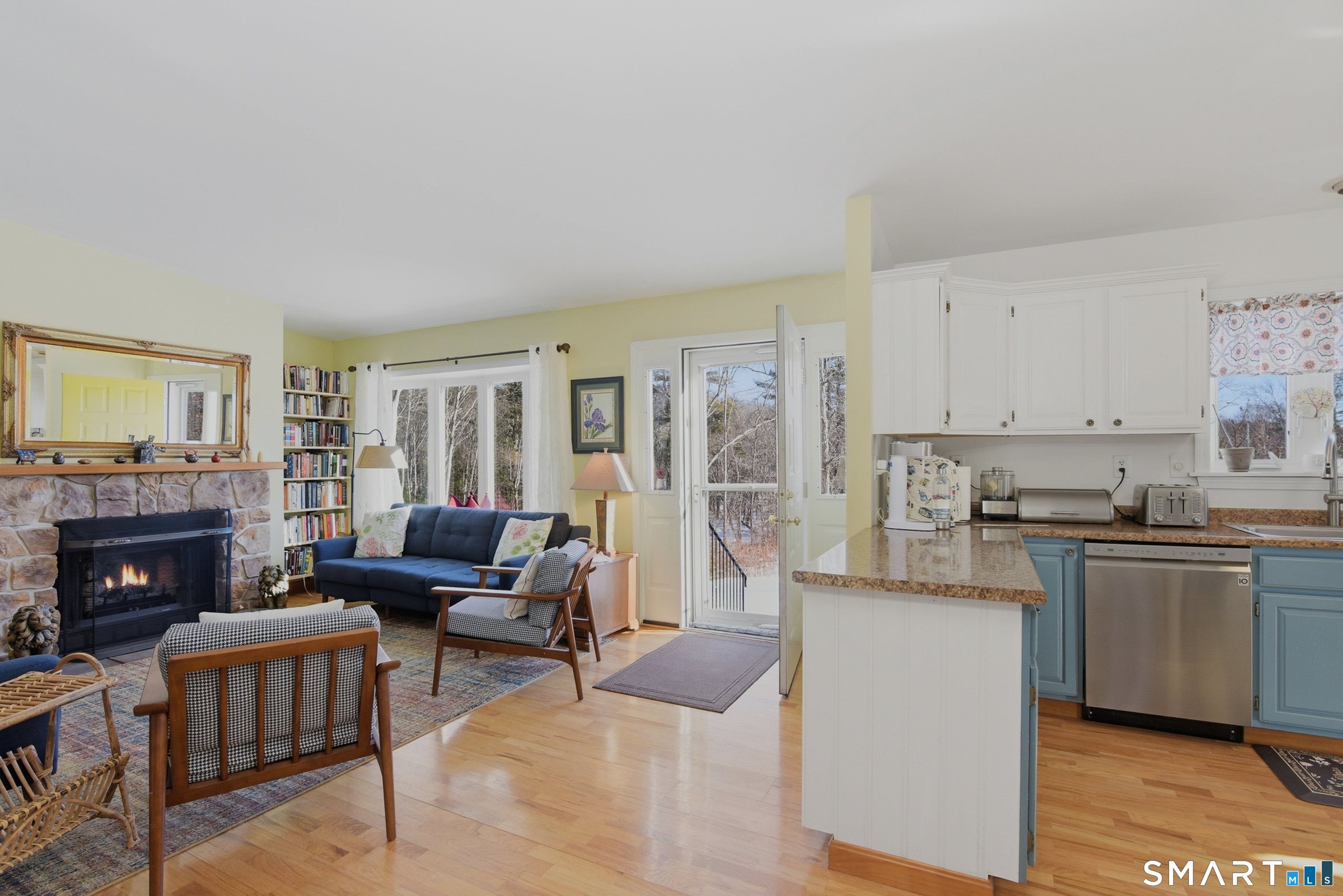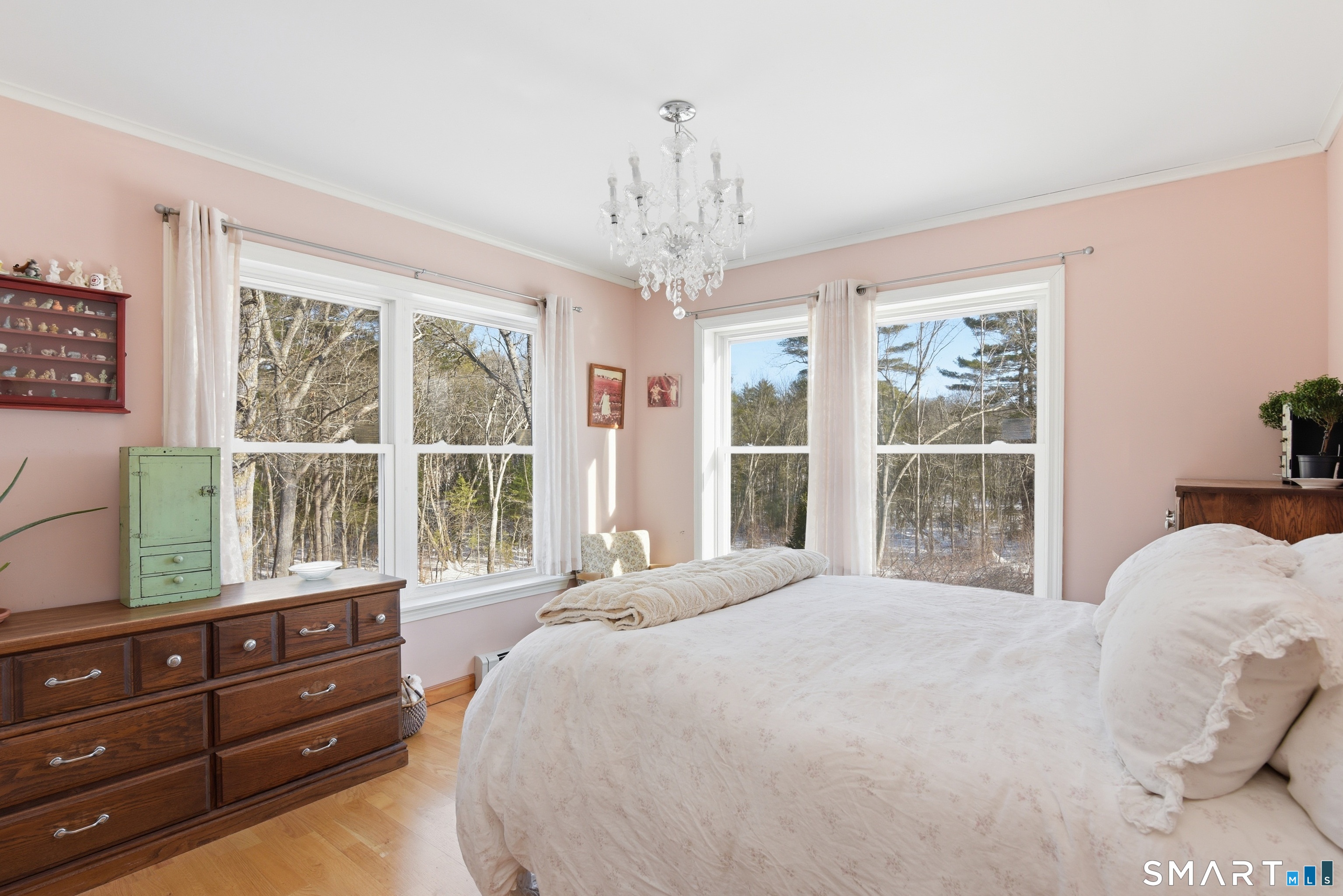 Set on a very private hilltop with a long winding driveway, this exceptional Woodstock property includes two lots totaling 9.4 acres of peaceful, natural beauty. The home offers 2,256 square feet of elegant living space, all conveniently located on one level. There have been extensive investments by the current owners. The improvements and upgrades include the addition of a formal dining room with vaulted ceiling, a new 1st floor half bath, new 1st floor laundry room, and a spectacular 22x18 glassed great room that fills the home with light and captures the surrounding nature views. The owners also added an attached storage garage for functionality. The kitchen, with stainless appliances and pantry, opens to living and entertaining areas that are enhanced by an elegant fireplace, stunning built-ins, and beautiful hardwood floors. The thoughtful layout includes 3 bedrooms, 2 and 1/2 baths, with a separate 2-bedroom guest wing ideal for visitors or flexible living needs. A massive walkout basement with wood burning stove provides excellent space for a workshop, abundant storage, or future expansion of living area. Relax on the back deck overlooking the expansive grounds and serene wooded setting. Installed solar provides efficient green energy. Located in the highly desirable town of Woodstock CT, this rare offering combines acreage, privacy, and quality living in one remarkable hilltop retreat. Please visit and experience the serenity this property has to offer.