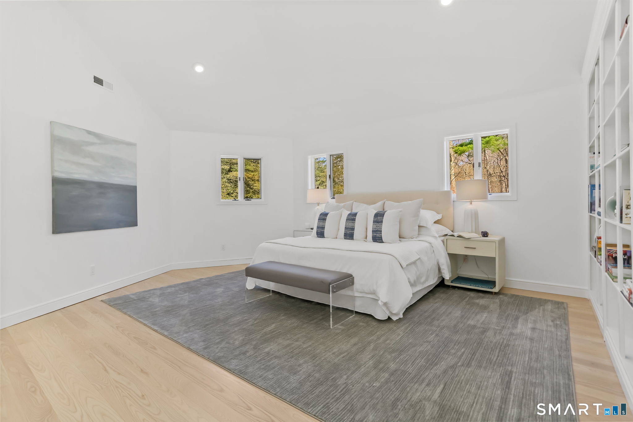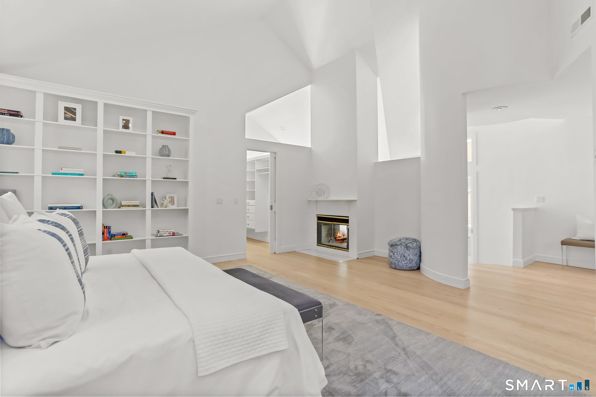 Set along the Saugatuck River on a quiet lower Weston cul-de-sac, this architecturally distinctive contemporary is privately sited on 2.49 acres and features a large GUNITE POOL overlooking the river, with rental including pool maintenance and landscaping. Offering scale, light, and direct river access in one of Weston's most desirable settings, the home is anchored by a soaring cathedral ceiling Great Room defined by dramatic vertical volume, expansive glass, and extraordinary natural light. A central fireplace adds warmth and balance to the openness, creating a space equally suited for entertaining or quiet evenings at home. The kitchen is thoughtfully positioned at the heart of daily living, opening seamlessly to the family room with fireplace. French doors lead directly to the deck, gunite pool, and BBQ terrace, creating effortless indoor-outdoor flow and making summer gatherings and everyday living feel connected to the landscape. A striking three-season porch with cathedral ceilings extends the architectural expression and provides a serene transitional space overlooking the natural surroundings.