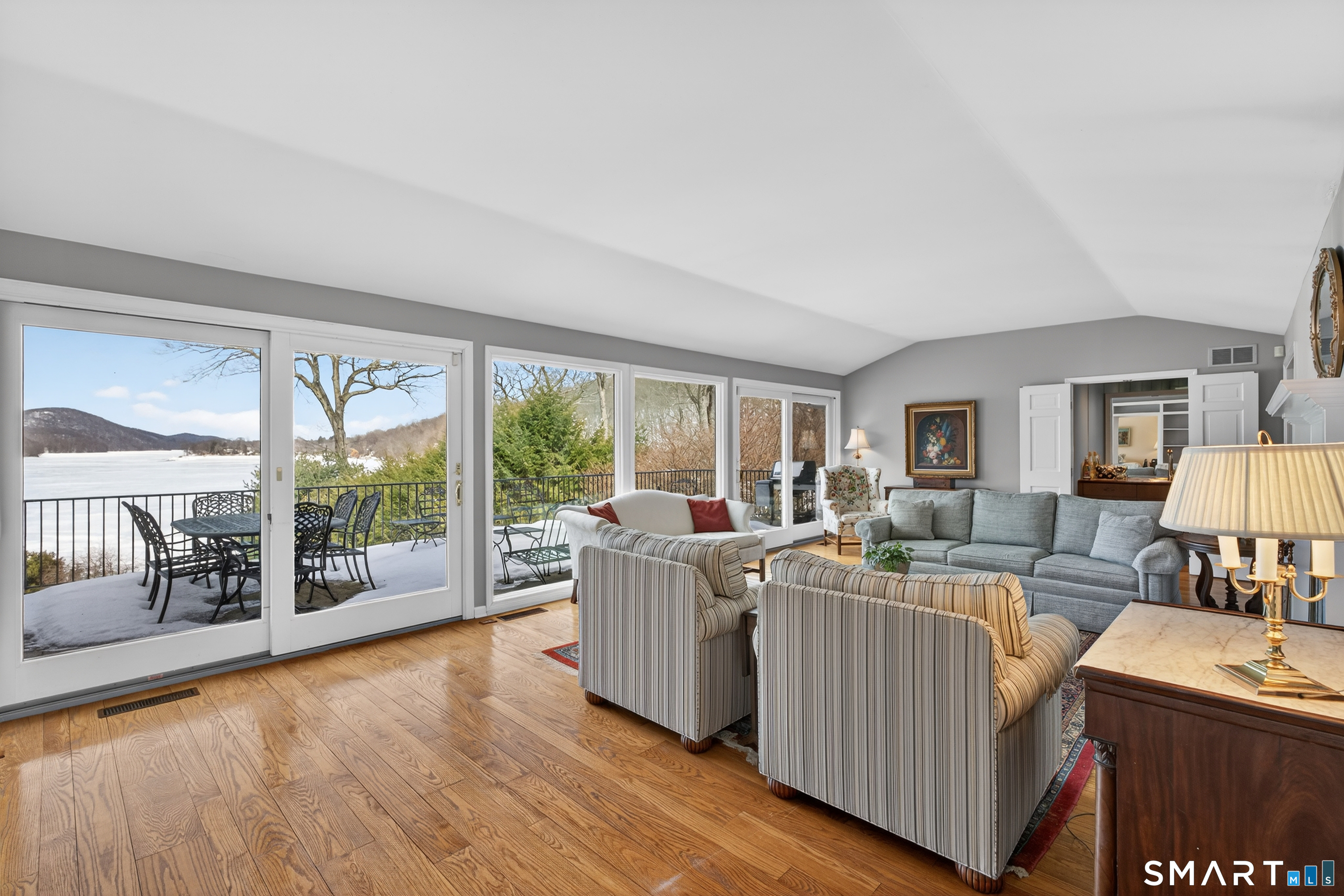 Welcome to this gorgeous Chimney Point Cove waterfront in the sought-after Candlewood Lake Club. Only 10 houses on the lake can claim this coveted location! This spacious 4,000+ sq ft home features a grand living room with a stone fireplace and a wall of windows framing spectacular, expansive northern mountainous views. Ideal for multi-level living, the first floor boasts a primary suite with stunning lake views, a second bedroom, and two full baths. The main level also features a gourmet kitchen, cozy den w/ fireplace, formal dining room with a bar-perfect for entertaining. The bright expansive finished lower level offers a massive great room with a fireplace and 2 private en suite bedrooms plus private walk out access to waterfront. Set on a unique, level half-acre lot with a circular driveway and detached 2-car garage. Enjoy elite club amenities: golf, tennis, pickleball, marina, and beach. A lake lover's dream-all just 90 minutes from NYC. Membership to CLC is optional (note: one time $15,000 initiation fee with Annual Club Dues $5,200 + CT State Tax Mandatory Roads ($475) and water fees ($600) are mandatory for all owners.