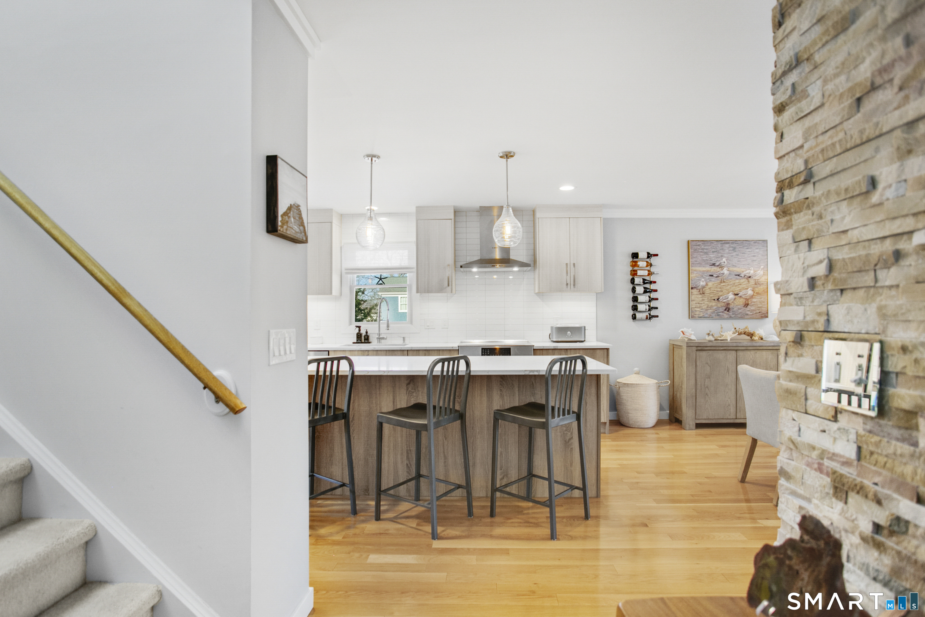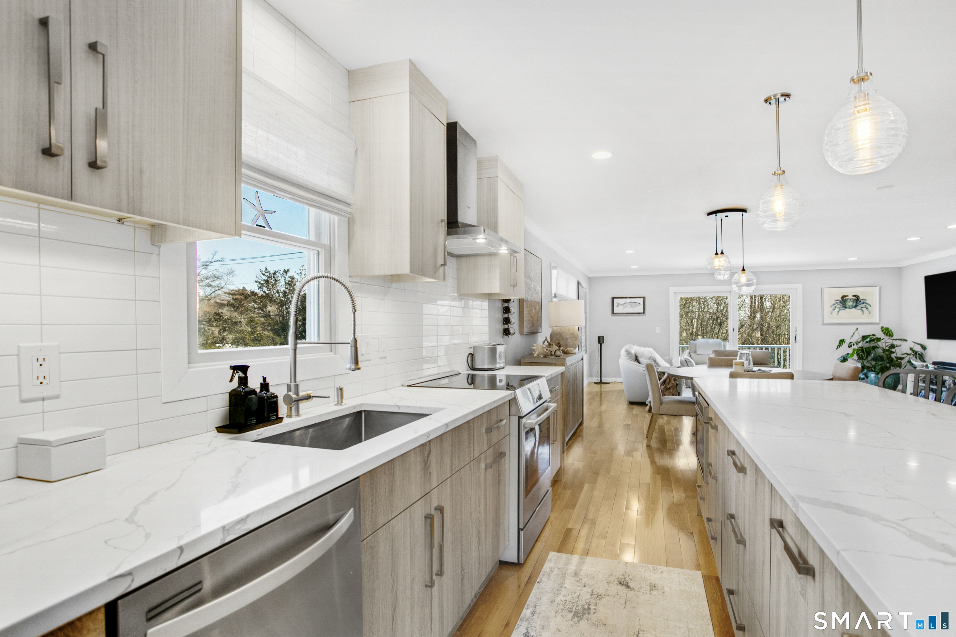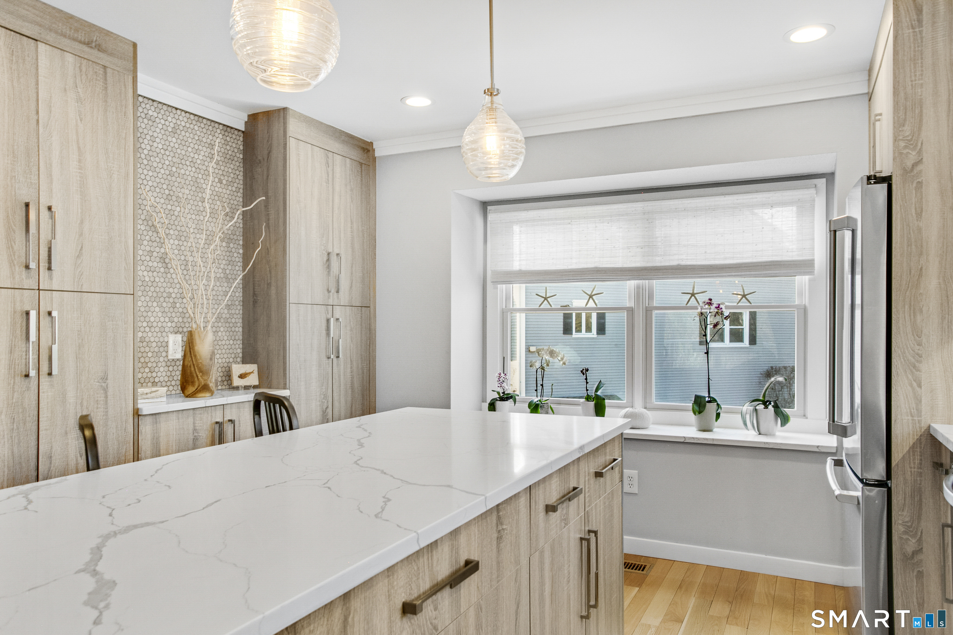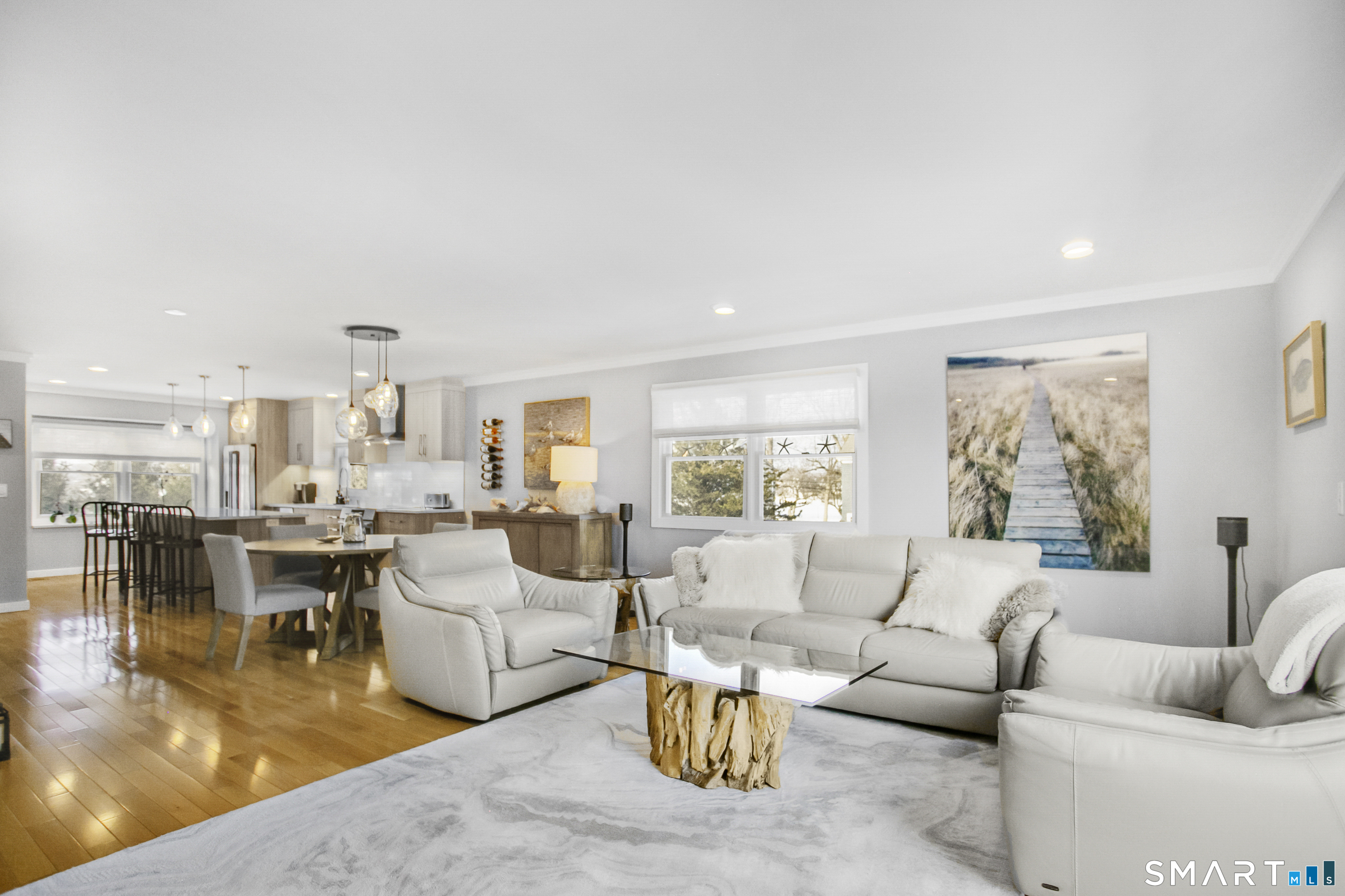 OCEAN REEF - Perfectly positioned on a cul de sac within an impeccably maintained 11-unit Townhouse community in the coveted Fairfield Beach area, 3 Ocean Reef Drive offers refined coastal living at its best. Beautifully updated and filled with natural light, this exceptional residence features two to three bedrooms and three-and-a-half baths, thoughtfully designed for both comfort and style. Sun-drenched open interiors flow seamlessly from the inviting living room-complete with fireplace-onto an expansive deck, creating an ideal setting for relaxing or entertaining. The stunning designer kitchen is the heart of the home, featuring exceptional finishes and an adjoining, spacious dining area perfect for gatherings. This serene retreat is just minutes from Penfield Pavilion, beautiful beaches, South Benson Marina, and vibrant Fairfield Center with its wide array of dining, shopping, cultural attractions, and recreational venues. Convenient train service to and from New York City completes the appeal of this exceptional Fairfield location. Entrance Hall. Main Level - Living Room with hardwood flooring, wood-burning fireplace, and sliding doors opening onto an expansive Deck. Designer Kitchen with hardwood flooring features Quartz countertops, subway tile backsplash, Center Island with Breakfast Bar, plentiful cabinetry, great lighting, and Pantry storage extending onto very spacious Dining Area. Stainless steel appliances include: PLEASE OPEN ADDENDUM FOR FURTHER DESCRIPTION.