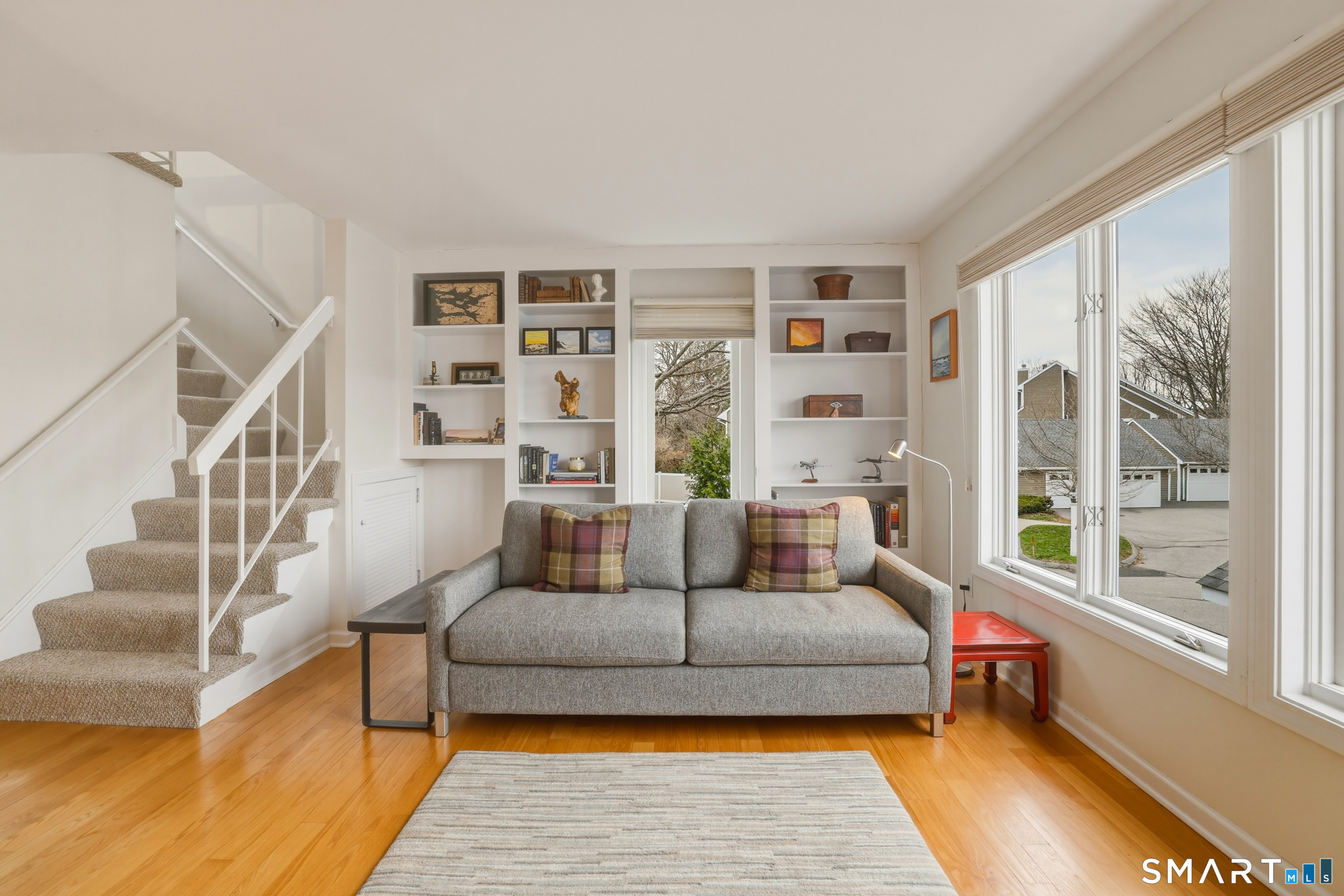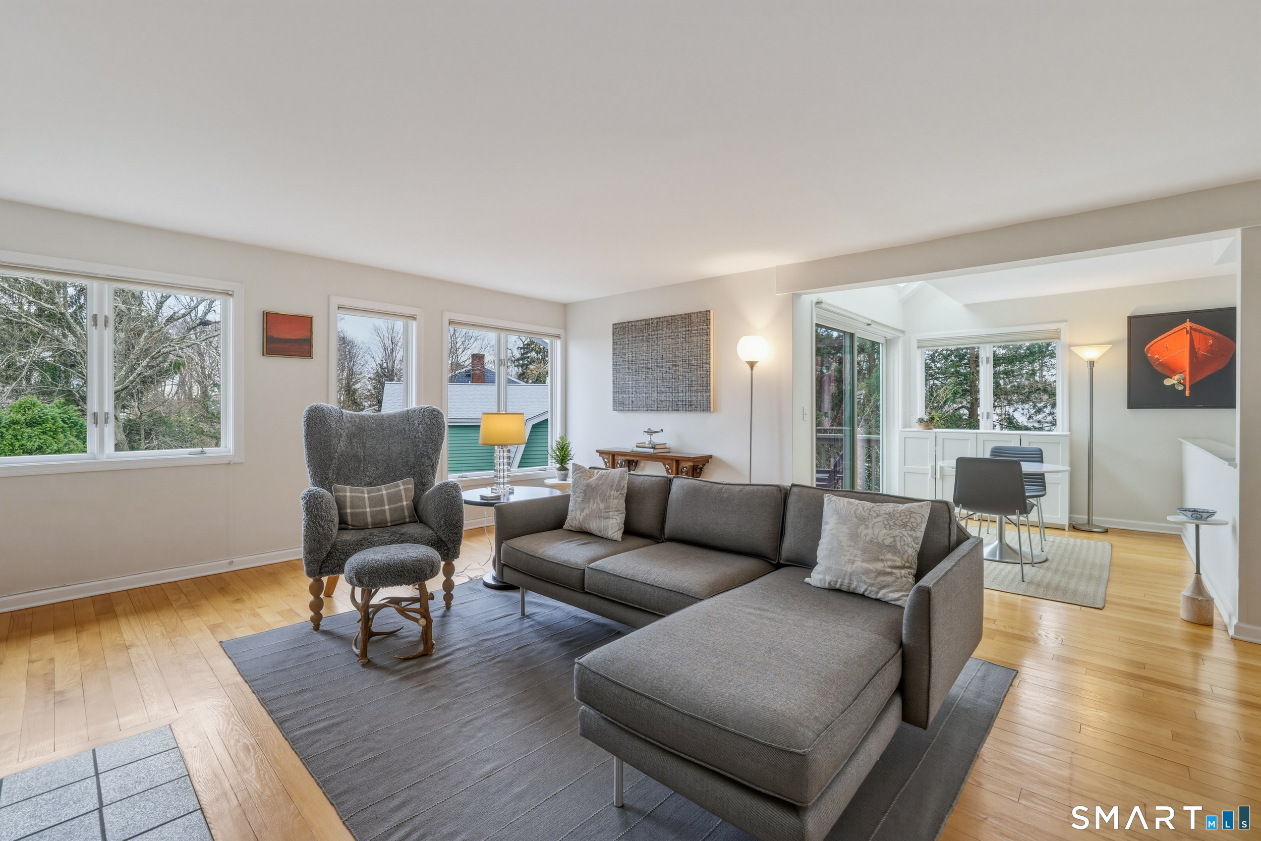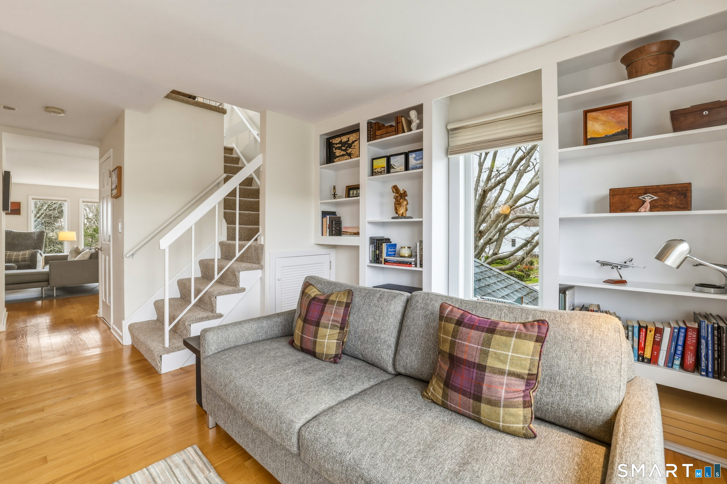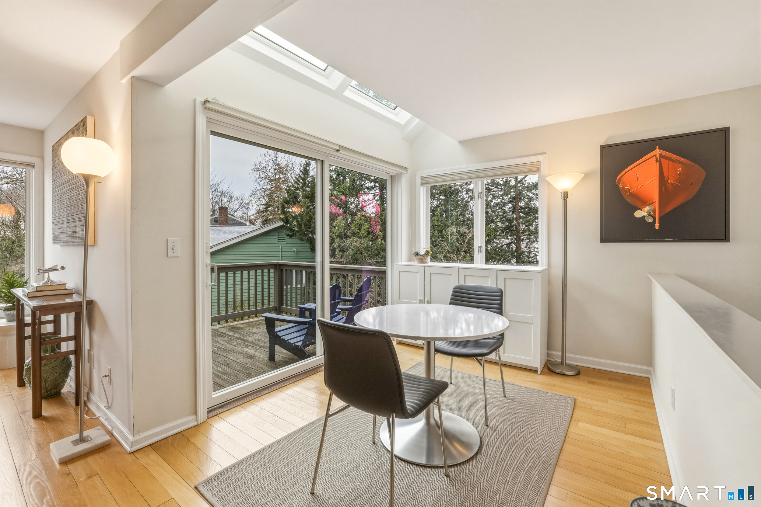 Experience the ease of low maintenance coastal living in this updated 1 bedroom, 1 1/2 bath condo with beautiful views of the salt marsh, river, and Long Island Sound. An inviting sun-filled, south facing end unit, the main level features hardwood floors, a kitchen with granite countertops and stainless steel appliances, and a family room with a cozy wood-burning fireplace. A flexible space off the family room with access to a private (newly updated) deck overlooking the water provides ideal spaces for work or relaxation. Lovely built-ins are found in the living room, while a powder room/half bath rounds out the main level. The upper level master bedroom suite offers a walk-in closet, in unit laundry, and a full bath with soaking tub and walk-in shower. Enjoy central A/C, natural gas, city water, detached one car garage and a storage shed. This sought after complex includes an inground pool and is perfectly located just a short stroll to the marina, town beach, commuter rail, and Guilford's vibrant historic village with boutiques, restaurants, and coffee shops. Can be sold furnished (negotiable); ideal for those seeking a turnkey, convenient lifestyle by the water.