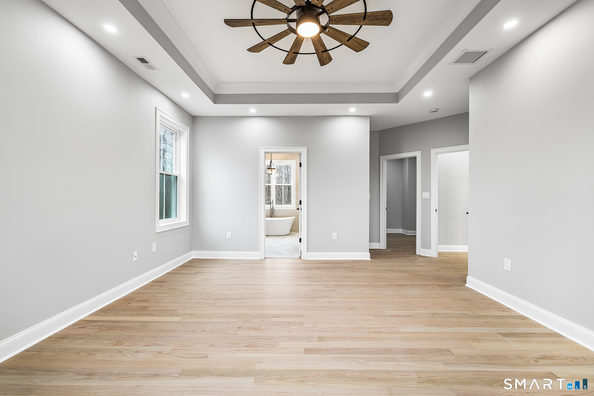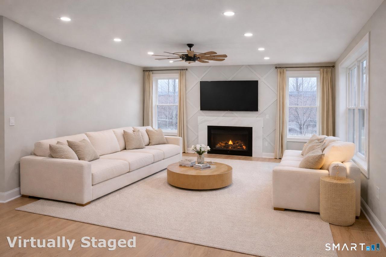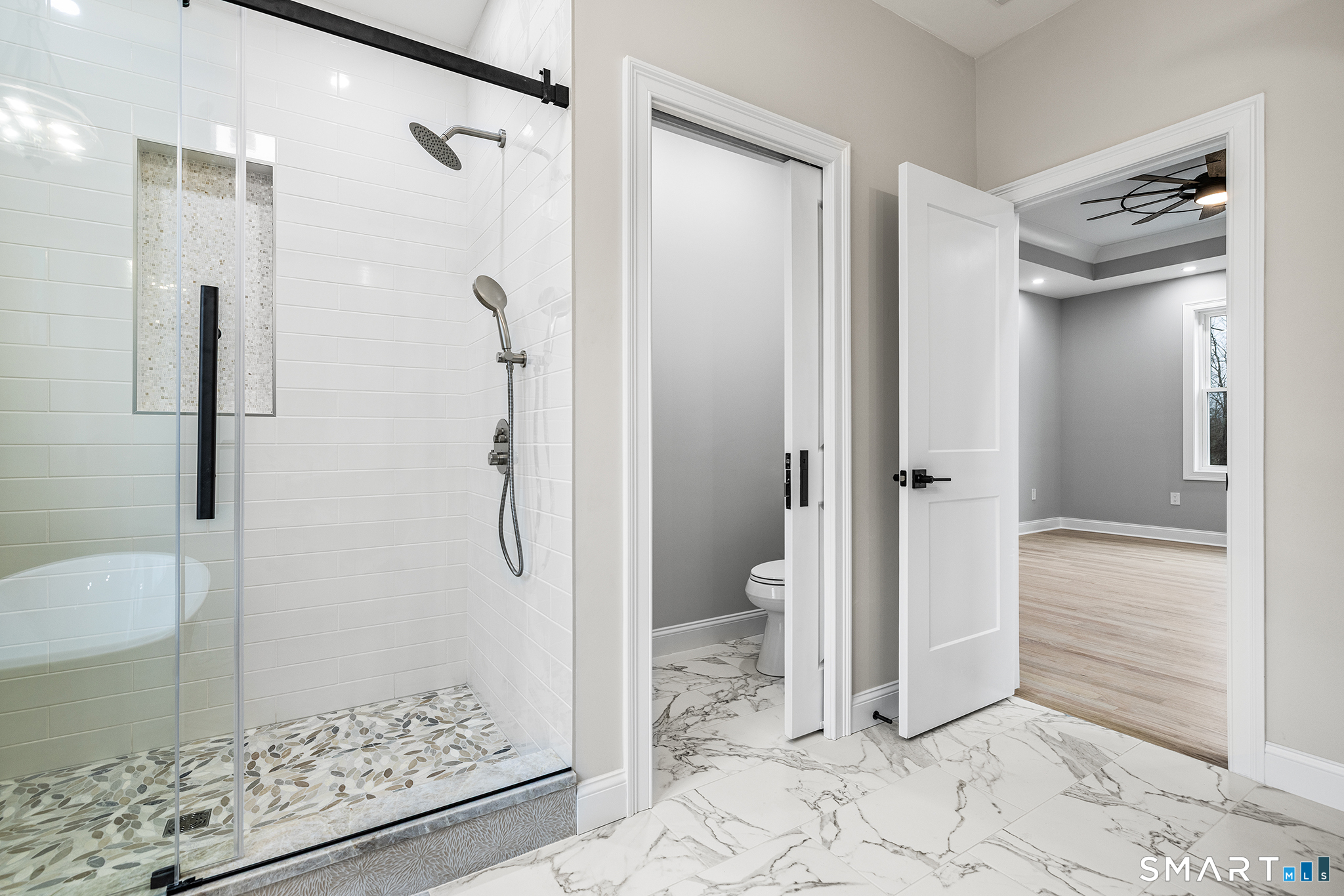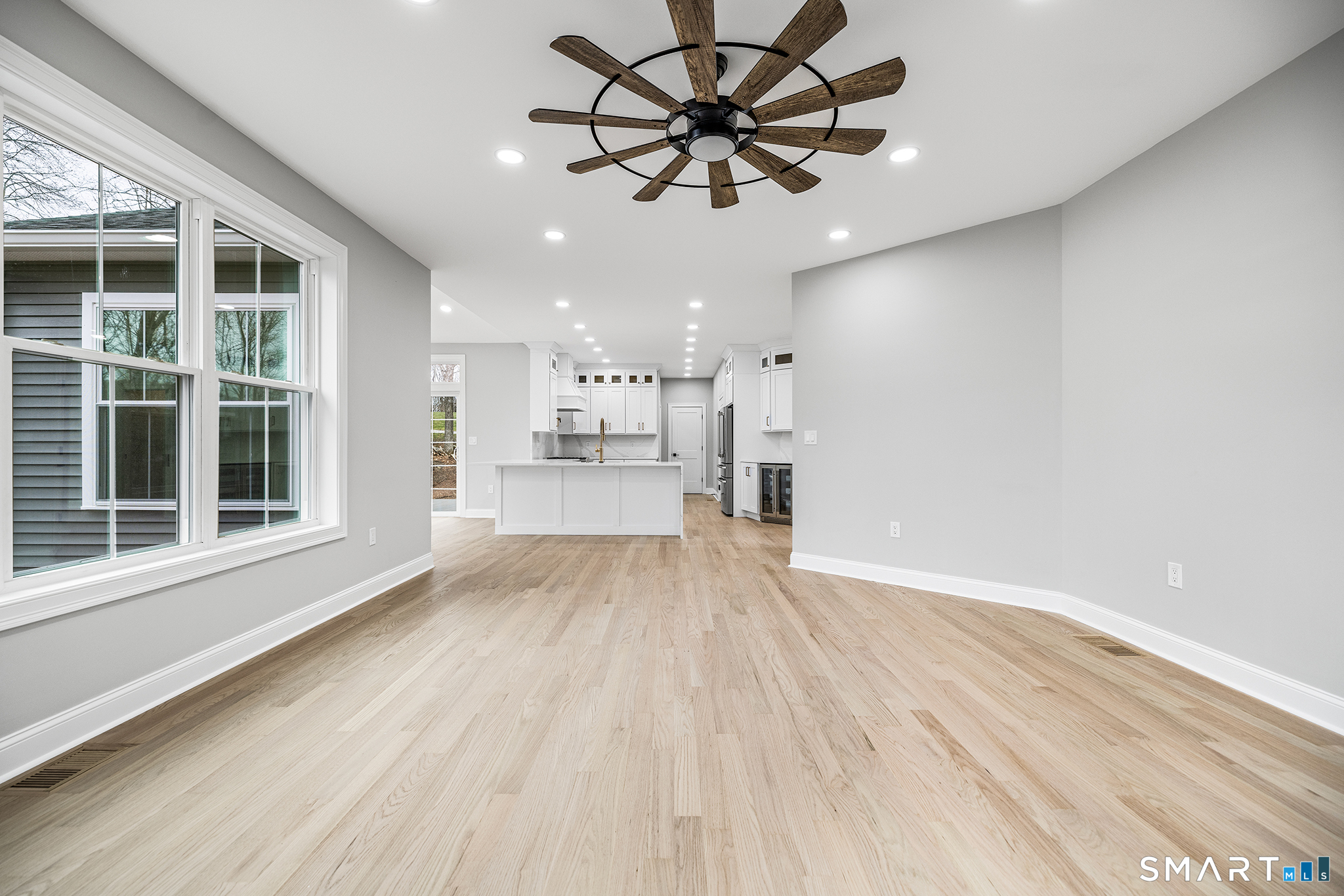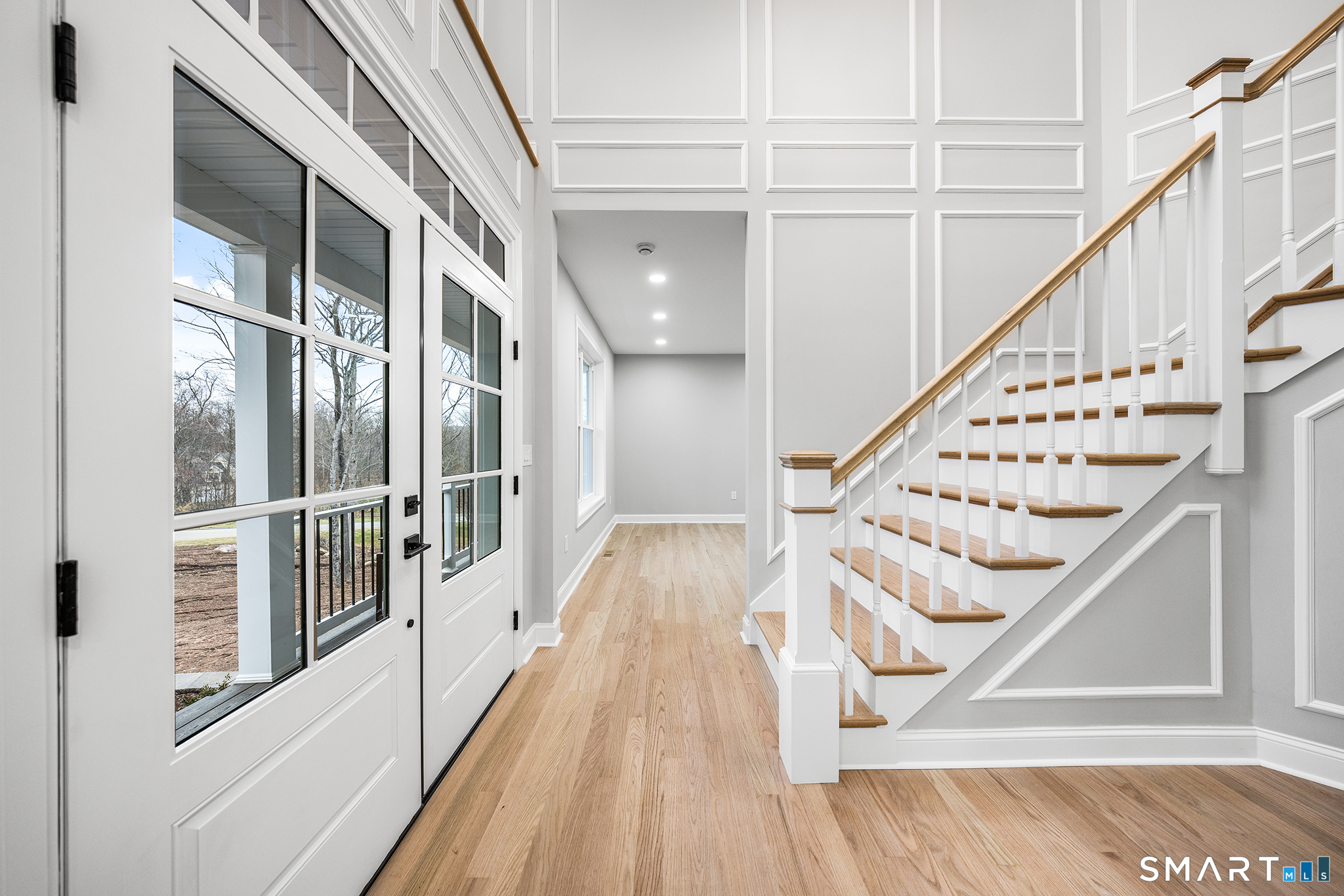 Newly constructed home offering over 3,100 sq ft of refined living space, privately set on 1.30+ acres in the desirable Chatham Ridge community, just minutes from Glastonbury. Thoughtfully designed with exceptional craftsmanship and elevated finishes, this home blends modern style with timeless design. The open-concept layout features 4 bedrooms, 4 bathrooms, and an oversized three-bay garage. A dramatic great room showcases a floor-to-ceiling geometric fireplace feature wall and expansive windows that fill the space with natural light, creating a striking focal point. The designer kitchen features a waterfall quartz peninsula with seating, full slab quartz backsplash, premium appliances, custom cabinetry with glass display accents, and a fully equipped butler's pantry. Upgrades include 9-foot ceilings on all three levels, extensive custom millwork, hardwood flooring throughout, designer tile, recessed lighting, triple-pane windows, and a high-efficiency three-zone HVAC system. Outdoor living features maintenance-free composite decking overlooking the private yard. A stamped concrete front walkway adds curb appeal, and the walk-out basement is pre-plumbed for a future bathroom and offers excellent potential for additional finished living space. Showings start 3/28/26