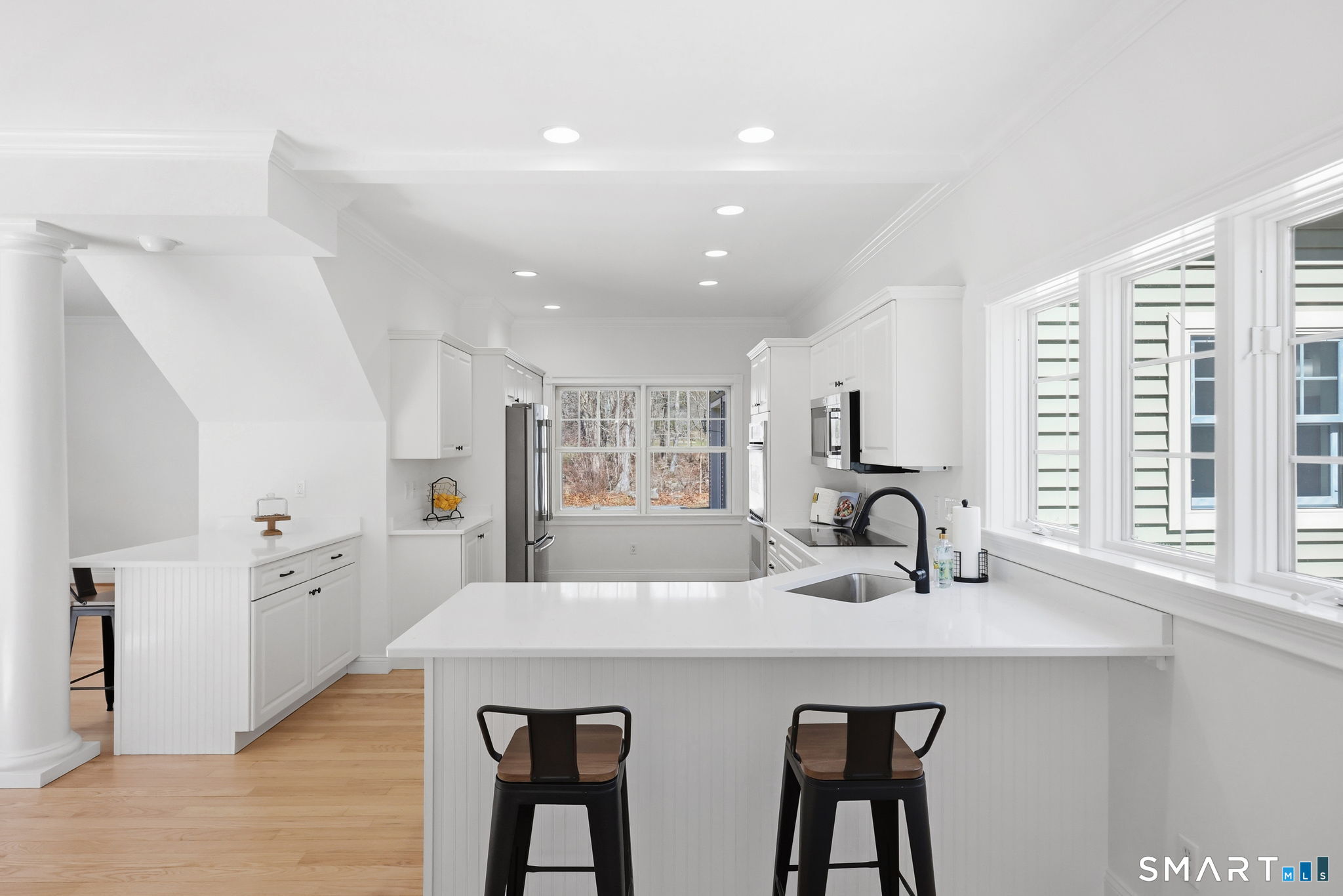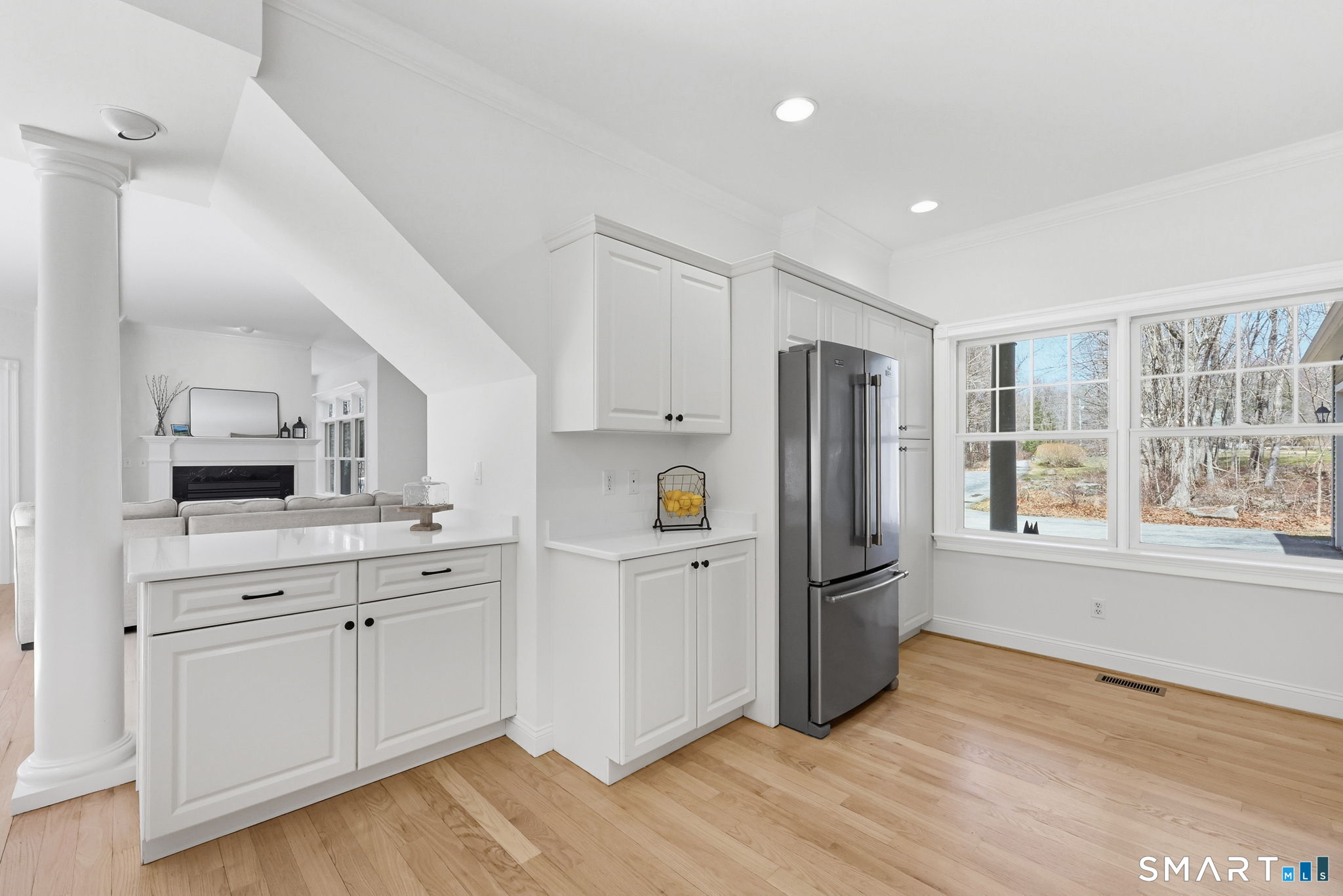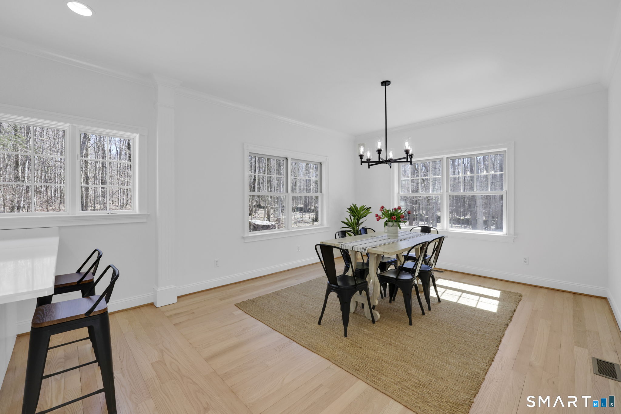 This custom cape, with 5+ acres abutting protected town land, provides the privacy and beauty of scenic, rural living while being within easy access of both UConn (5 Miles) and Hartford (25 miles). Nestled in wooded serenity, this home's backyard oasis features an on-ground pool wrapped in composite decking with vinyl railings, an outdoor shower, a powered gazebo, stone patio, garden beds, fire pit, and walking trails. Inside, the expansive home's floorplan is suitable for many wants & needs: multi-generational living, a dedicated work from home space, guest quarters, or a home business with a separate side entrance. Recently refreshed with interior paint, refinished hardwood floors, new quartz counters, new hardware & fixtures, and more, this home exemplifies open concept architecture! At the heart of the home is the living room, kitchen, and dining area with high ceilings and a double-sided propane fireplace that's shared with the sunroom. Multiple windows and french doors allow for maximum views of the backyard and deck while providing ample sunlight at all times of day. The roomy kitchen provides abundant cabinetry, double wall ovens & cooktop, generous counter space, stainless steel appliances, and 2 breakfast bars. There's a first-floor primary bedroom suite with a massive walk-in closet and recently renovated bath. A pocket door from the kitchen leads to a second full bath, tiled mudroom with storage, garage access & a separate entrance from the front porch.