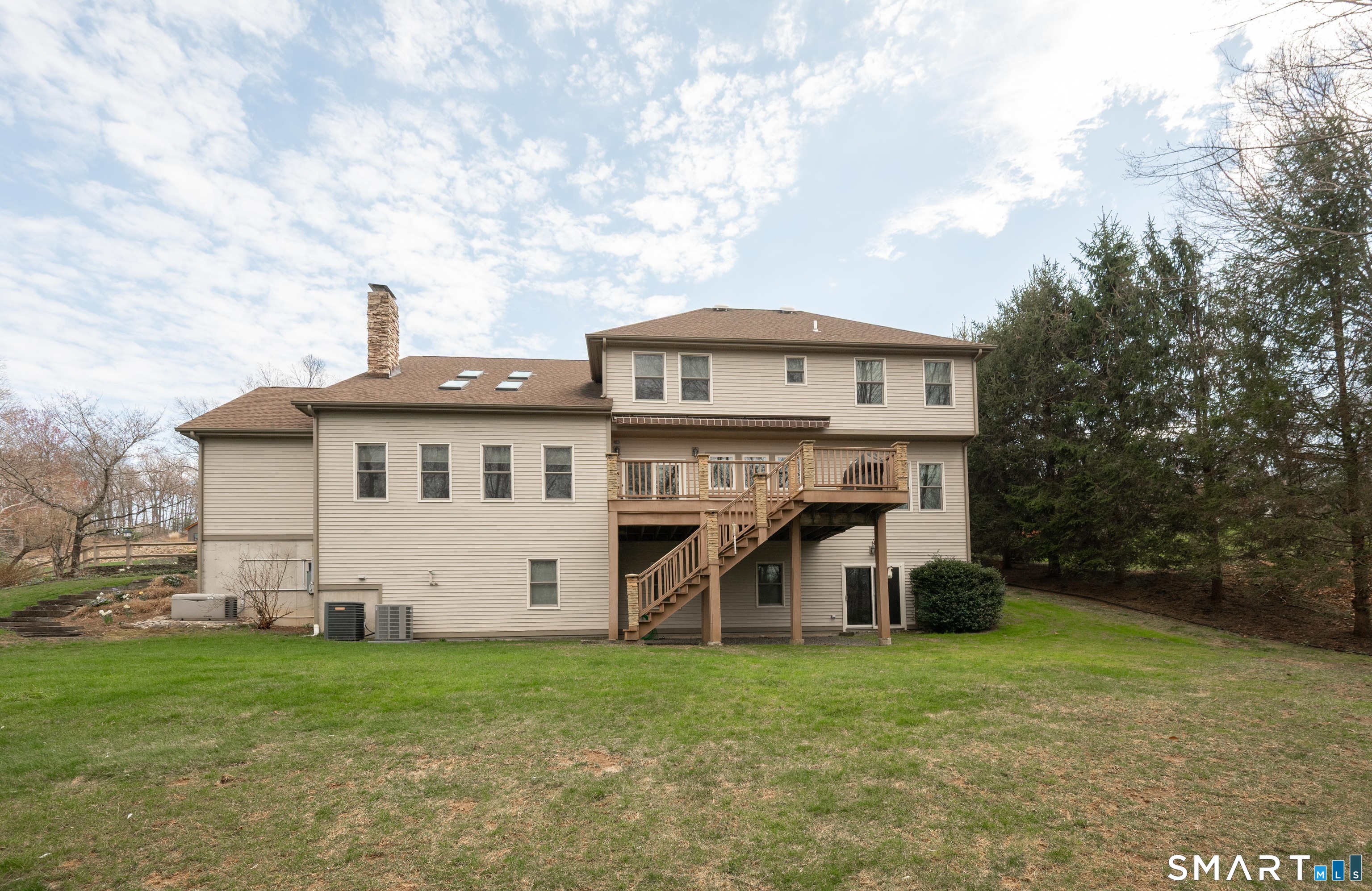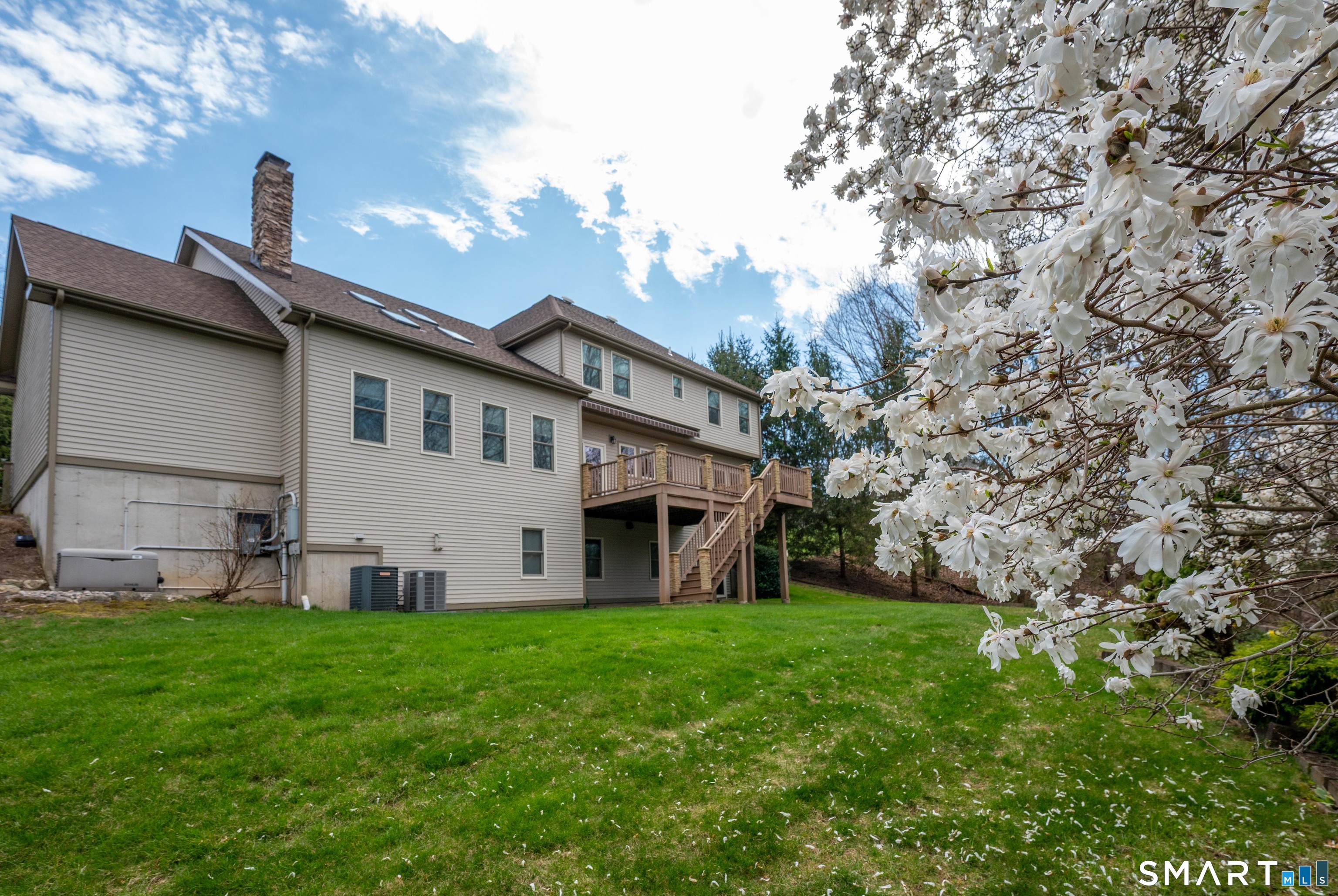 Majestic 4BR/4BA custom colonial in sought-after Fox Hollow Estates is set on a private cul-de-sac with circular driveway, stone walls, and professional mature landscaping that really sets this home apart from the others. Offered by original owners, this home features a dramatic 2-story foyer and sun-filled layout with hardwood floors throughout the entire home. Updated chef's kitchen with granite, tile backsplash, stainless steel appliances, and a pantry with an open concept layout flowing into an impressive family room with 20-ft cathedral ceiling, 4 skylights, and a striking wood-burning fireplace. The main level also includes a full bath with shower, private office large enough for a main-floor bedroom, formal dining and generous living room, both with wood-inlay flooring. Upstairs the spacious landing leads to a wonderful spa-like primary suite with walk-in closet and oversized tiled shower, plus 3 additional large bedrooms sharing a full bath. A back staircase adds convenience & functionality to access this level. Enjoy the partially finished walk-out lower level with another full bath, providing flexible living space. Highlights include new high-efficiency Energy Kinetics furnace, whole-house propane backup generator, newer Anderson Windows with a lifetime guarantee, a maintenance-free Trex deck with automatic Sunsetter awning, and a convenient attached 3-car garage complete w/cedar closet for storage. Convenient to Exit 14, schools, shopping, and commuter routes!