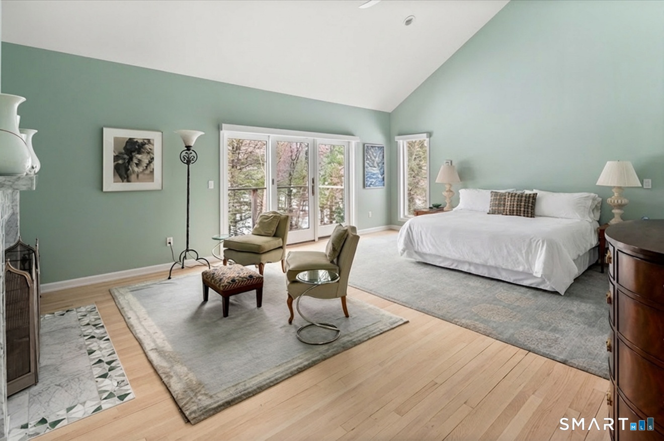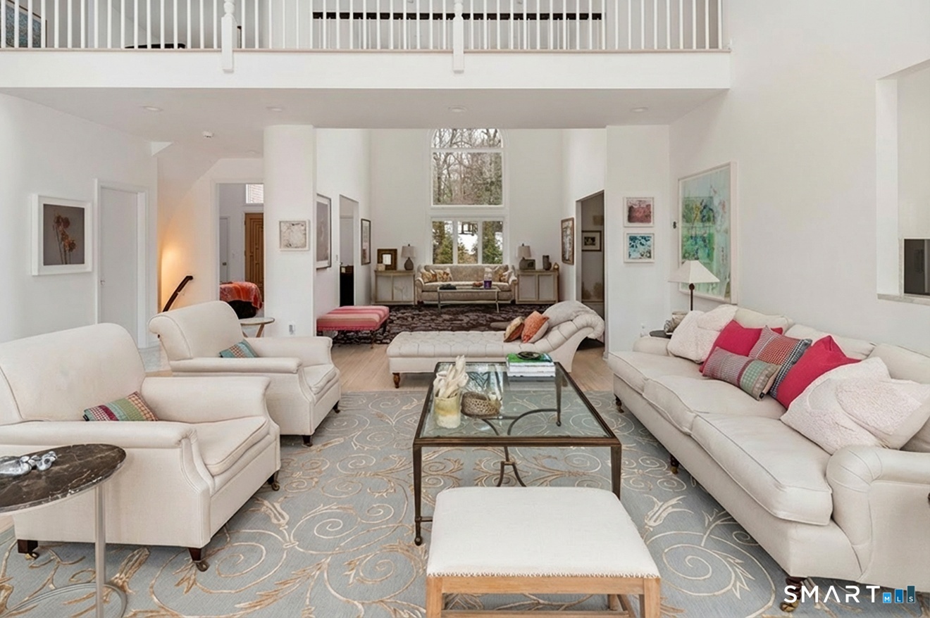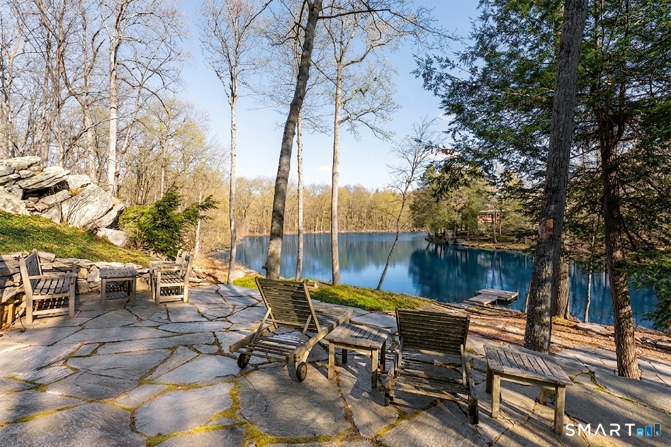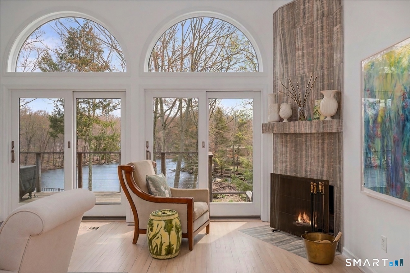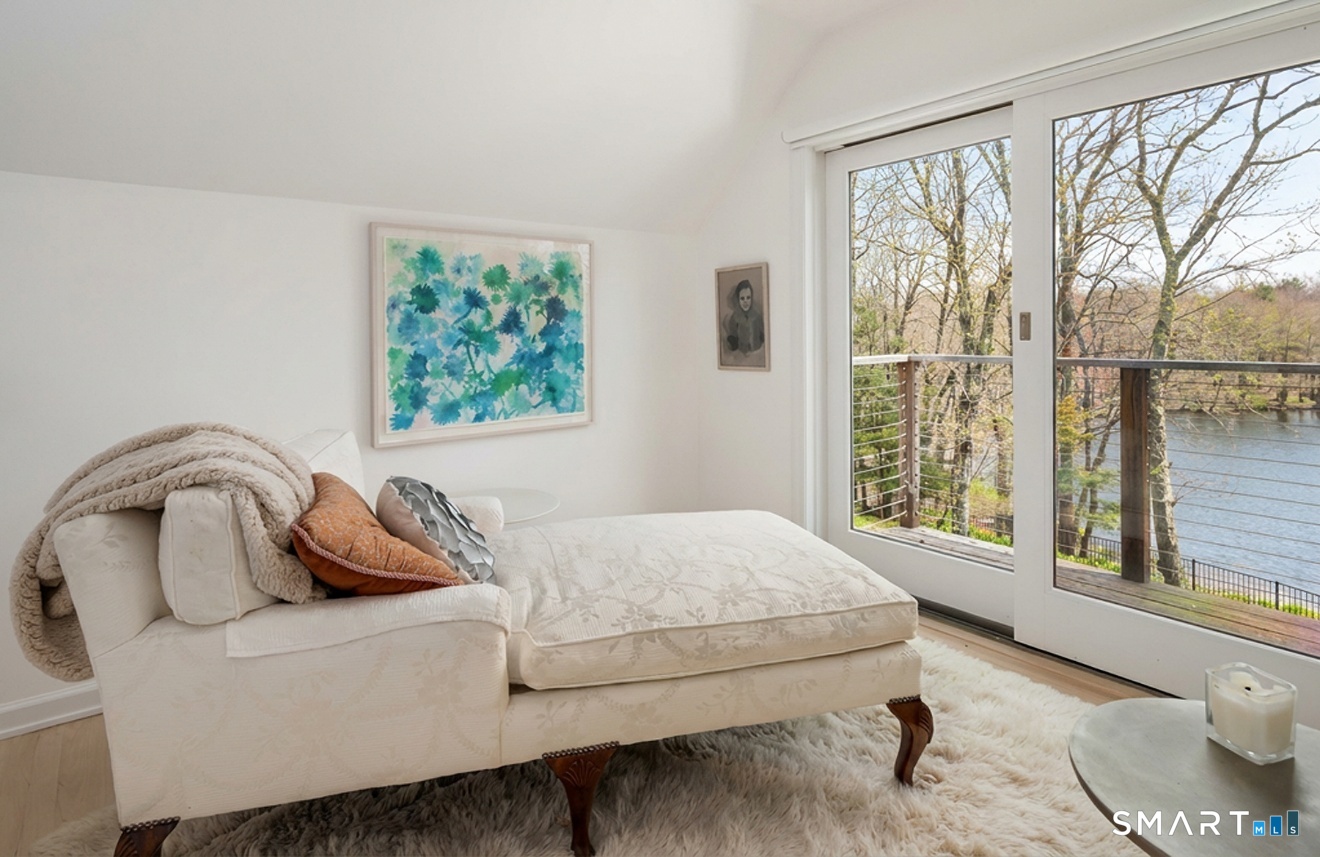 Lakefront living! This elegant home features 450" ft of private, pristine lakefront in a coveted area of North Stamford CT! 1 hour from NYC by train, minutes from the vibrant city life of Stamford CT, this custom built, sunlit home has been exquisitely re-imagined in a sophisticated, modern style. The grand entrance opens to a foyer with marble floors, winding staircase, and panoramic lake views! Open floor plan with gallery walls are replete with vibrant paintings and sophisticated photographs. Arching oversized windows draw the eye to the lake front, saturating the interior with natural light. Main level includes a music room/study with a wood burning fireplace, elegant dining room, an oversized 2 story living room with a Onyx surround fireplace, updated kitchen with chef's appliances, primary bedroom with a custom marble mosaic fireplace, private balcony, 2 walk-in closets and a luxurious ensuite bath. Deck with steel cord-Ipe wood railings provides indoor-outdoor entertaining space. The 2nd floor has 3 ensuite bedrooms, (2 currently used for art studios) plus a generous recreation room/office/playroom. Walk-out lower level has a potential in-law/office suite with a separate entrance and kitchenette, a gym area, temperature controlled wine closet, and multiple closets/storage areas. Full house generator. Radon system. Bosch, Wolf, Subzero appliances. Approx 4200 sq ft on main and upper levels-another 3000 sq ft in lower walkout level.