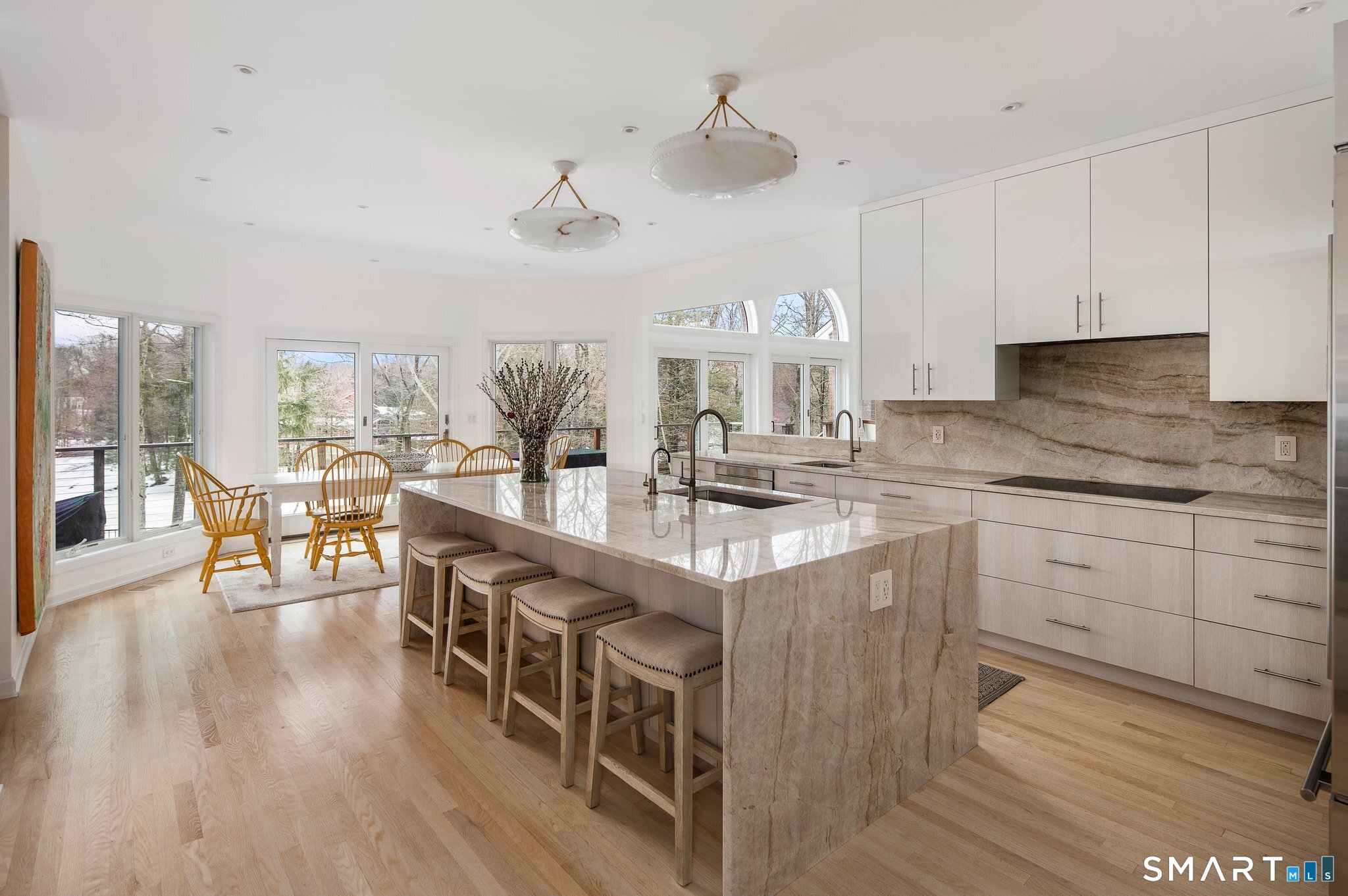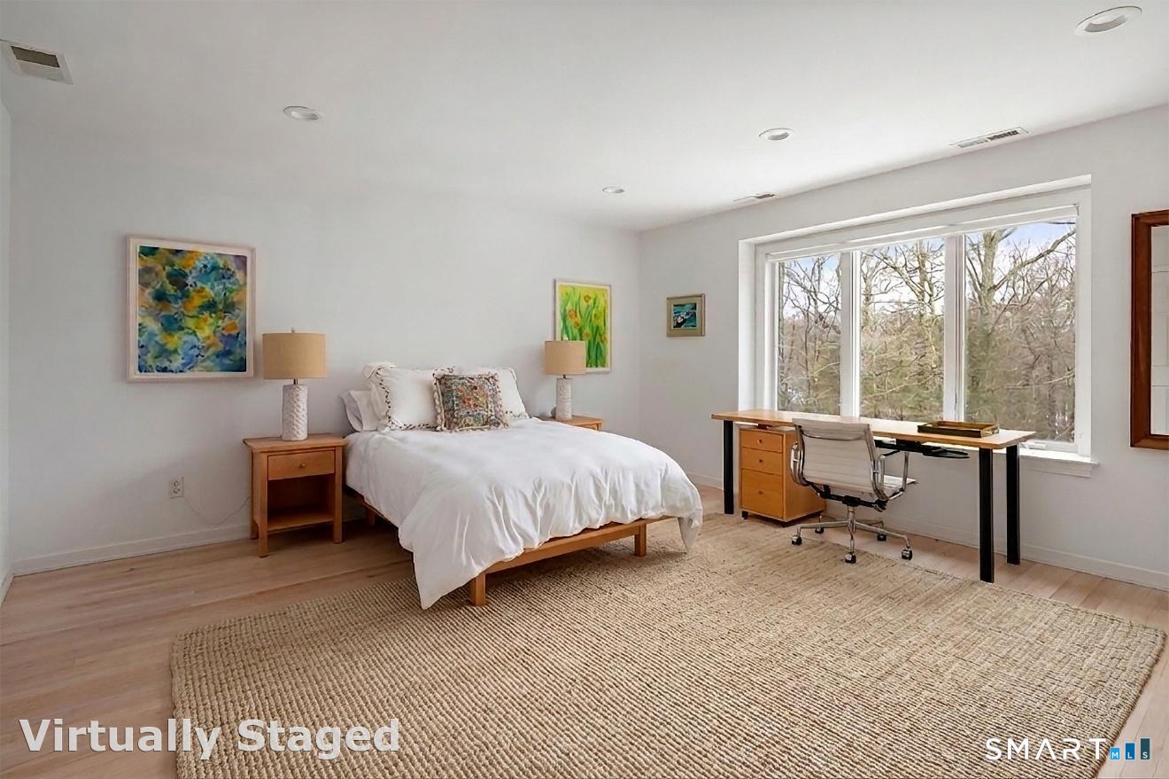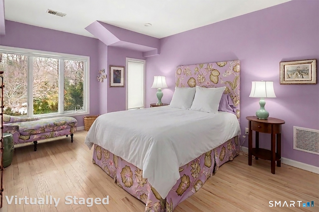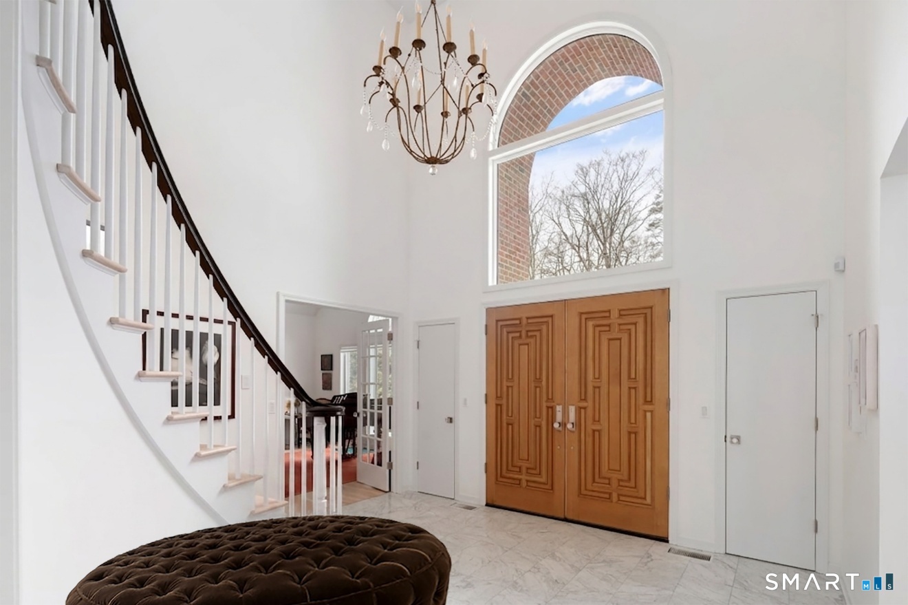 Lakefront living! This elegant home features 450" ft of private, pristine lakefront in a coveted area of North Stamford CT! 1 hour from NYC by train, minutes from the vibrant city life of Stamford CT, this custom built, sunlit home has been exquisitely re-imagined in a sophisticated, modern style. The grand entrance opens to a foyer with marble floors, winding staircase, and panoramic lake views! Open floor plan with gallery walls are replete with vibrant paintings and sophisticated photographs. Arching oversized windows draw the eye to the lake front, saturating the interior with natural light. Main level includes a music room/study with a wood burning fireplace, elegant dining room, an oversized 2 story living room with a Onyx surround fireplace, updated kitchen with chef's appliances, primary bedroom with a custom marble mosaic fireplace, private balcony, 2 walk-in closets and a luxurious ensuite bath. Deck with steel cord-Ipe wood railings provides indoor-outdoor entertaining space. The 2nd floor has 3 ensuite bedrooms, (2 currently used for art studios) plus a generous recreation room/office/playroom. Walk-out lower level has a potential in-law/office suite with a separate entrance and kitchenette, a gym area, temperature controlled wine closet, and multiple closets/storage areas. Full house generator. Radon system. Bosch, Wolf, Subzero appliances. Approx 4200 sq ft on main and upper levels-another 3000 sq ft in lower walkout level.
