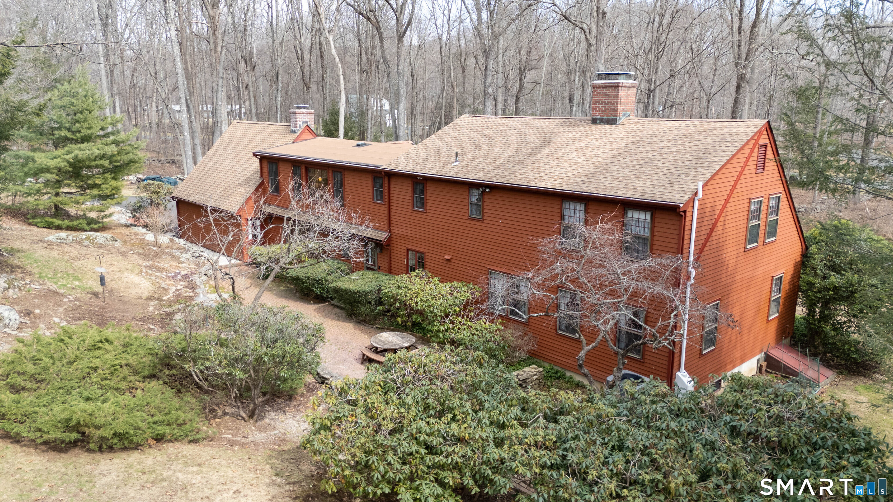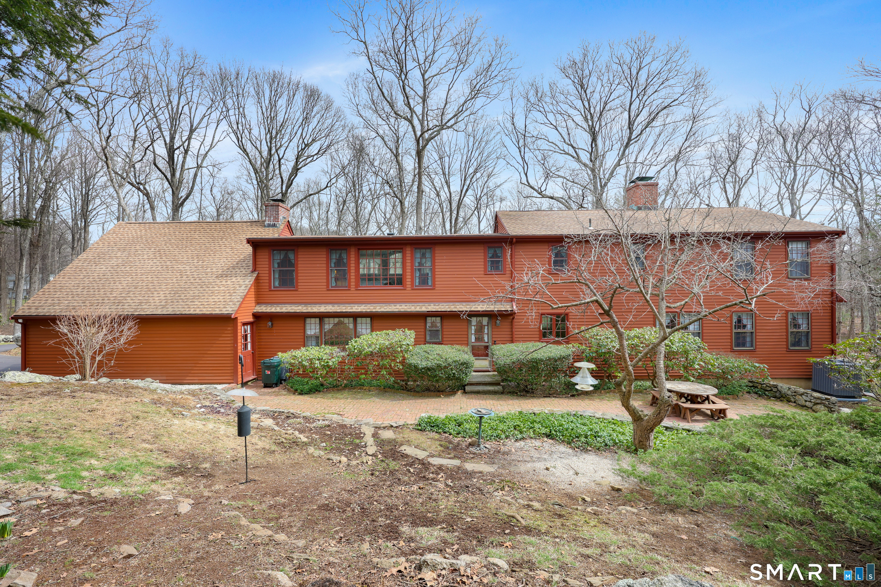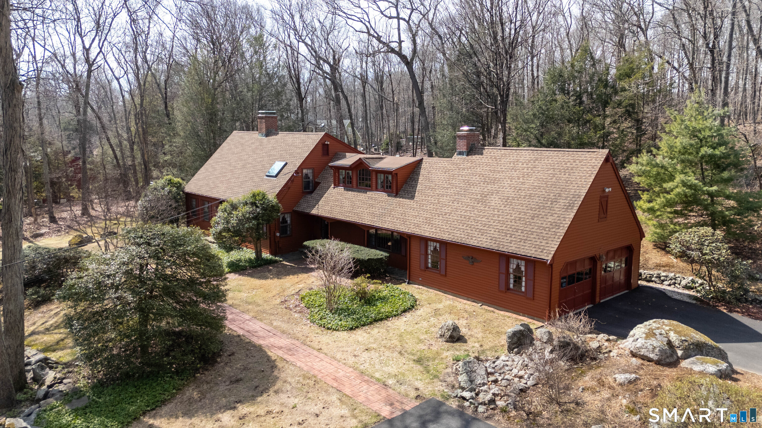 Set back along a scenic road, this timeless Cape offers plenty of charm, a well-designed layout, and thoughtful updates throughout. Walk up the brick path to either the side door w/covered porch or front door w/stone steps. Upon entering, the foyer welcomes you w/gleaming hardwood floors & an exposed brick wall, flanked by a spacious living room and an intimate dining room w/french doors. The front-to-back living room is filled with natural light, features a wood-burning fireplace, and offers views of the tranquil landscape from three sides. The kitchen captures serene rear views, features a cozy dining area enhanced by a unique open-hearth fireplace, granite counters & center island. Enjoy the spacious den w/custom cabinetry w/wet bar & stone fireplace w/wood stove. Full bath/laundry complete the main floor. The second floor features a primary MBR, w/an abundance of natural light, en-suite granite double sinks, jacuzzi & separate glass shower. Beyond the walk-in closet there is generous storage space offering potential for expansion. There are two add'l bedrooms, a full marble/tile bath, & an office/flex space w/skylight & walk-in closet. The lower level offers oodles of storage space. Enjoy your cup of coffee on the front covered porch w/access to the oversized garage. The scenic views continue into the backyard, featuring a well-designed brick patio w/stone wall set among landscaped grounds. Convenient location to shopping, Merritt and all of Easton's amenities!