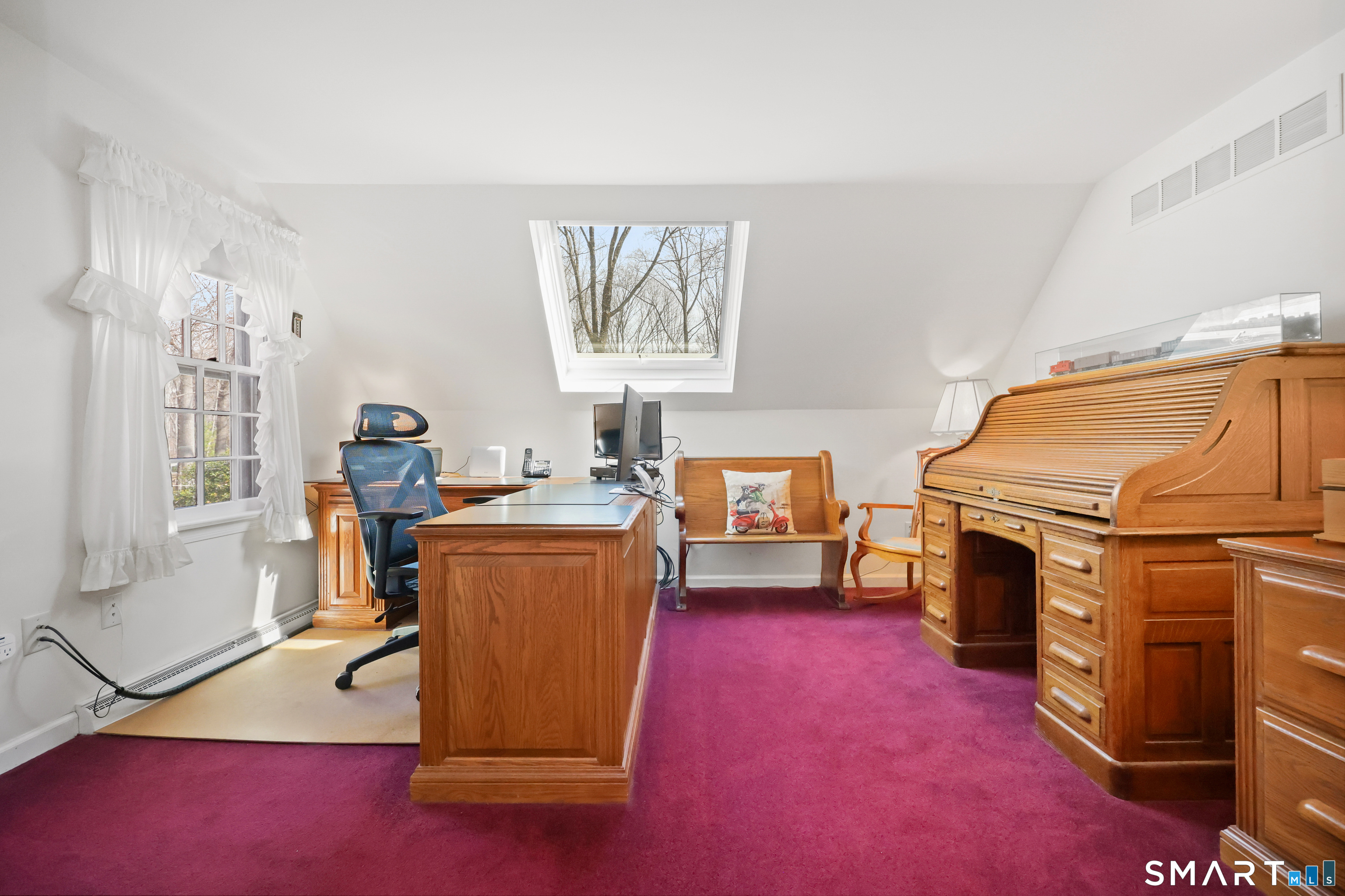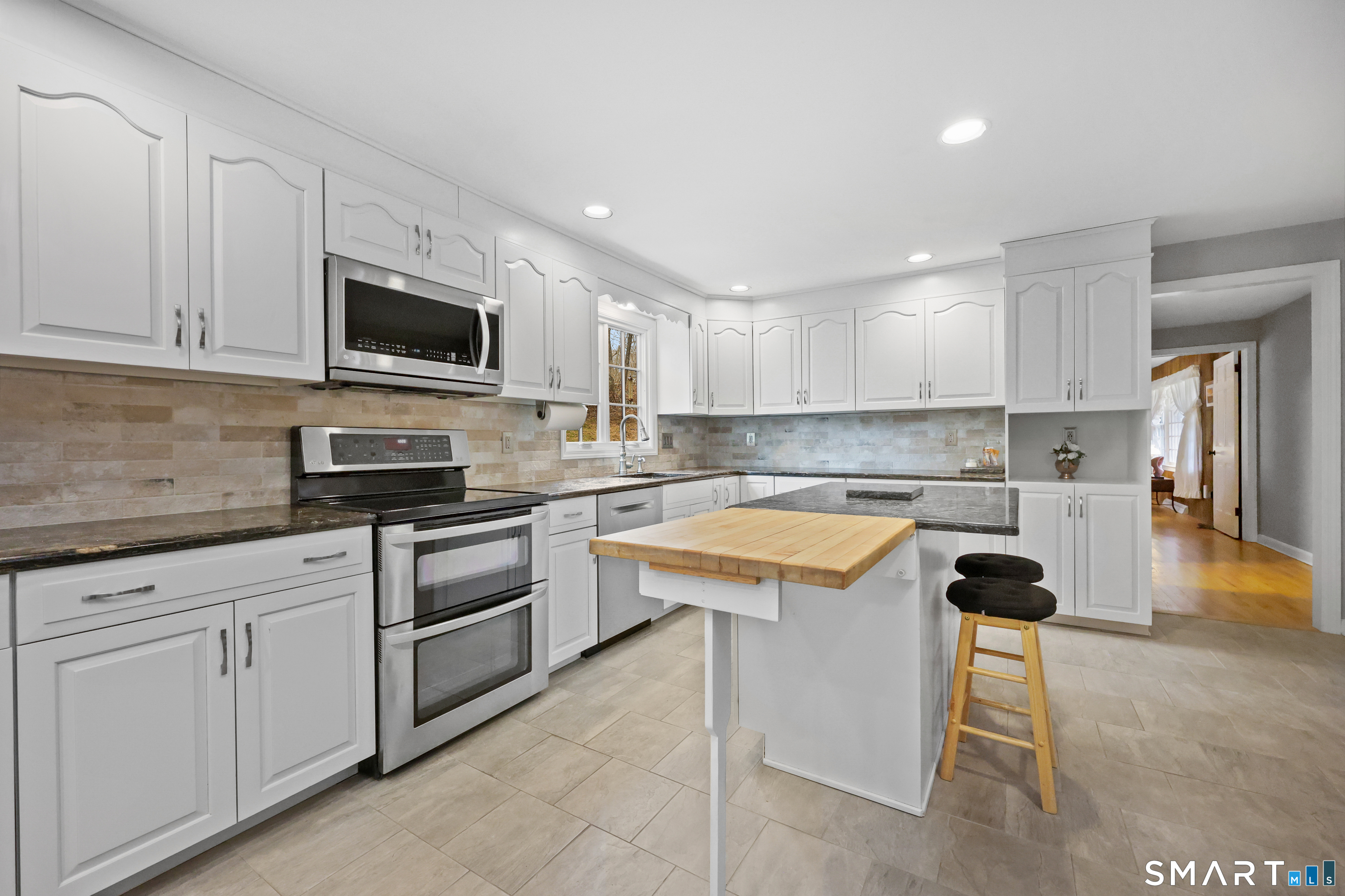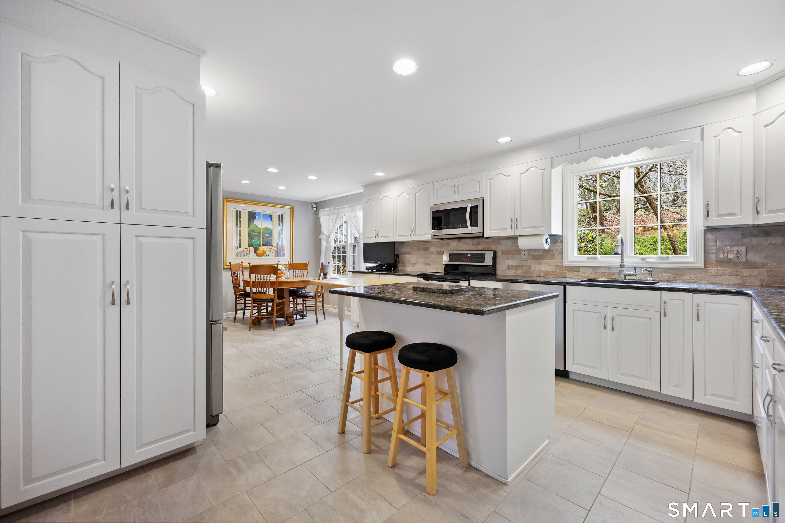 Set back along a scenic road, this timeless Cape offers plenty of charm, a well-designed layout, and thoughtful updates throughout. Walk up the brick path to either the side door w/covered porch or front door w/stone steps. Upon entering, the foyer welcomes you w/gleaming hardwood floors & an exposed brick wall, flanked by a spacious living room and an intimate dining room w/french doors. The front-to-back living room is filled with natural light, features a wood-burning fireplace, and offers views of the tranquil landscape from three sides. The kitchen captures serene rear views, features a cozy dining area enhanced by a unique open-hearth fireplace, granite counters & center island. Enjoy the spacious den w/custom cabinetry w/wet bar & stone fireplace w/wood stove. Full bath/laundry complete the main floor. The second floor features a primary MBR, w/an abundance of natural light, en-suite granite double sinks, jacuzzi & separate glass shower. Beyond the walk-in closet there is generous storage space offering potential for expansion. There are two add'l bedrooms, a full marble/tile bath, & an office/flex space w/skylight & walk-in closet. The lower level offers oodles of storage space. Enjoy your cup of coffee on the front covered porch w/access to the oversized garage. The scenic views continue into the backyard, featuring a well-designed brick patio w/stone wall set among landscaped grounds. Convenient location to shopping, Merritt and all of Easton's amenities!