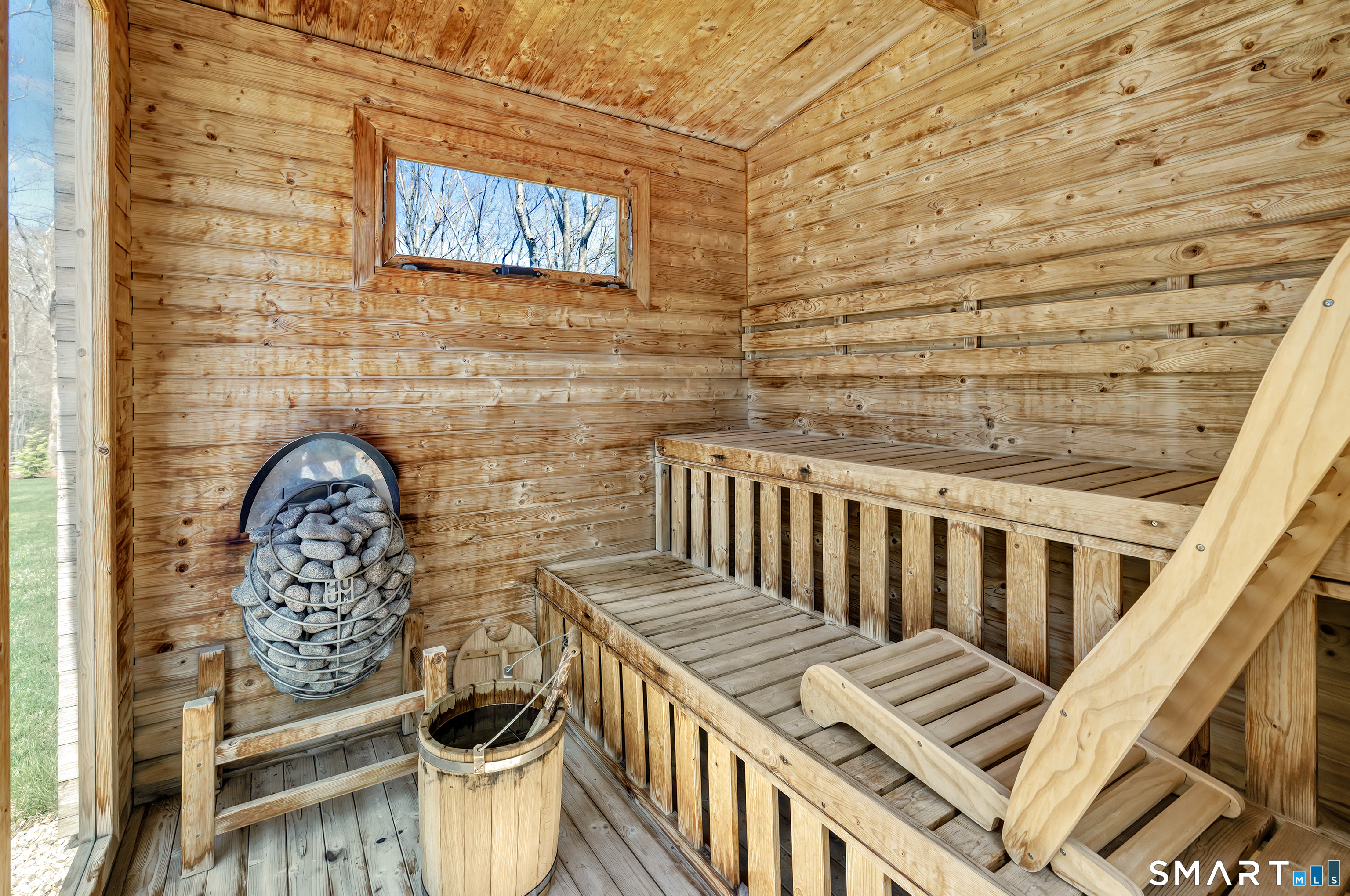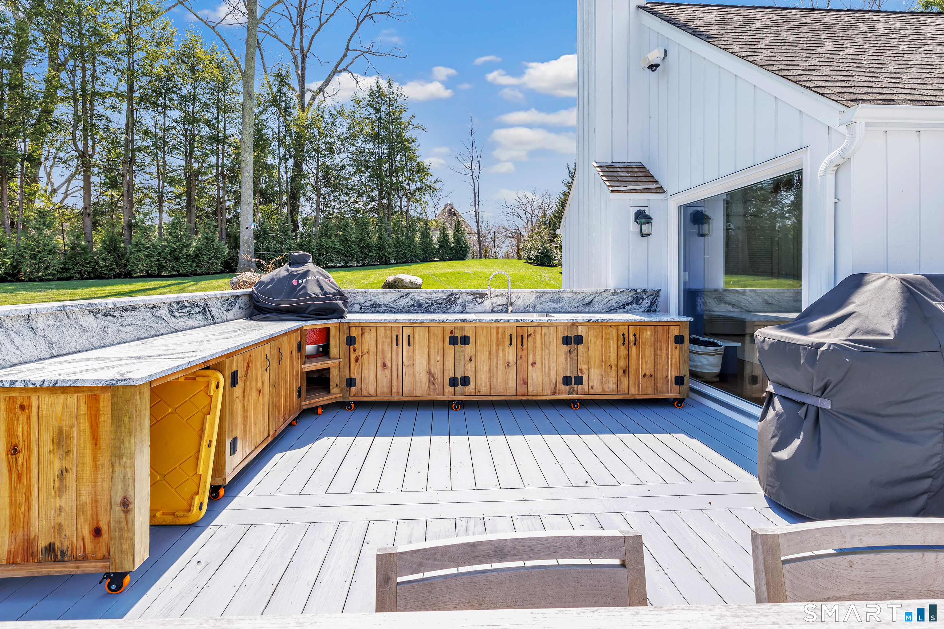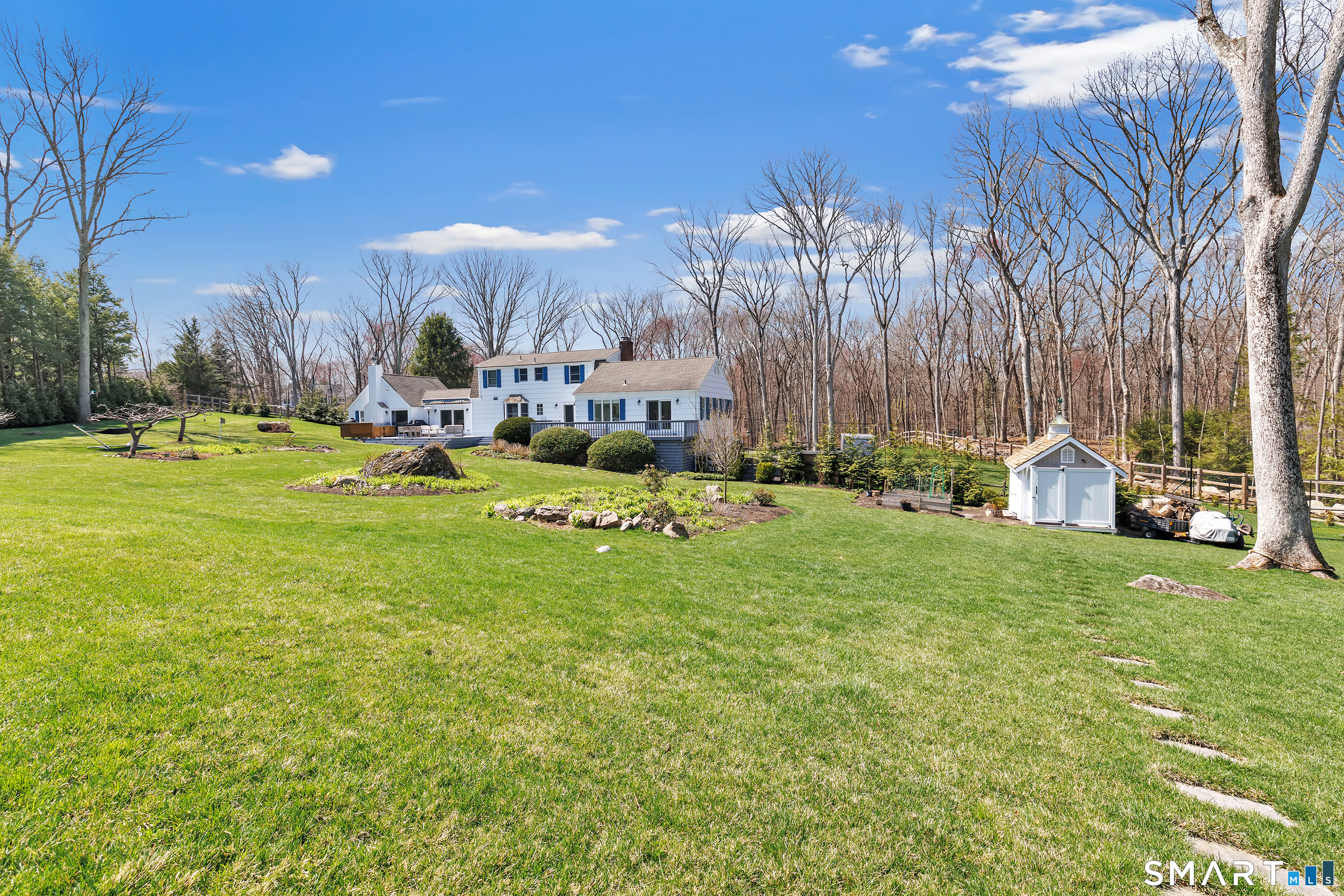 Welcome to this recently updated New England retreat with stone walls, a circular gravel driveway, and manicured grounds. Fenced and setback charming 5-bed and 2 full + 2 half baths colonial with sun-filled galleries and rooms. 2 fireplaces, 2-story cathedral ceilings. The modern open-floor kitchen (2025) opens to the dining room, family room, and a large deck. Luxurious MAIN FLOOR primary bedroom with separate walk-in closets, private deck, and updated bathroom with heated tiles. The upper floor has 4 bedrooms and 1.5 baths. Finished 432 sqft lower-level family room. 2-car large updated garage. Ample parking. 7 Birch Hill is a true summertime paradise with a top-of-the-line saltwater heated in-ground gunite pool built in 2020 with PebbleFina finish in sapphire galaxy color, auto-everything, and wi-fi link for remote control. Evergreen screening for privacy and gorgeous landscaping full of hydrangeas, ornamental grasses, Dogwood, Japanese maple, evergreen, maple, and oak trees, and dappled sunlight throughout. Walk along the footstones to the shed, pool, and private outdoor shower with a changing room to rinse off after laps in the pool. The organic garden was created by Homefront Farm in Redding and improved with irrigation. Many recent upgrades, 2022-2026, used only the best materials and workmanship. Close to Weston town center, stores, restaurants, walk to schools, and minutes away from train, highways, downtown Westport, and beautiful beaches.