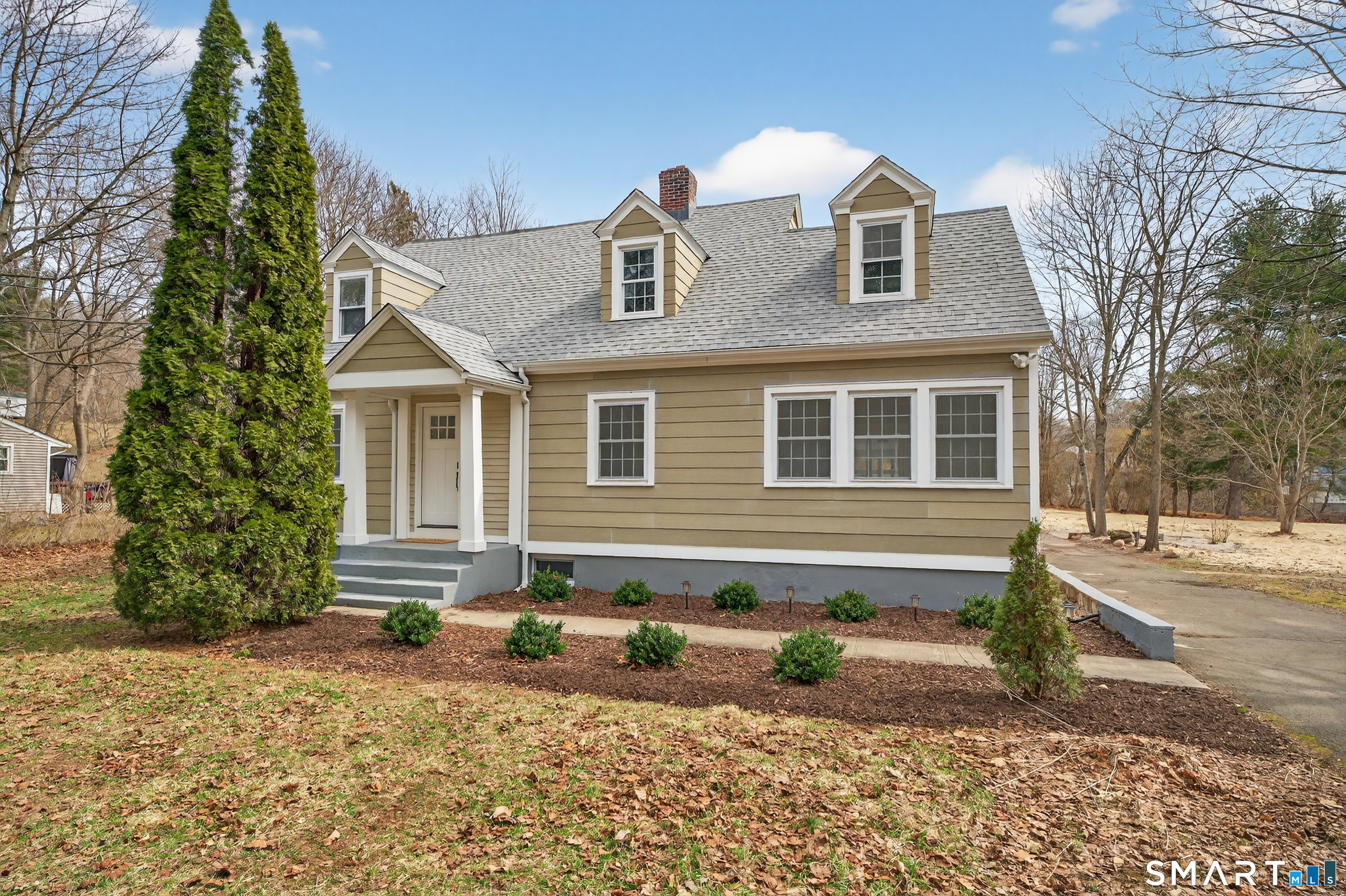 645 Paradise Ave is a fully renovated cape on just under an acre in Hamden. The kind of renovation where the work is in the walls, not just on the surfaces, new electrical, new plumbing, new insulation, two-zone hydro-air with central AC throughout. The main level has good bones and better finishes. Dark hardwood floors, a brick fireplace in the living room, a kitchen with white shaker cabinets and soft close hinges, quartz counters, and a pass-through opening to the breakfast room. A sunroom with french doors and vaulted ceilings. The half bath is complete with a floating sink and pocket door. An office space or reading area flows seamlessly off of the living room. Primary bedroom is on the main floor with a private bath, walk-in closet with a sliding barn door, and an exposed ceiling beam that gives the room character. Upstairs there are four more bedrooms with hardwood floors, a full bath, and a flex room that functions as a sixth bedroom, home office, nursery or designed to fit your personal needs. Nearly an acre of land, a detached two car garage, a checkerboard patio, located in the Bear Path School district and views of the Sleeping Giant ridge line from the yard that the listing photos don't do justice. Don't miss your chance to make this home yours!
