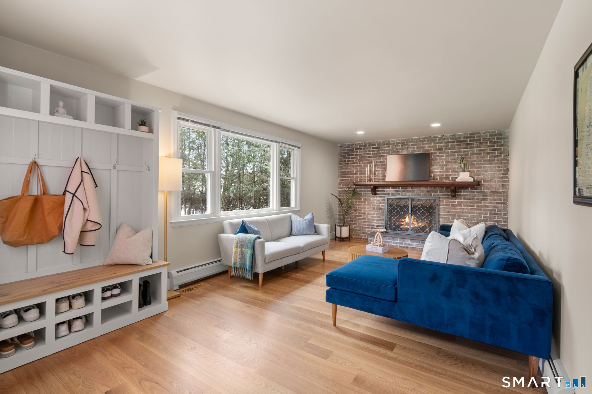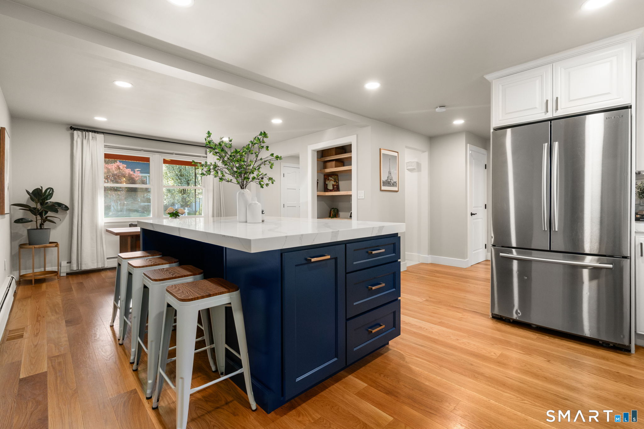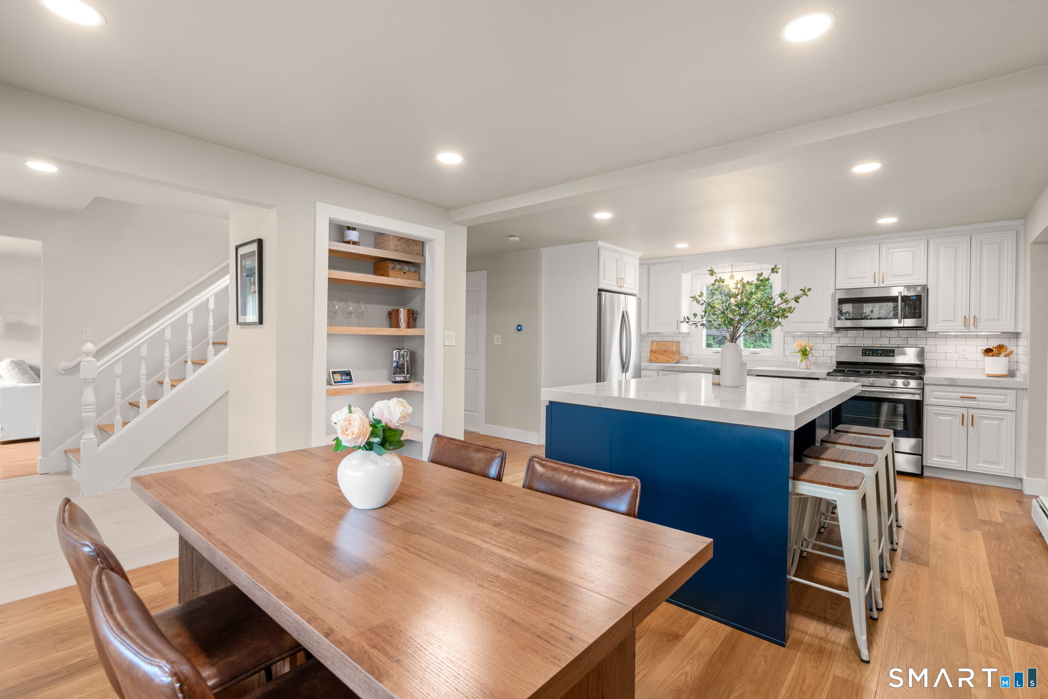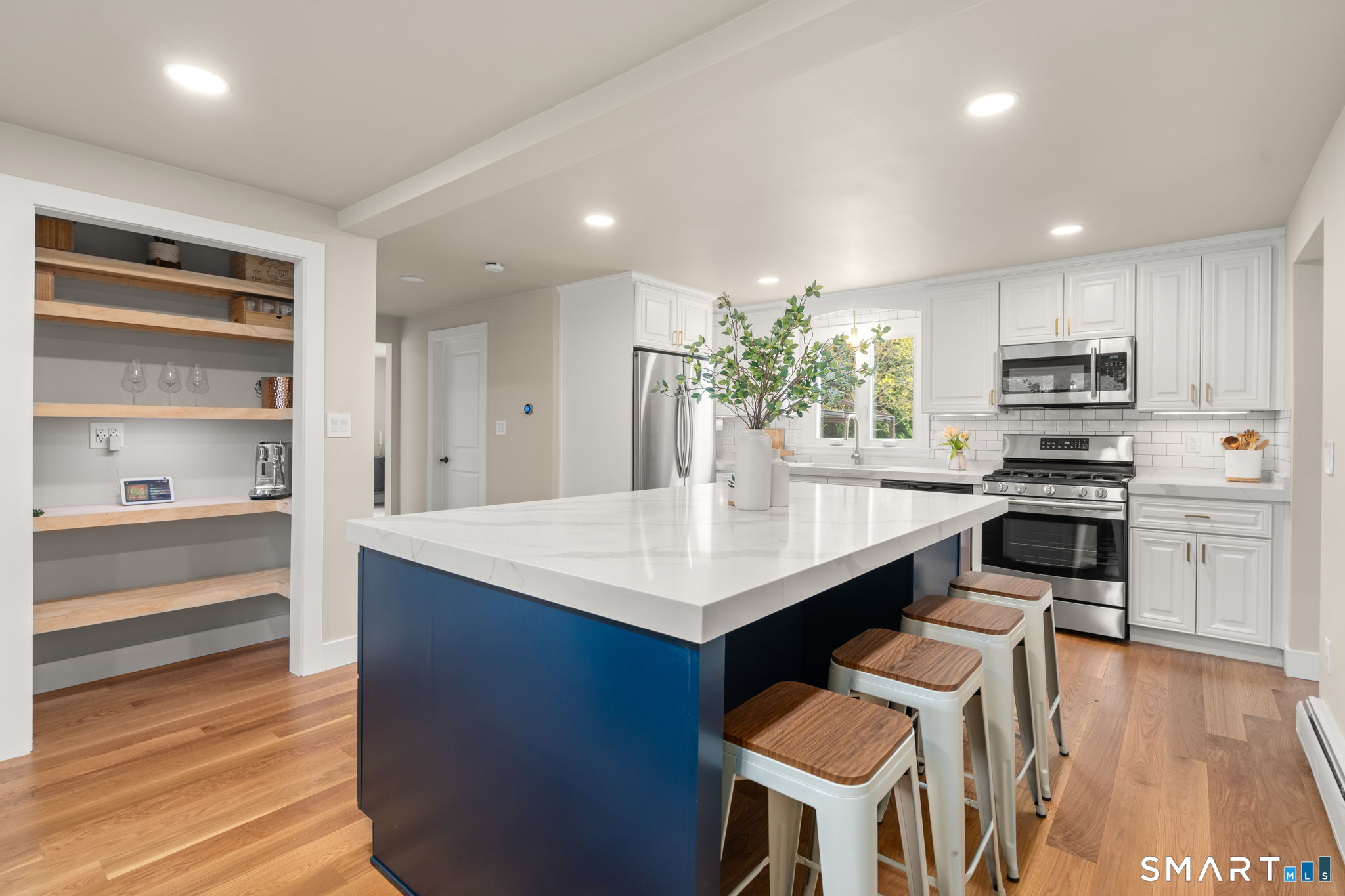 Tremendously updated for the most discerning buyer, this 3-bedroom, 2.5-bath Colonial offers 1,979 sq ft of living space on a private lot in the highly desirable Paterson School District. The home blends classic charm with extensive recent improvements, including new white oak hardwood flooring (2025), fresh interior paint, recessed lighting, new interior doors, trim, and baseboards, plus newer carpet and updated foyer tile. The beautifully remodeled kitchen features stainless steel appliances, quartz countertops, an expansive center island, and a pantry area with an organic design featuring open shelving and convenient appliance plug-ins, flowing seamlessly into the dining area for easy everyday living and entertaining. The main level includes a spacious front-to-rear formal living room and a welcoming family room with a wood-burning fireplace, custom wood mantel, and bluestone hearth. A laundry room and brand-new powder room complete the first floor. Upstairs, the generous primary suite offers a remodeled full bath and double closets, along with two additional well-sized bedrooms and a second full bath. Updated bathroom finishes include tile, fixtures, tub, and ventilation. Additional upgrades include roof (2012), tankless gas hot water heater, new water heater (2022), new garage doors, new driveway (2017), re-insulated attic and lower level, gas heat, central air, and new A/C unit and condenser (2025).