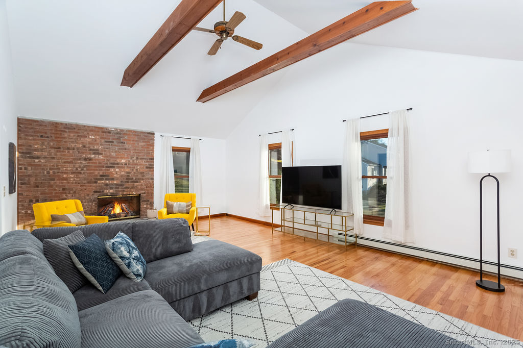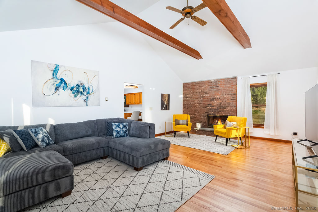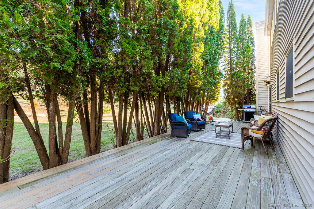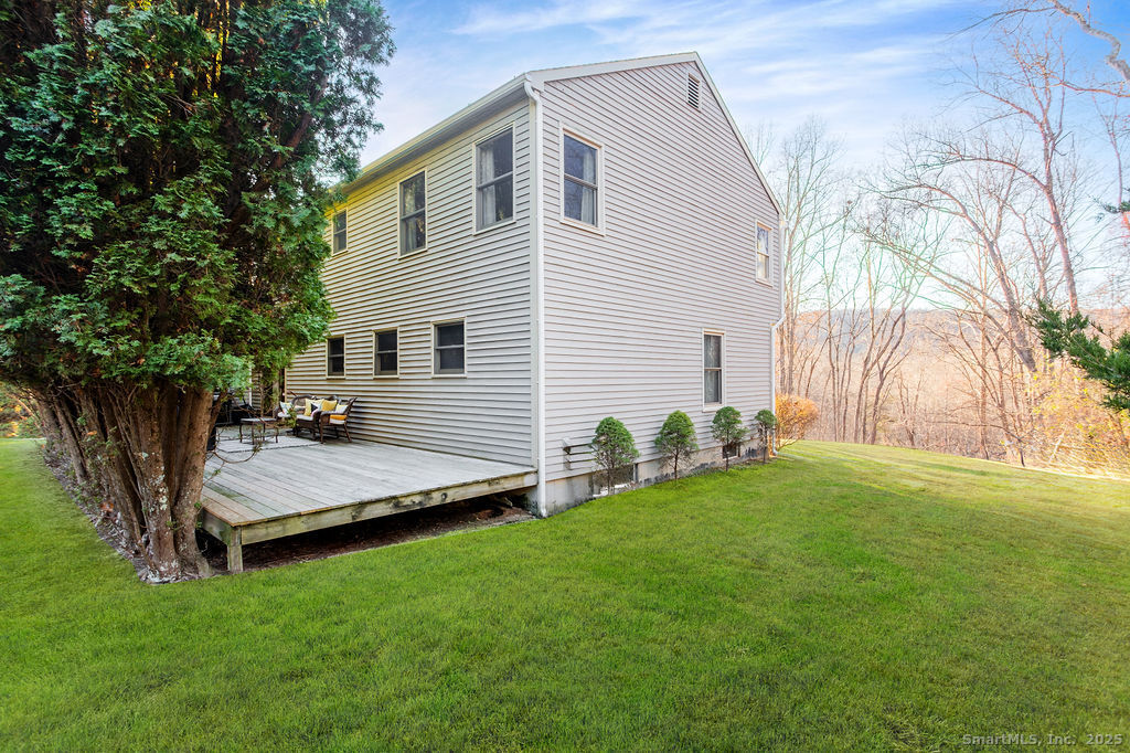 This well-maintained center hall colonial sits on a serene acre at the end of a peaceful cul-de-sac. Thoughtfully designed with a welcoming layout, it offers an ideal blend of comfort and functionality for today's lifestyle. The spacious Family Room features cathedral ceilings and a cozy fireplace, creating an airy, open setting perfect for gatherings or quiet evenings. The generously sized Eat-in Kitchen includes classic oak cabinetry, brand-new quartz countertops, a new microwave, and French doors leading to a large, private deck- an excellent space for outdoor dining and entertaining. A conveniently located laundry room sits just off the kitchen, and the main level also includes a formal dining room opposite the formal living room, along with a powder room for added convenience. Upstairs are four generous bedrooms, including a spacious primary suite complete with a full bath and walk-in closet. Beautifully refinished hardwood floors run throughout the home, adding warmth and charm. The full, unfinished basement offers abundant storage and limitless potential for future expansion. The entire interior has been freshly painted, with all-new lighting, ceiling fans, toilets, and updated mirrors and hardware in the bathrooms. This property provides privacy and accessibility, making it a perfect retreat while remaining close to local amenities, schools, and major roadways.