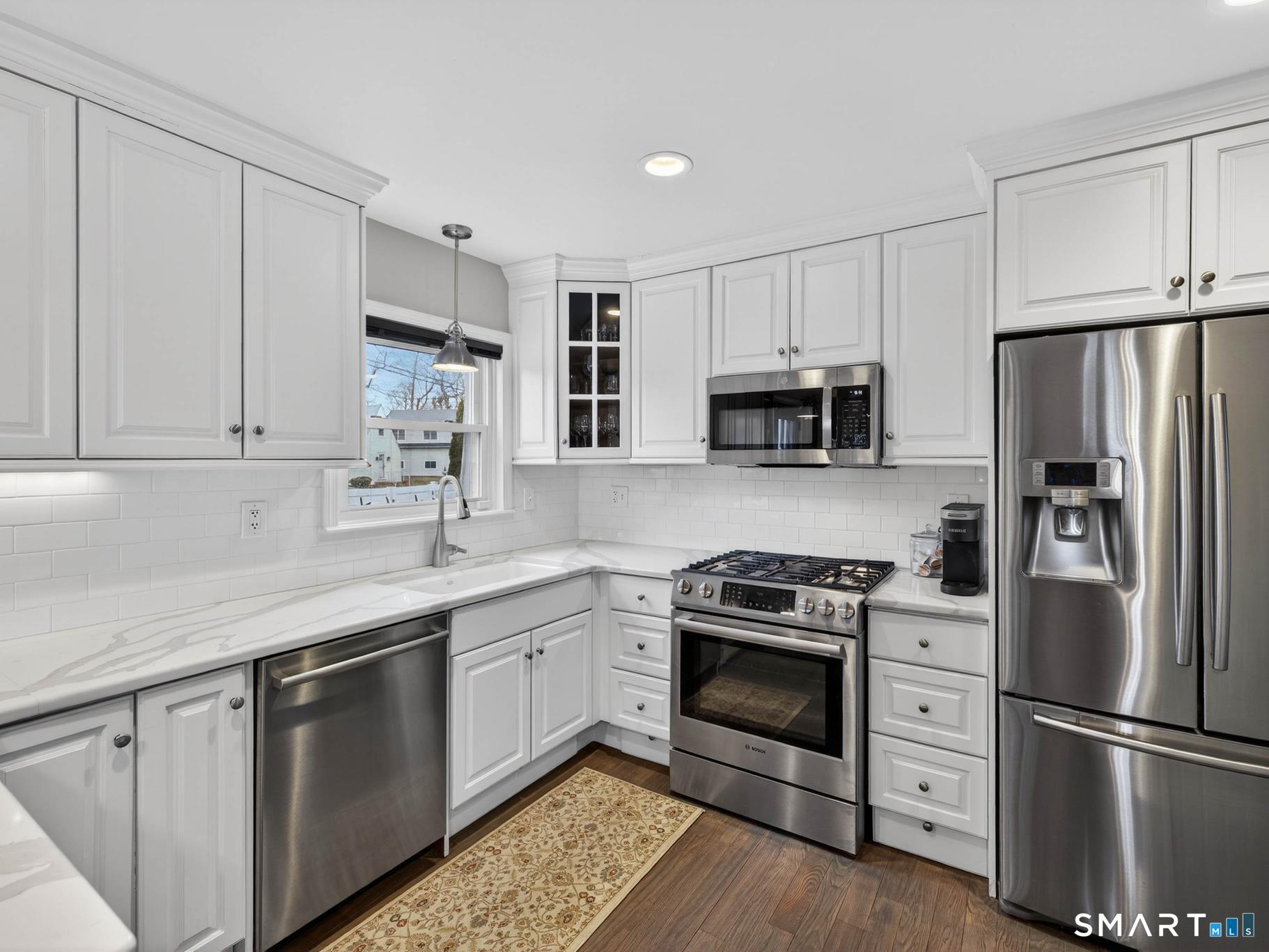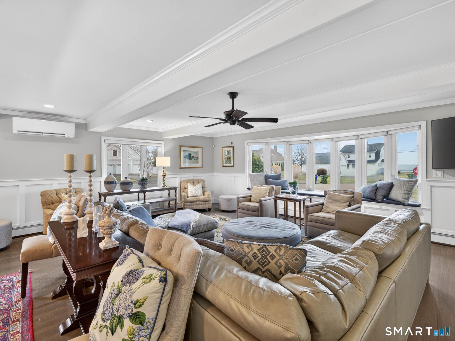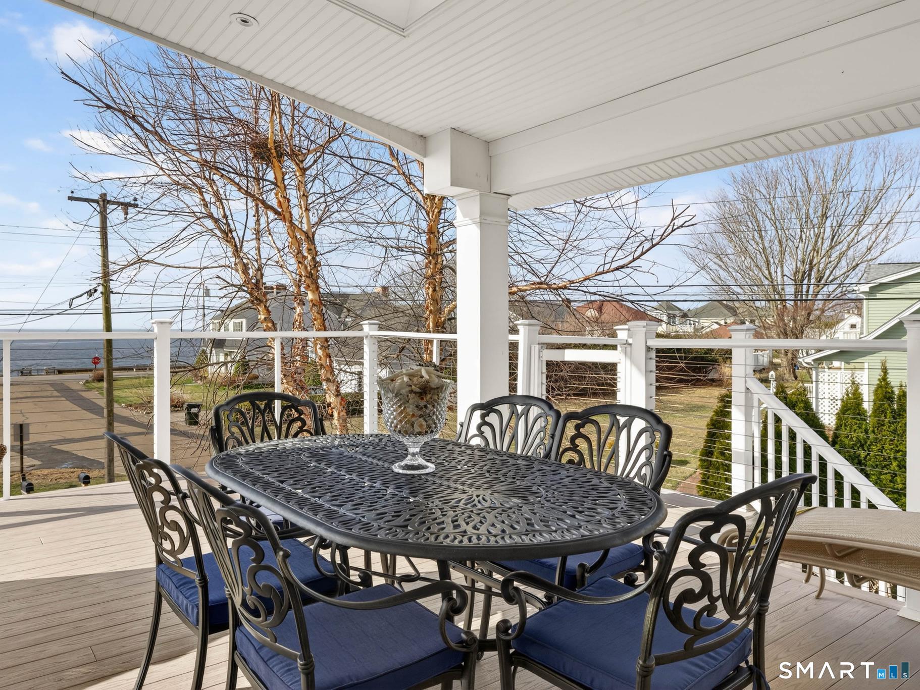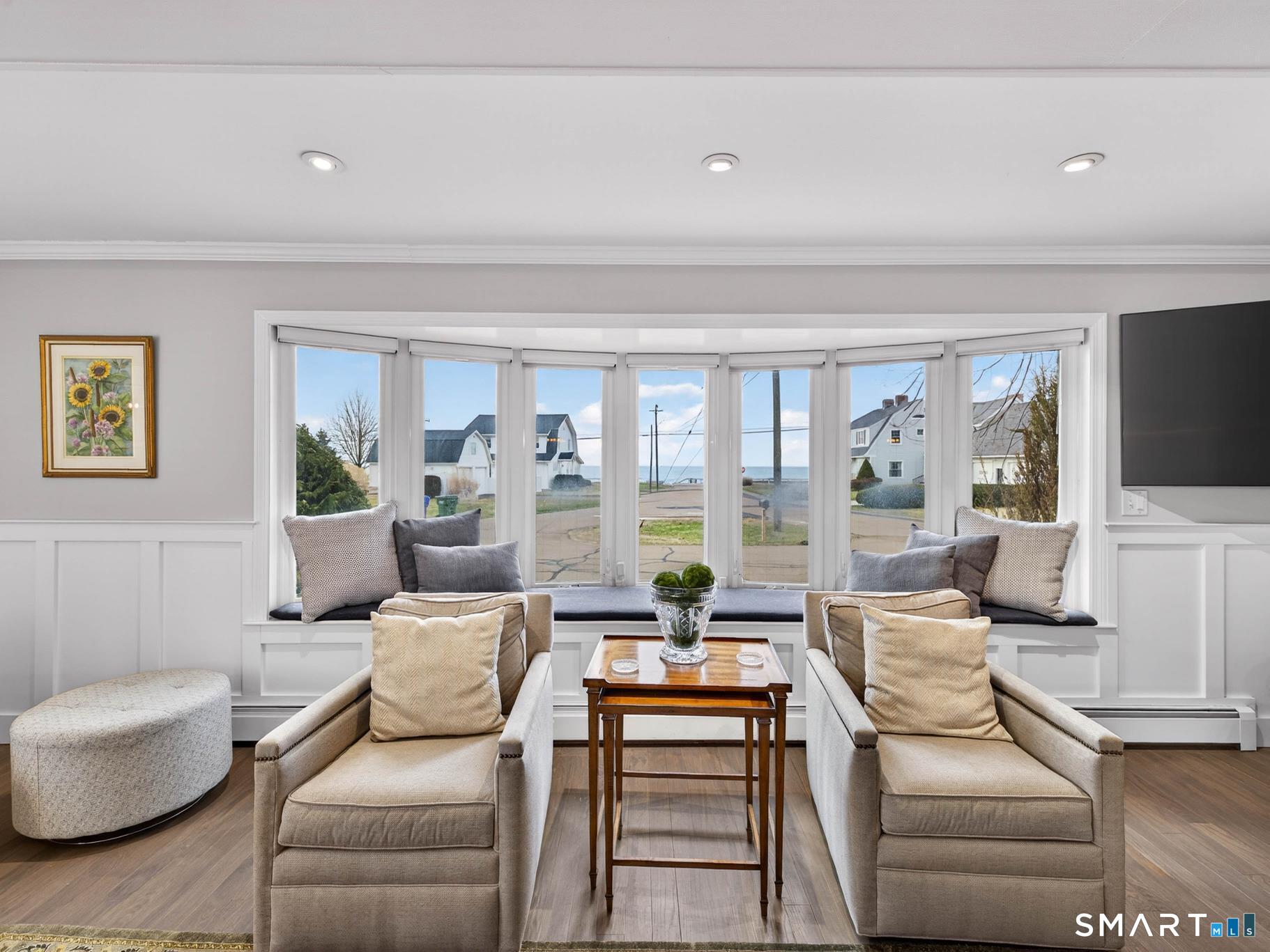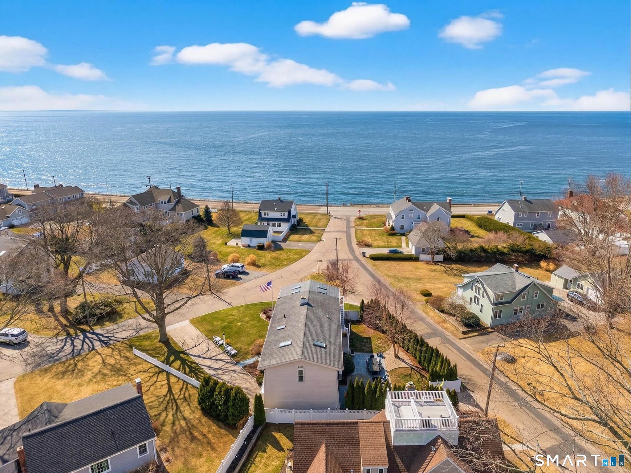 Rare opportunity to enjoy sweeping views of Long Island Sound from a quiet street just off Maple Avenue in sought-after Knollwood Beach. This beautifully renovated 3-bedroom, 3-bath coastal retreat, just one street from the water, offers unobstructed views and is ideal as a year-round home or second getaway. The bright, open floor plan is designed to capture the scenery, with an oversized living/dining area featuring hardwood floors, a custom stone propane fireplace, and a wall of south-facing windows. An oversized one-car garage, mudroom, and laundry area welcome you inside. The custom white kitchen features quartzite countertops, porcelain farm sink, stainless appliances, and a Bosch propane range-perfect for entertaining. The first floor also offers an updated full bath and flexible bedroom or office. Upstairs, the primary suite boasts cathedral ceilings, a custom bath with dual sinks, tiled shower, and generous closets. A third bedroom, remodeled full bath, and family room with French doors lead to a covered deck with panoramic water views. The partially finished lower level provides additional living space and storage. Features include dual street access, ample parking, whole-house generator, alarm system with cameras, fenced yard with mature landscaping, and new Mitsubishi split HVAC (2024). Meticulously maintained and not in a flood zone-an exceptional shoreline opportunity.