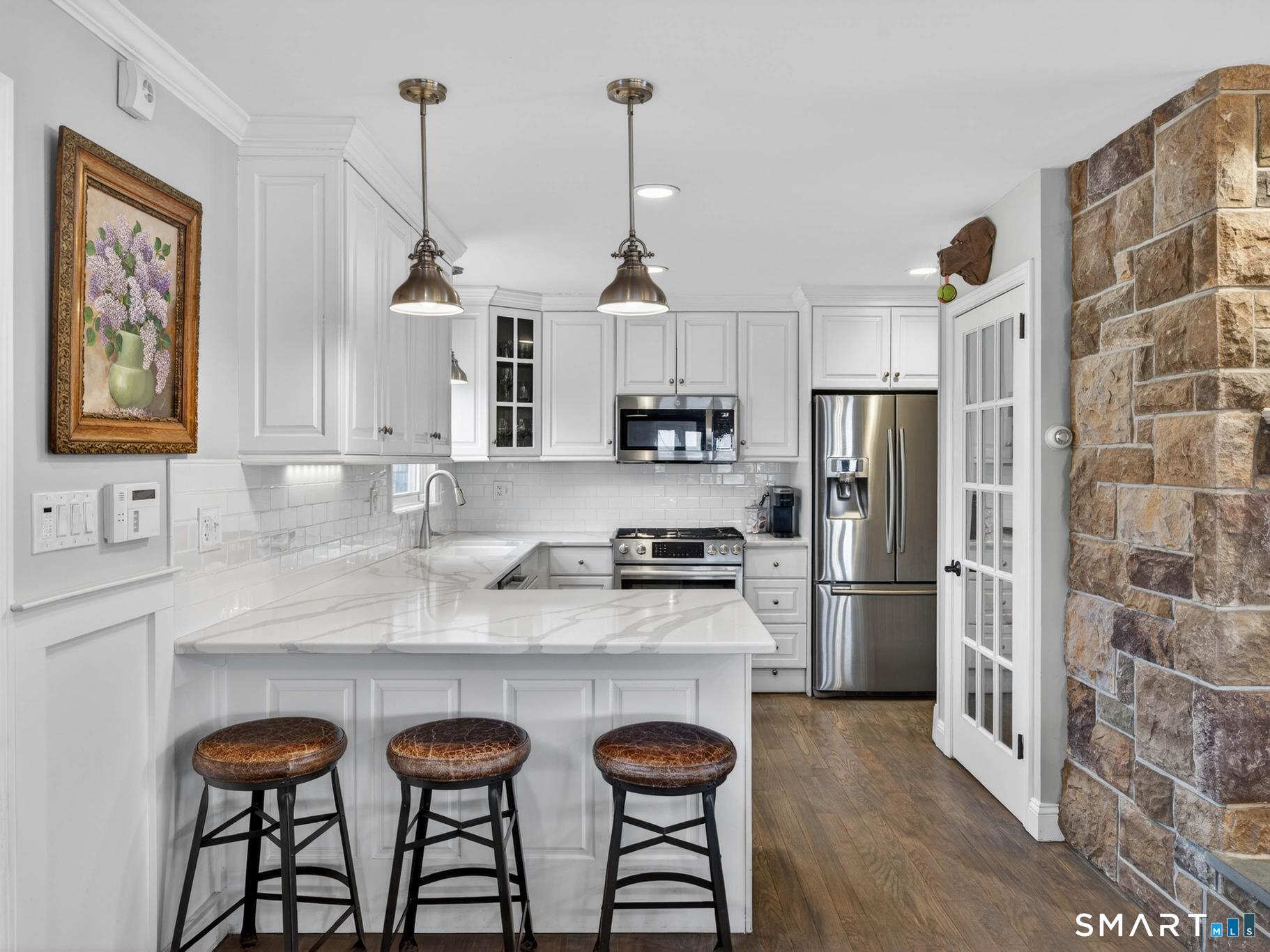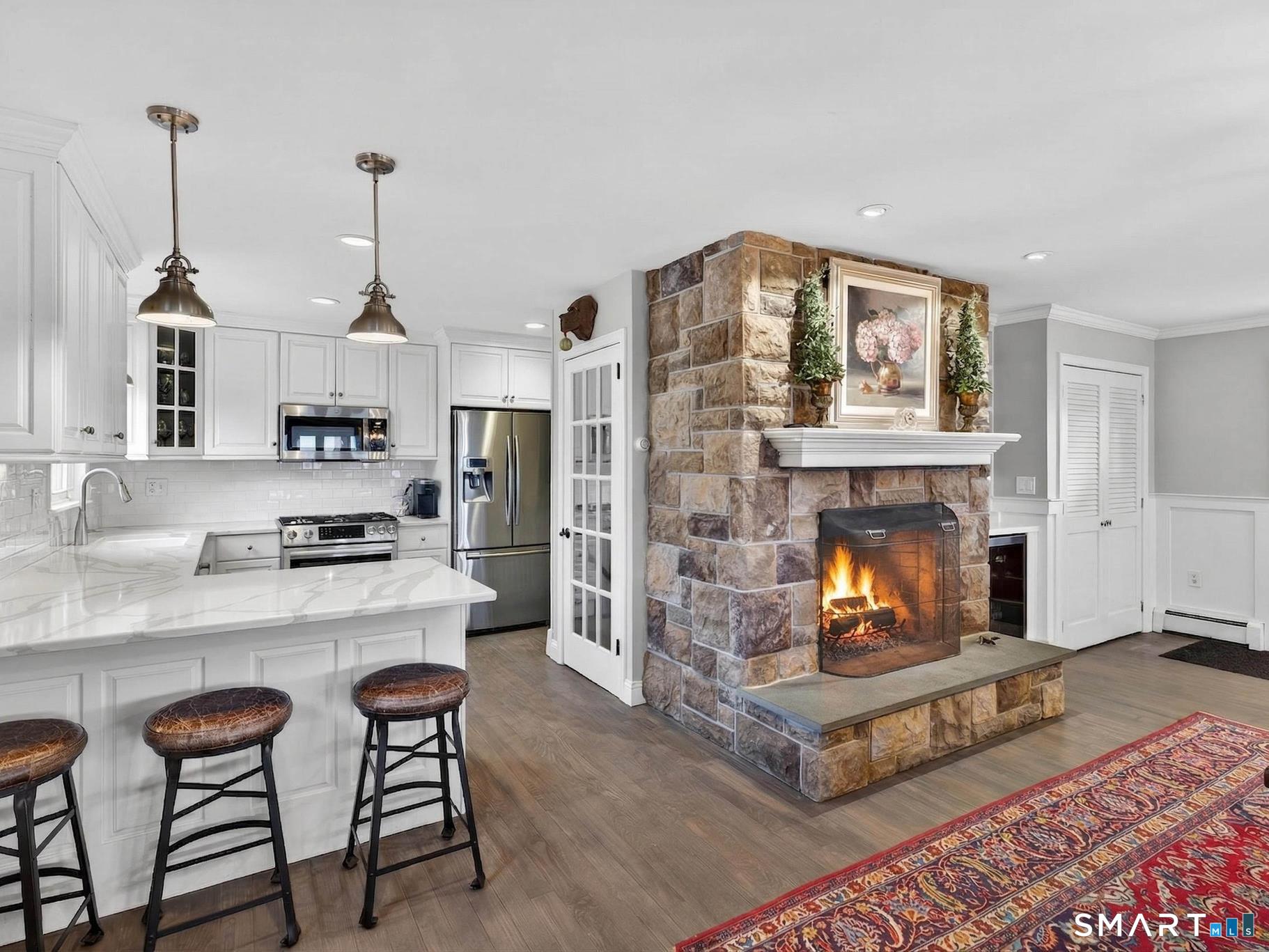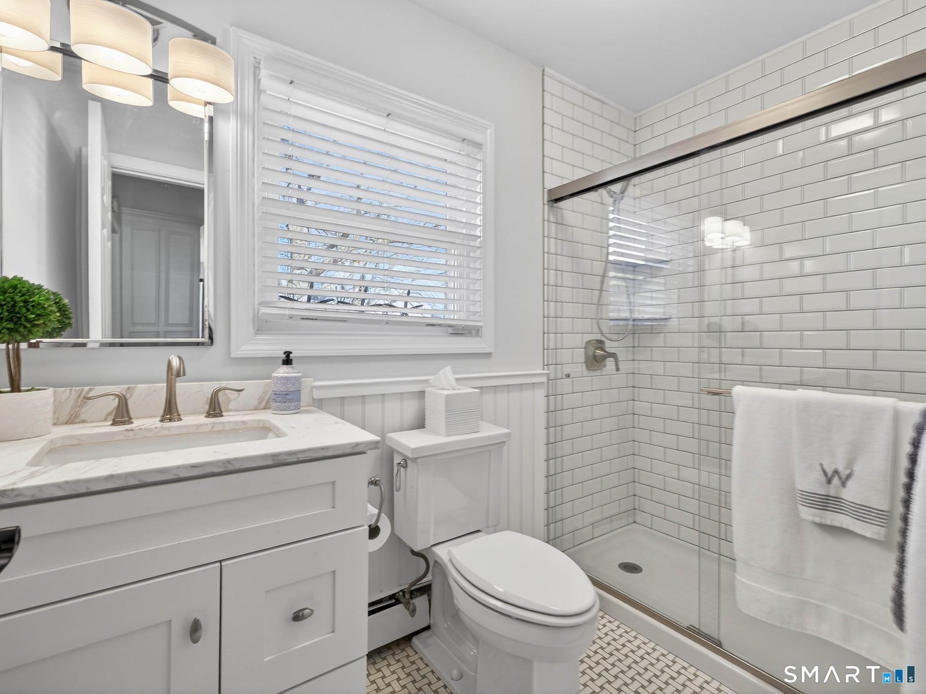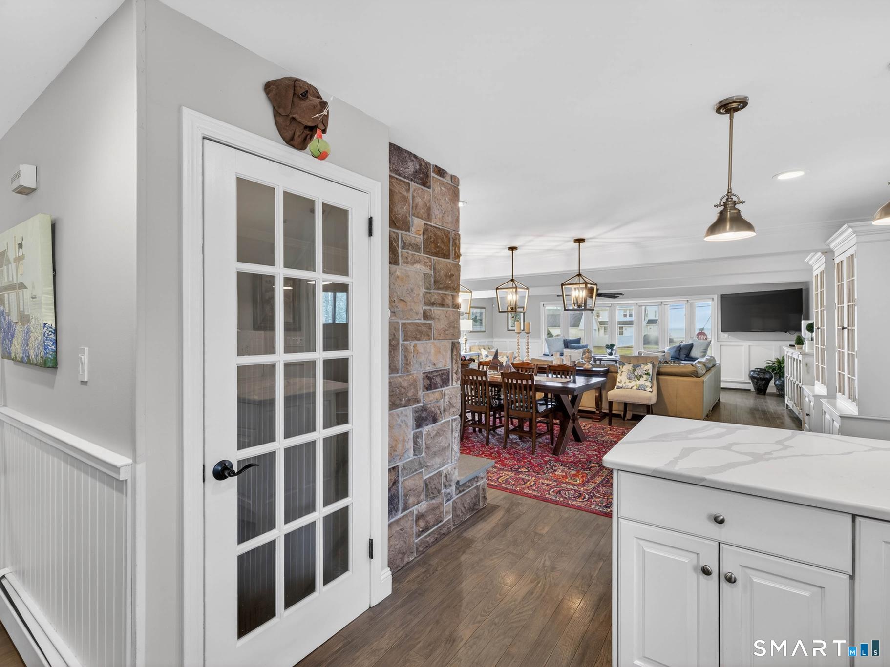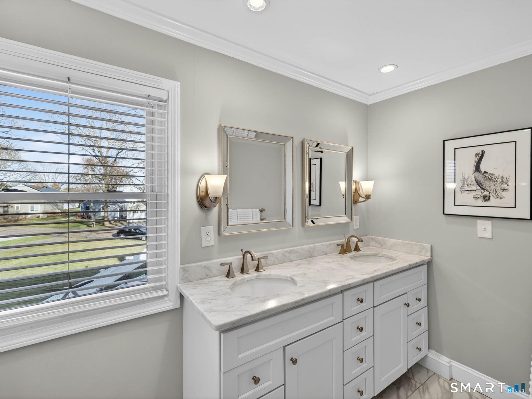 Rare opportunity to enjoy sweeping views of Long Island Sound from a quiet street just off Maple Avenue in sought-after Knollwood Beach. This beautifully renovated 3-bedroom, 3-bath coastal retreat, just one street from the water, offers unobstructed views and is ideal as a year-round home or second getaway. The bright, open floor plan is designed to capture the scenery, with an oversized living/dining area featuring hardwood floors, a custom stone propane fireplace, and a wall of south-facing windows. An oversized one-car garage, mudroom, and laundry area welcome you inside. The custom white kitchen features quartzite countertops, porcelain farm sink, stainless appliances, and a Bosch propane range-perfect for entertaining. The first floor also offers an updated full bath and flexible bedroom or office. Upstairs, the primary suite boasts cathedral ceilings, a custom bath with dual sinks, tiled shower, and generous closets. A third bedroom, remodeled full bath, and family room with French doors lead to a covered deck with panoramic water views. The partially finished lower level provides additional living space and storage. Features include dual street access, ample parking, whole-house generator, alarm system with cameras, fenced yard with mature landscaping, and new Mitsubishi split HVAC (2024). Meticulously maintained and not in a flood zone-an exceptional shoreline opportunity.