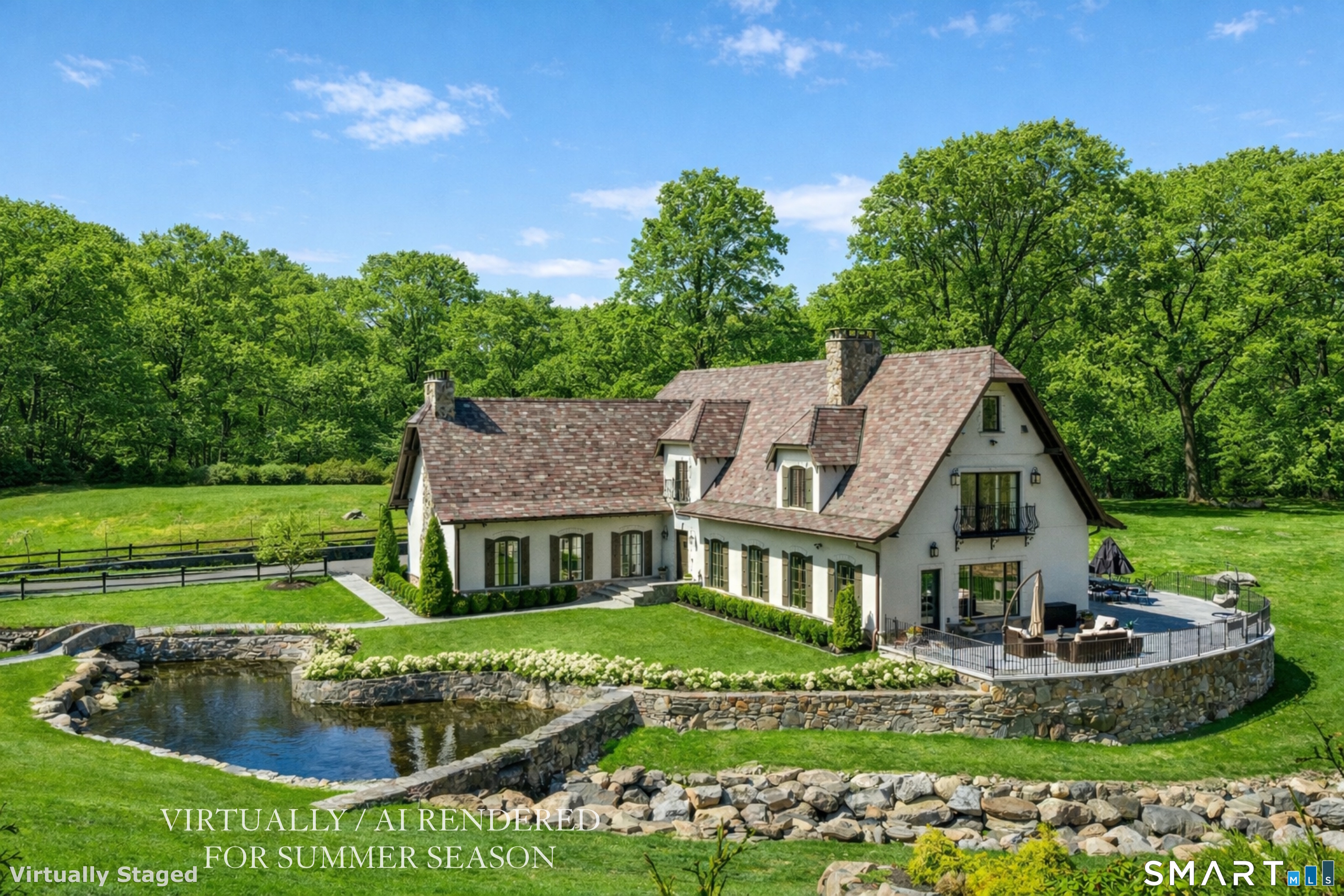 Set behind gates and approached by a striking cherry blossom-lined drive, this fully reimagined storybook countryside estate represents a rare convergence of architectural character and modern, custom-built luxury. Rebuilt to the studs in 2022, the residence showcases uncompromising construction quality, bespoke finishes, and a level of design typically reserved for newly constructed estates without sacrificing the charm and scale of a classic French Normandy. Spanning 4.24 acres, the grounds are nothing short of extraordinary formal gardens, stone walls, a natural brook, and mature plantings create a private, estate-like setting with complete seclusion. The interiors are anchored by a statement gourmet kitchen expansive, refined, and outfitted with top-tier appliances and custom detailing seamlessly flowing into beautifully scaled living and entertaining spaces. The property offers 4 bedrooms and 3.5 baths, along with both attached and detached two-car garages, offering versatility for collectors or creative use. A separate cottage enhances the estate's livability, ideal for guests, staff, or extended stays. A turnkey, design-driven estate for the buyer who demands privacy, presence, and precision in every detail.