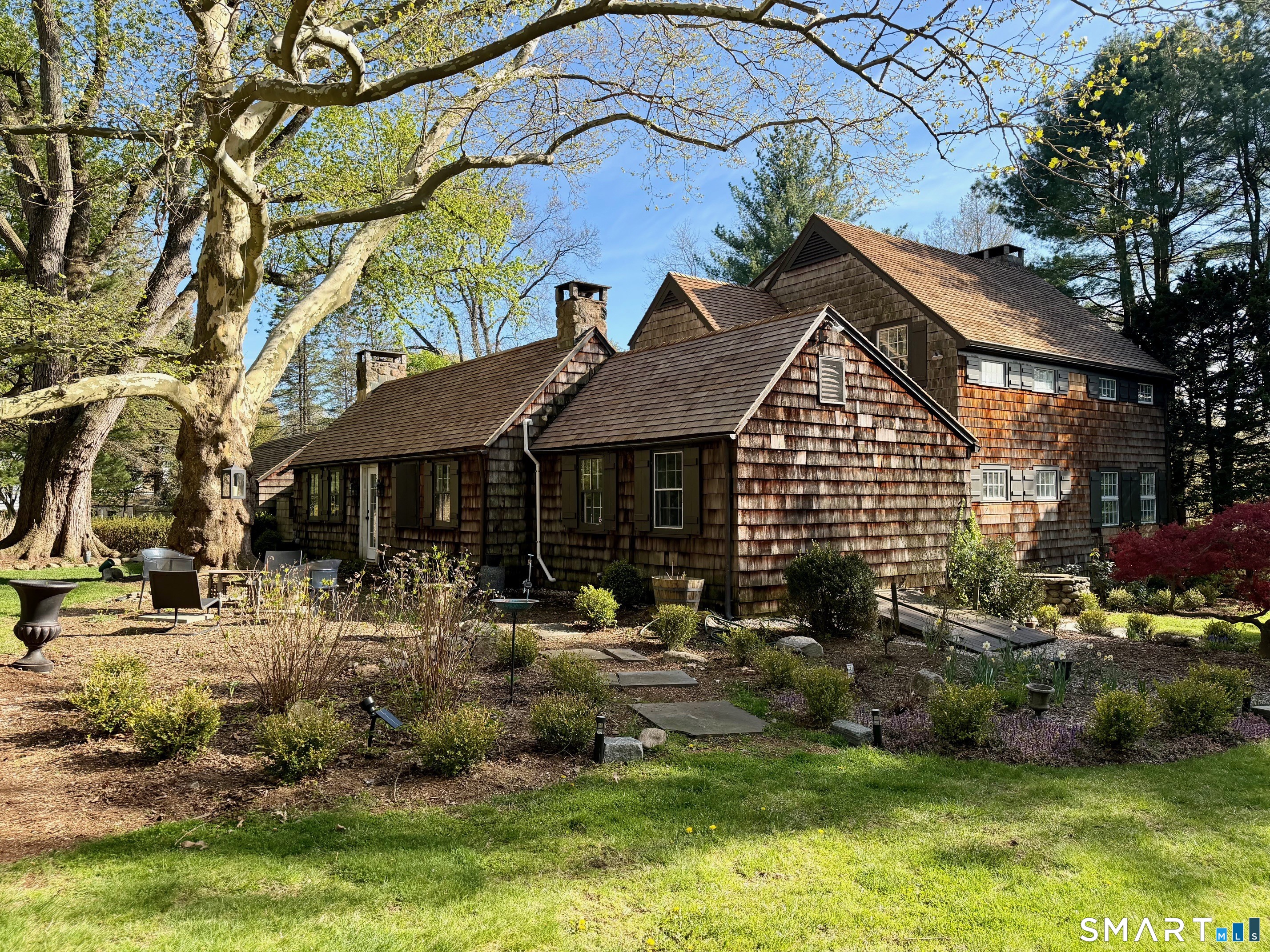 Set on 1.1 acres of beautifully landscaped, award-winning gardens, this exceptional country property blends history, scale, and effortless livability. With over 5,000 square feet, five bedrooms, and six baths, the home offers a rare, highly functional layout, including two-bedroom suites on the main level, ideal for guests, multigenerational living, or a flexible primary option. Originally dating to the late 1800s, the home has been thoughtfully expanded to preserve its character while creating a natural flow between expansive entertaining spaces and private retreats. Wide floorboards, exposed beams, and three fireplaces add warmth and authenticity, while a bright kitchen and family room anchor daily life. A fully equipped butler's pantry elevates hosting with ease. Outdoors, multiple stone patios open to sweeping lawns, mature trees, and vibrant, curated gardens, creating a seamless indoor-outdoor lifestyle. Private, picturesque, and endlessly versatile, this property invites gathering, relaxation, and year-round enjoyment. A compelling opportunity for those seeking charm, space, and a home that truly stands apart.