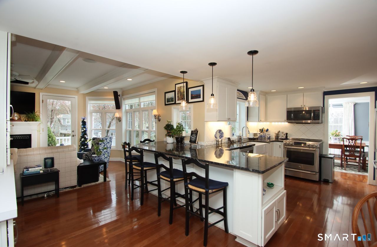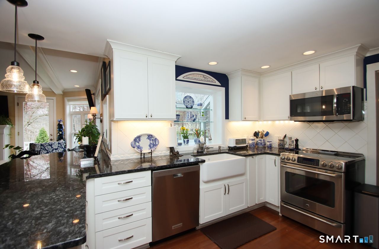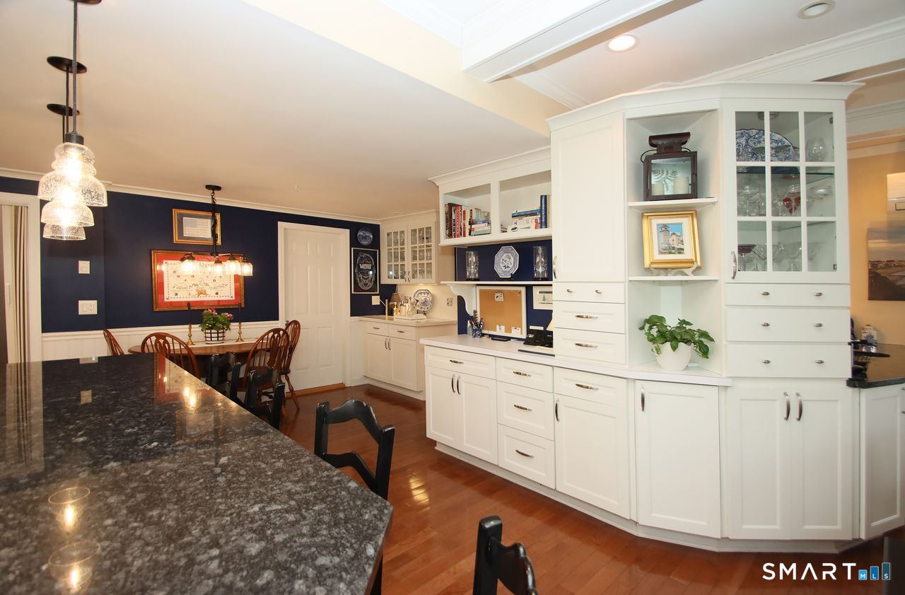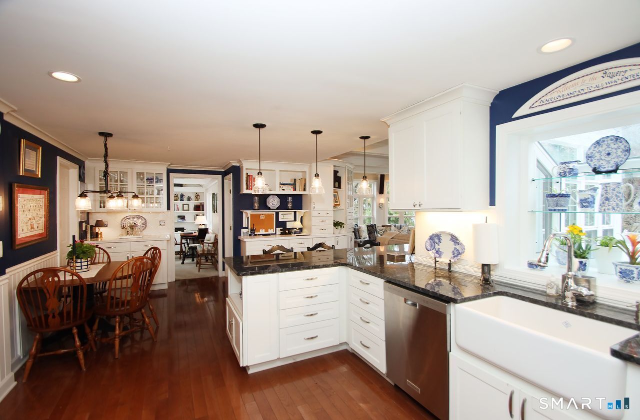 An A+ location and beautifully landscaped, professionally maintained yard set the stage for this exceptional 9-room home near schools, shopping, and recreation. A welcoming foyer opens to a formal living room with a gas fireplace and a sun-filled dining room, both featuring large windows. The updated white kitchen is the heart of the home, offering granite countertops, a center island with bar seating, a breakfast nook, built-ins, a garden window, and garage access. It flows into a charming family room with a gas fireplace, vaulted ceiling, wet/coffee bar, and door leading to a deck and private patio. A versatile fifth bedroom or home office sits just off the kitchen with its own entrance, patio access, and adjacent full bath. Upstairs are four additional bedrooms with hardwood floors and an updated bath with custom tile, marble sink, and refreshed shower. The lower level includes a second office area, built-ins, playroom with five sunny windows, laundry, half bath, and access to the patio and a workshop/storage area. The backyard extends to a scenic brook and includes a storage shed. Immaculate and full of charm, this move-in ready home is a rare find! Agent related to Seller.