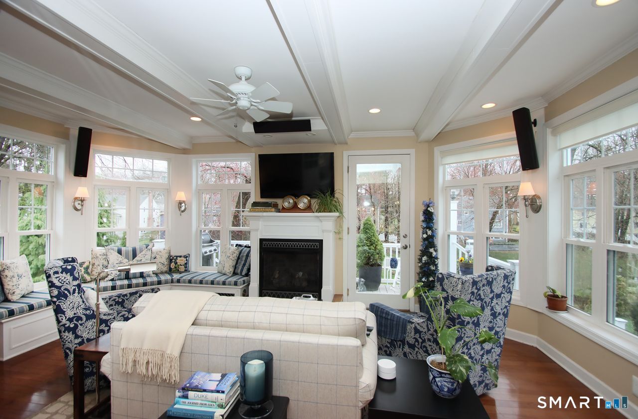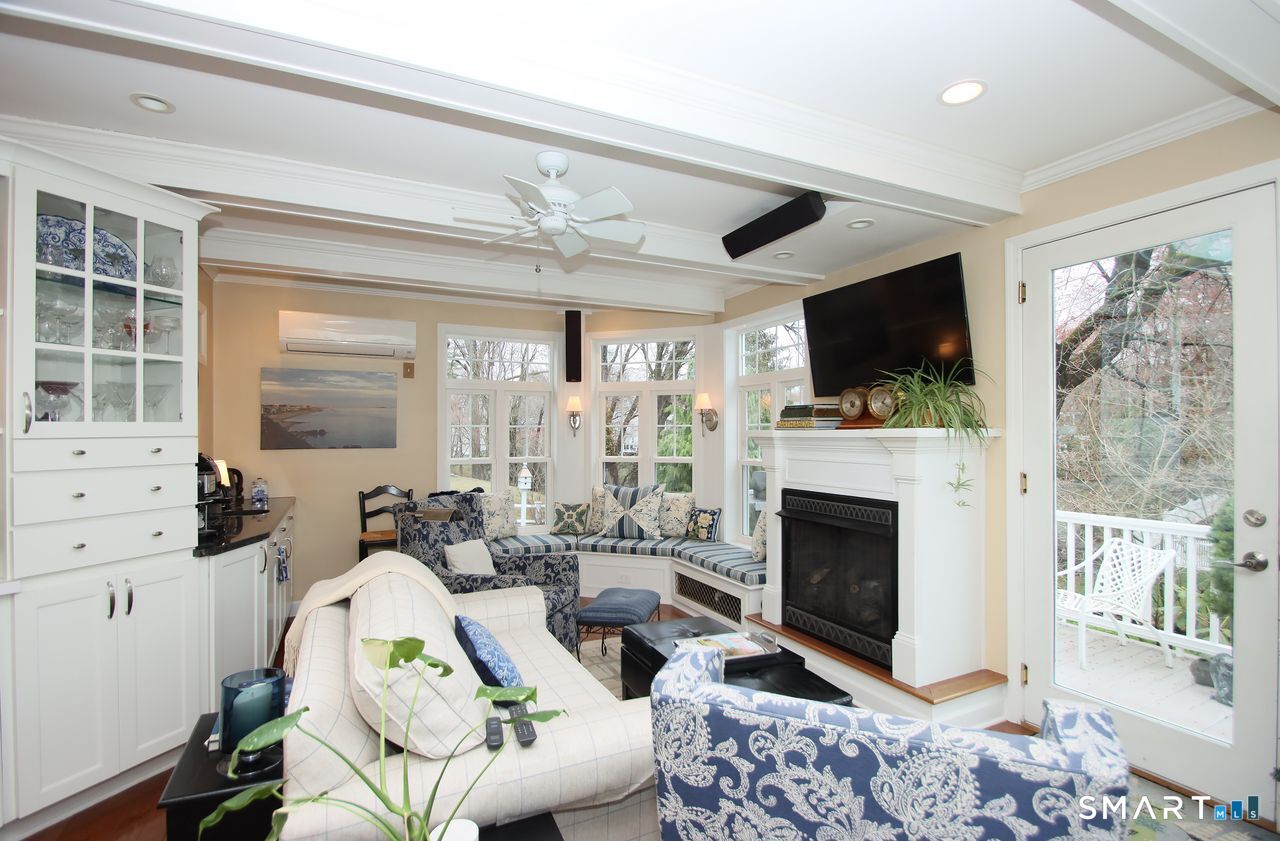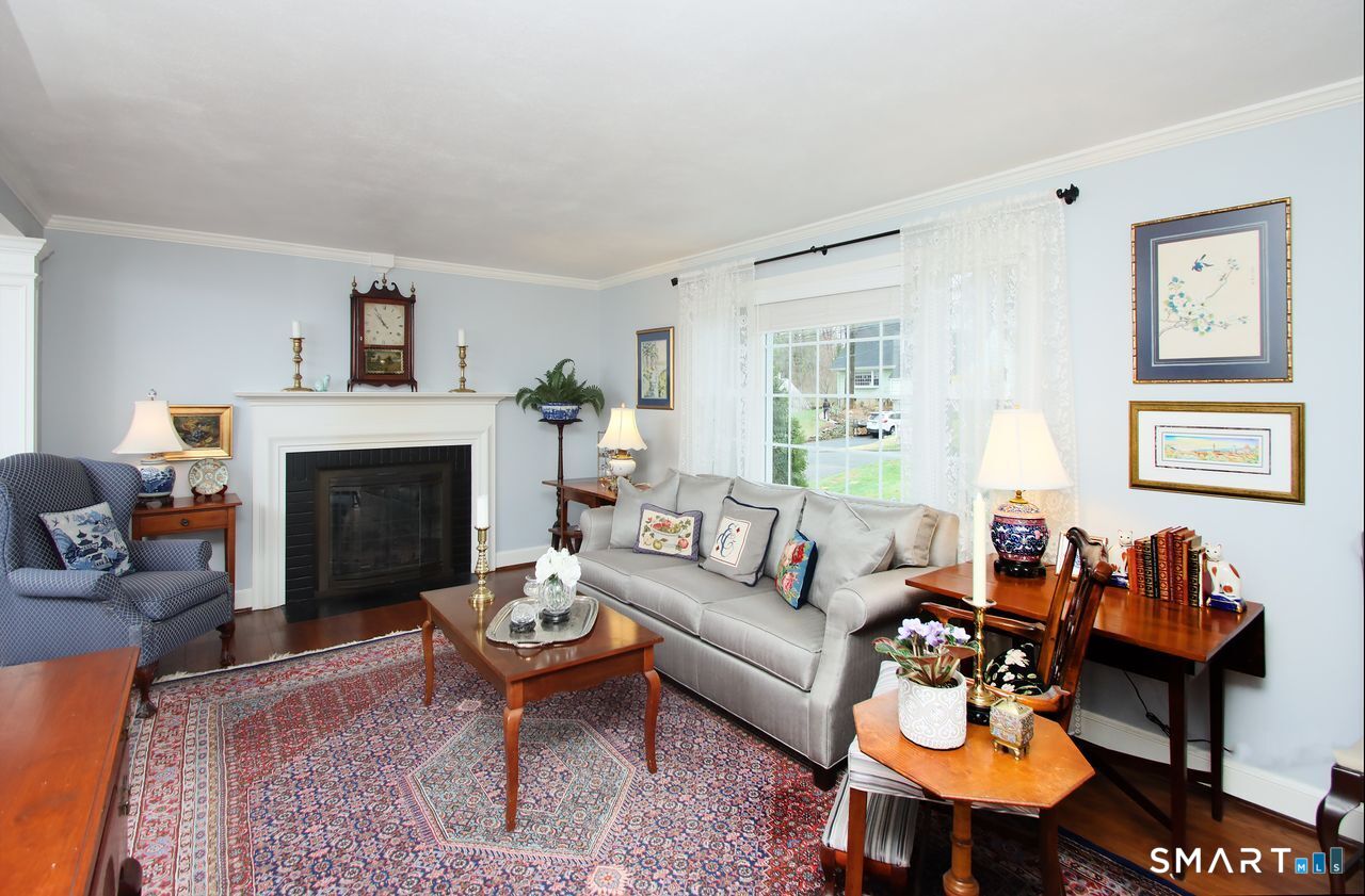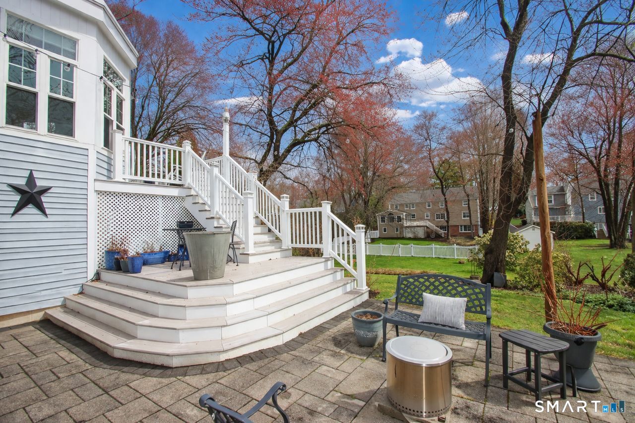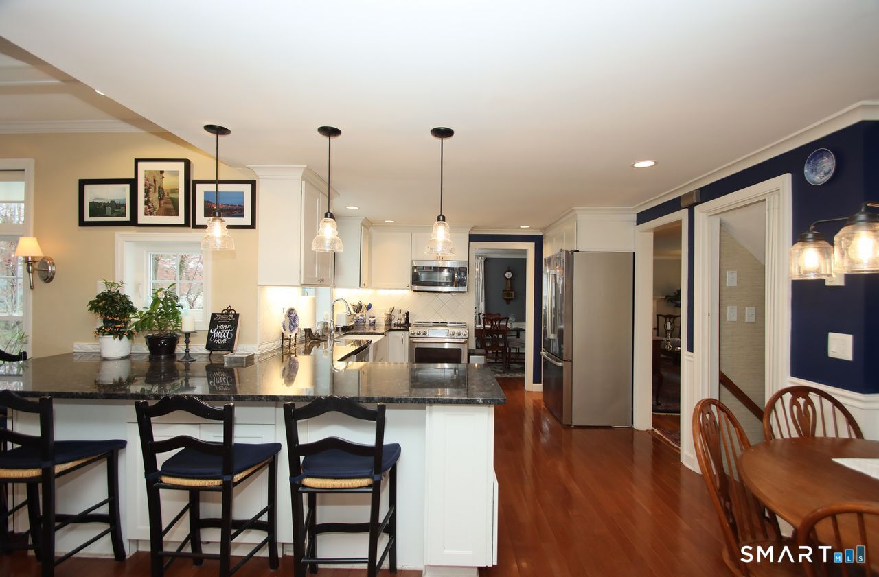 An A+ location and beautifully landscaped, professionally maintained yard set the stage for this exceptional 9-room home near schools, shopping, and recreation. A welcoming foyer opens to a formal living room with a gas fireplace and a sun-filled dining room, both featuring large windows. The updated white kitchen is the heart of the home, offering granite countertops, a center island with bar seating, a breakfast nook, built-ins, a garden window, and garage access. It flows into a charming family room with a gas fireplace, vaulted ceiling, wet/coffee bar, and door leading to a deck and private patio. A versatile fifth bedroom or home office sits just off the kitchen with its own entrance, patio access, and adjacent full bath. Upstairs are four additional bedrooms with hardwood floors and an updated bath with custom tile, marble sink, and refreshed shower. The lower level includes a second office area, built-ins, playroom with five sunny windows, laundry, half bath, and access to the patio and a workshop/storage area. The backyard extends to a scenic brook and includes a storage shed. Immaculate and full of charm, this move-in ready home is a rare find! Agent related to Seller.