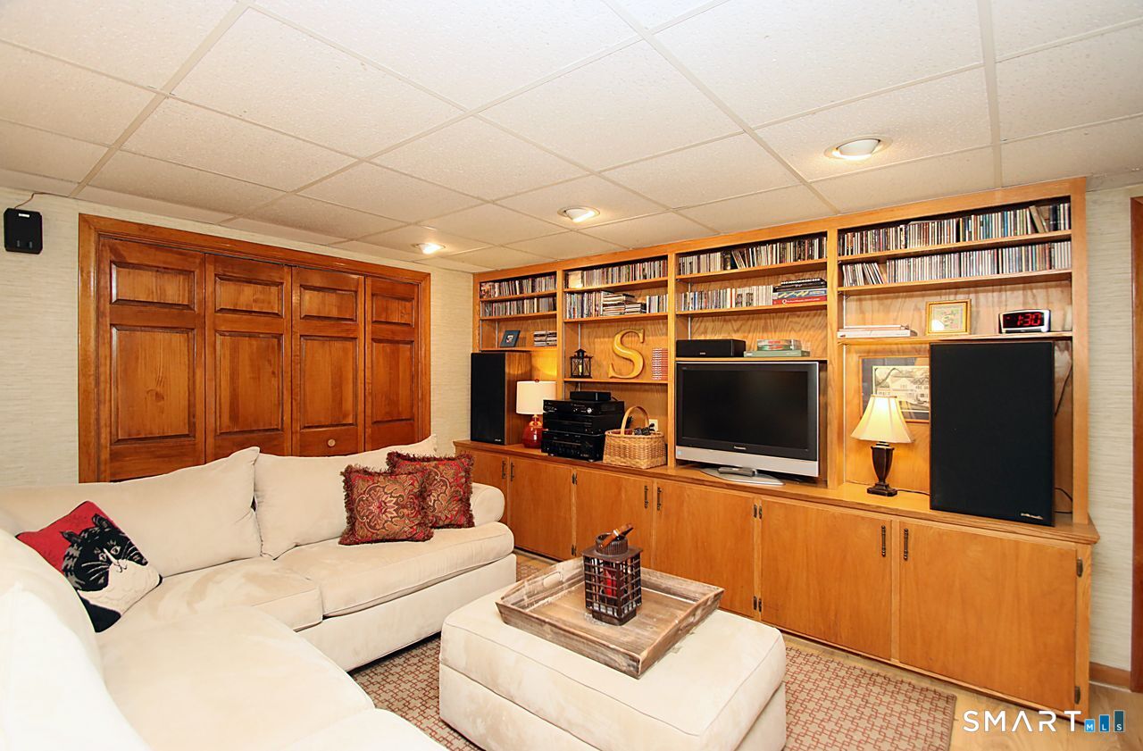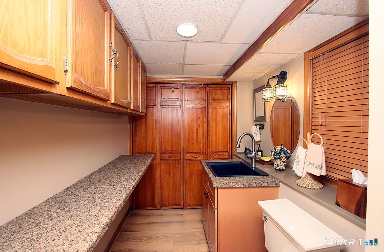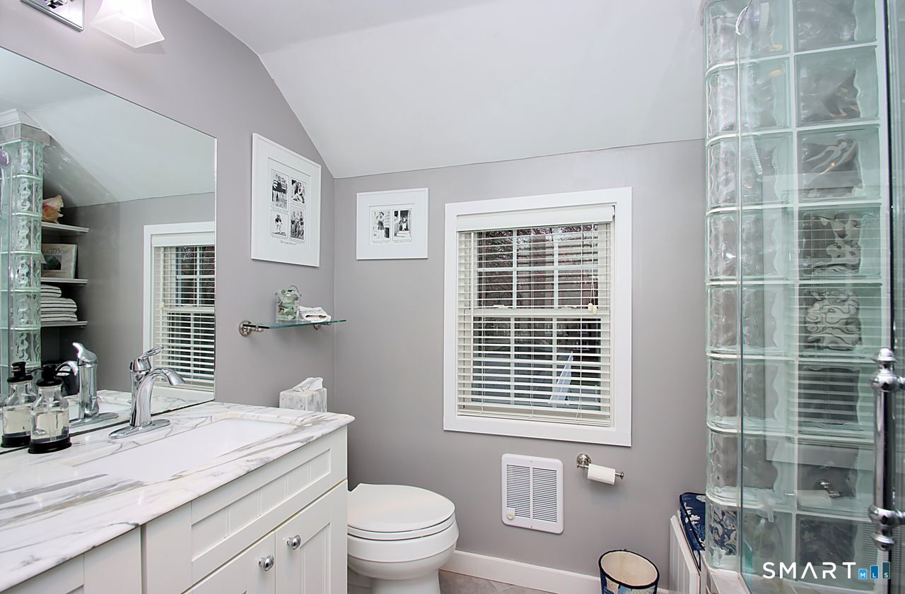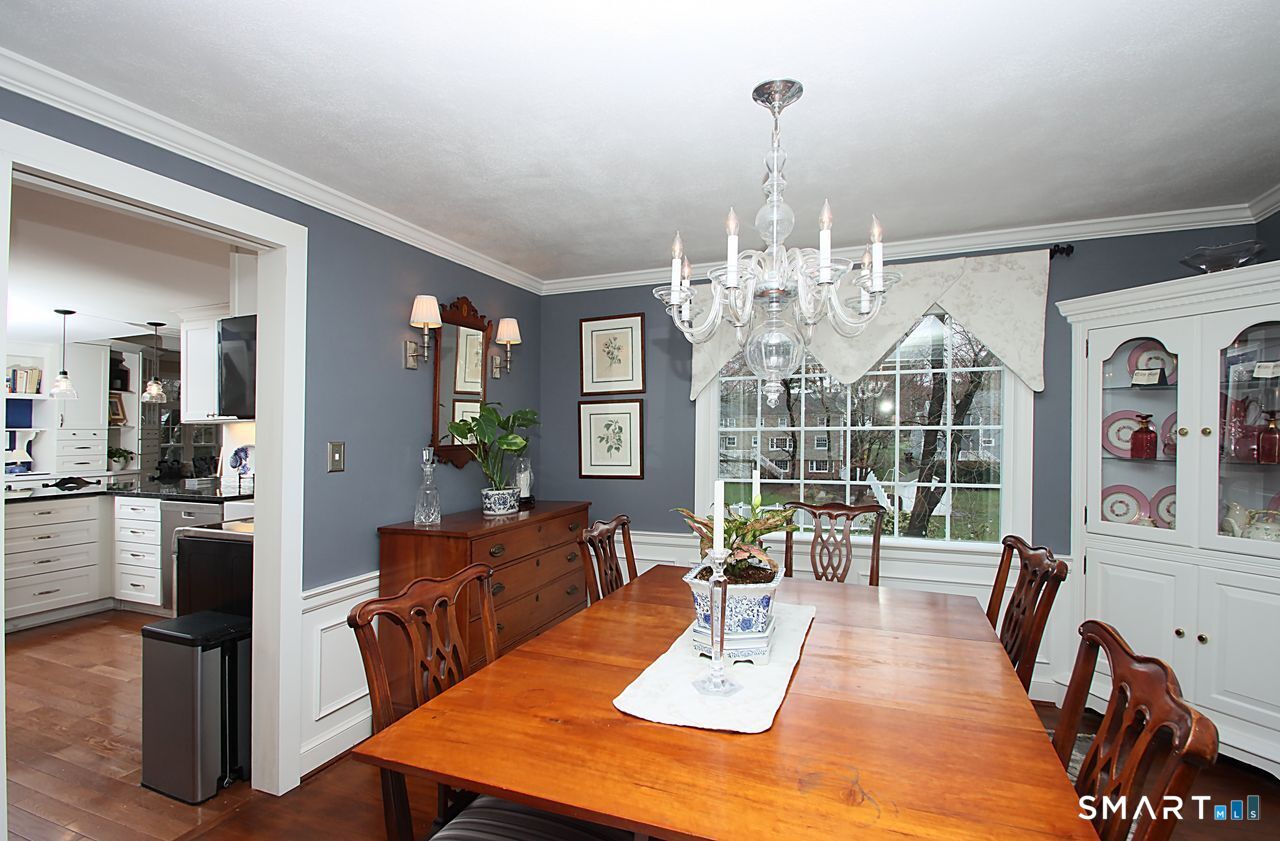 An A+ location and beautifully landscaped, professionally maintained yard set the stage for this exceptional 9-room home near schools, shopping, and recreation. A welcoming foyer opens to a formal living room with a gas fireplace and a sun-filled dining room, both featuring large windows. The updated white kitchen is the heart of the home, offering granite countertops, a center island with bar seating, a breakfast nook, built-ins, a garden window, and garage access. It flows into a charming family room with a gas fireplace, vaulted ceiling, wet/coffee bar, and door leading to a deck and private patio. A versatile fifth bedroom or home office sits just off the kitchen with its own entrance, patio access, and adjacent full bath. Upstairs are four additional bedrooms with hardwood floors and an updated bath with custom tile, marble sink, and refreshed shower. The lower level includes a second office area, built-ins, playroom with five sunny windows, laundry, half bath, and access to the patio and a workshop/storage area. The backyard extends to a scenic brook and includes a storage shed. Immaculate and full of charm, this move-in ready home is a rare find! Agent related to Seller.